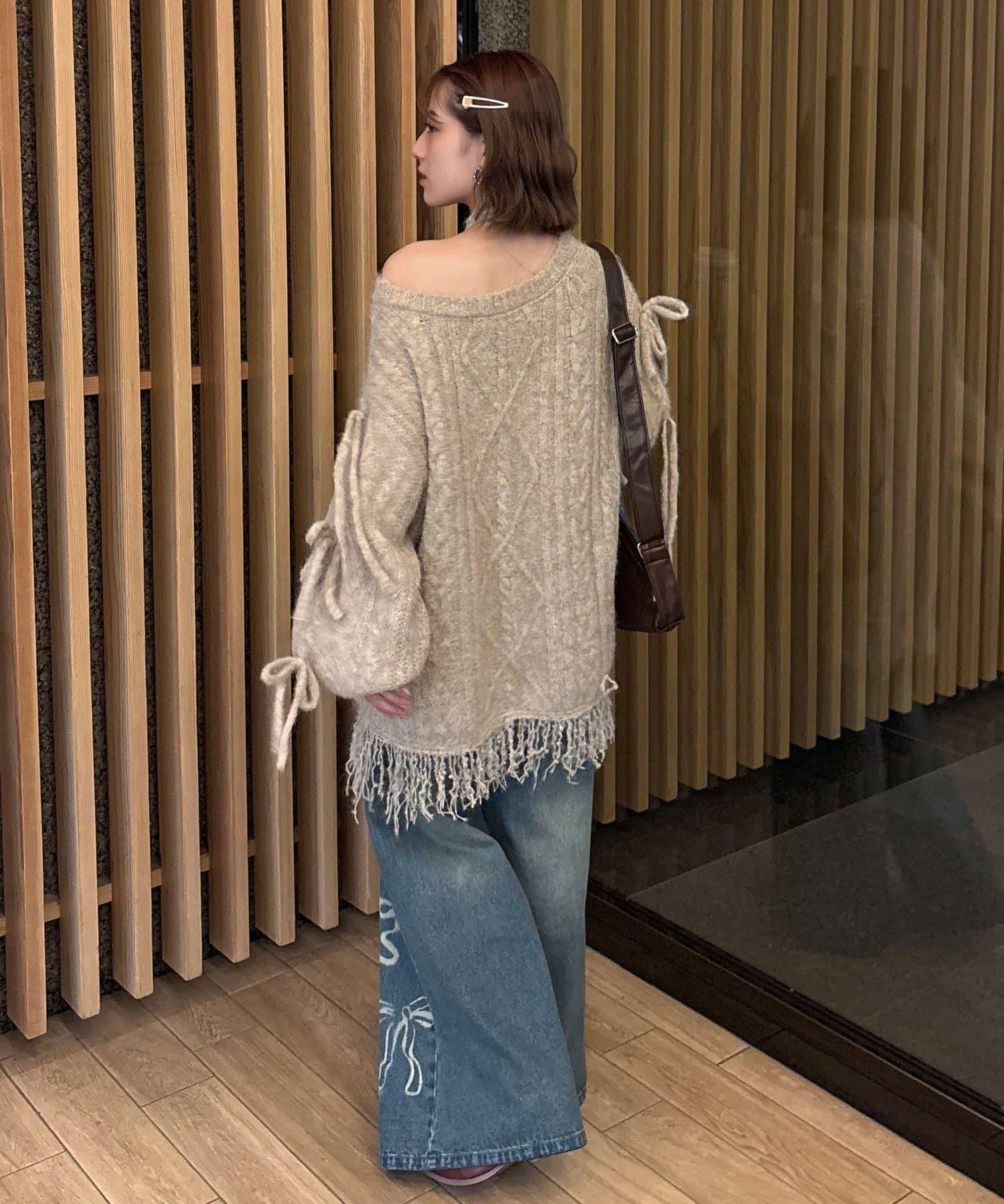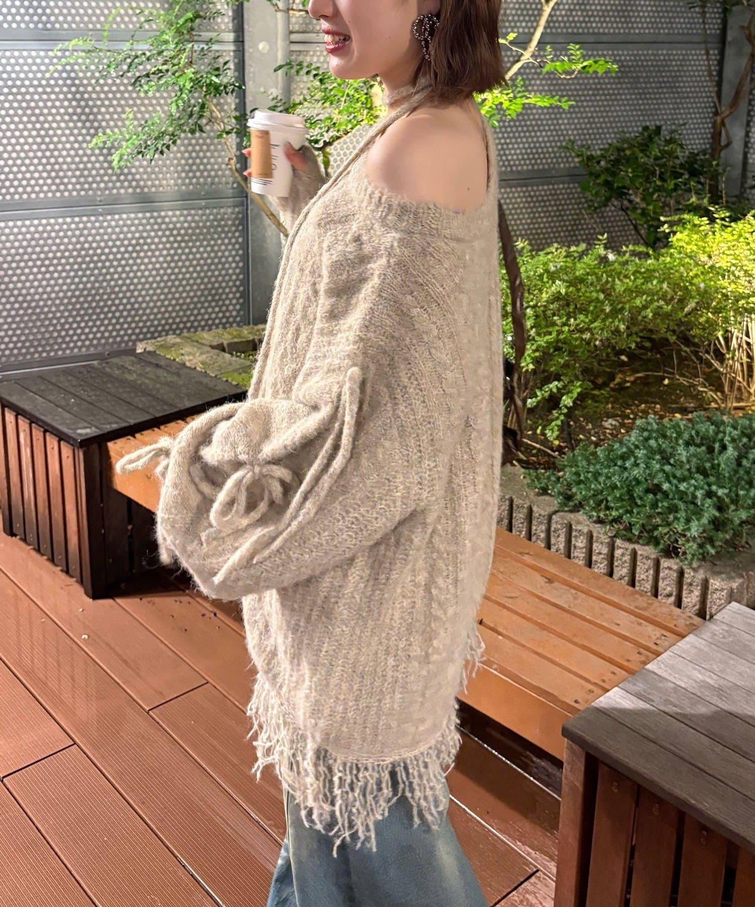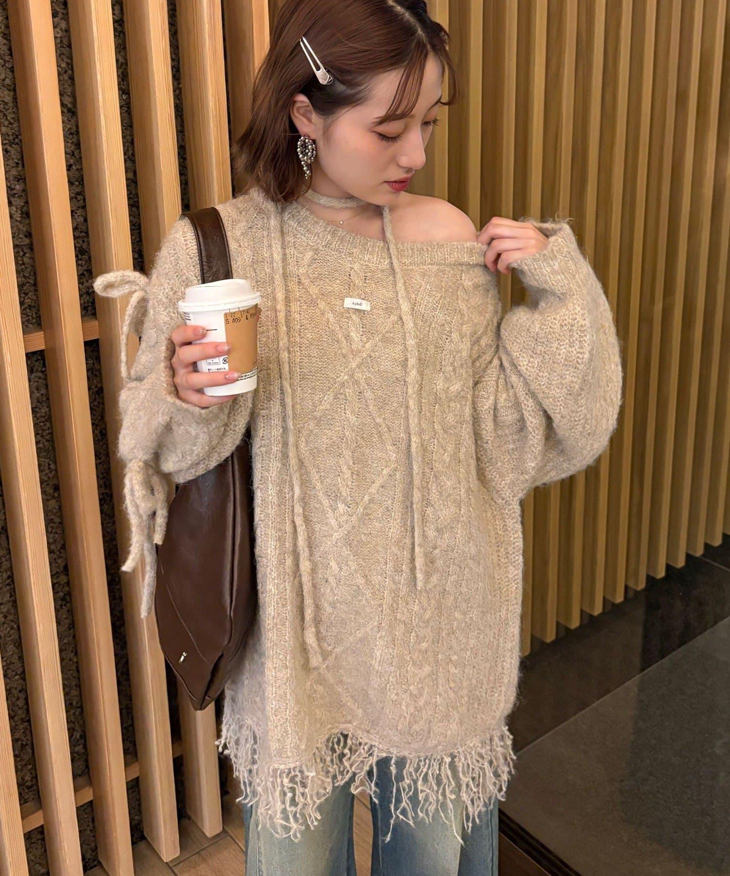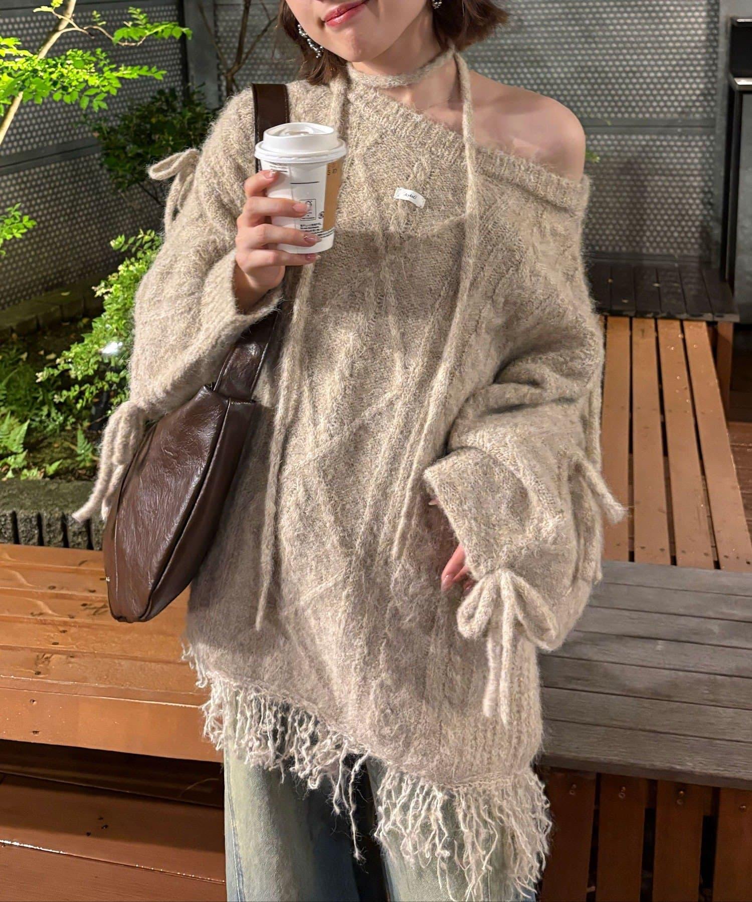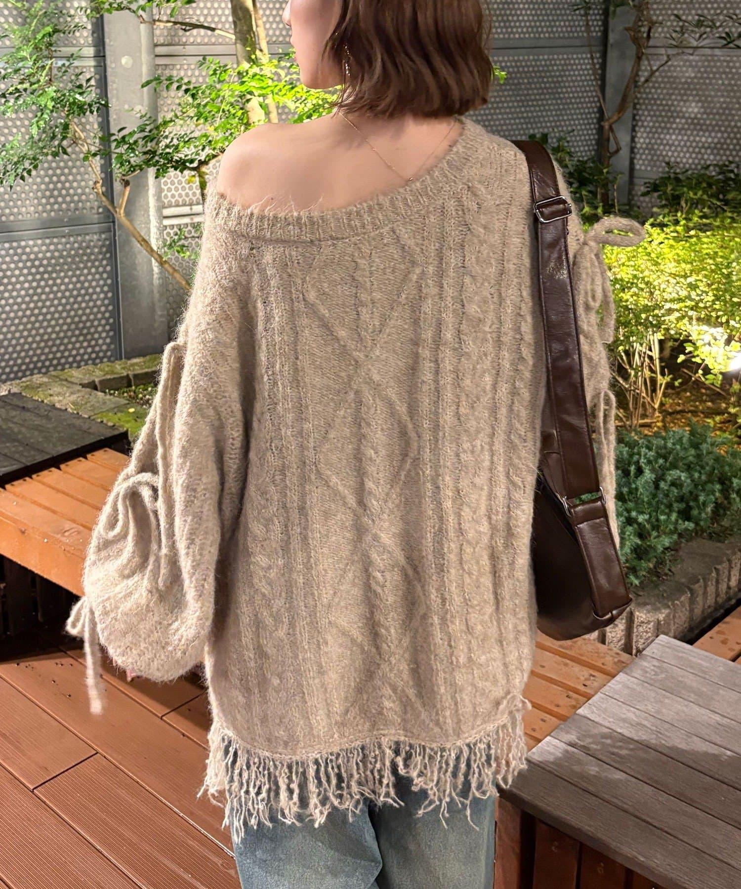 【あやっち(@_acoba_)企畫】麻花編織蝴蝶結流蘇一字肩針織衫