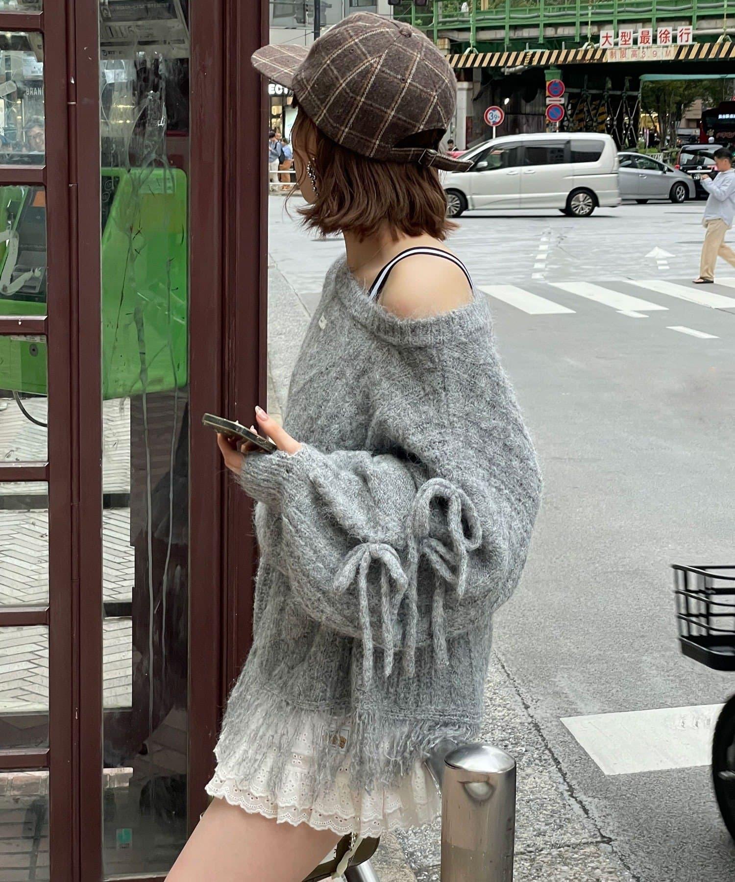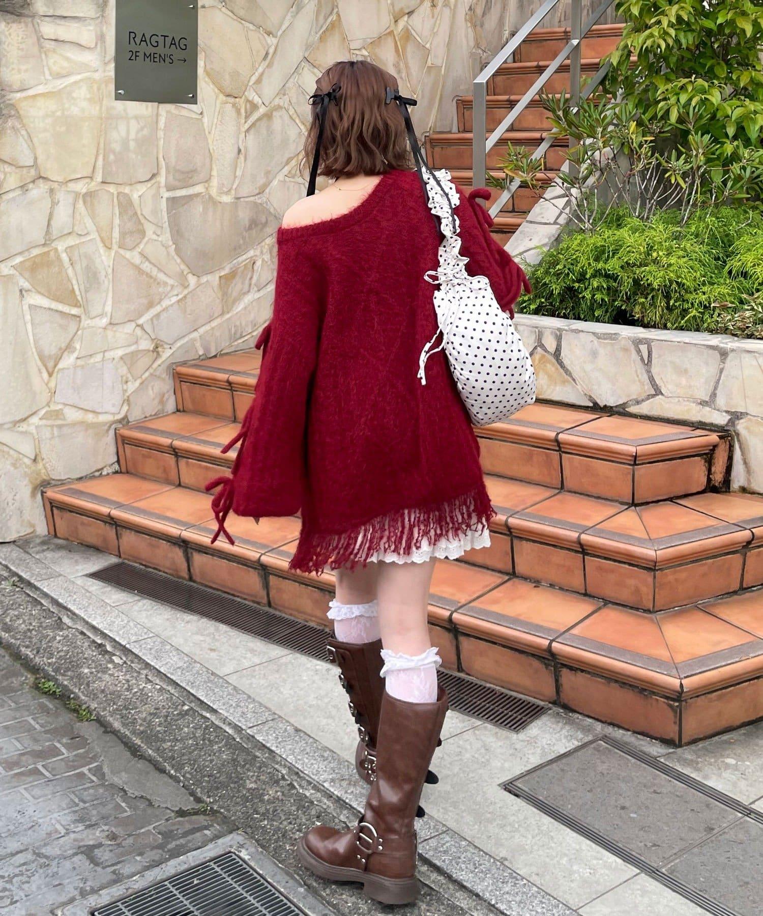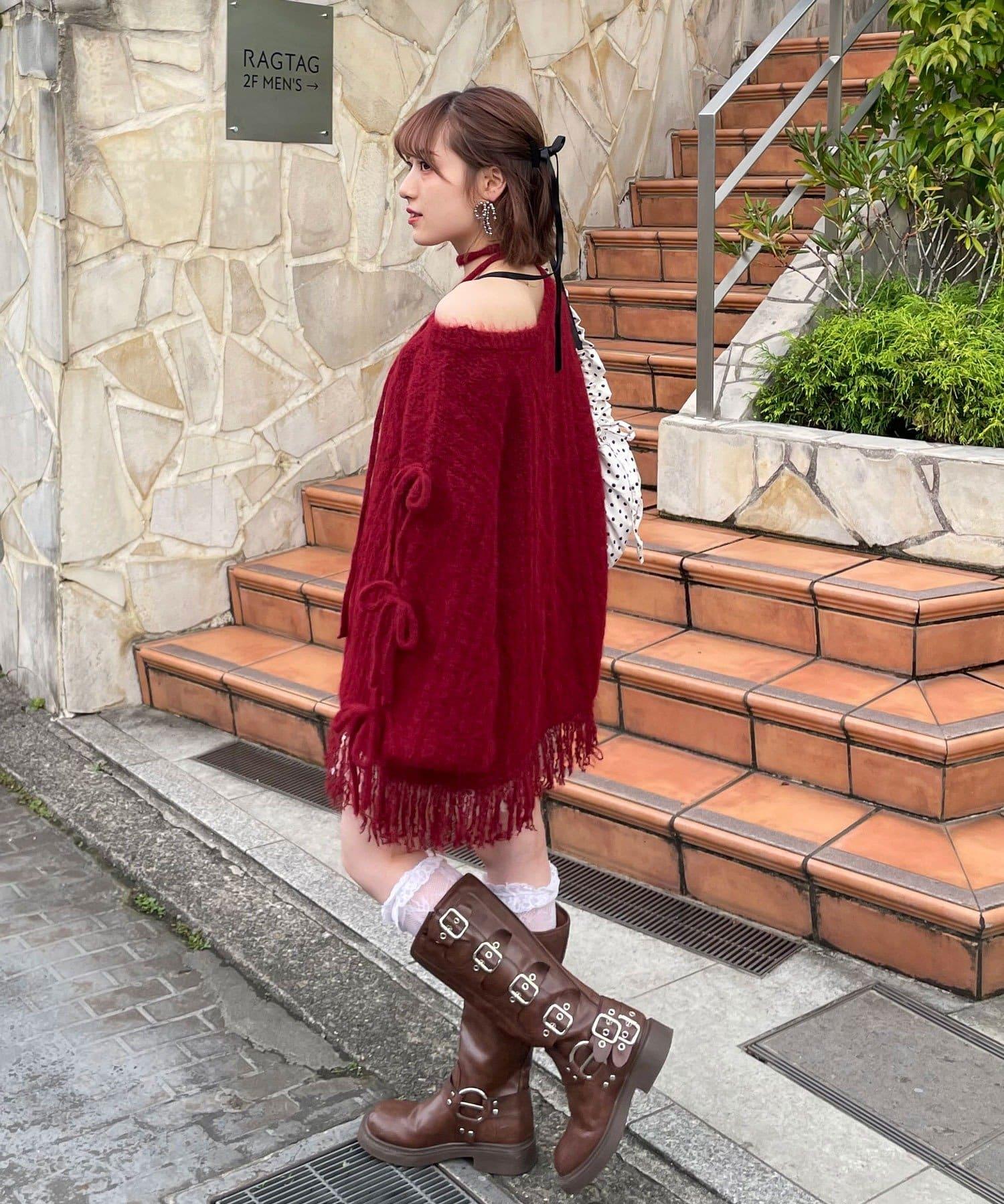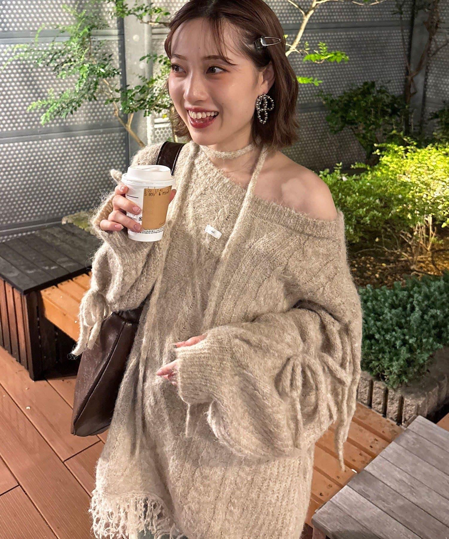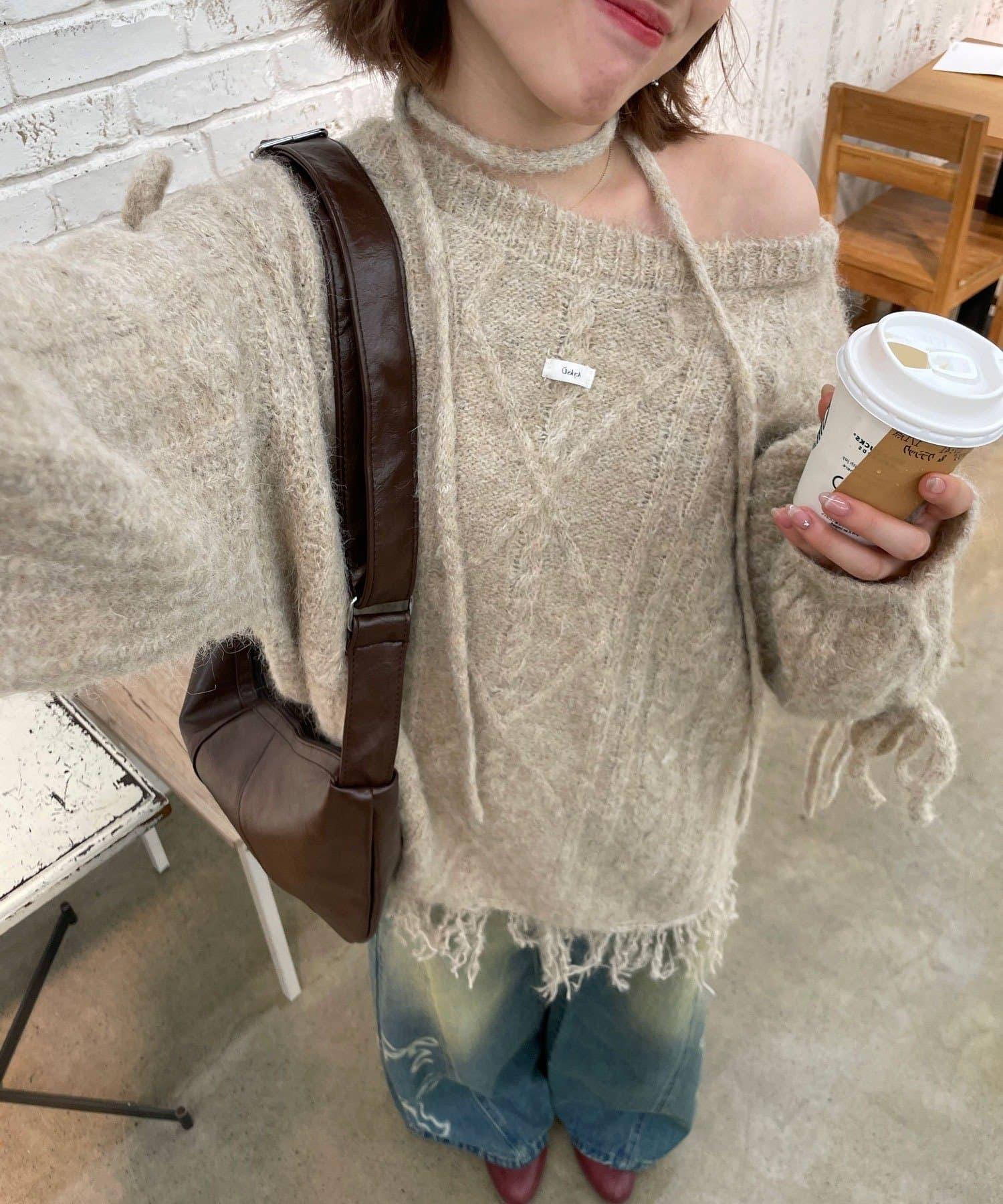 【あやっち(@_acoba_)企畫】麻花編織蝴蝶結流蘇一字肩針織衫