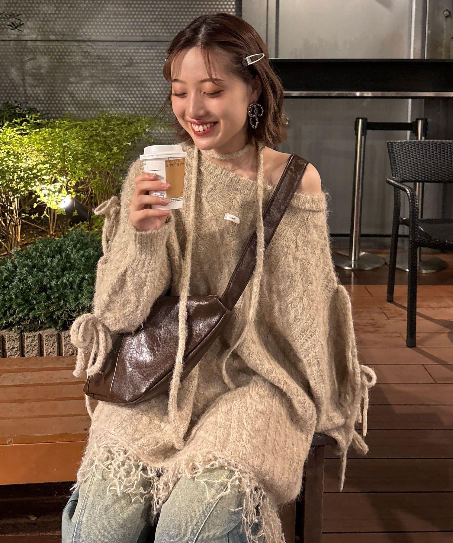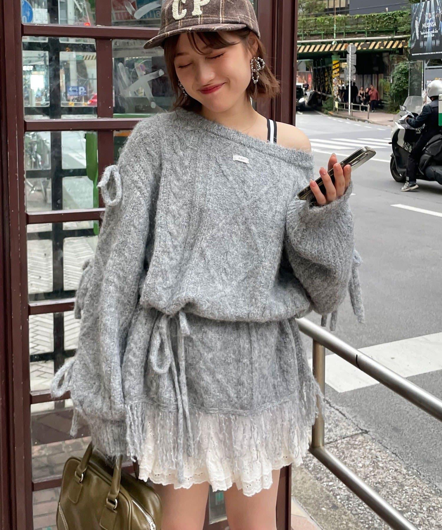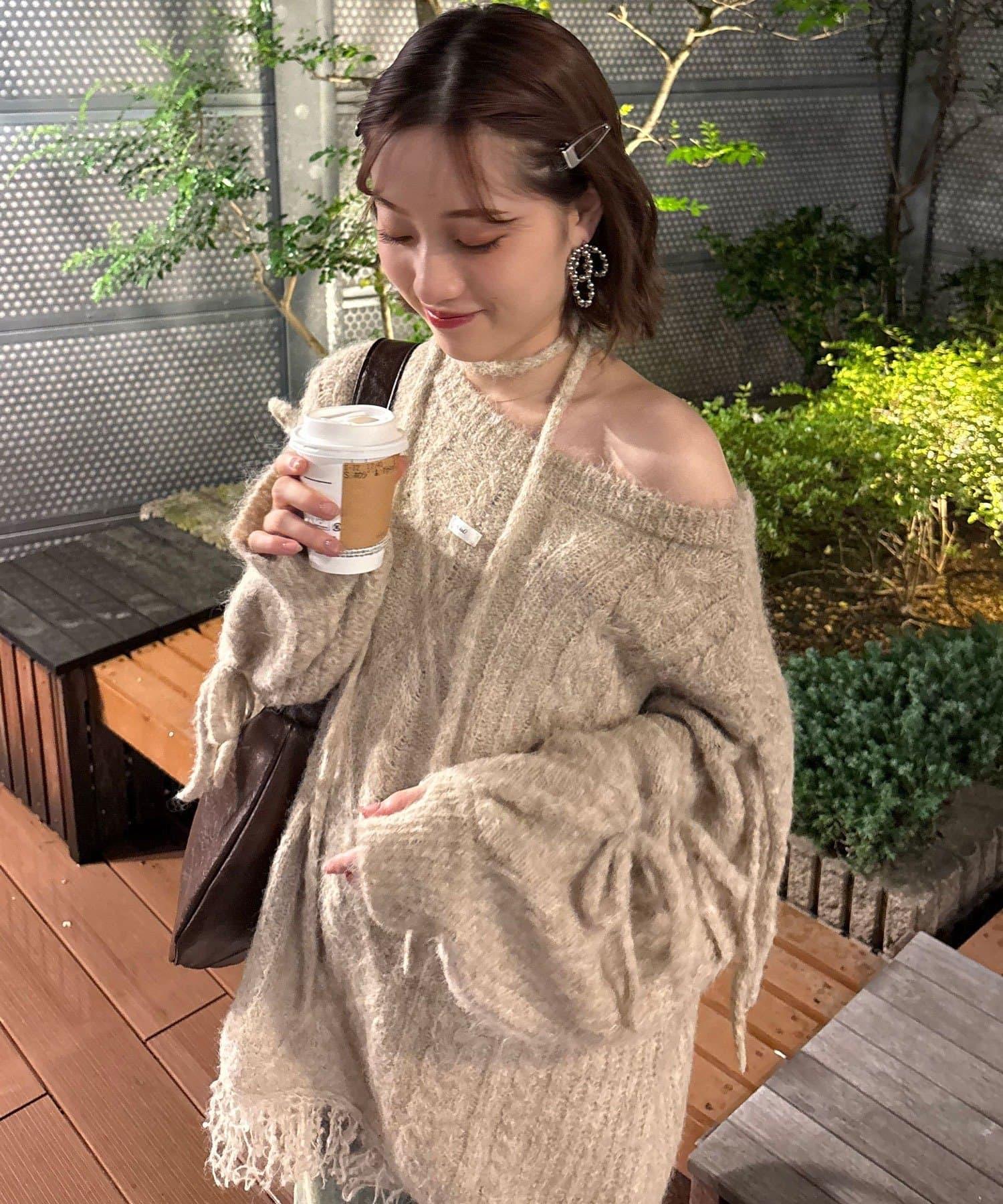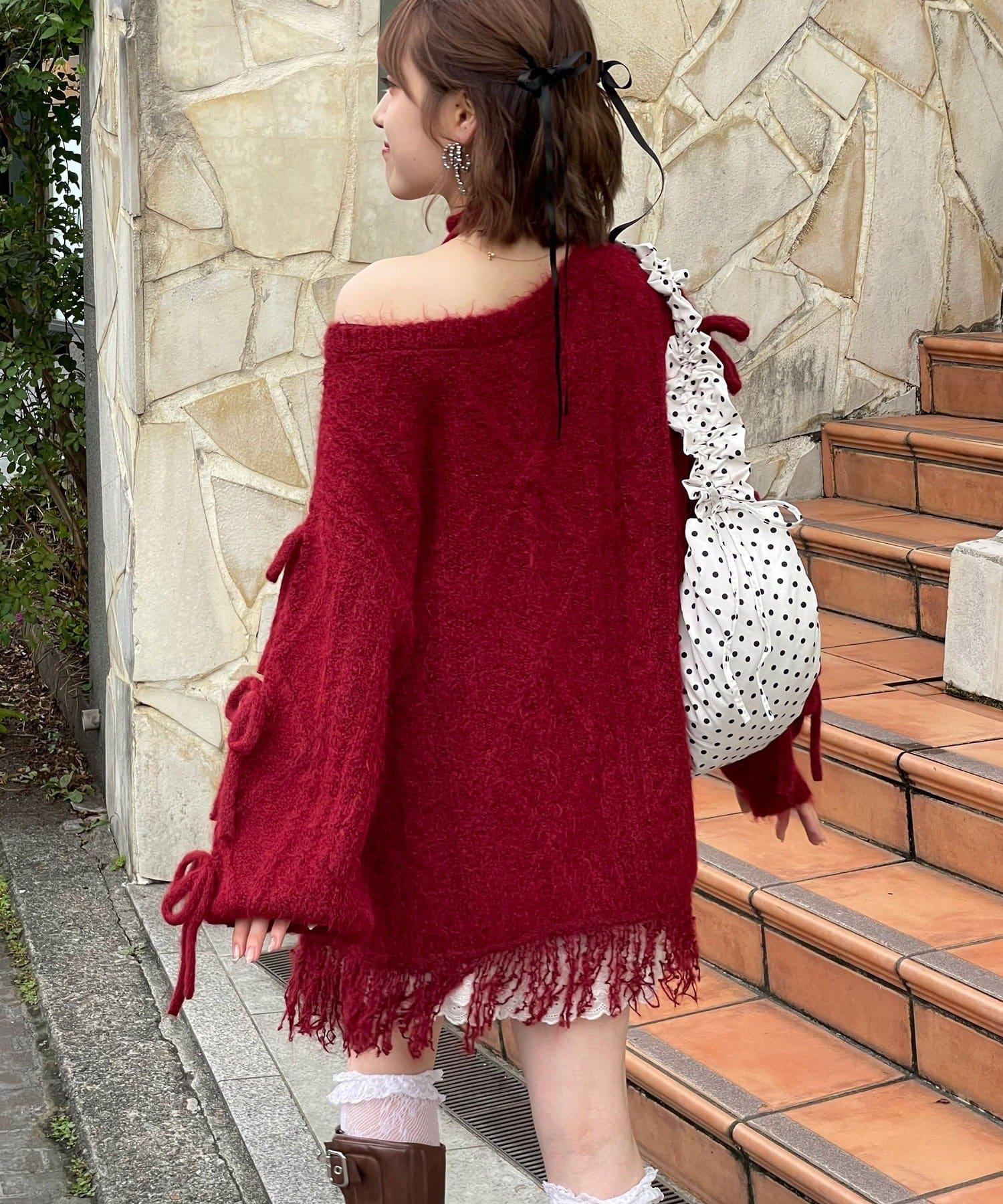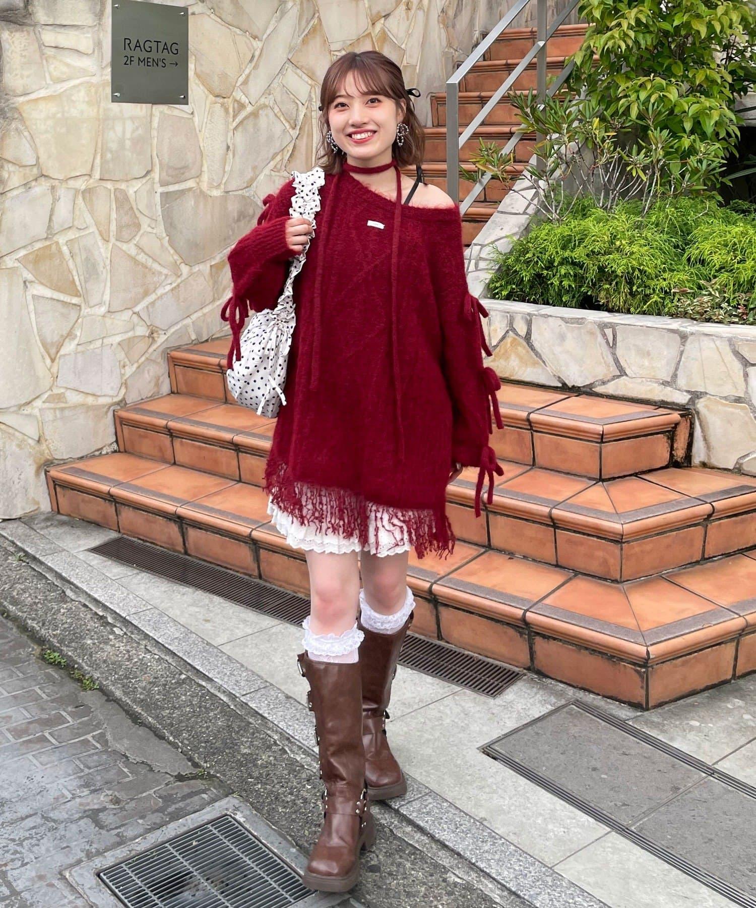 【あやっち(@_acoba_)企畫】麻花編織蝴蝶結流蘇一字肩針織衫