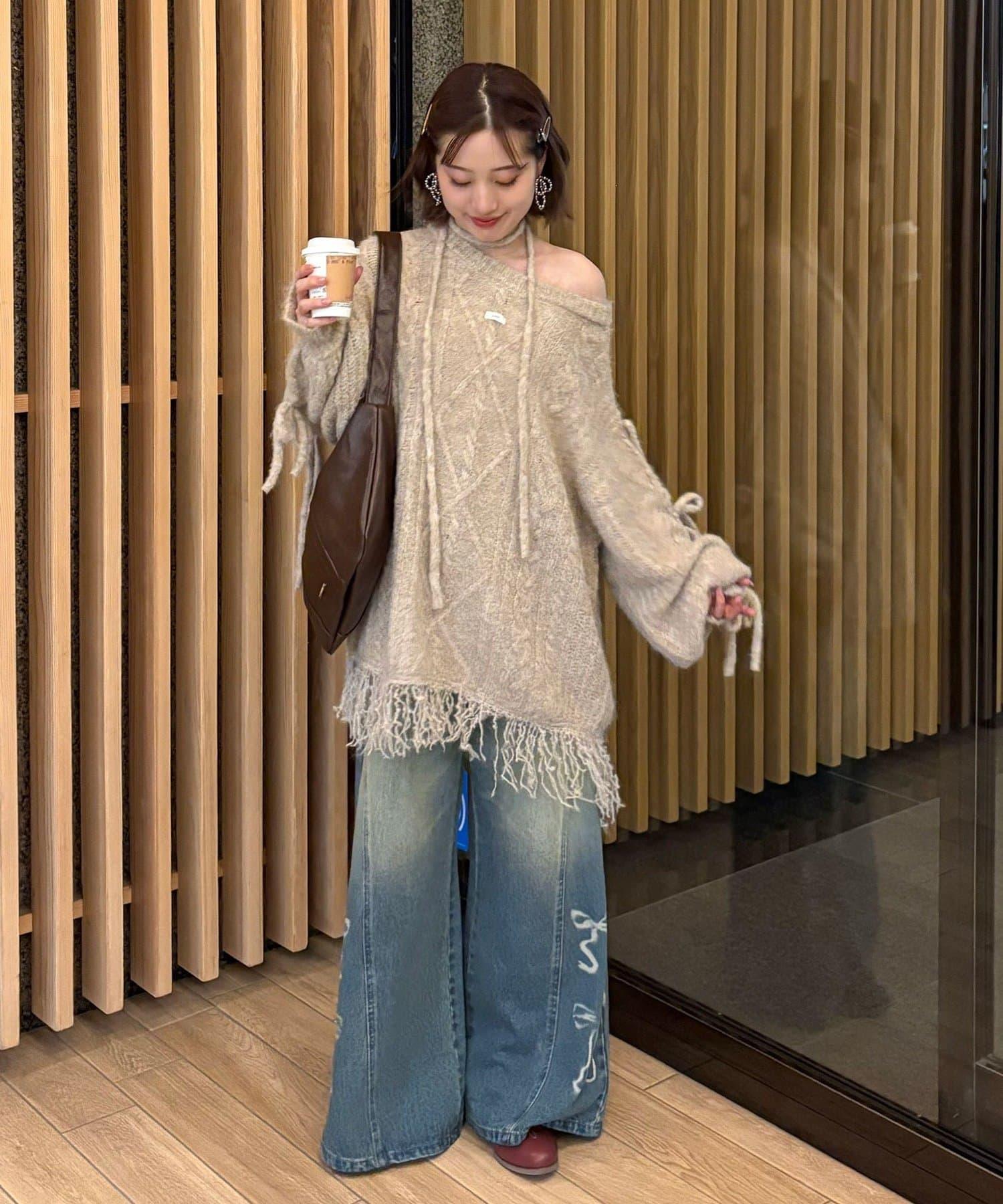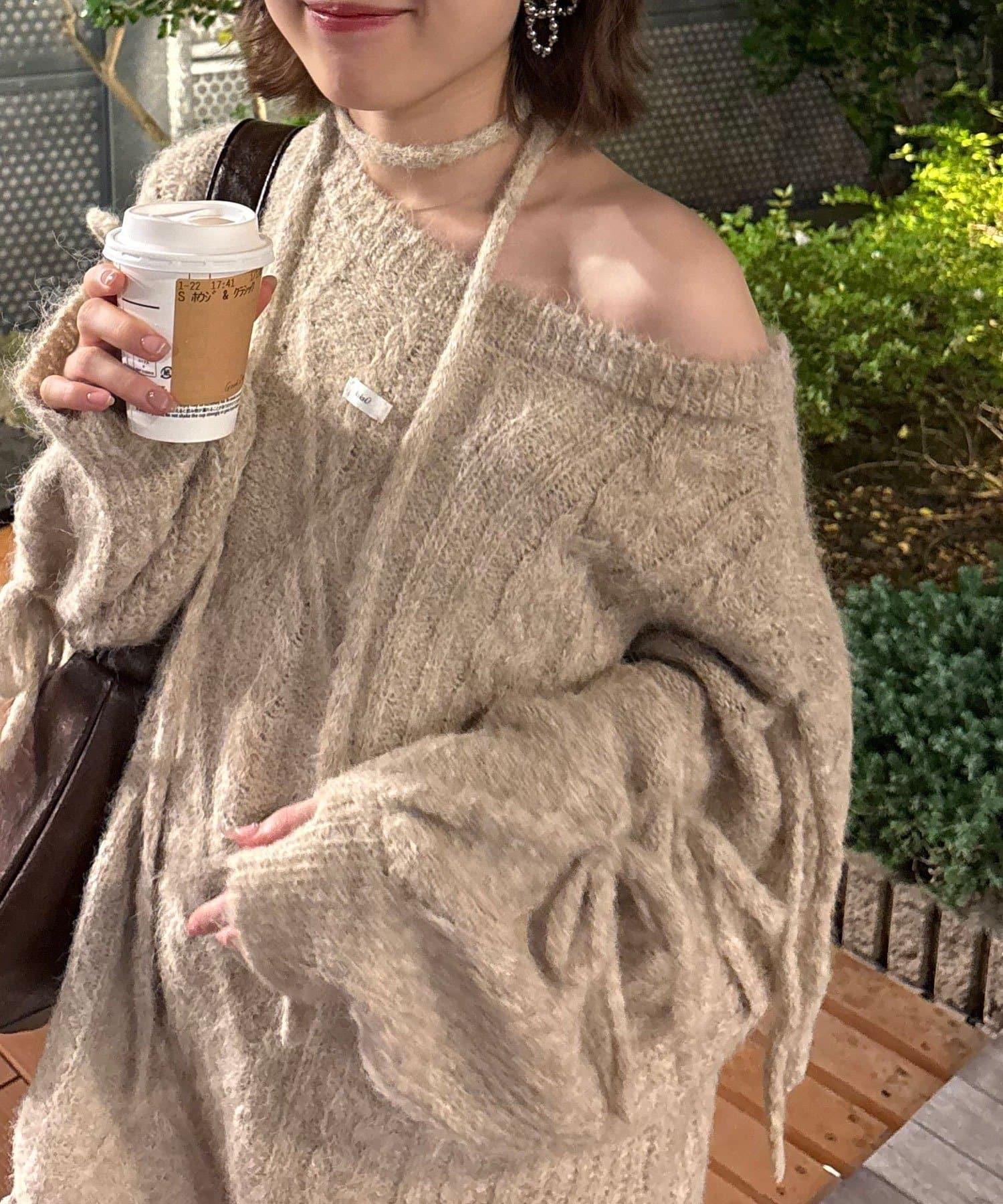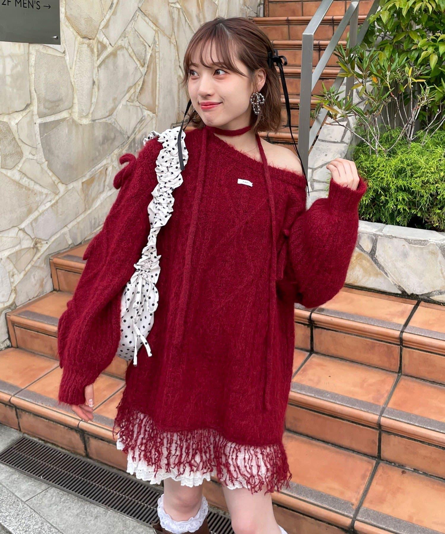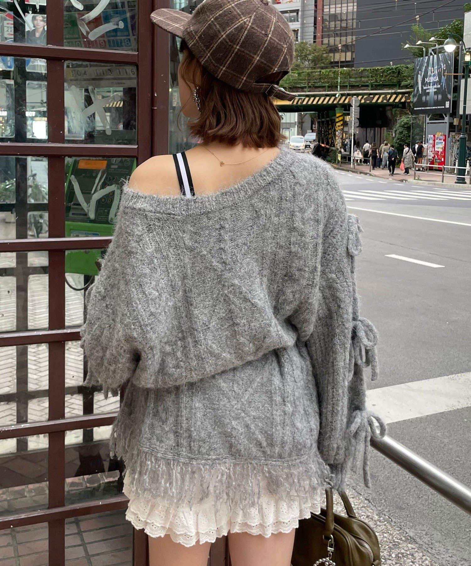 【あやっち(@_acoba_)企畫】麻花編織蝴蝶結流蘇一字肩針織衫