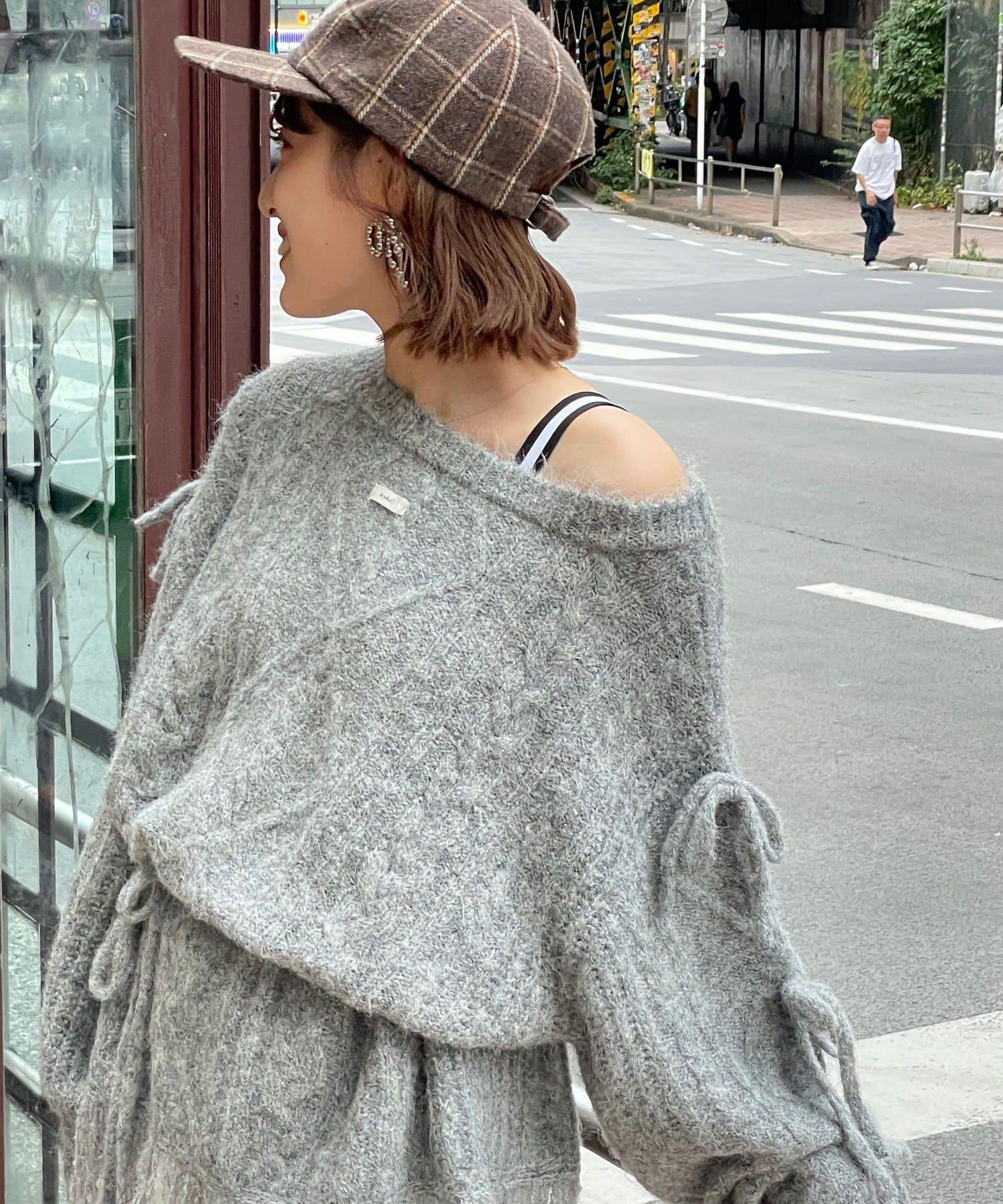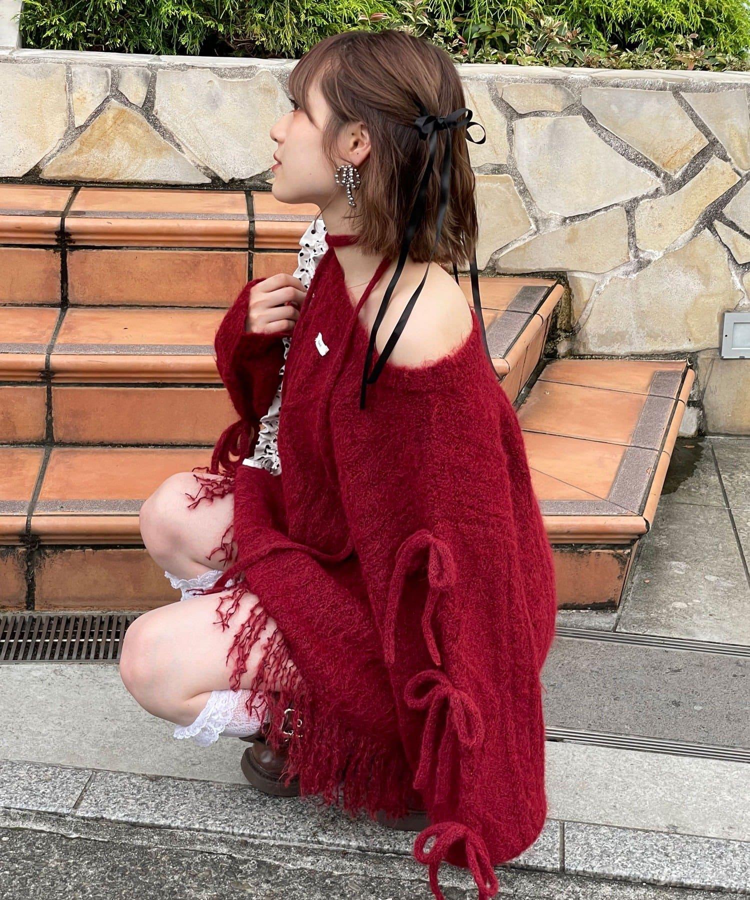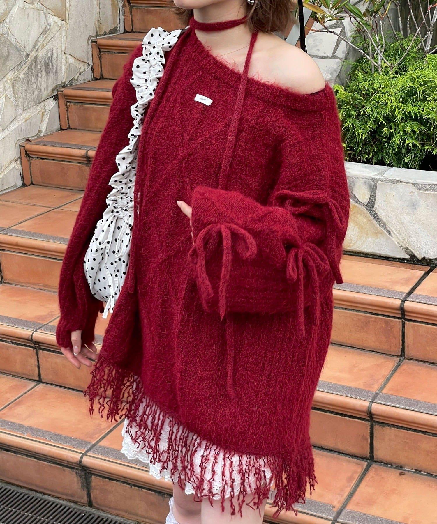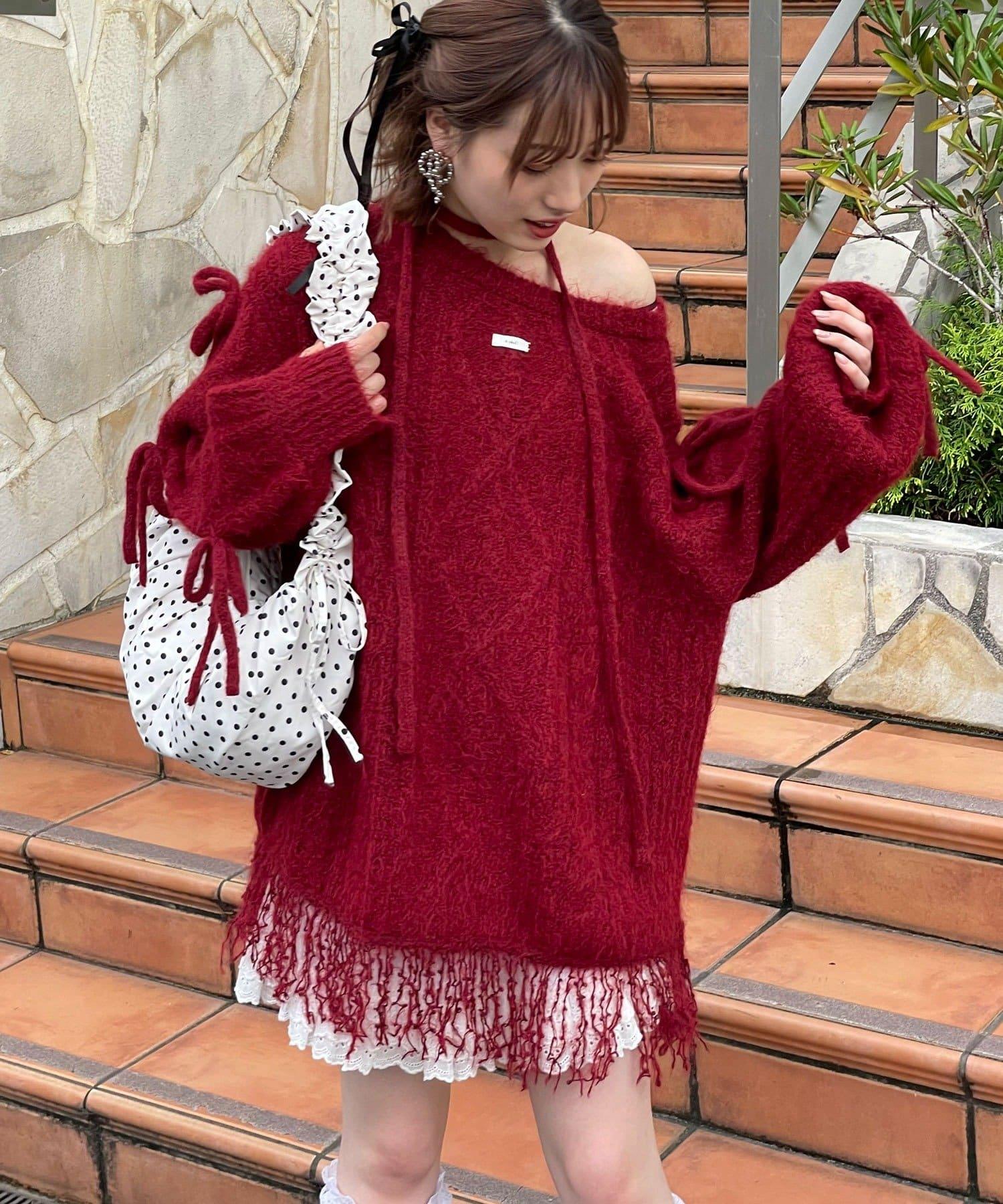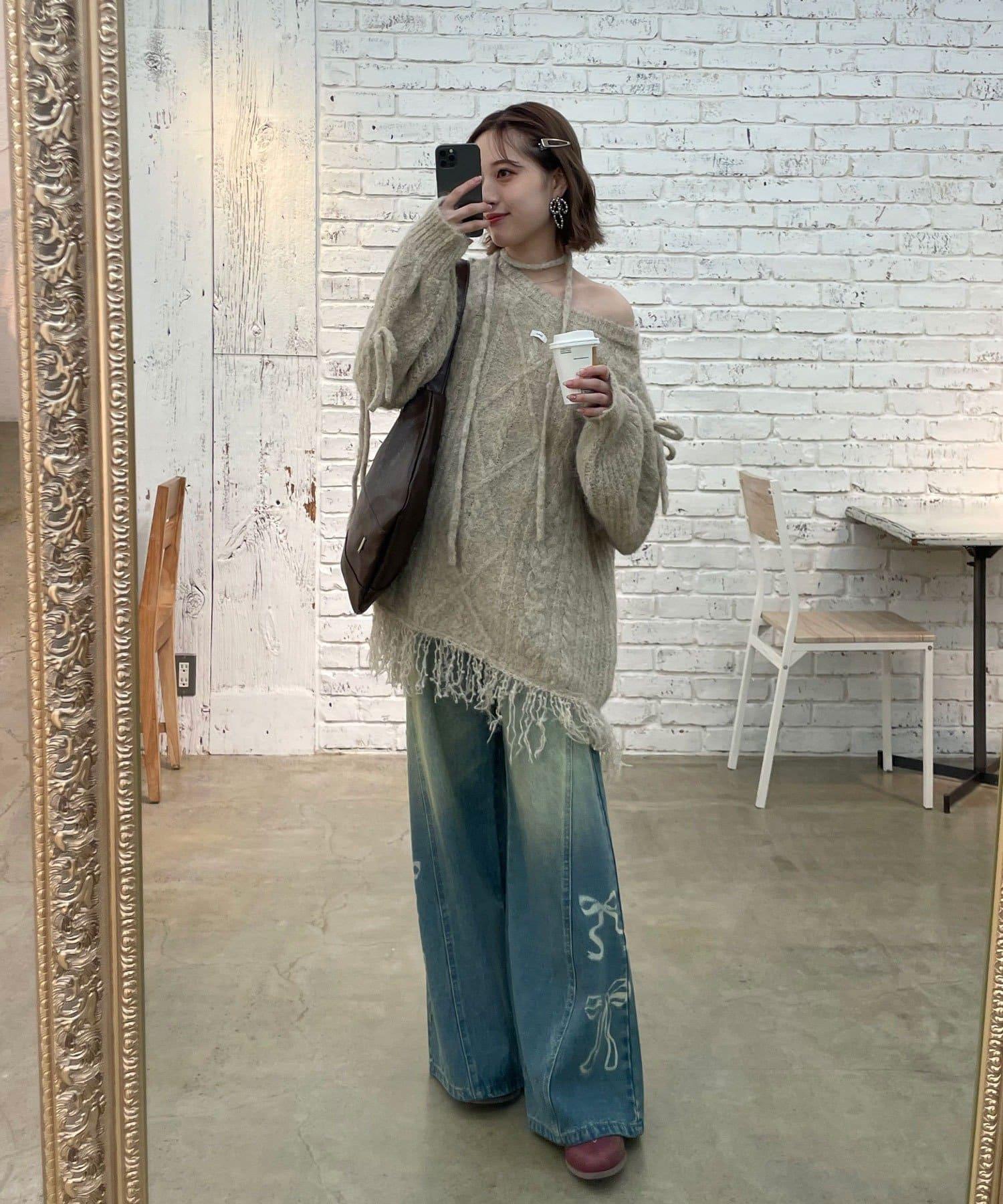 【あやっち(@_acoba_)企畫】麻花編織蝴蝶結流蘇一字肩針織衫