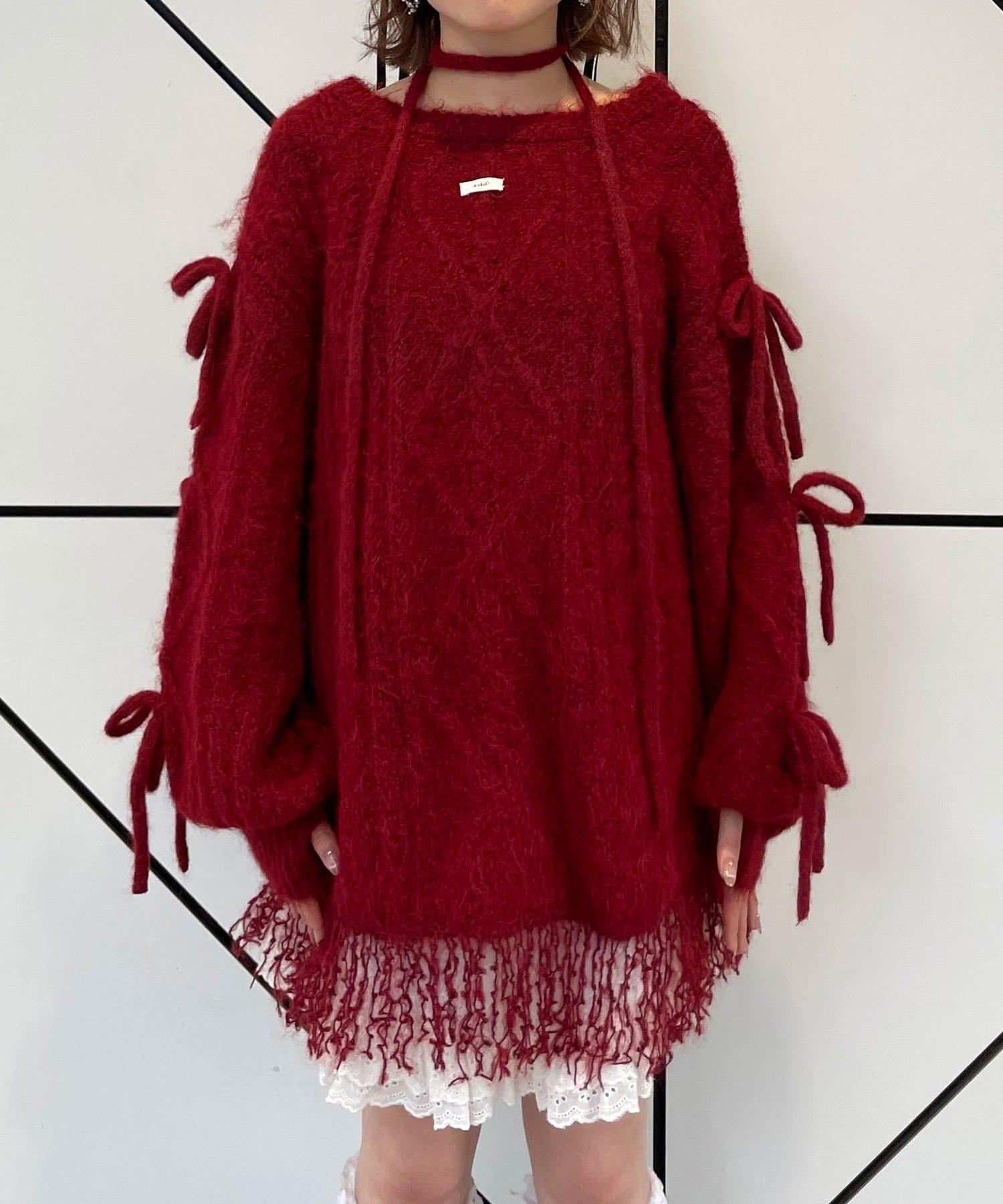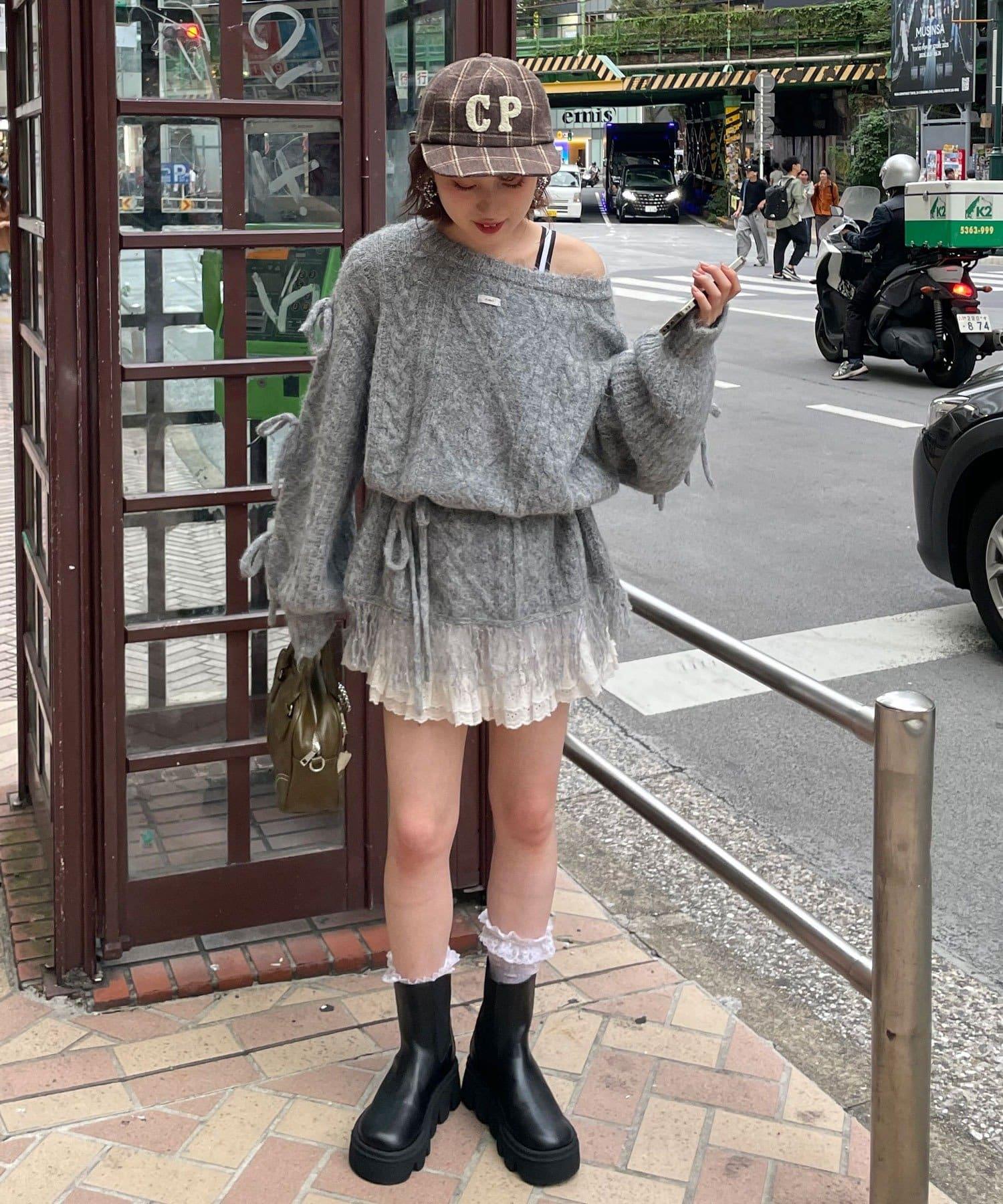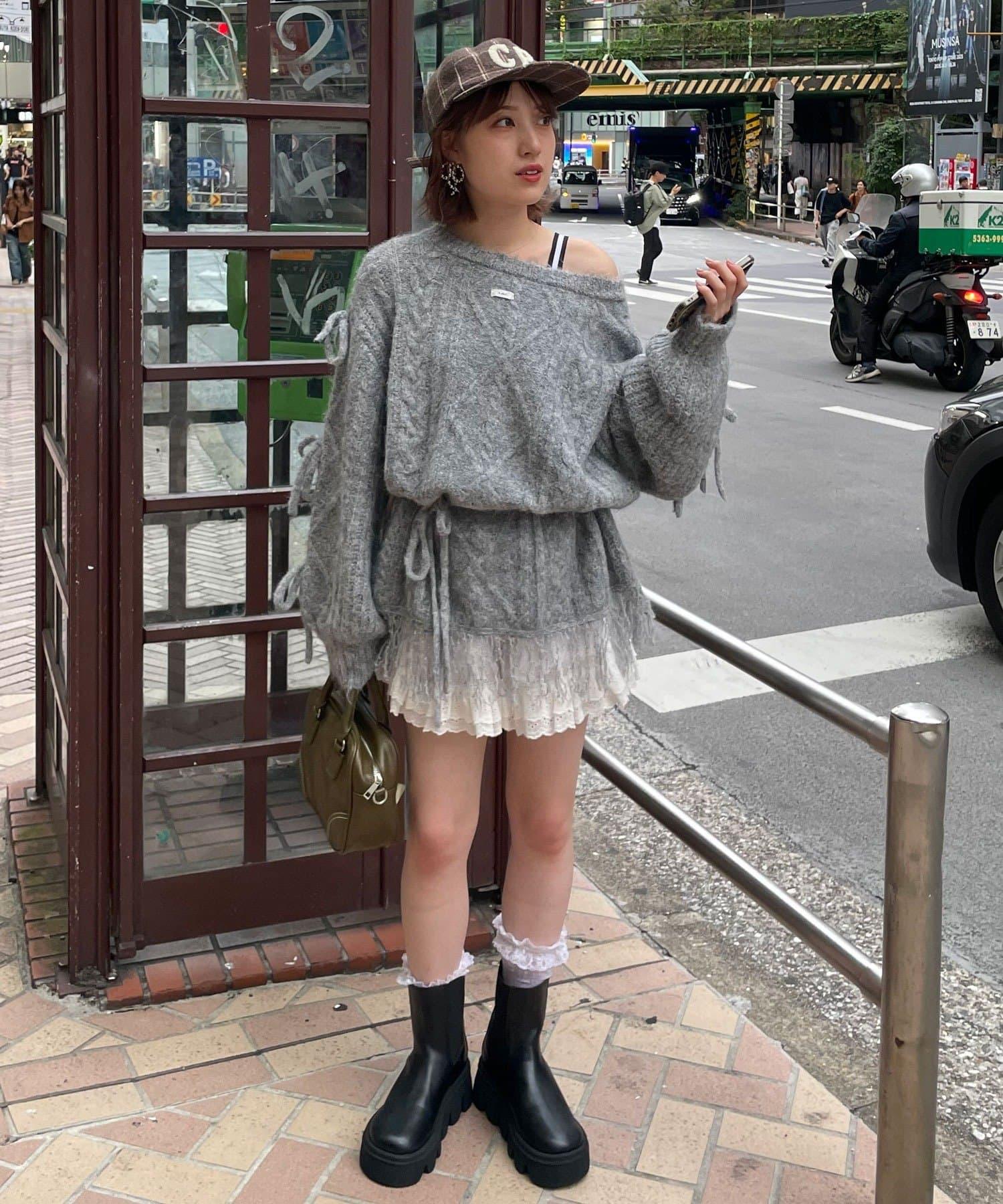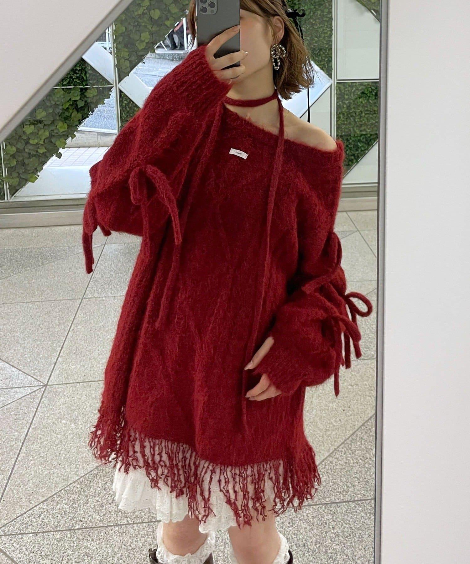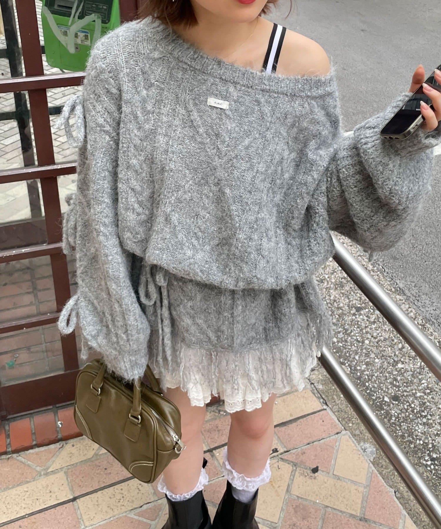 【あやっち(@_acoba_)企畫】麻花編織蝴蝶結流蘇一字肩針織衫