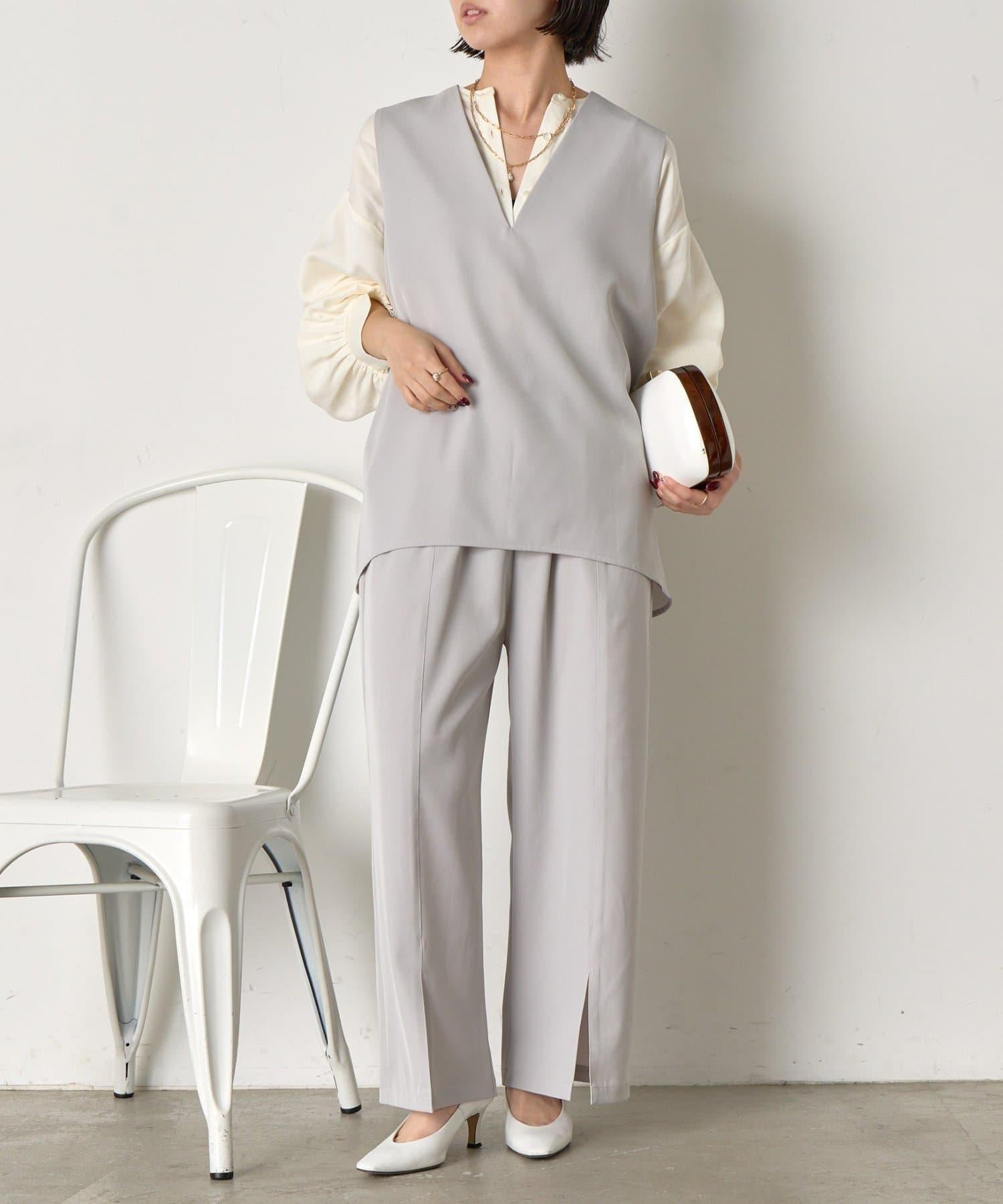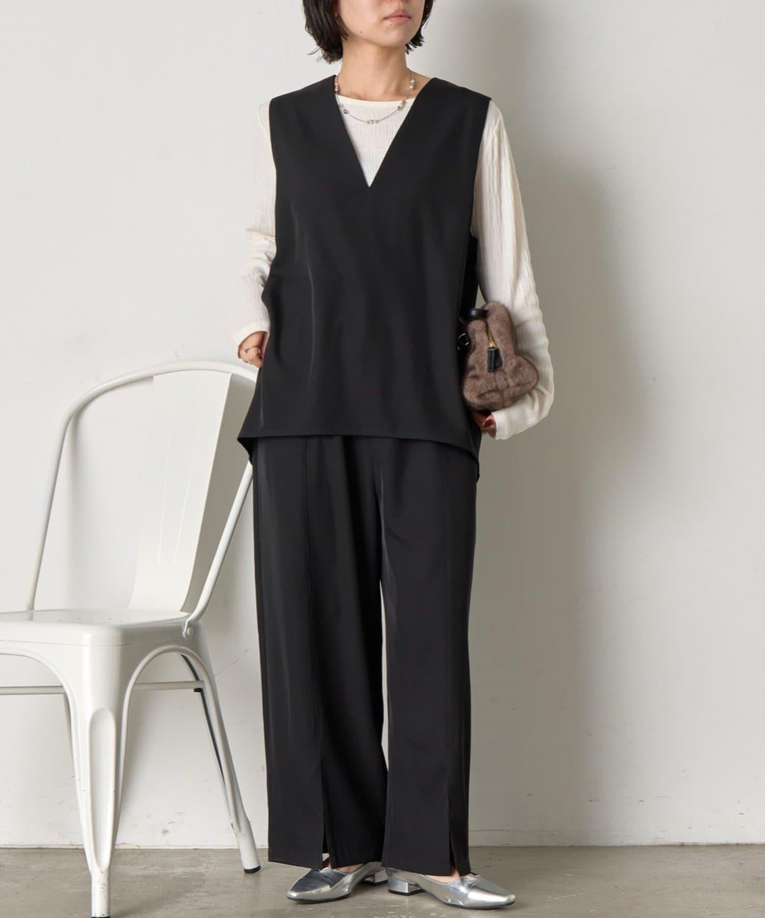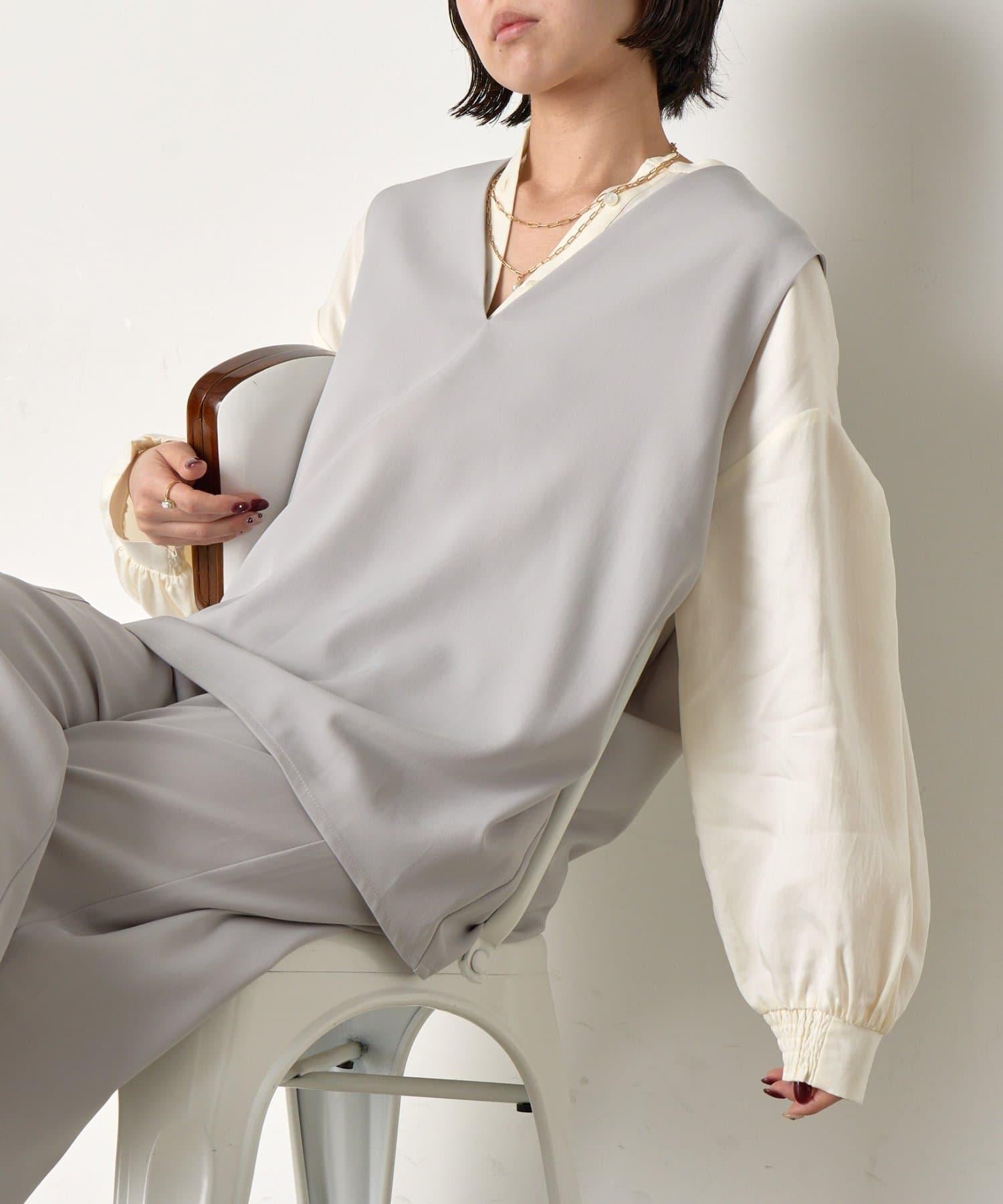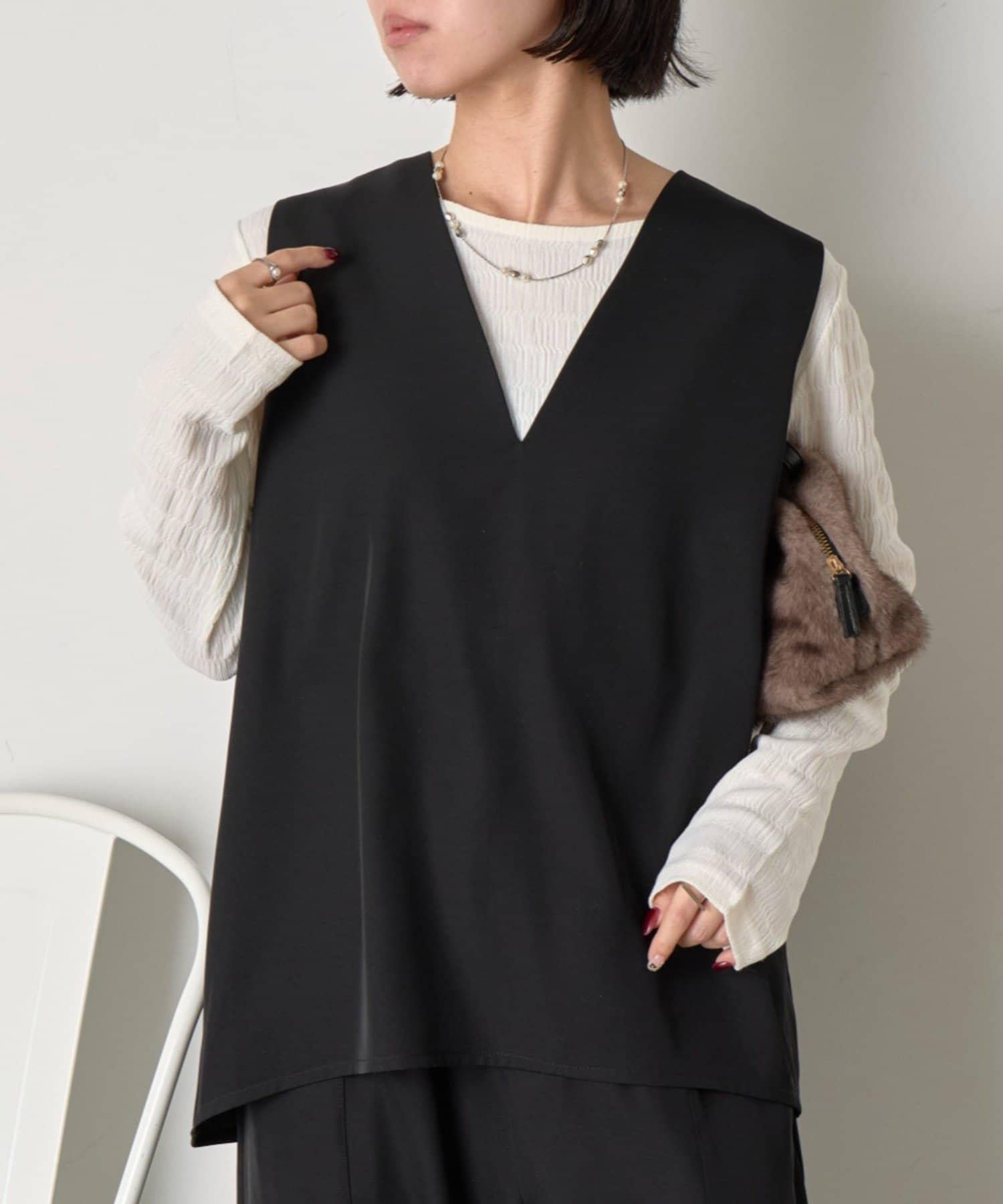 上衣採用深 V 領設計,廓形寬鬆,不挑身體線條。