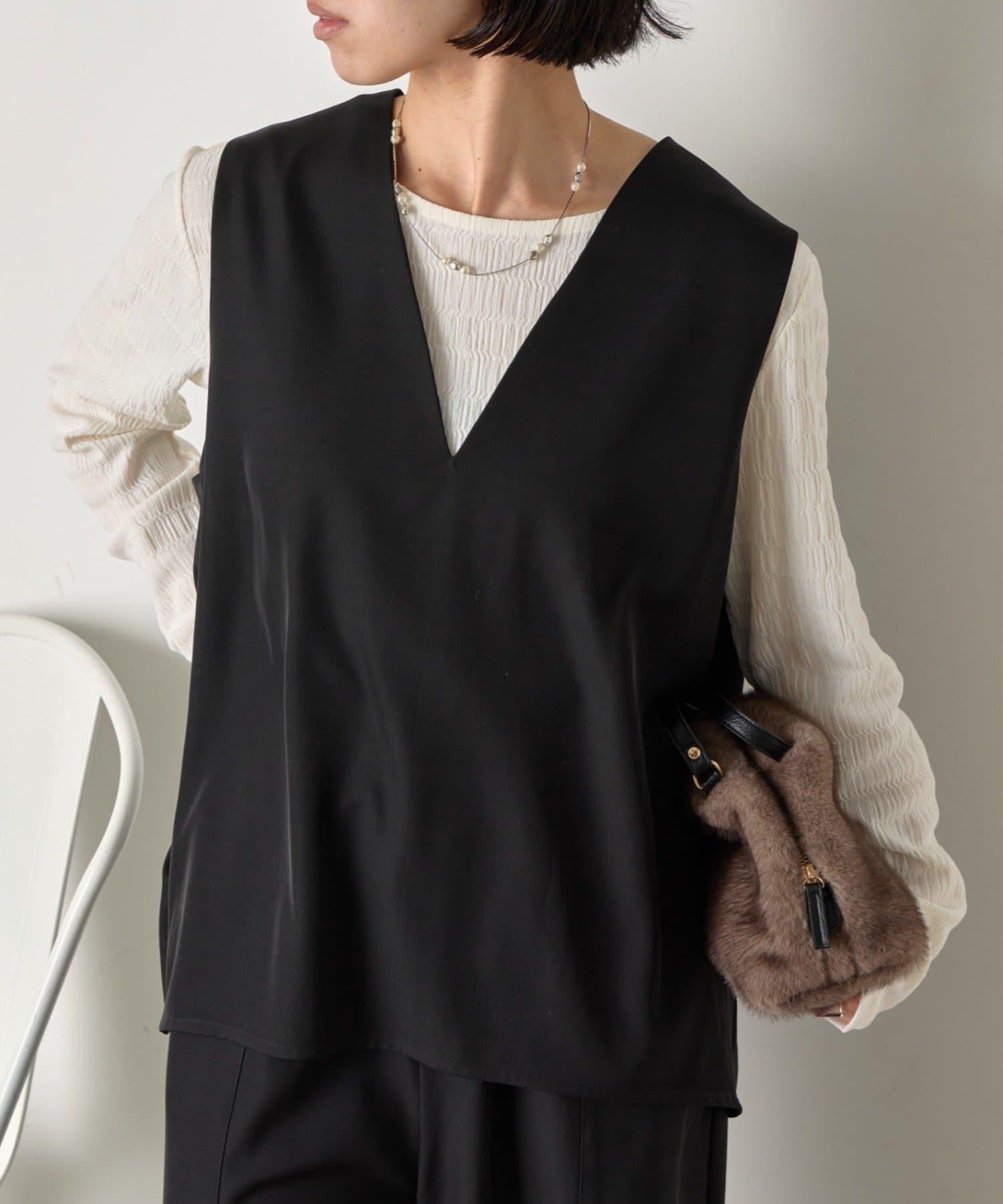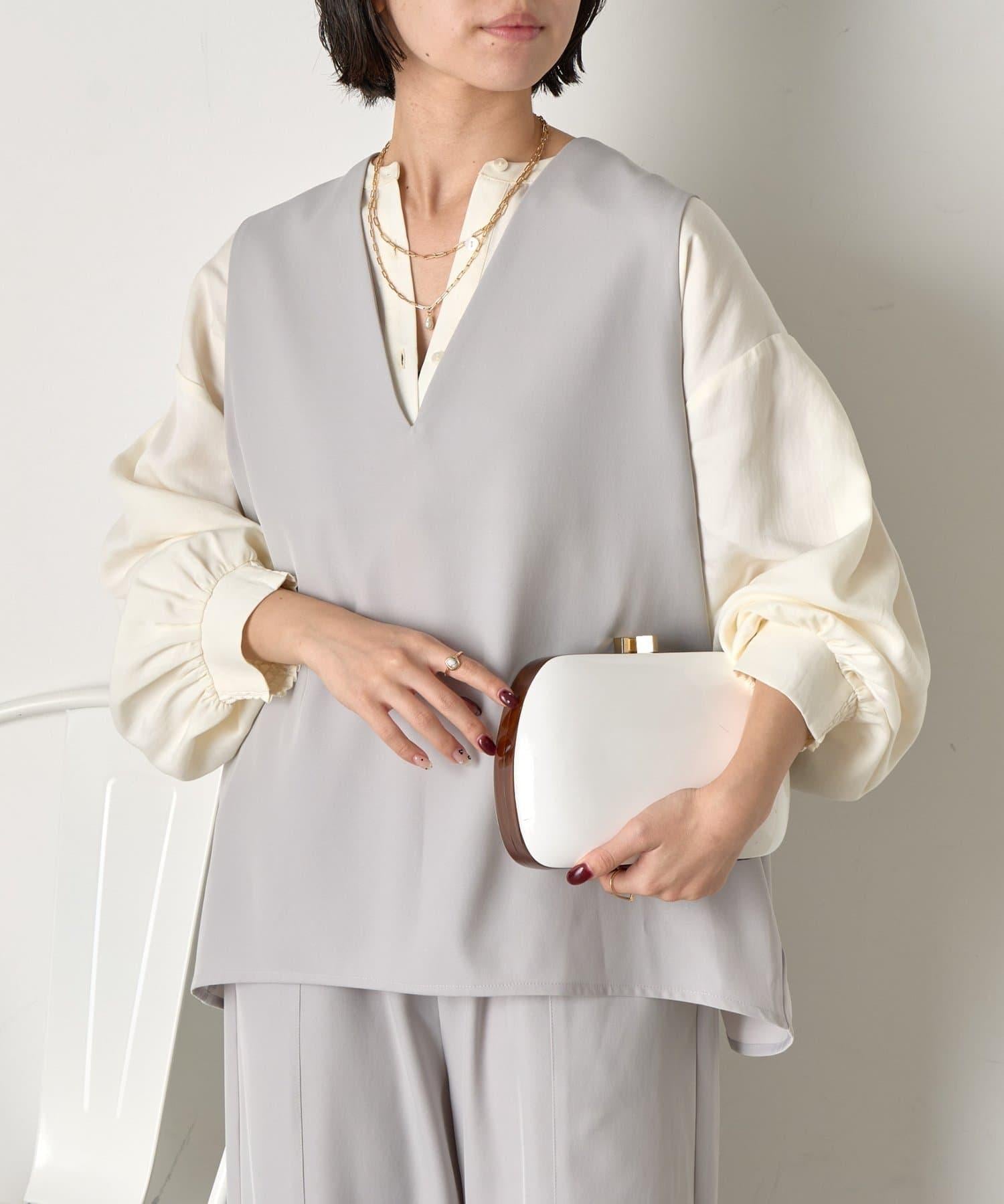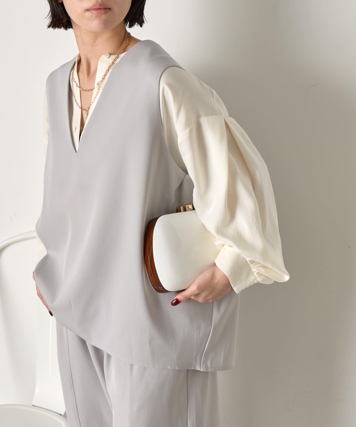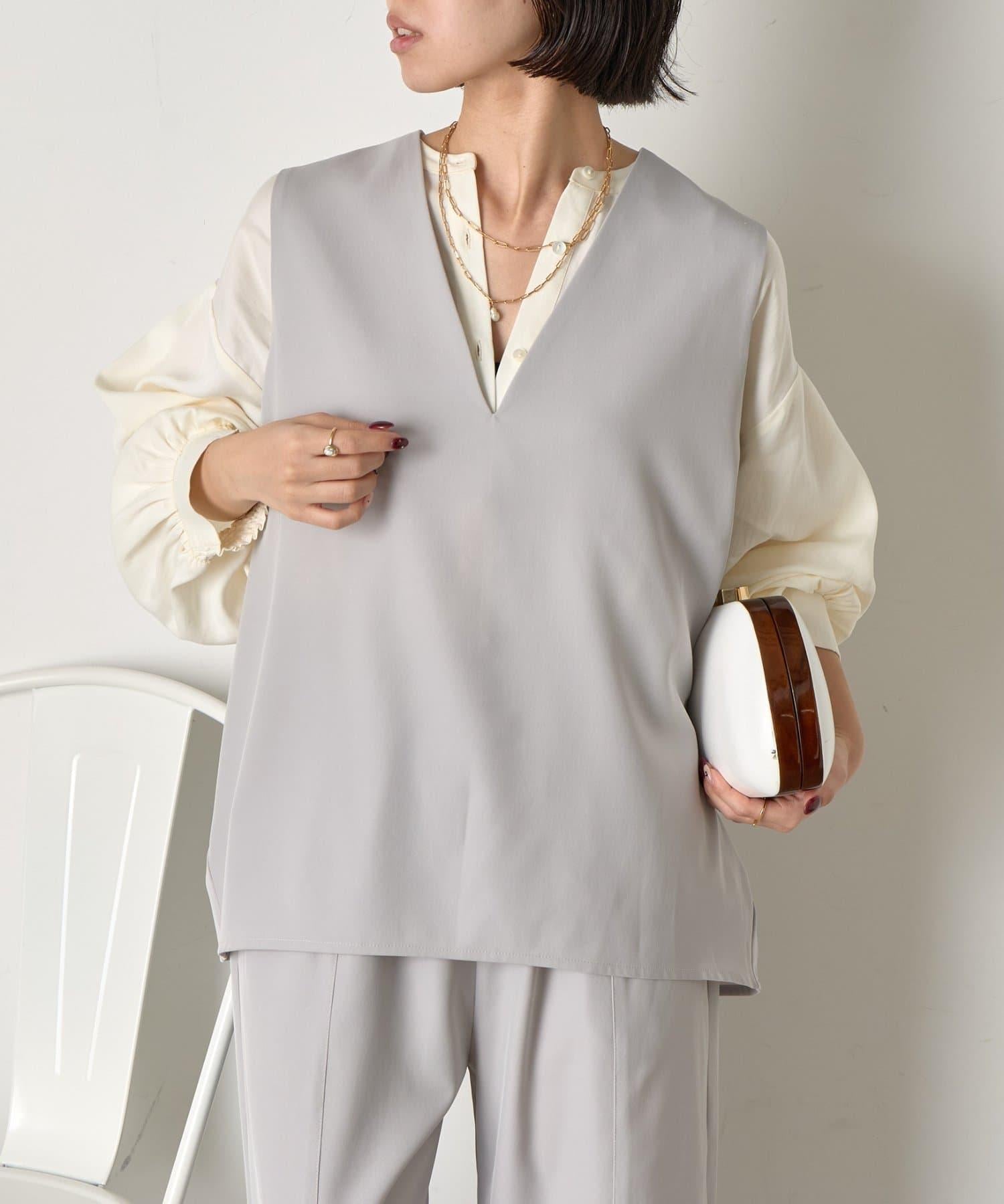 上衣採用深 V 領設計,頸部線條簡潔,版型寬鬆,不會勾勒出身體線條。