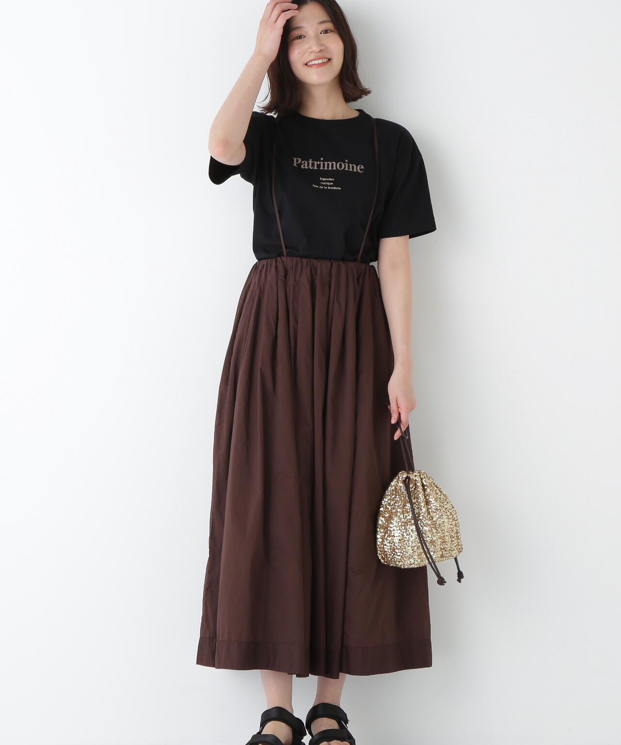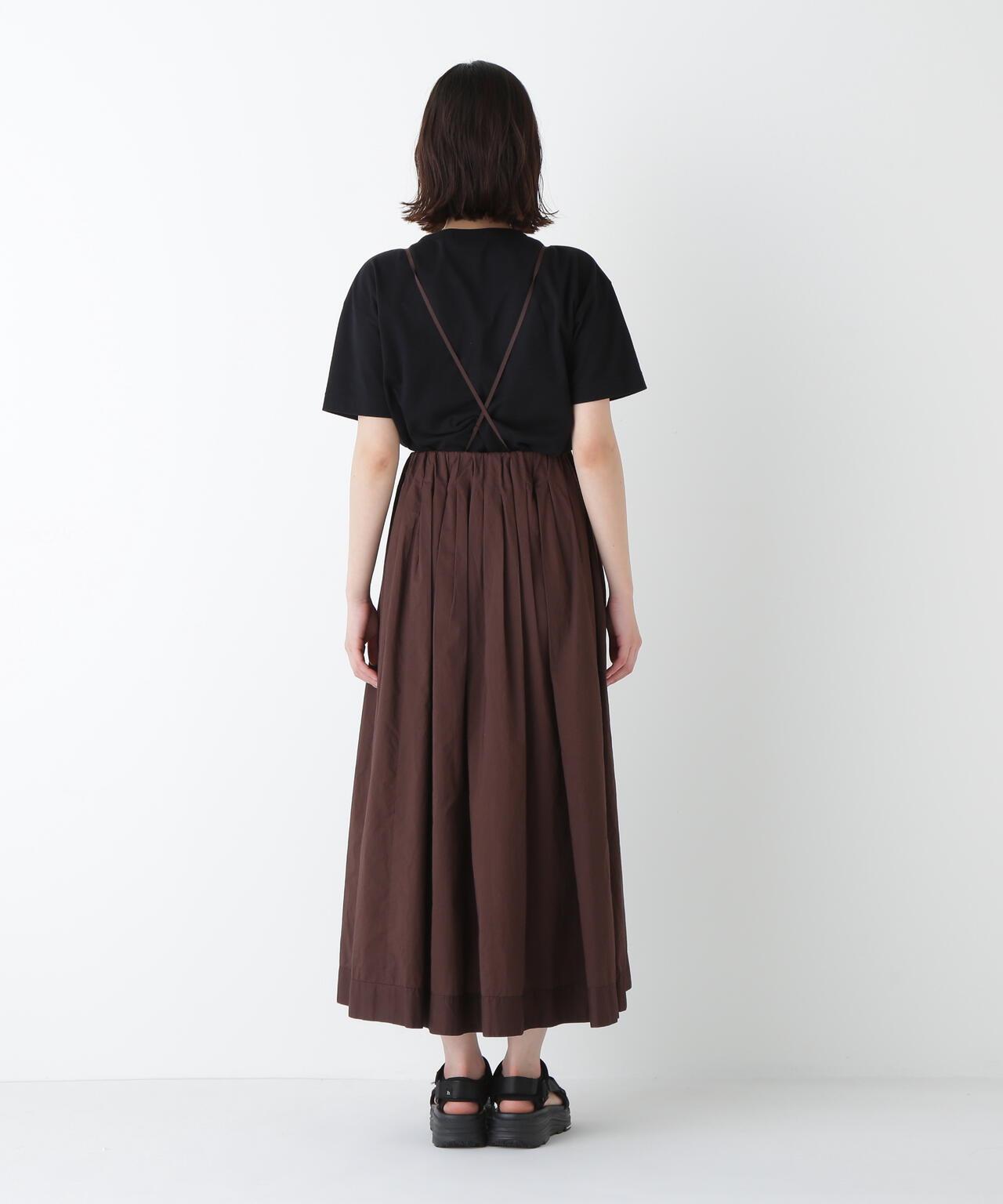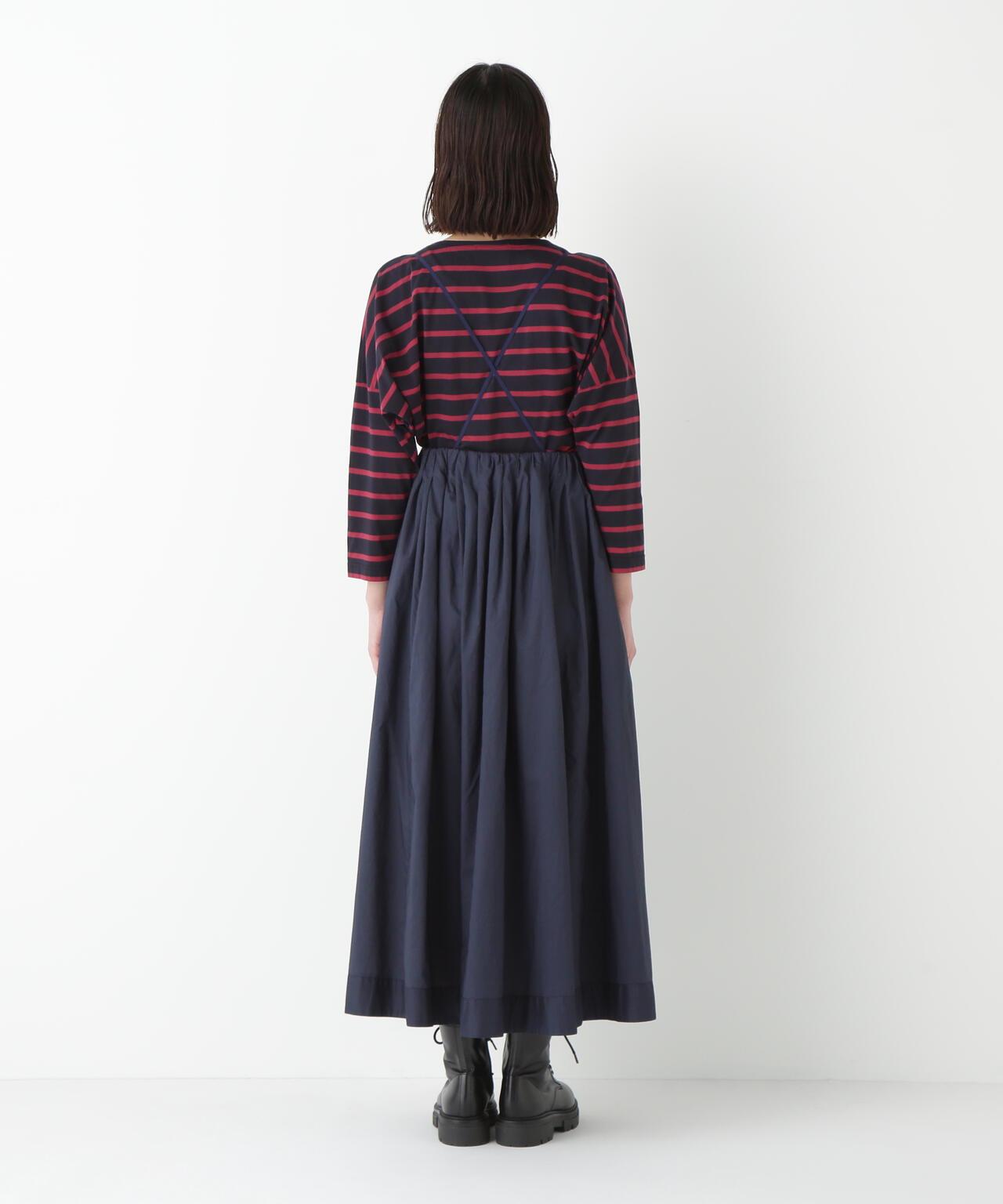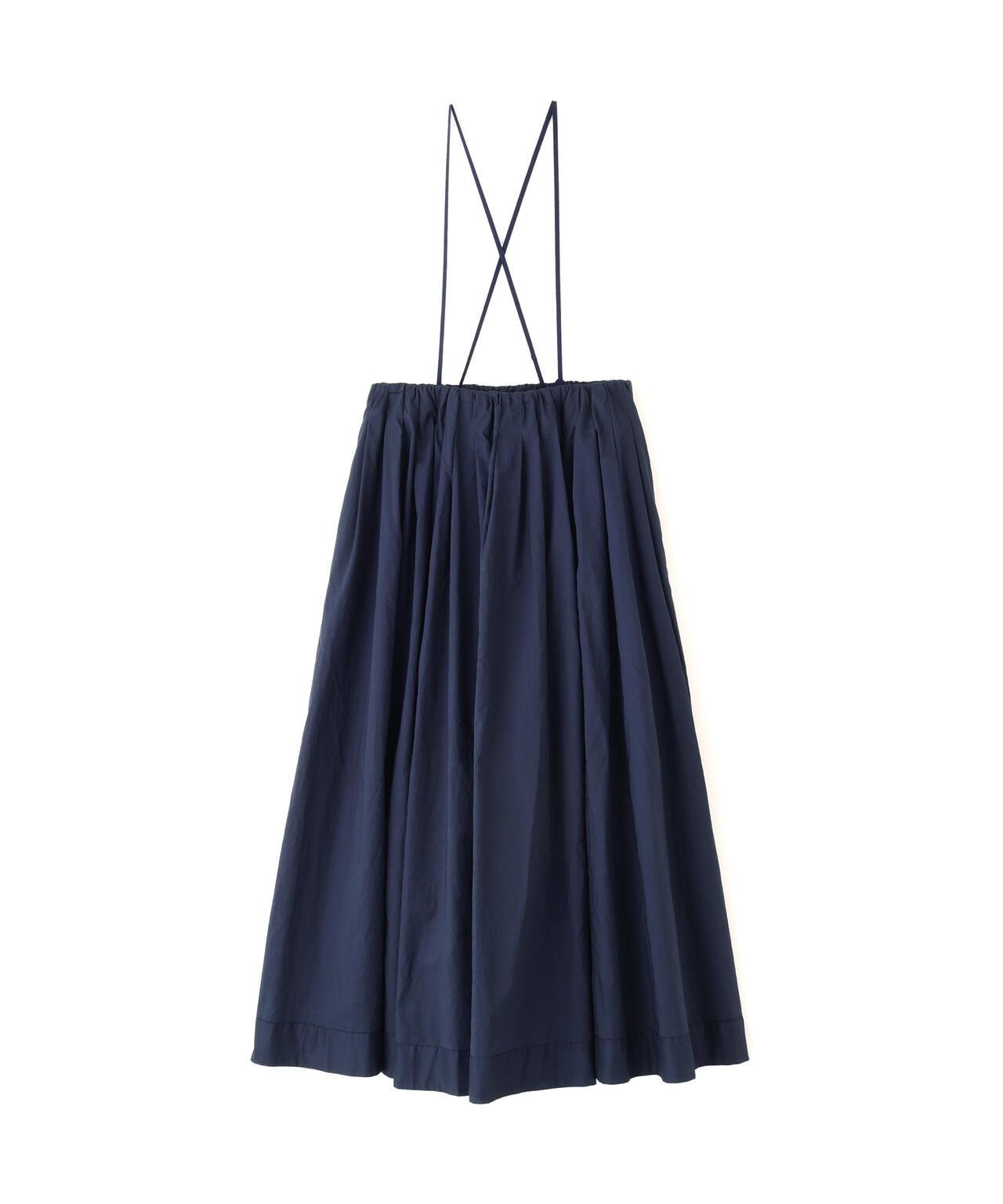 帶肩帶的褶皺長裙,可佈置成成人休閒風格 [設計要點] 這款豐盈的長裙腰部收得很細,內側有鬆緊帶摺疊。裙子上有一條精緻的羅緞絲帶懸掛繩。裙子由薄而輕的 60 號有機棉製成。裙子的腰部有鬆緊帶,在腰部牢牢固定,因此肩帶既可以掛起來穿,也可以垂在兩側穿。上衣為 T 恤或背心,建議搭配輕便的梭織上衣,造型休閒。
