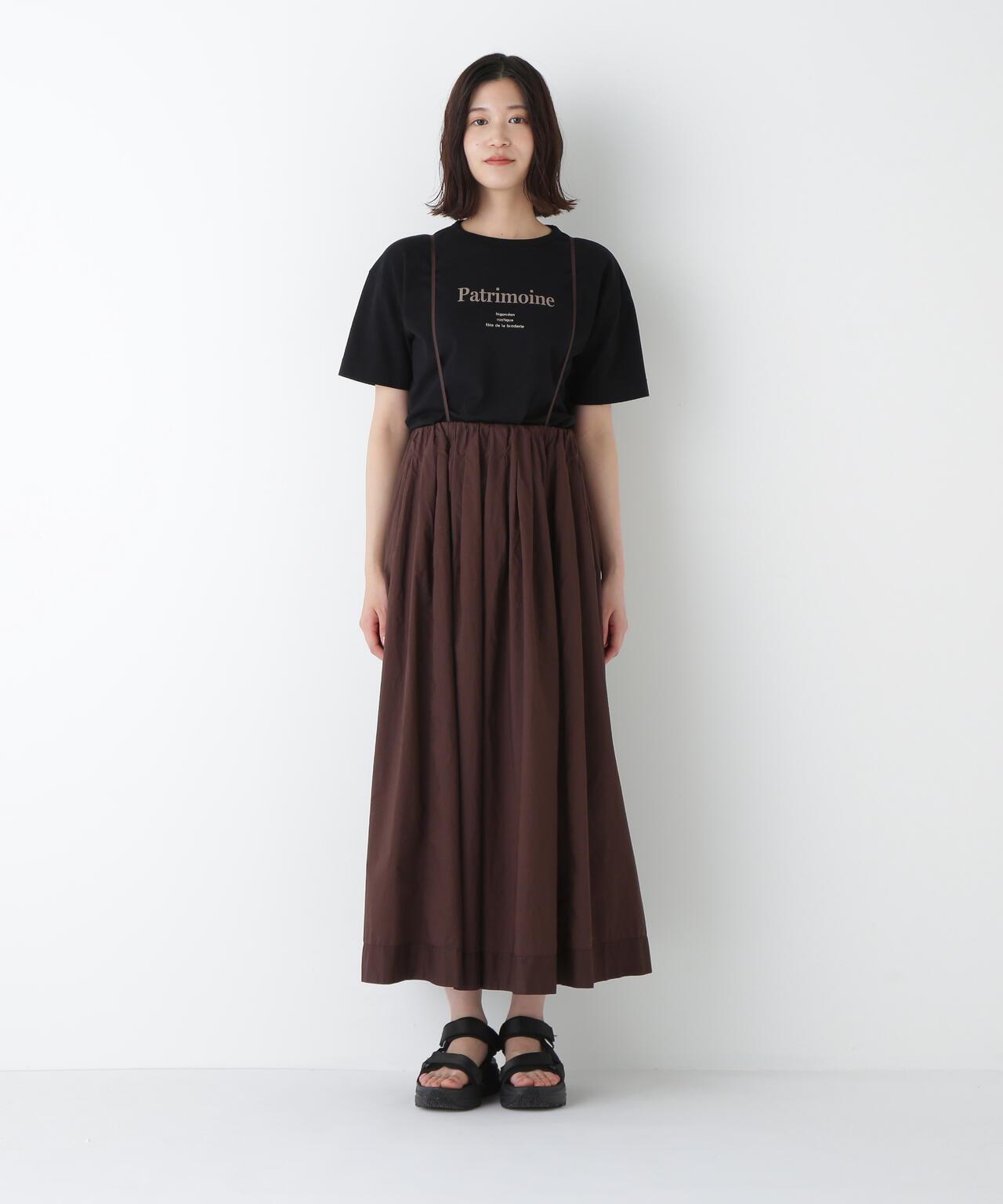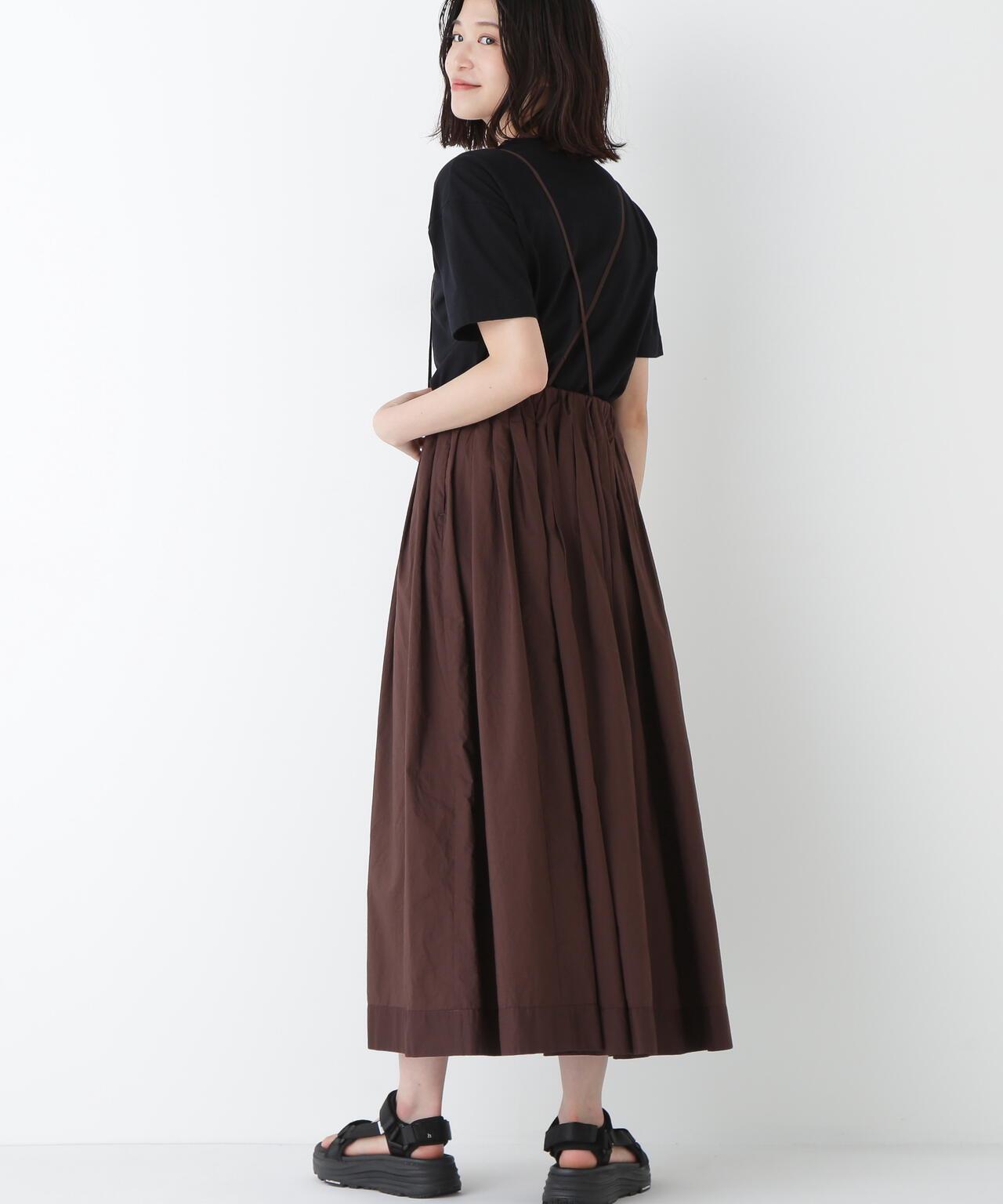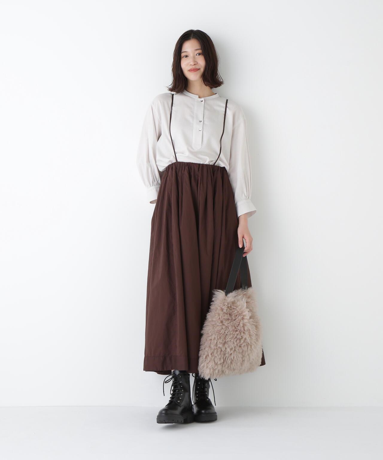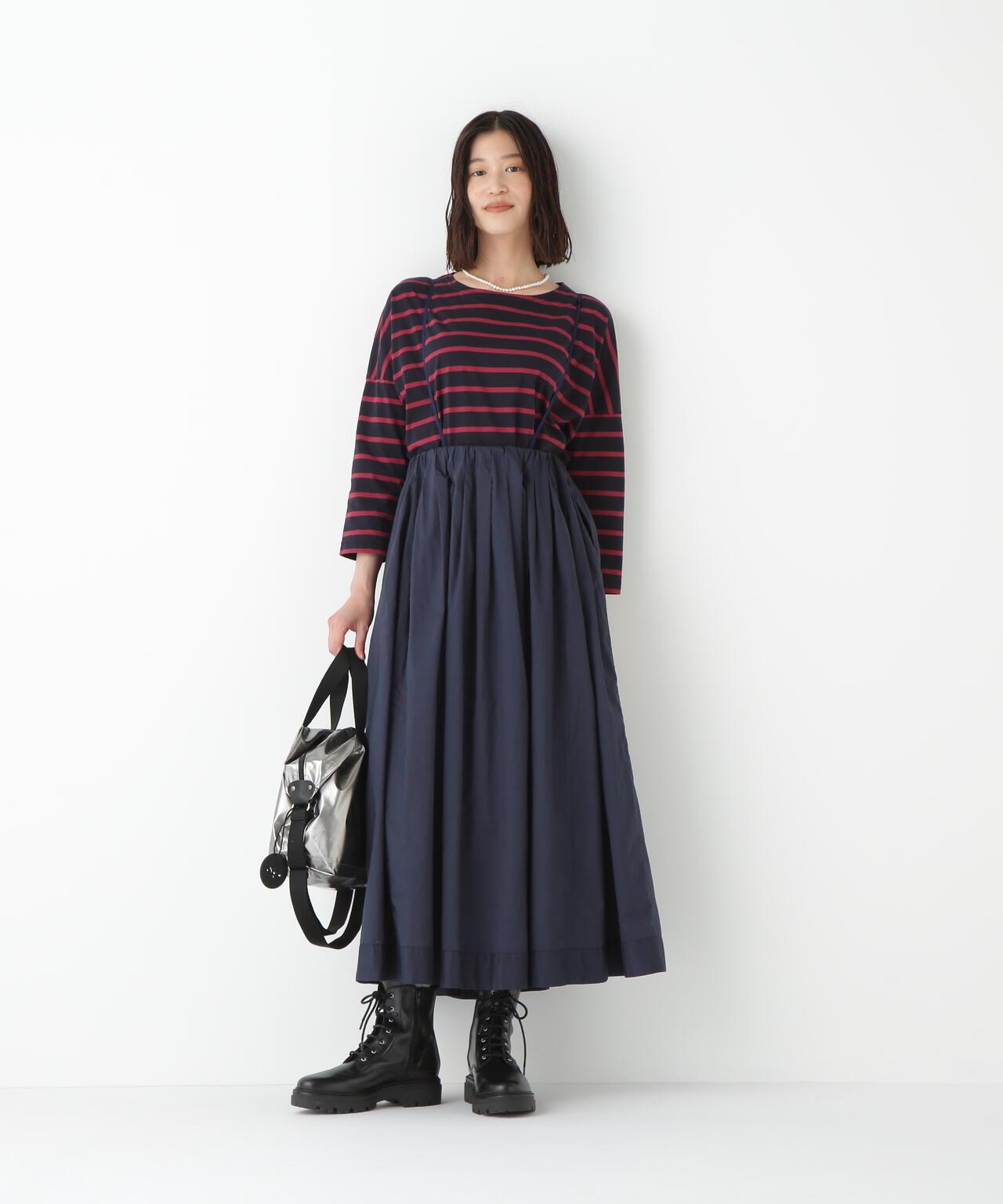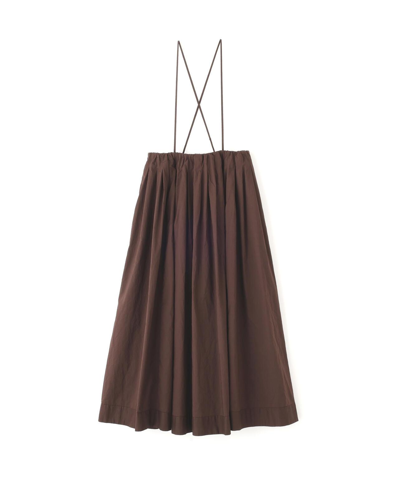 帶肩帶的褶皺長裙,可佈置成成人休閒風格 [設計要點] 這款豐盈的長裙腰部收得很細,內側有鬆緊帶摺疊。裙子上有一條精緻的羅緞絲帶懸掛繩。裙子由薄而輕的 60 號有機棉製成。裙子的腰部有鬆緊帶,在腰部牢牢固定,因此肩帶既可以掛起來穿,也可以垂在兩側穿。上衣為 T 恤或背心,建議搭配輕便的梭織上衣,造型休閒。