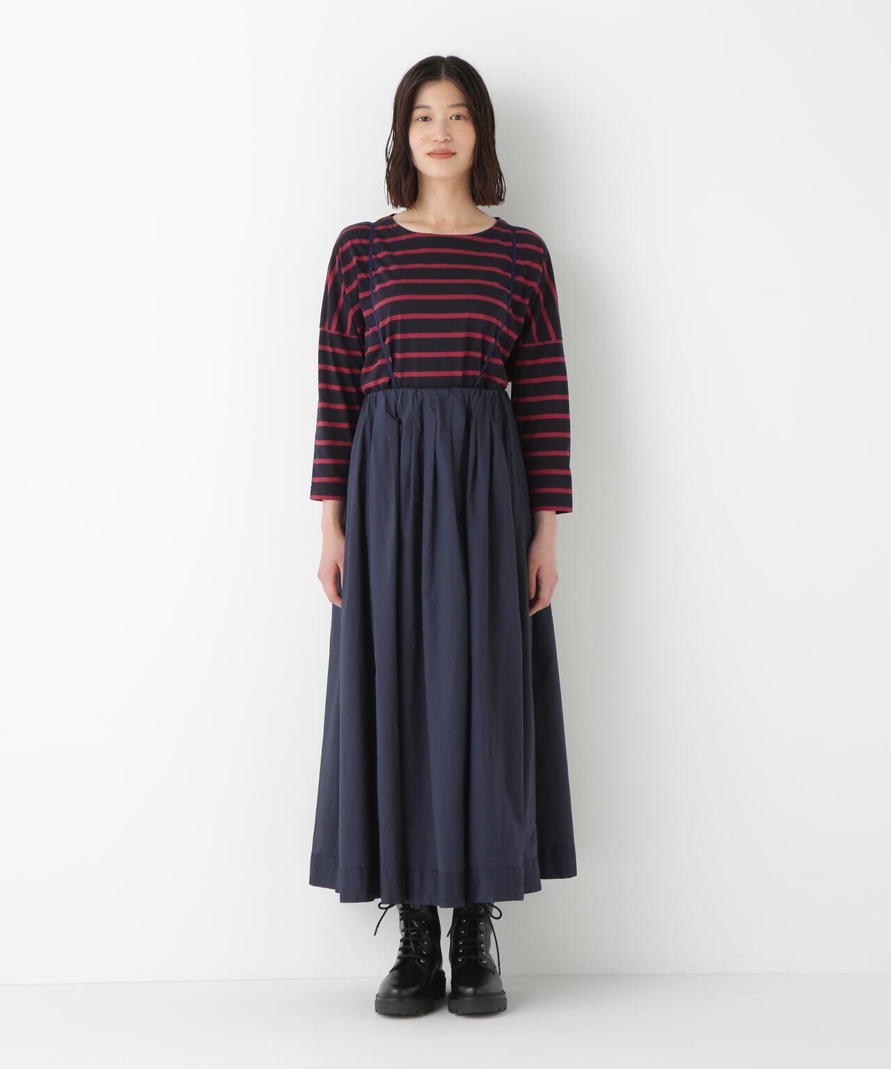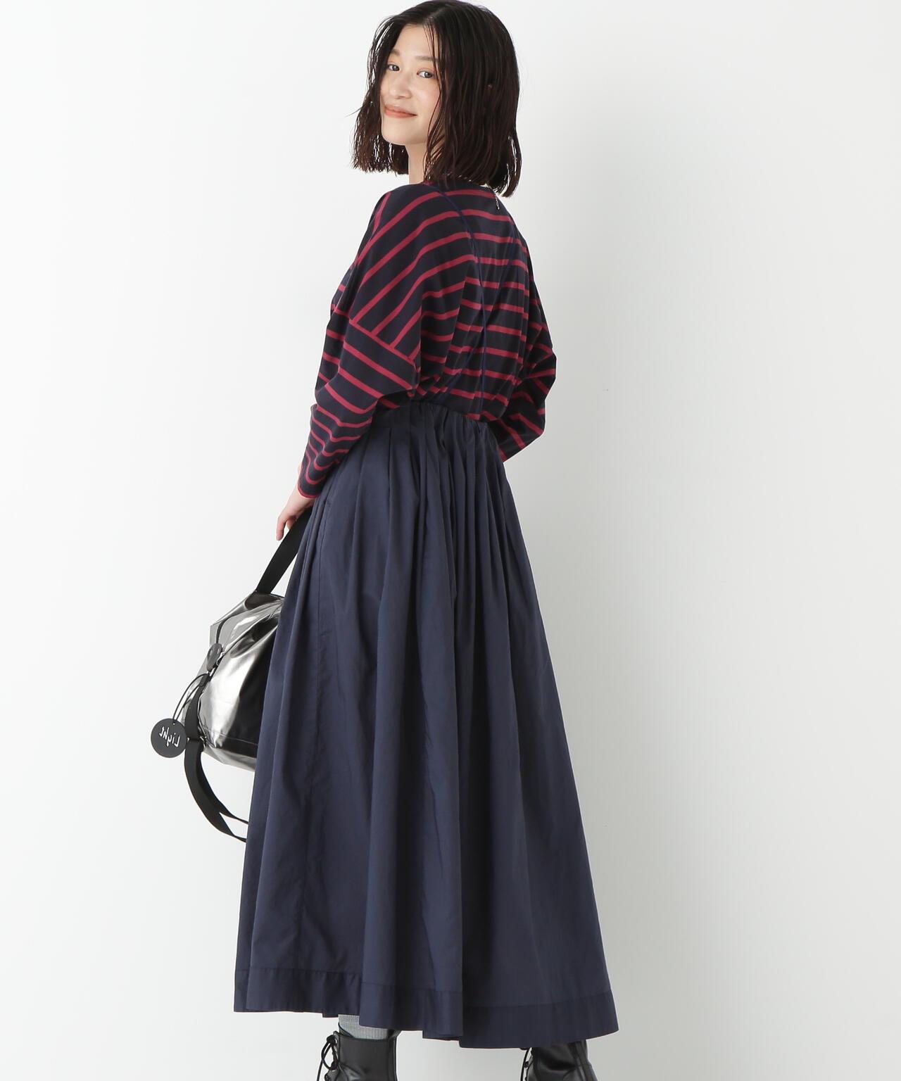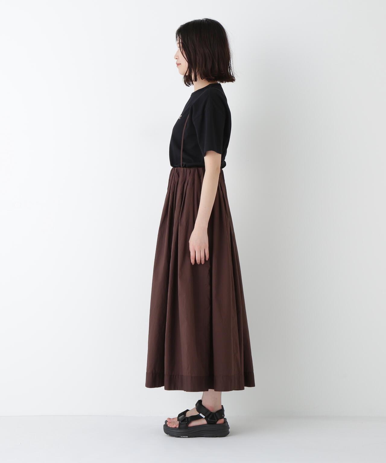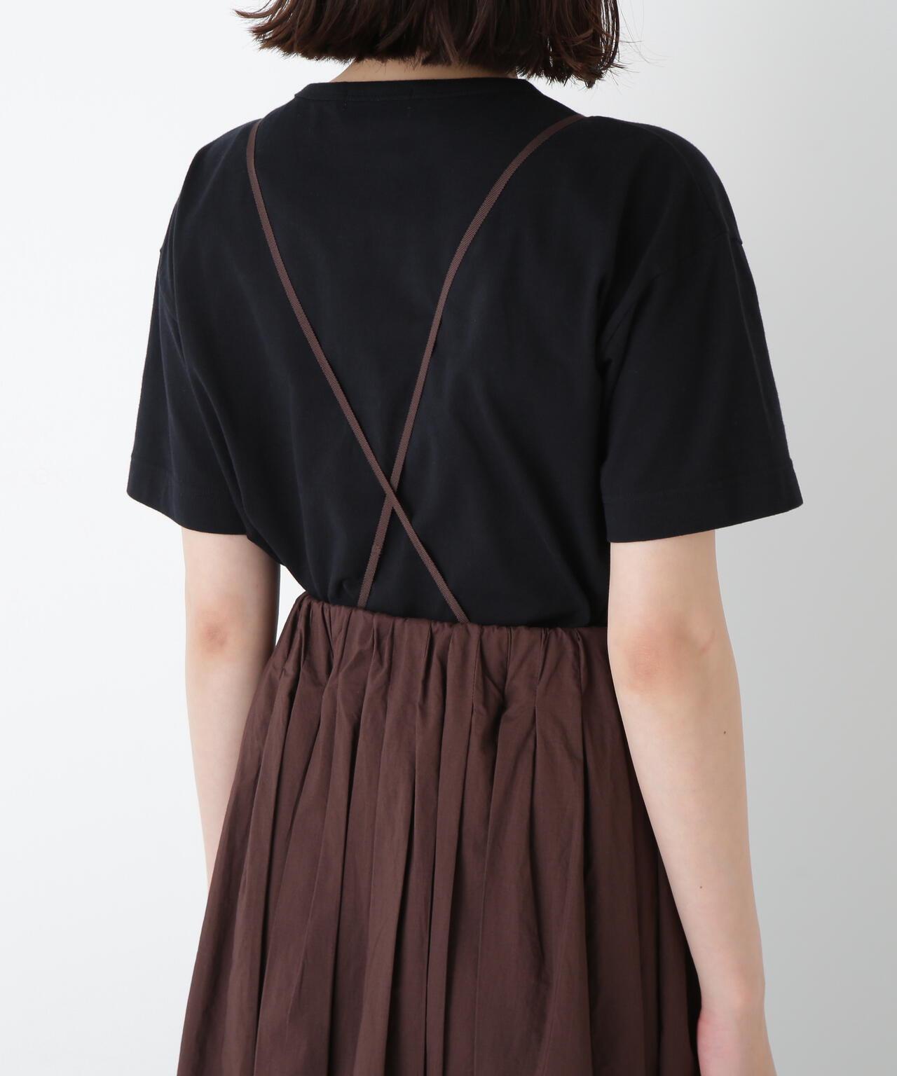 帶肩帶的褶皺長裙,可佈置成成人休閒風格 [設計要點] 這款豐盈的長裙腰部收得很細,內側有鬆緊帶摺疊。裙子上有一條精緻的羅緞絲帶懸掛繩。裙子由薄而輕的 60 號有機棉製成。裙子的腰部有鬆緊帶,在腰部牢牢固定,因此肩帶既可以掛起來穿,也可以垂在兩側穿。上衣為 T 恤或背心,建議搭配輕便的梭織上衣,造型休閒。