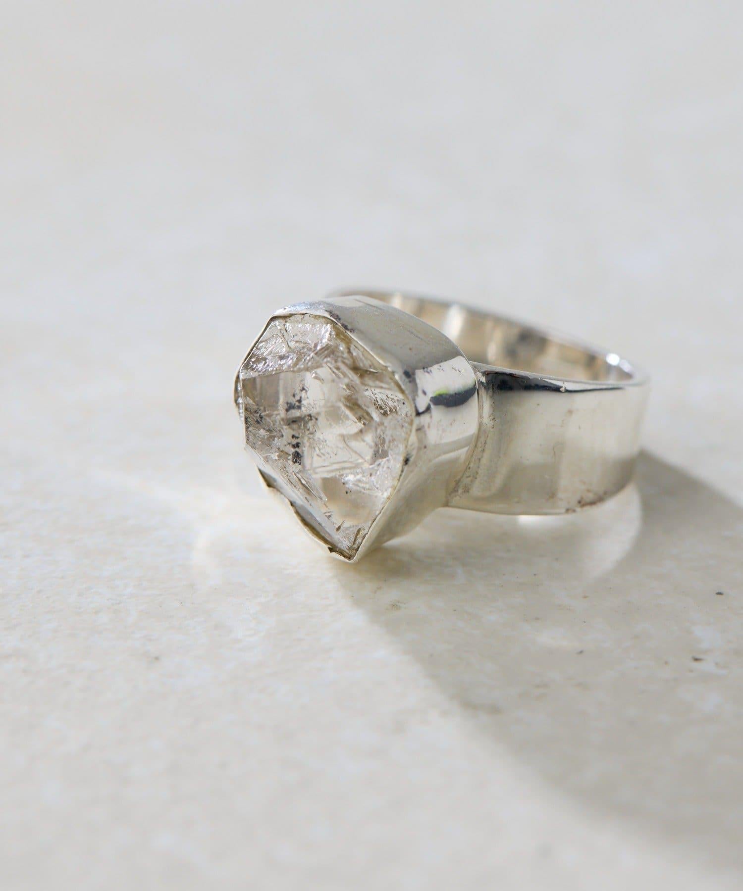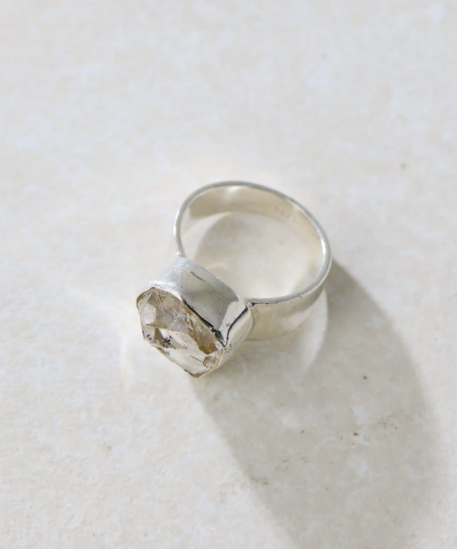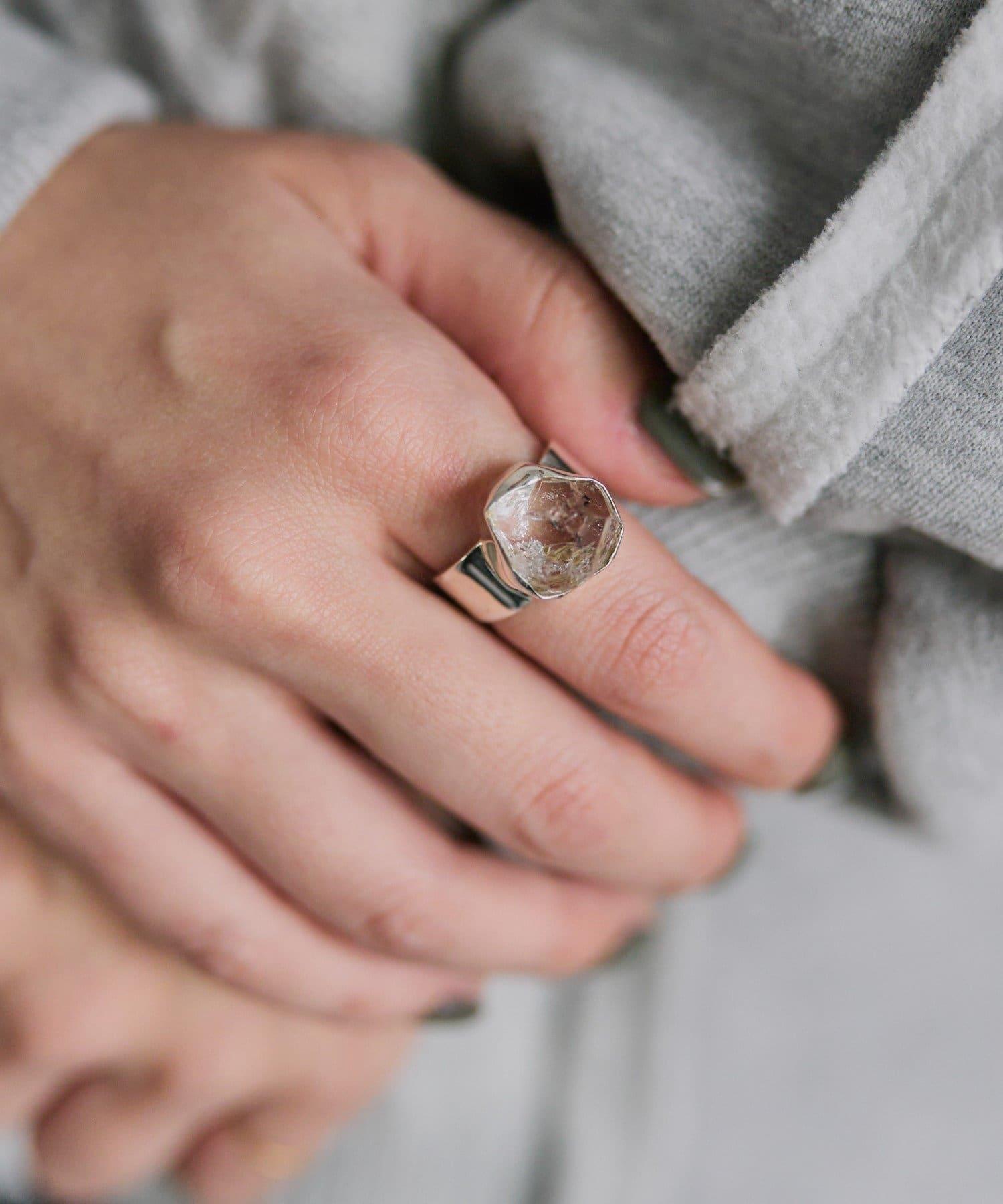 戒指頂部由隨機切割的 Herkimer 鑽石和銀色邊框組成。