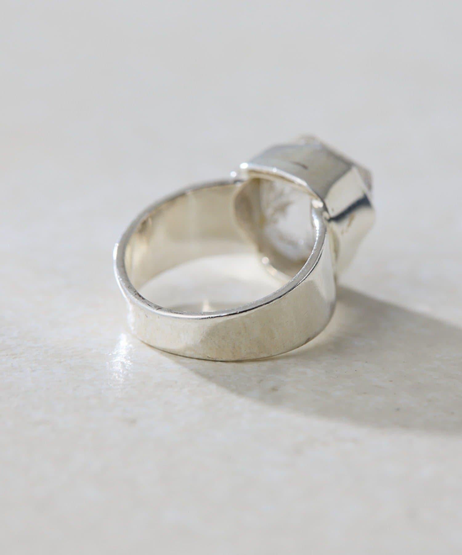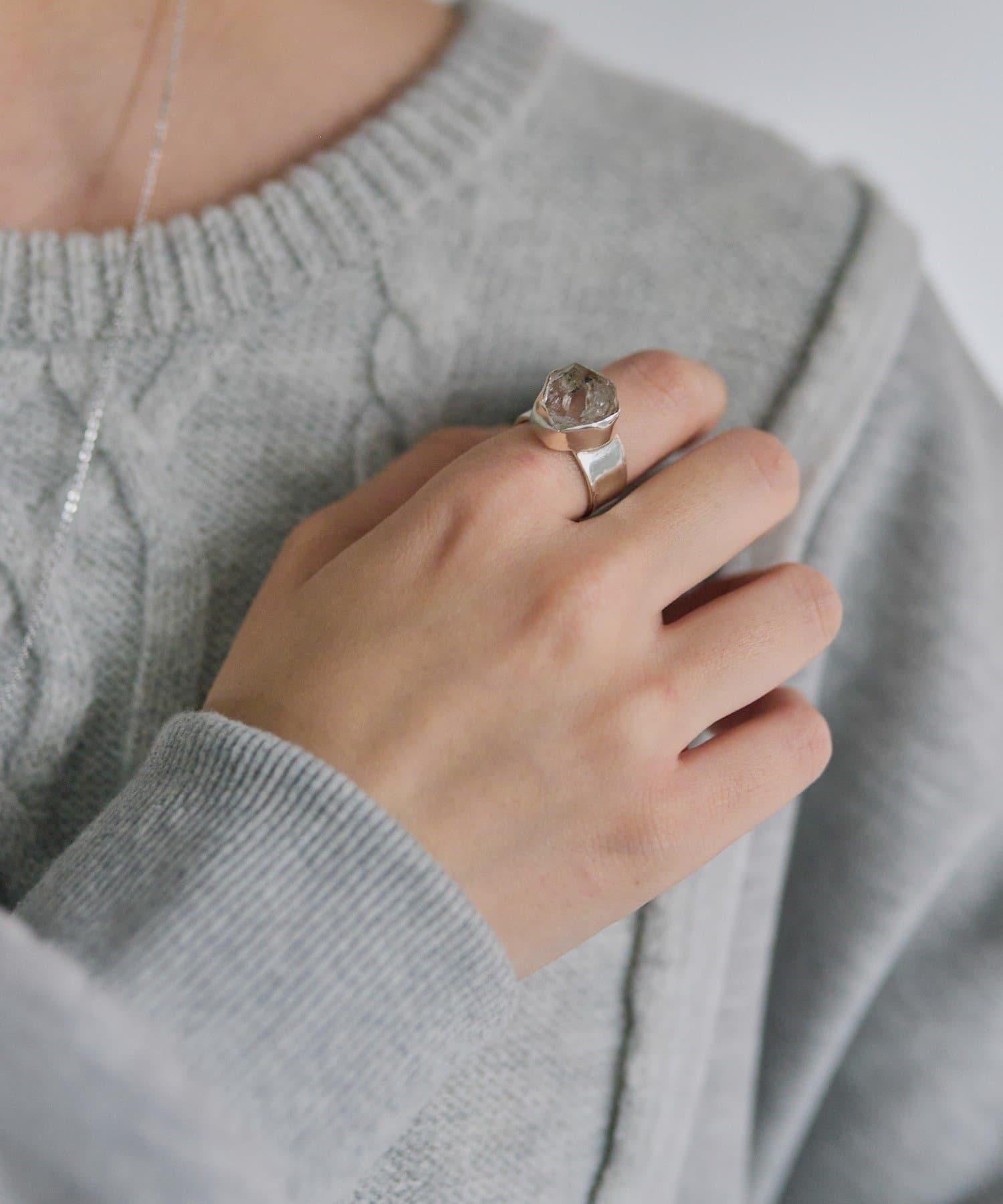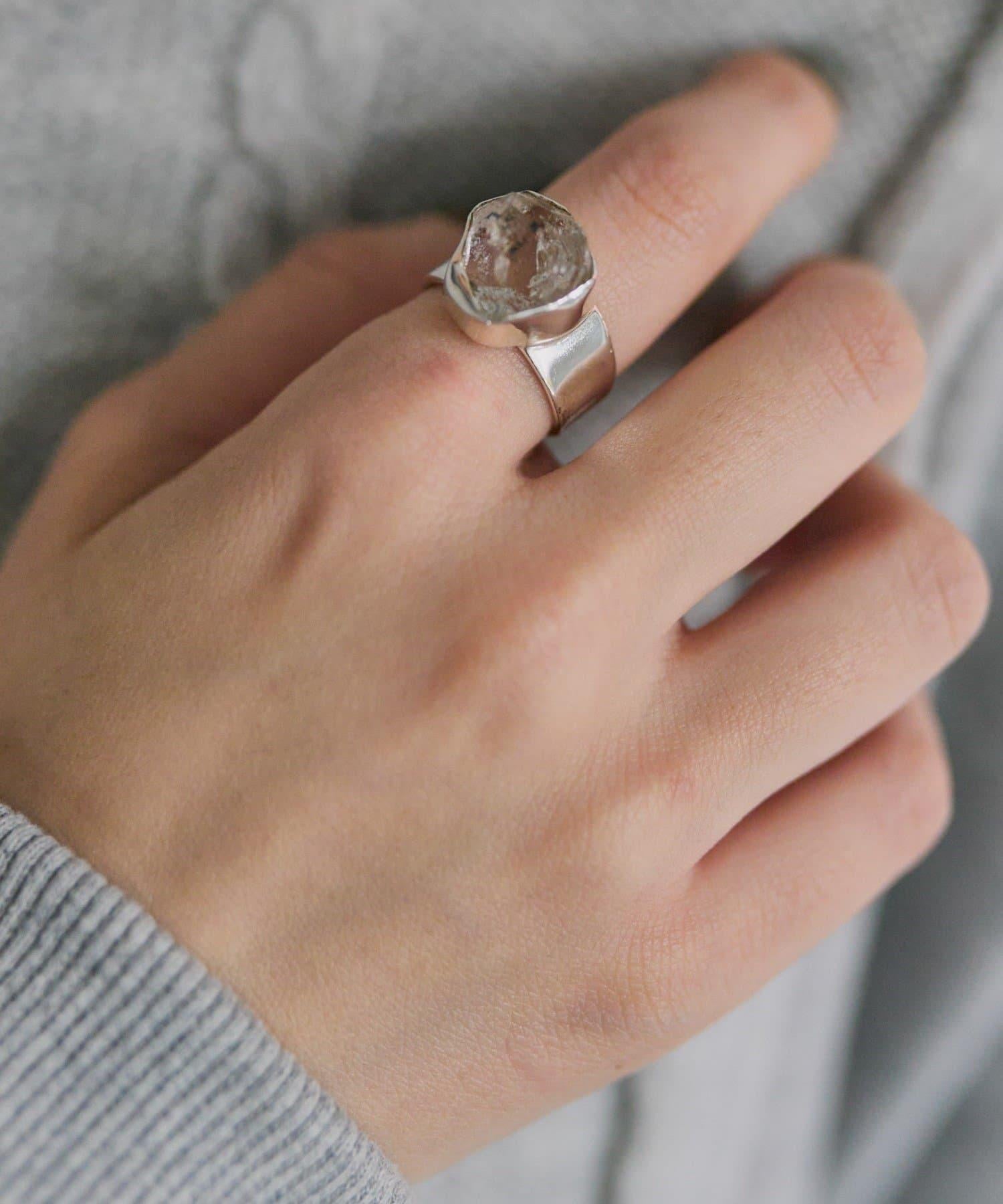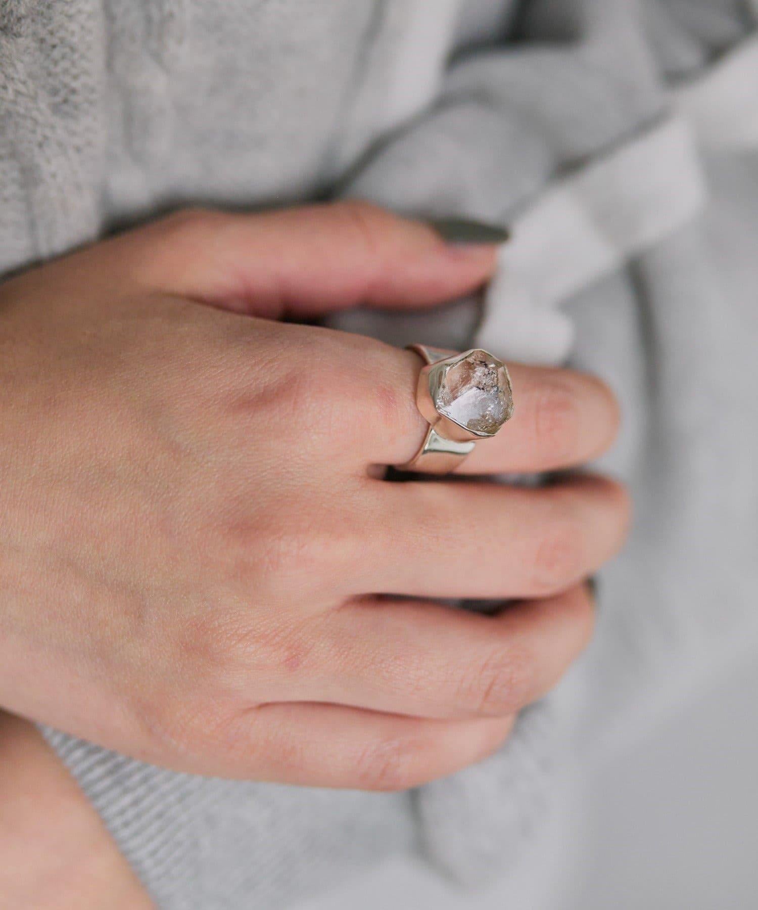 戒指頂部由隨機切割的 Herkimer 鑽石和銀色邊框組成。