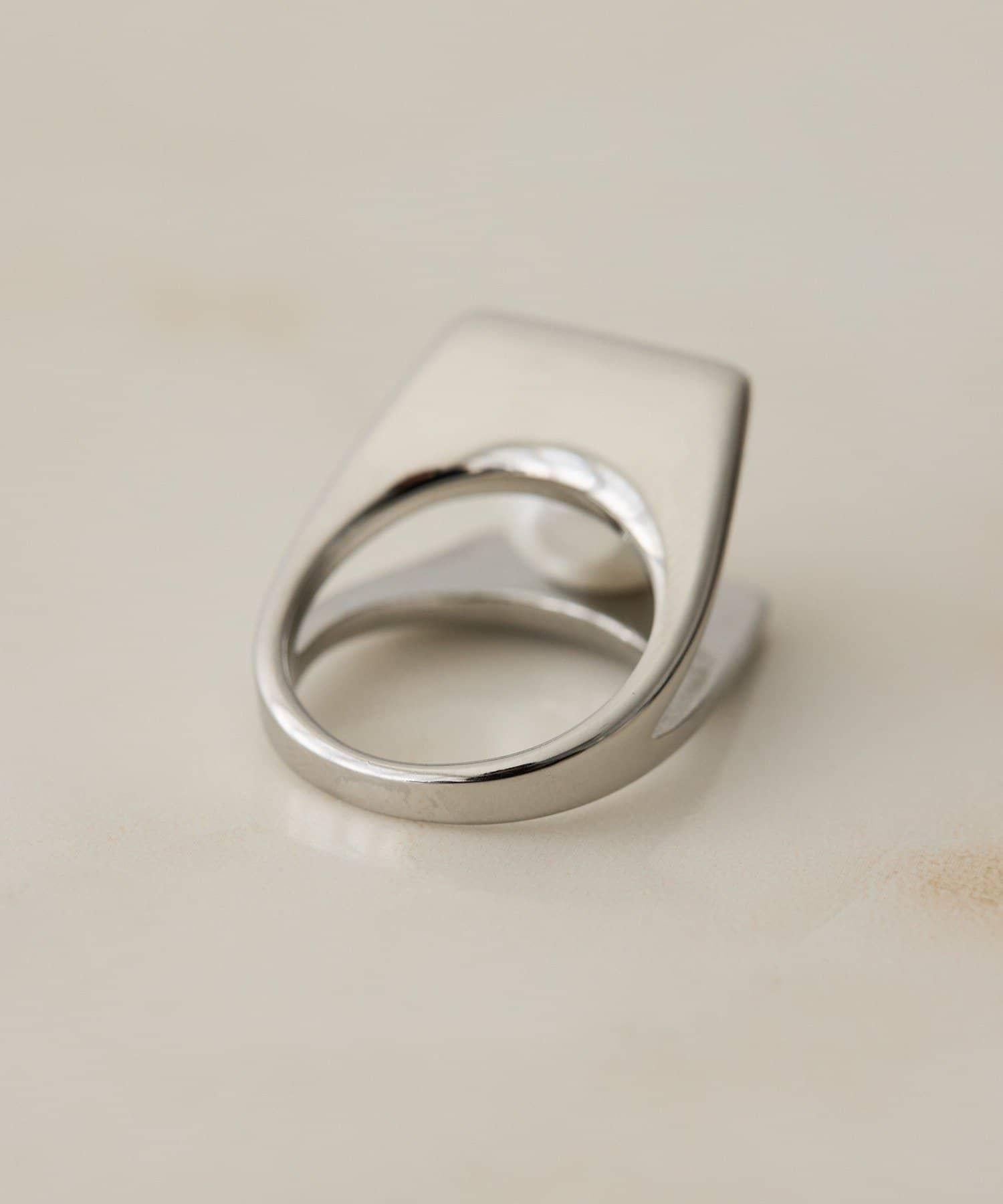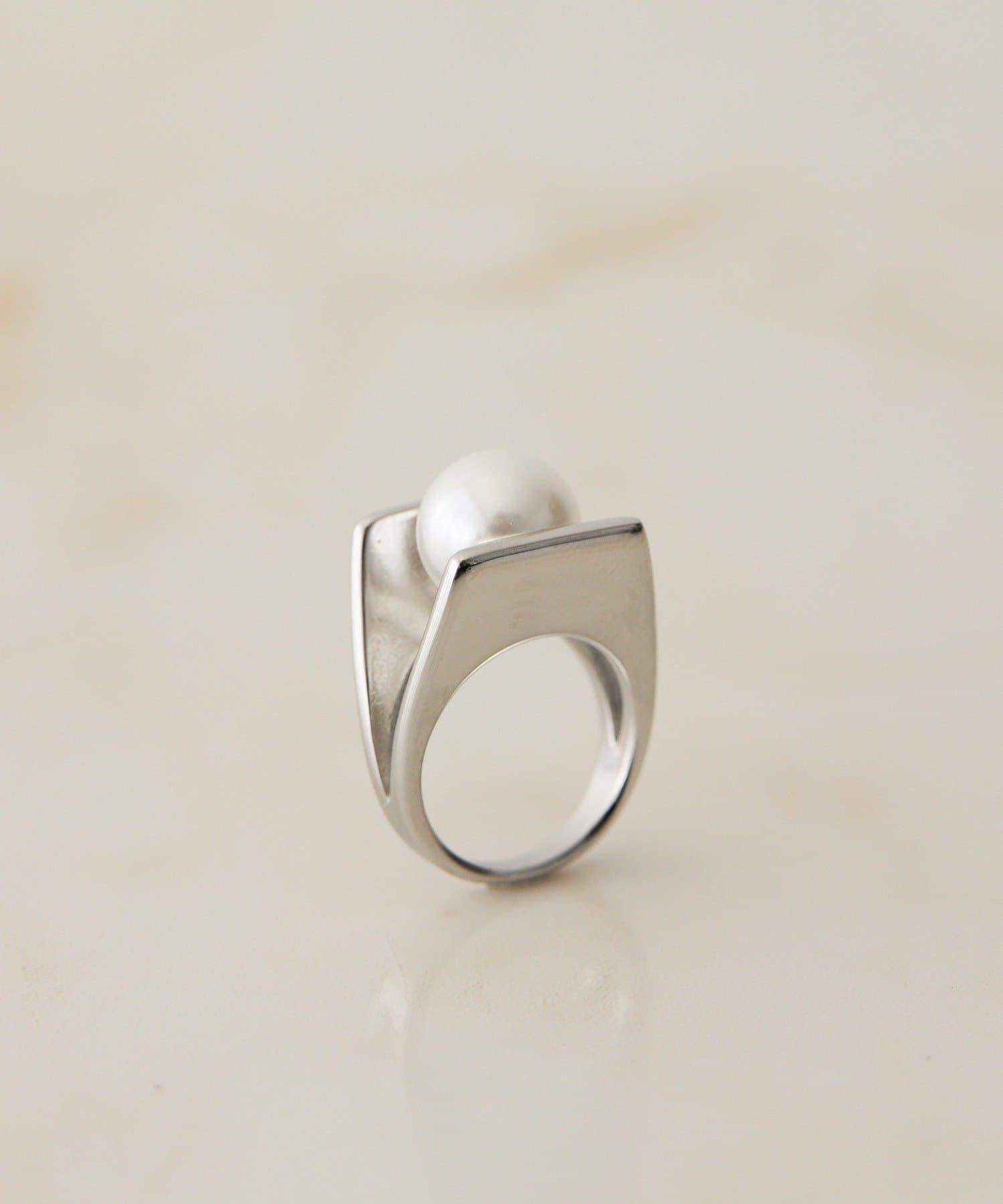 這是一款具有現代藝術元素的戒指,在板狀戒指之間夾著大顆珍珠。