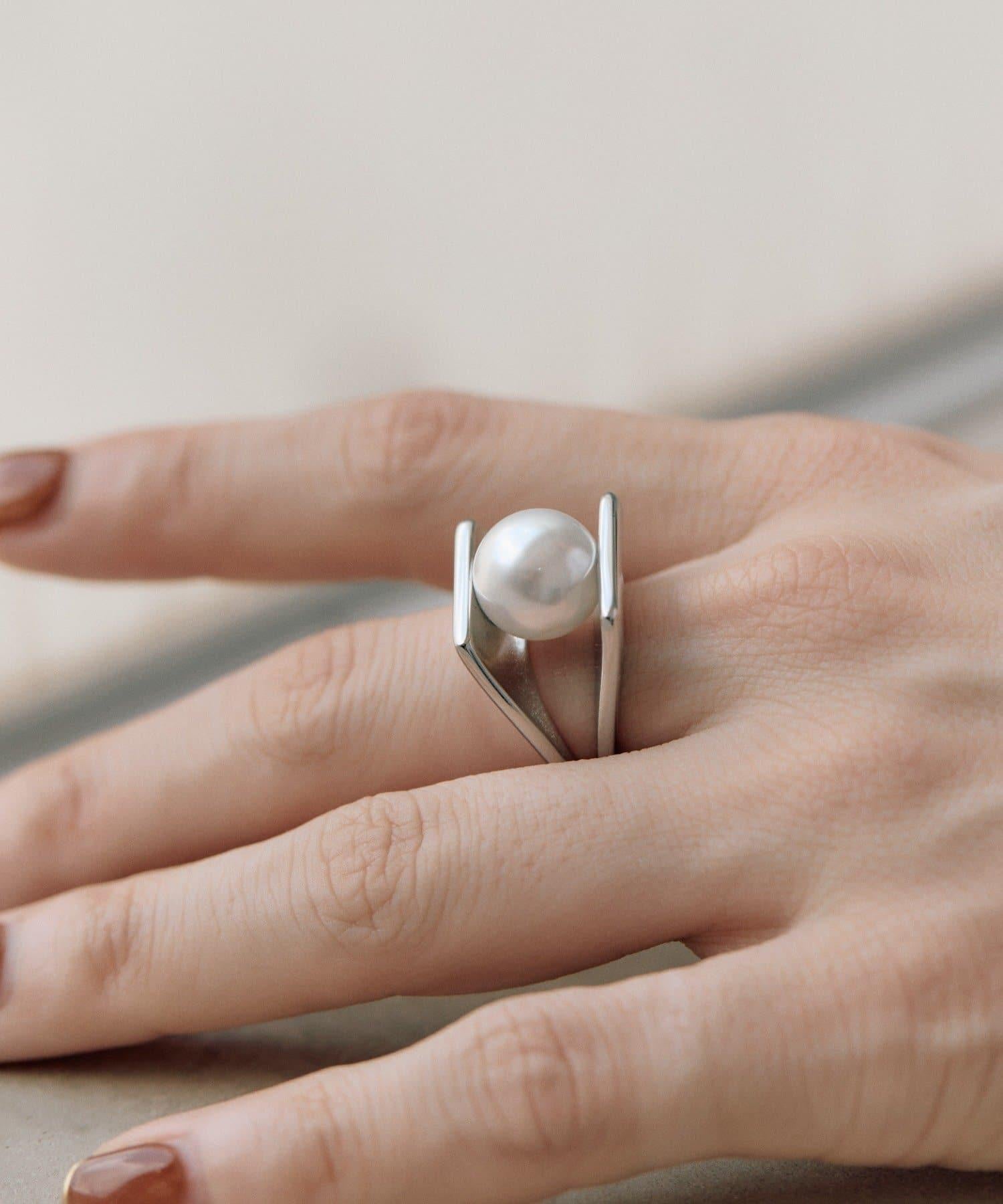 大顆珍珠大膽地夾在板狀戒指之間,為手部增添了精緻的點綴。