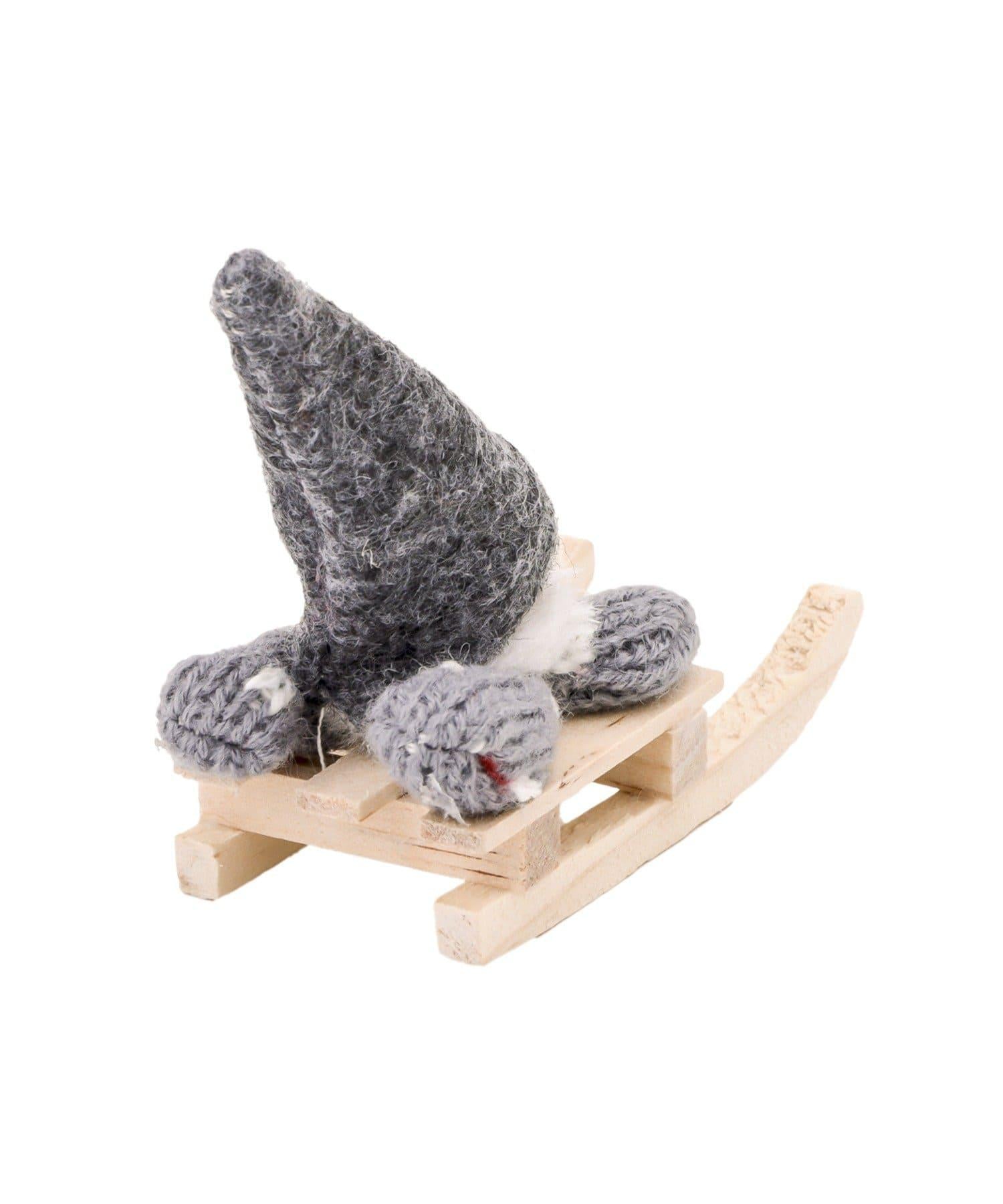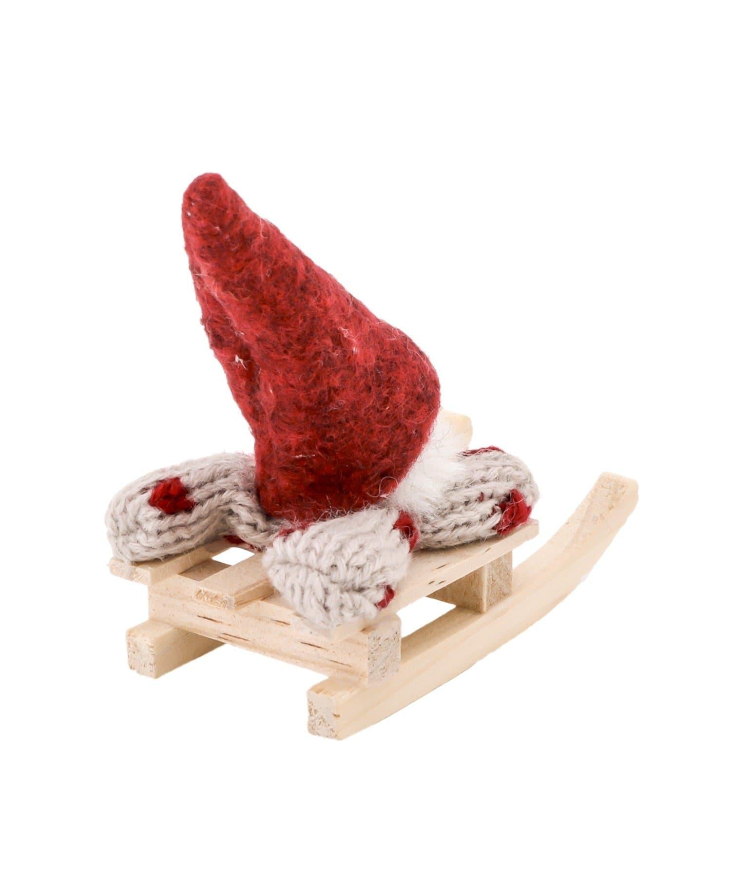 一個可愛的小傢伙坐在雪橇上,頭戴一頂印有愛心的帽子。