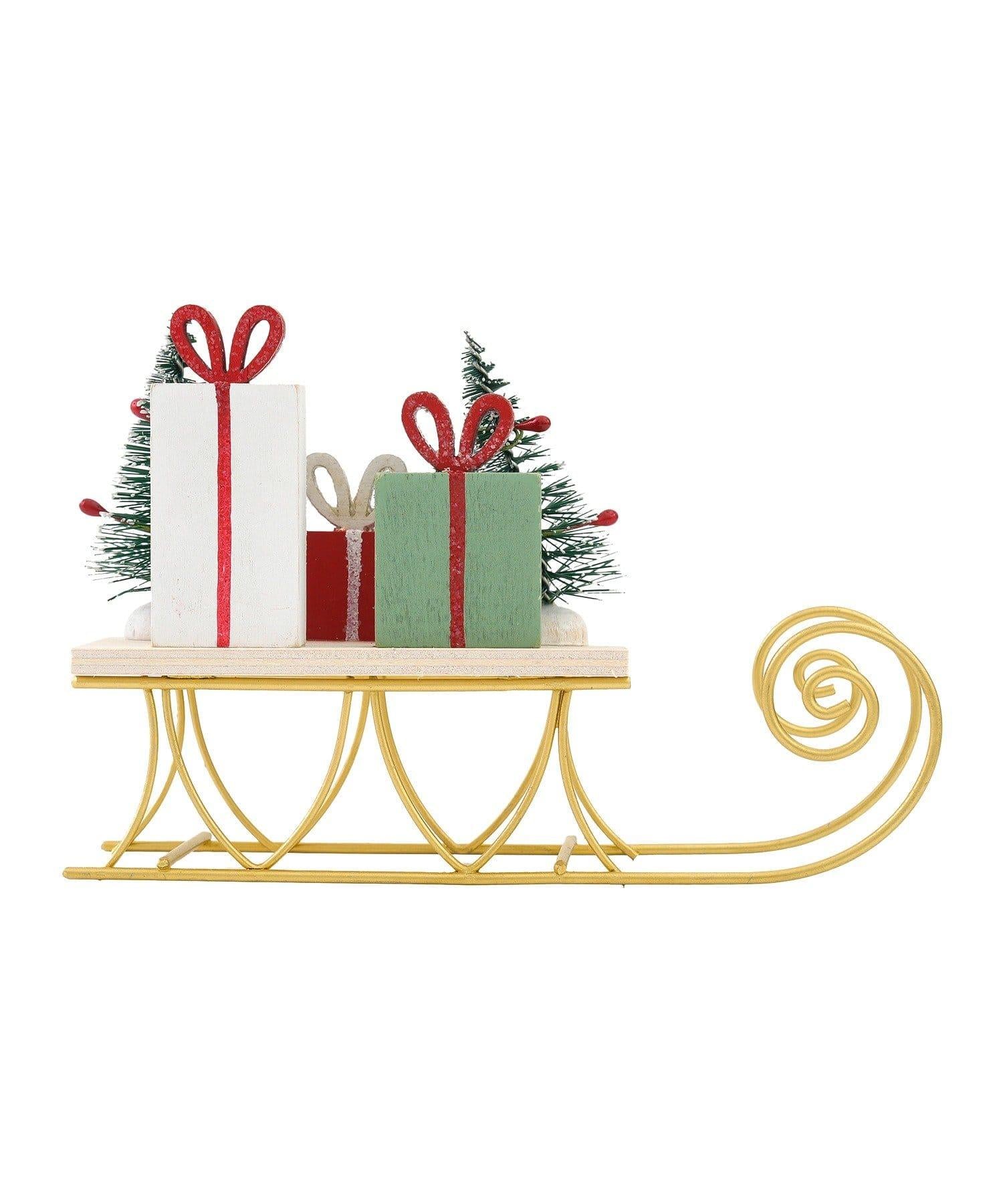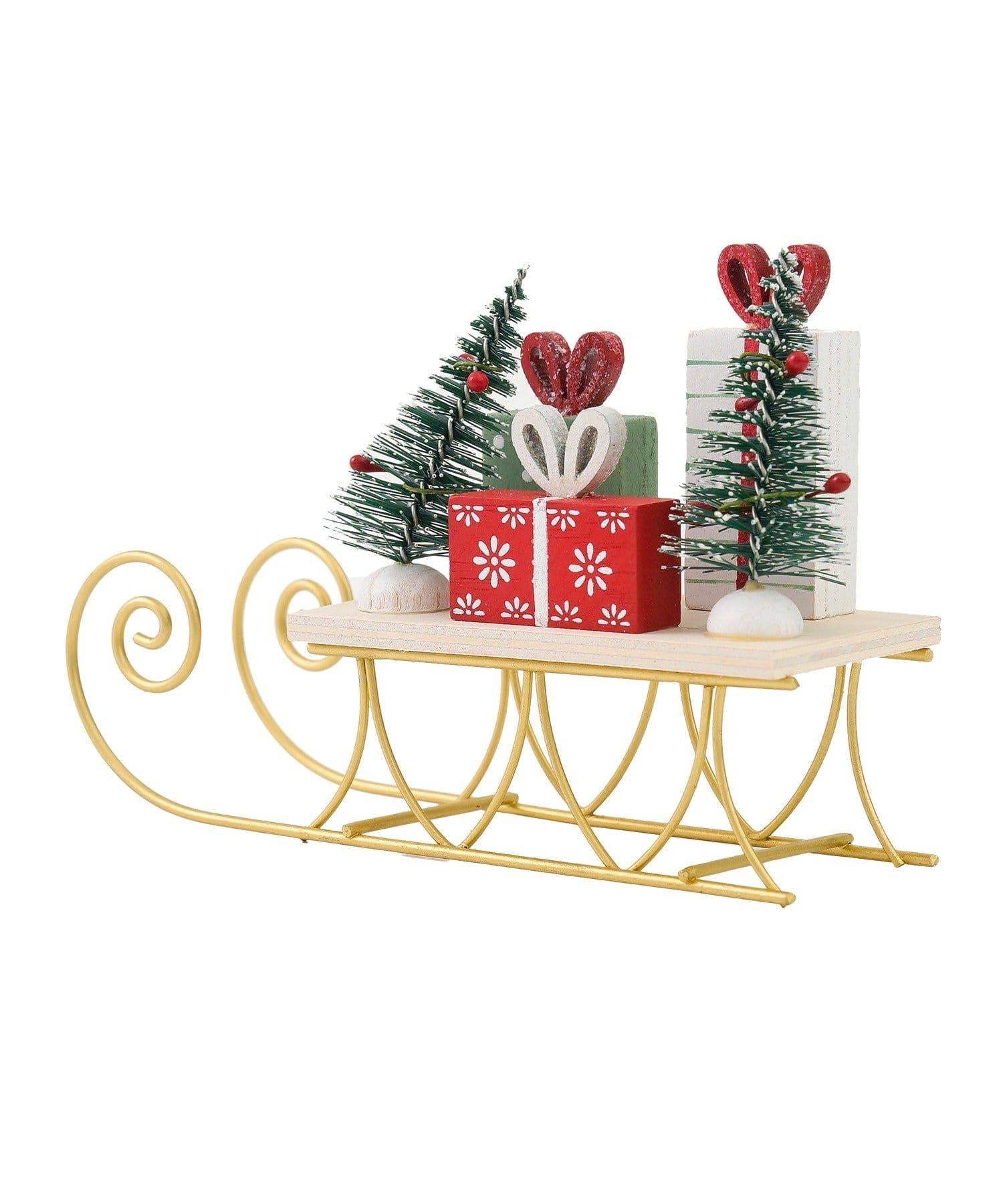 時尚的鐵木雪橇,上面有一棵聖誕樹和一個禮物盒。