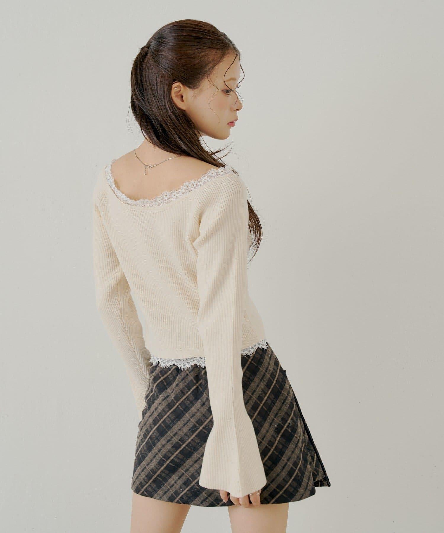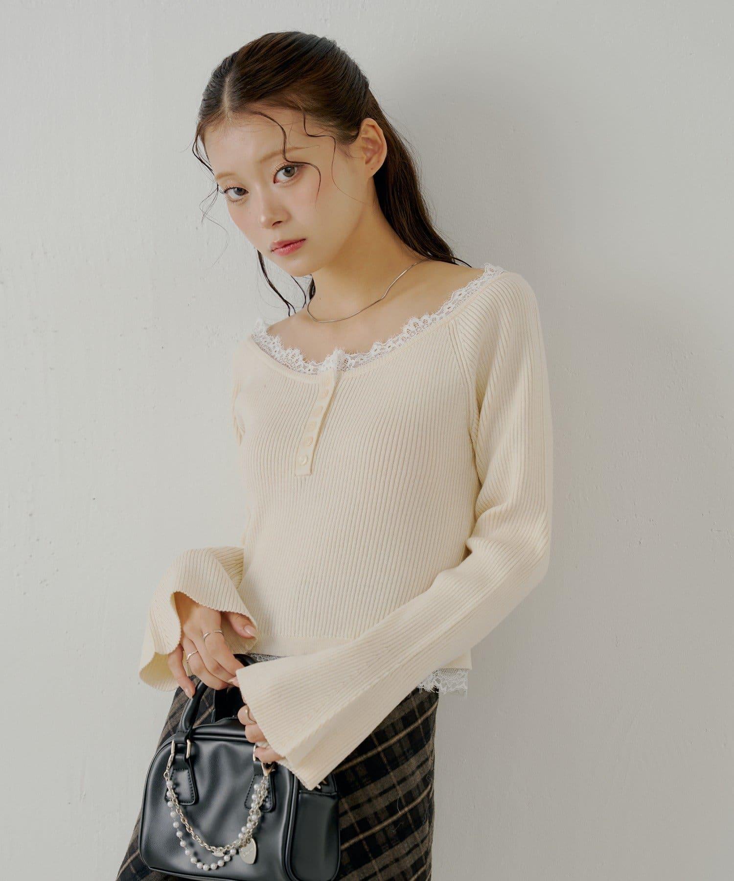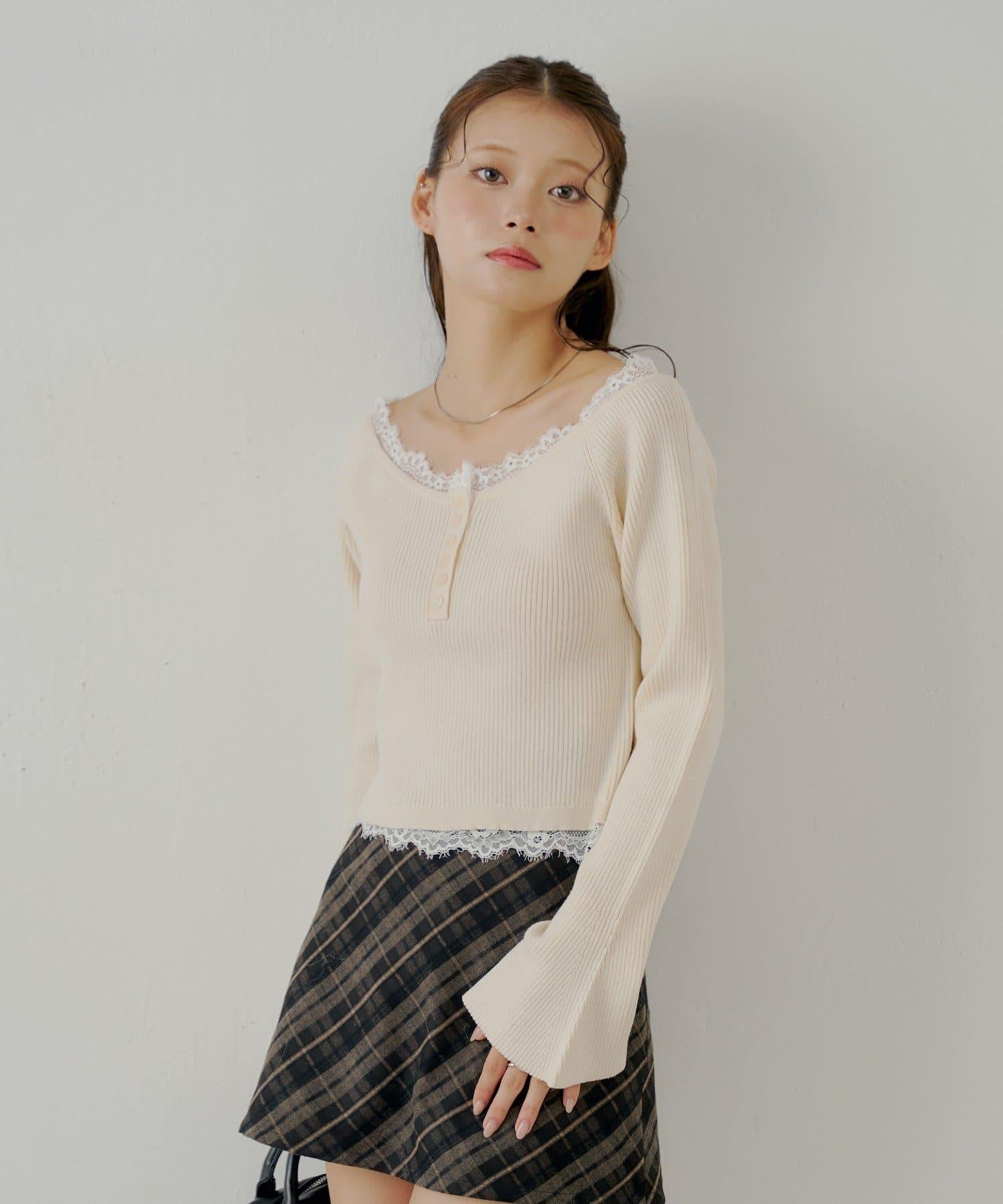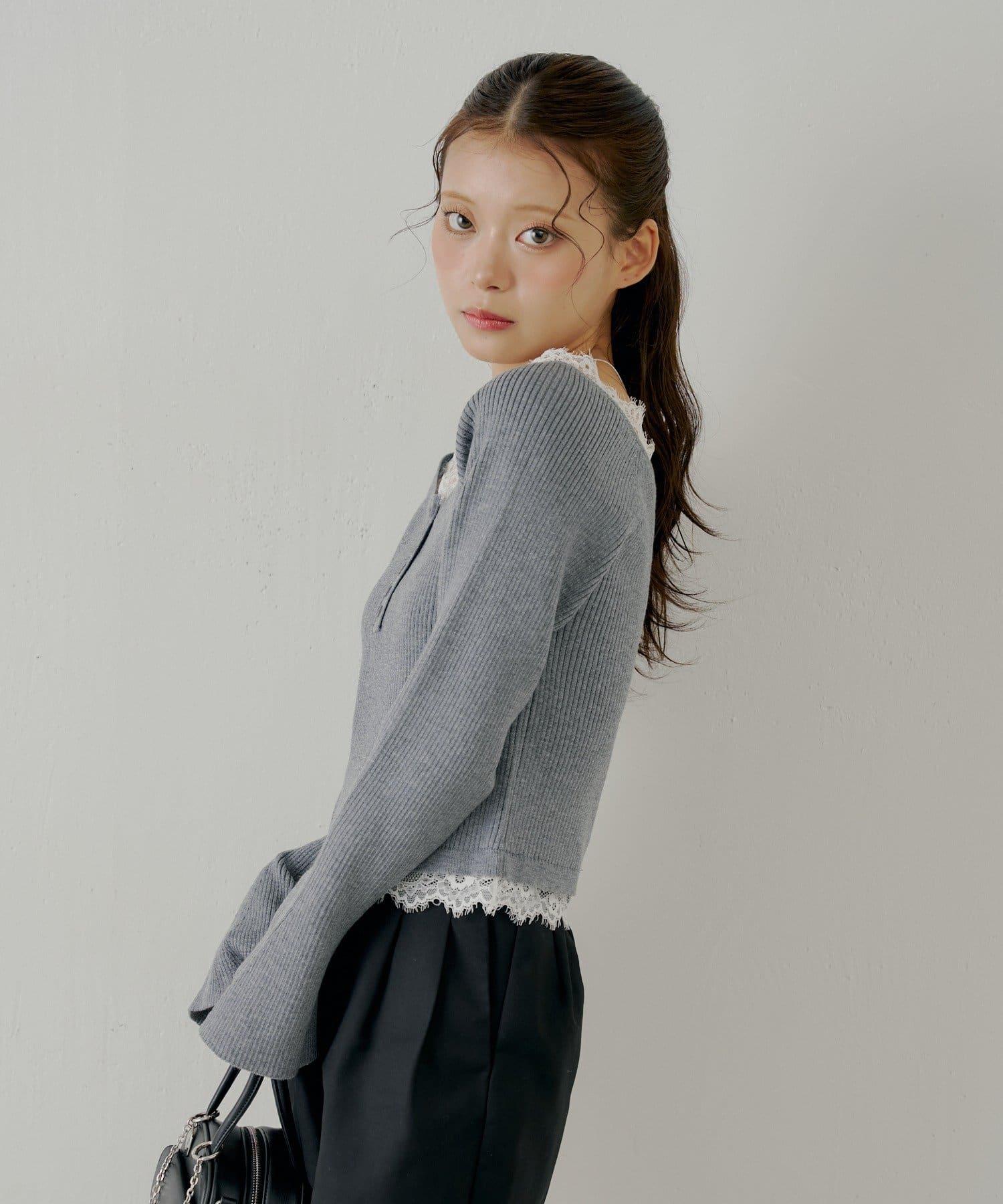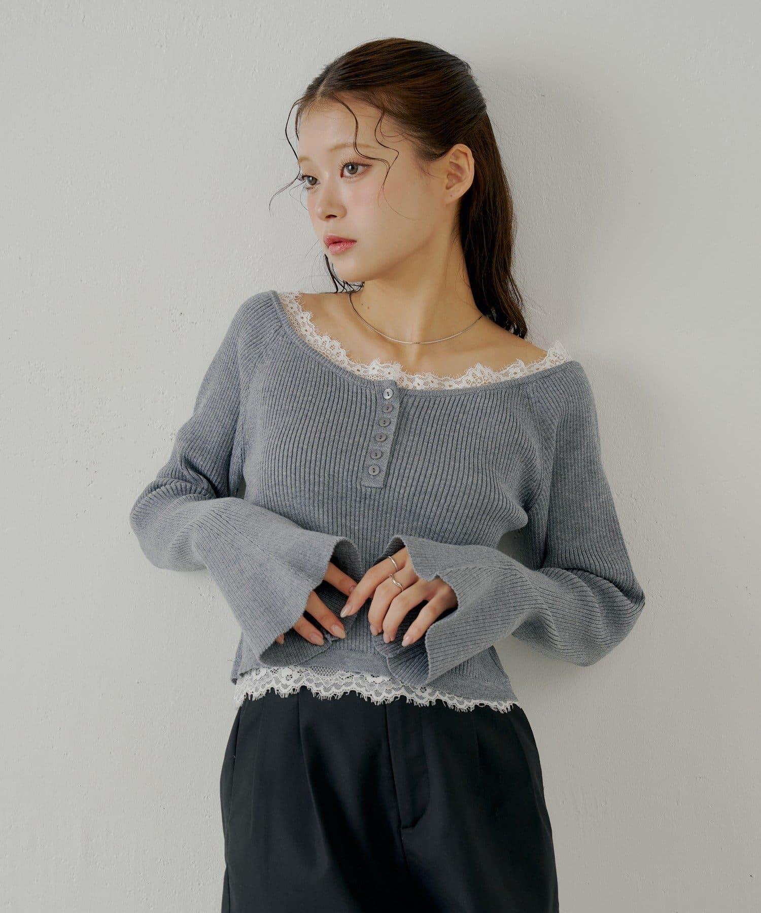這款雞心領針織衫的領口和下襬採用了精緻的蕾絲花邊,盡顯大人的甜美氣質。