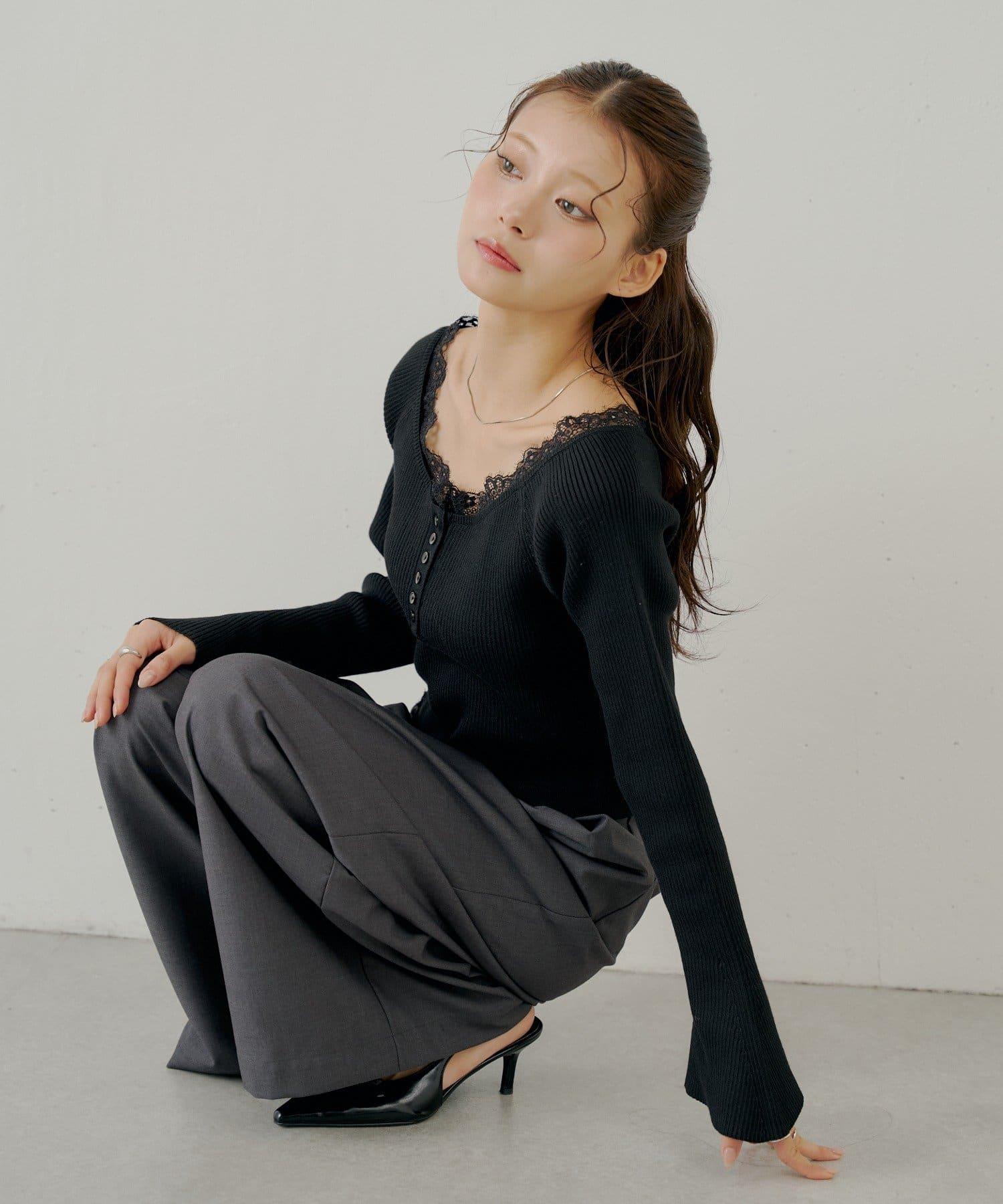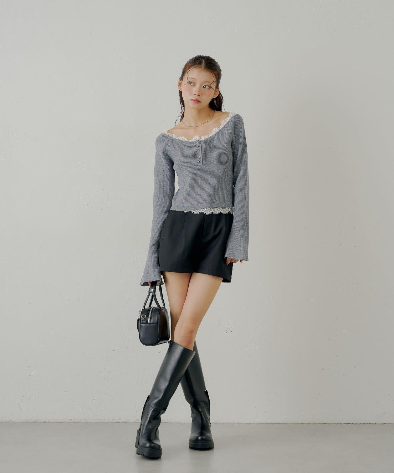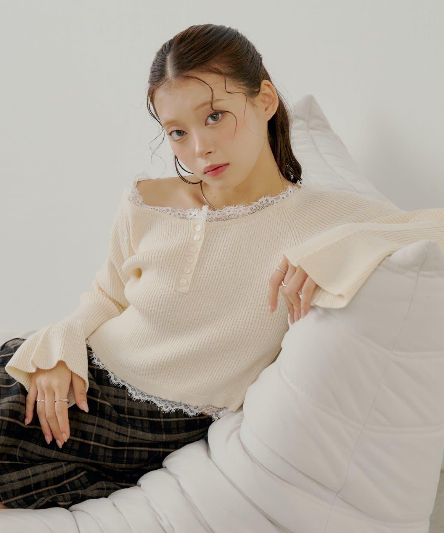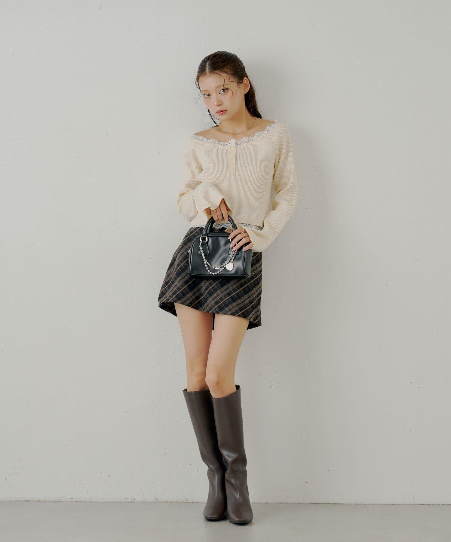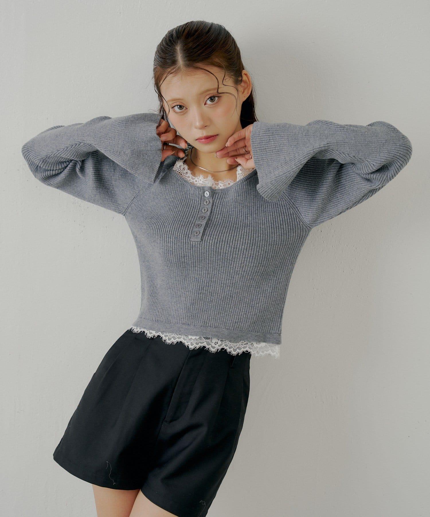 這款雞心領針織衫的領口和下襬採用了精緻的蕾絲花邊,盡顯大人的甜美氣質。