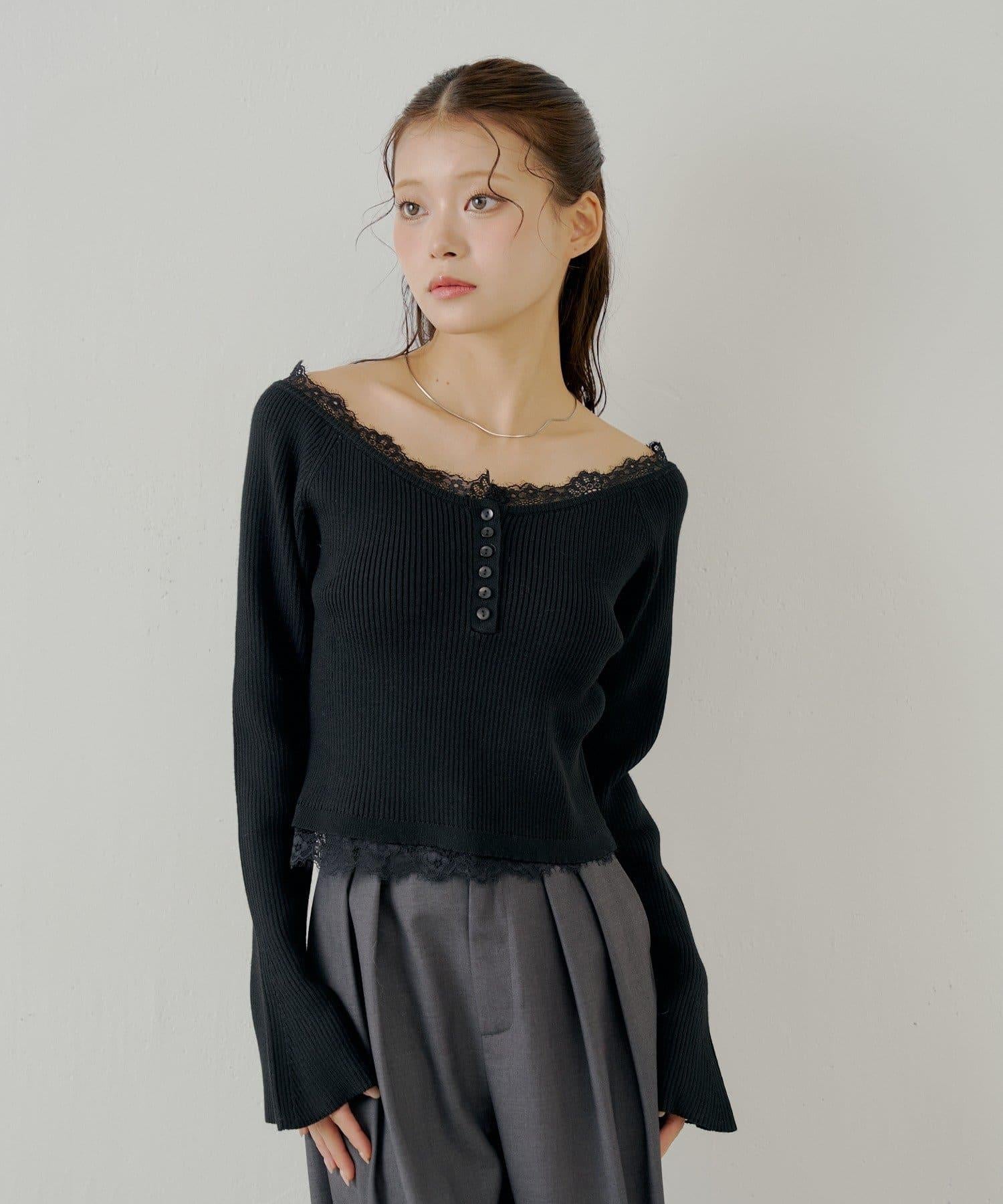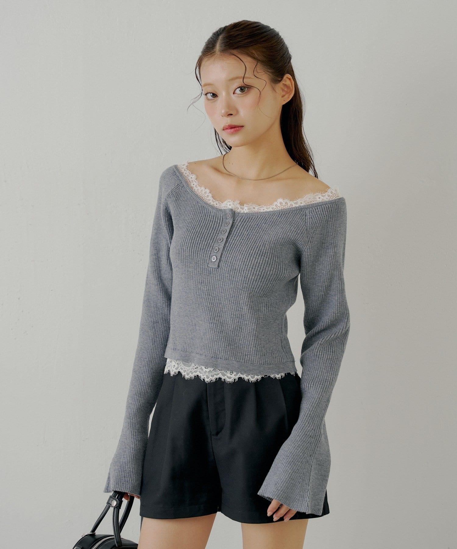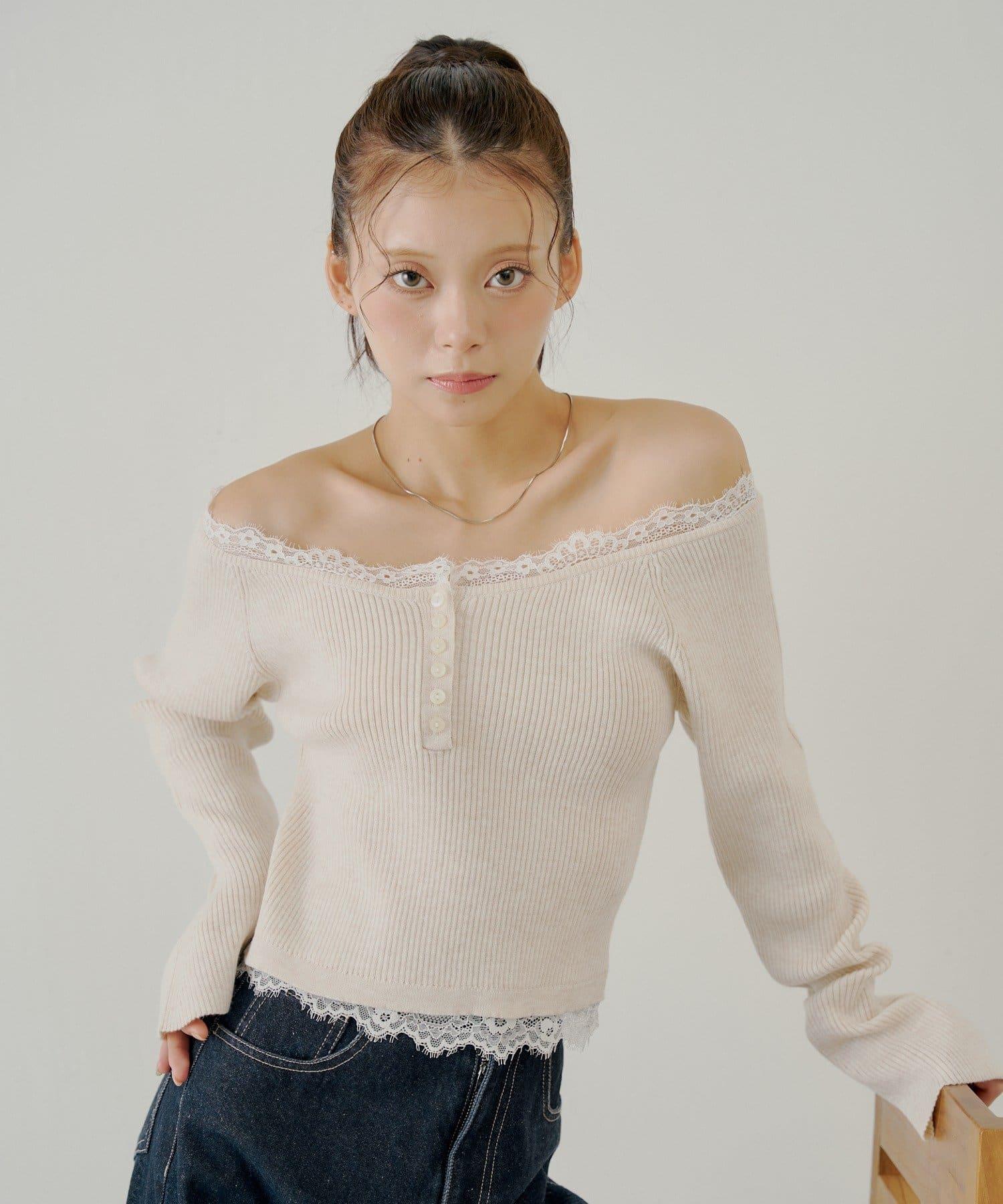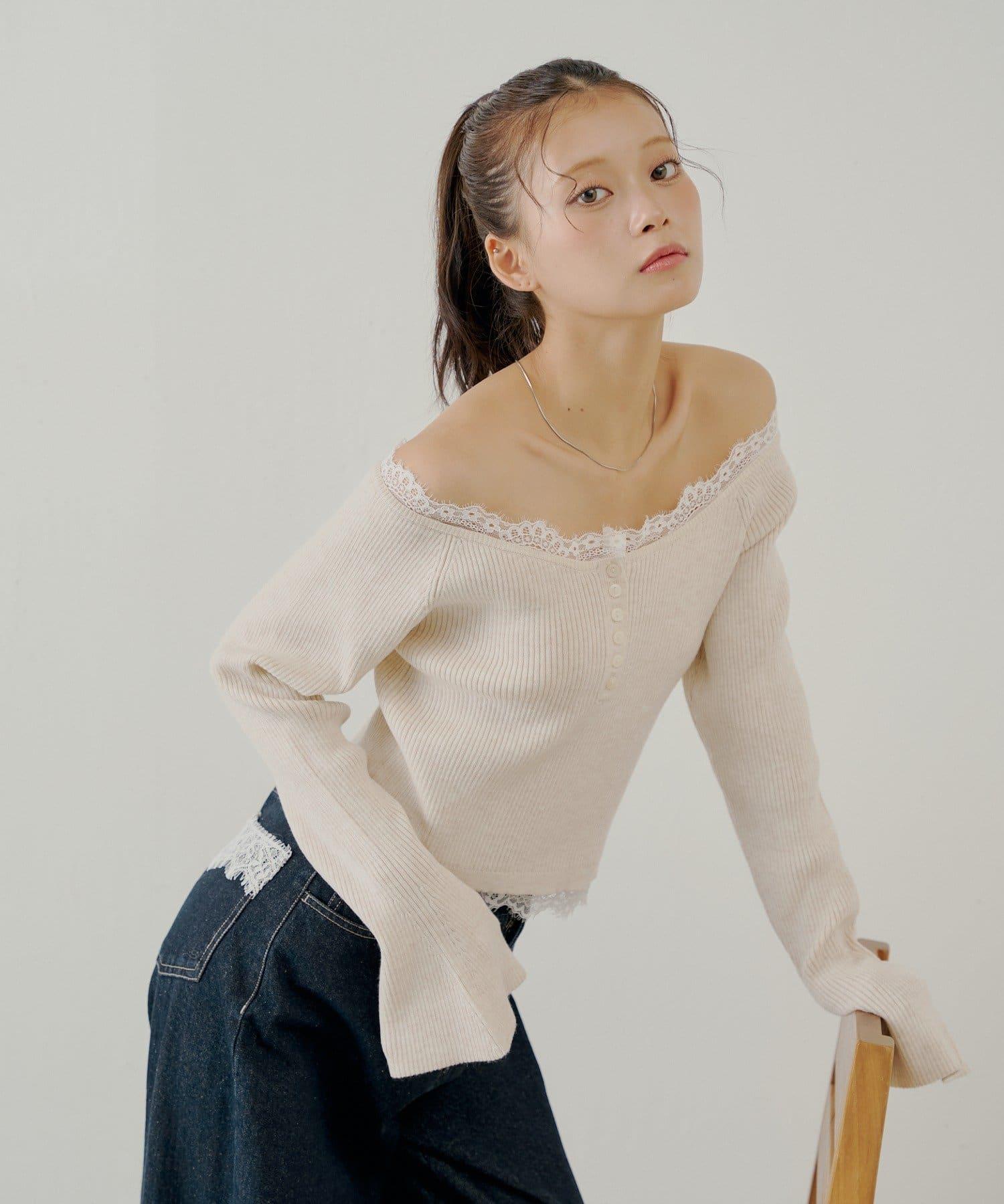 露肩蕾絲雞心領針織衫,精緻的蕾絲襯托出成年人的甜美氣質。