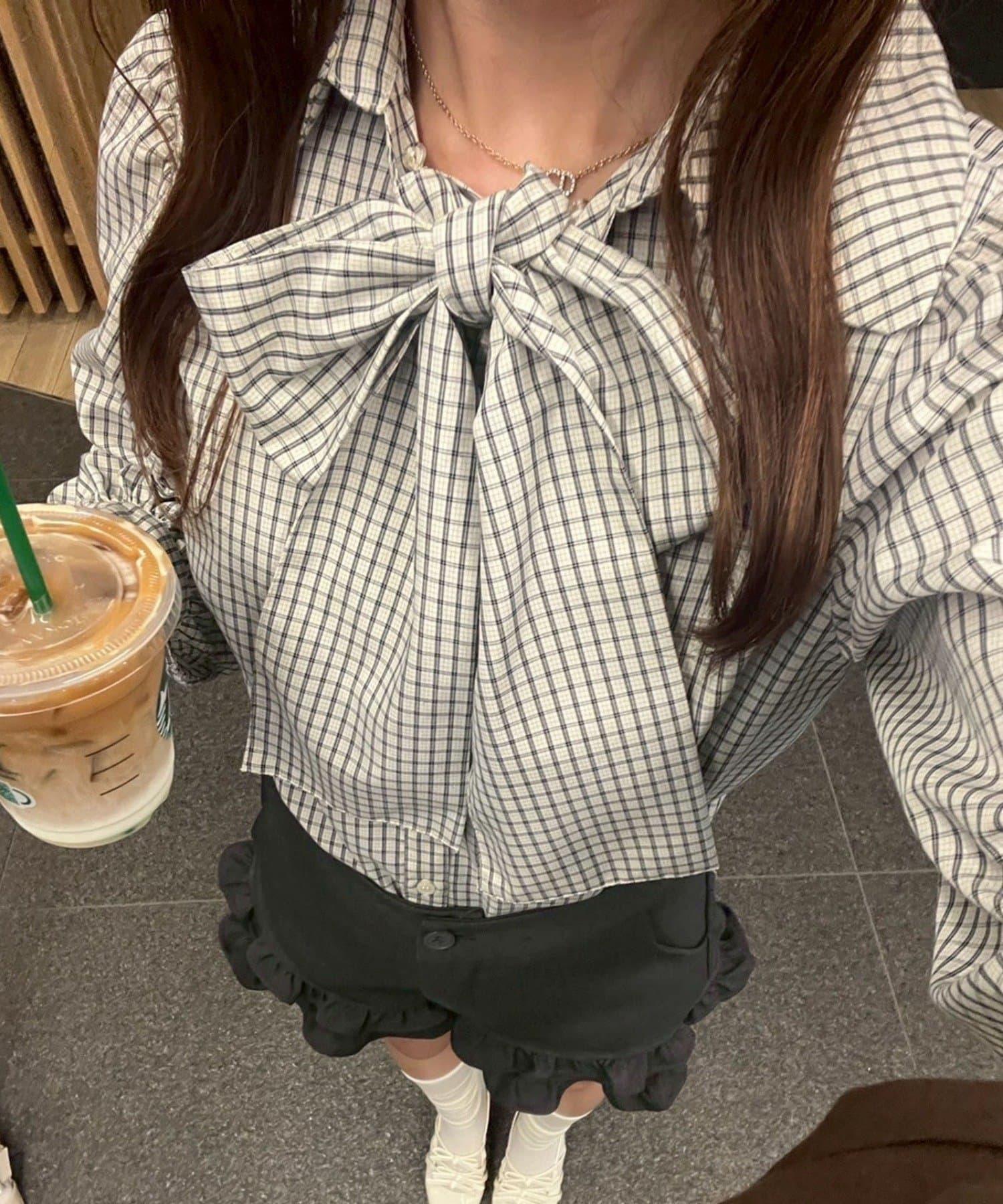 這件上衣有一個可愛的大絲帶蝴蝶結領結。