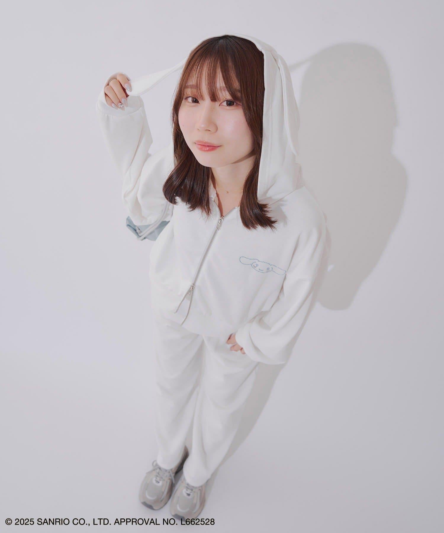 這款運動衫套裝的連帽衫耳朵的設計靈感來自 Hello Kitty、Kuromi 和 Cinnamon 的輪廓,臀部有可愛的水鑽標誌。
