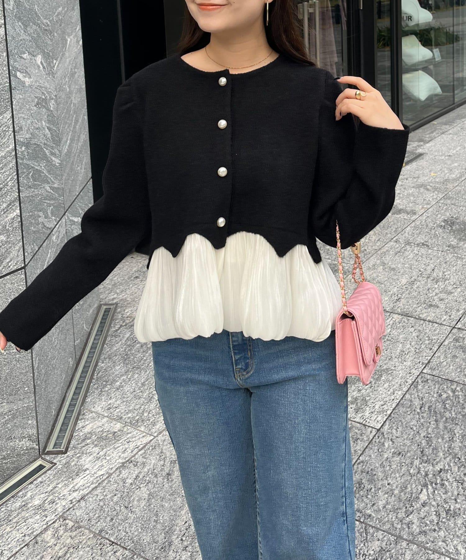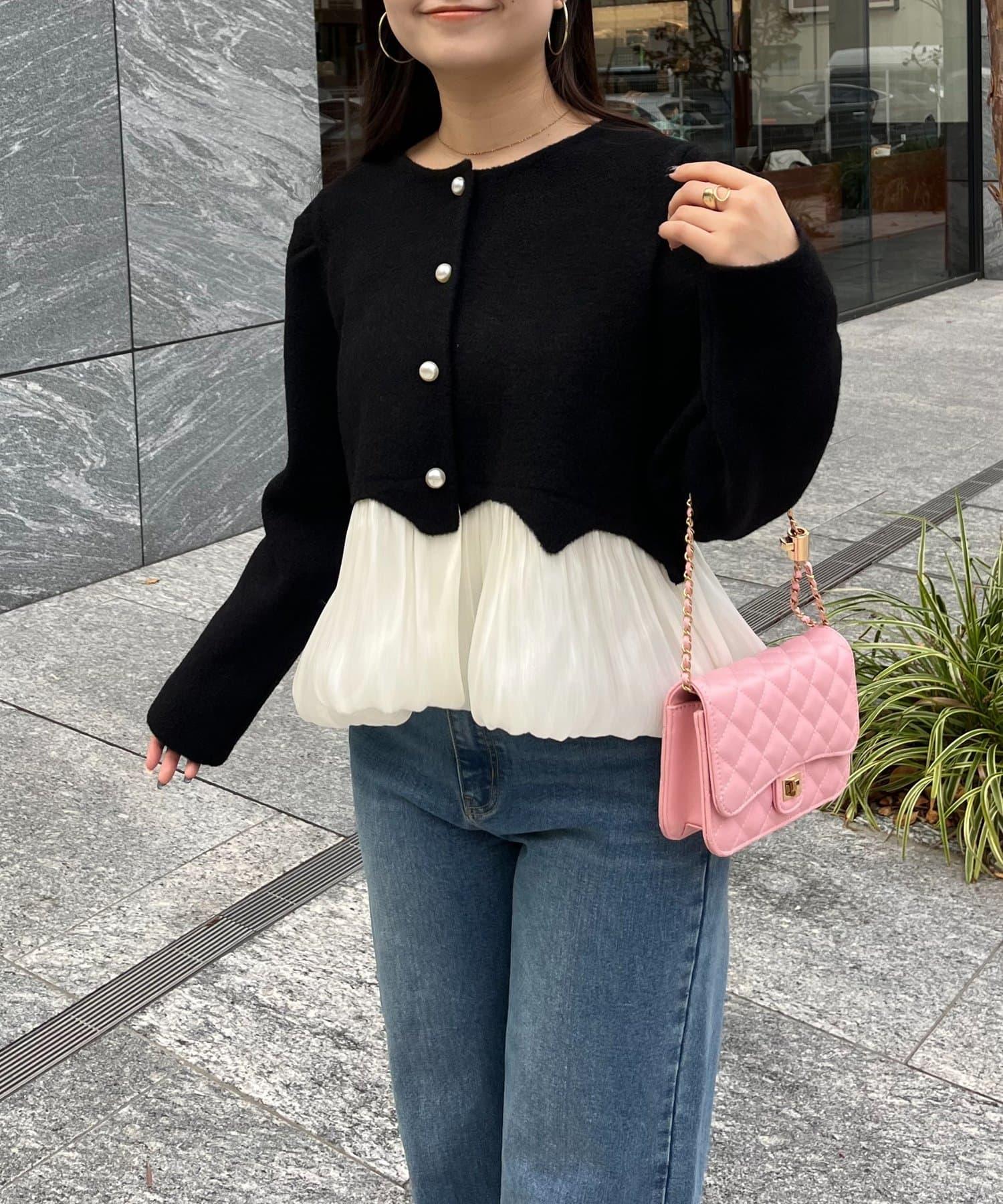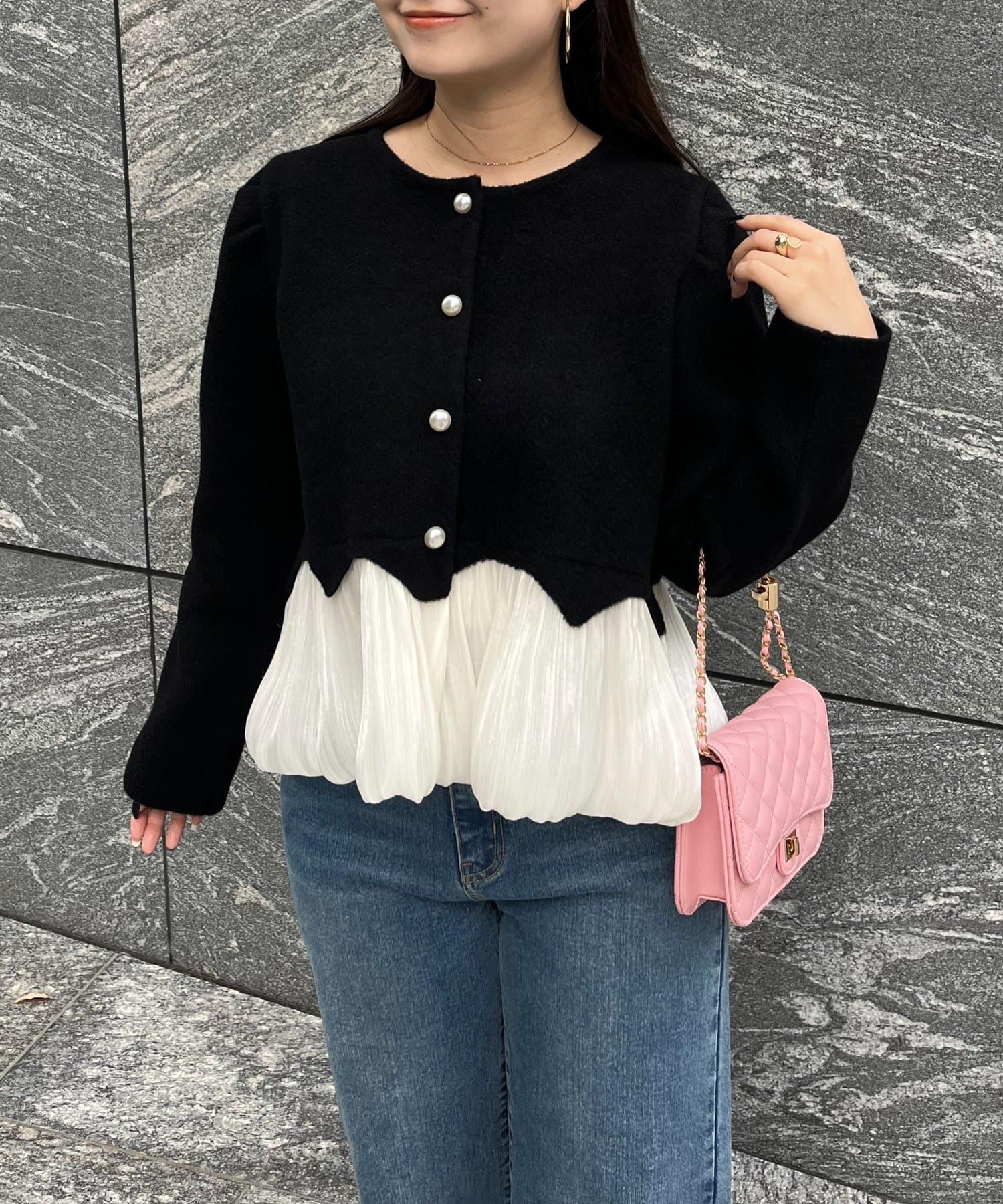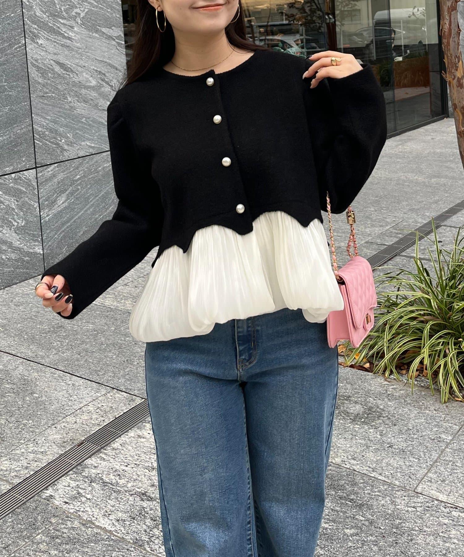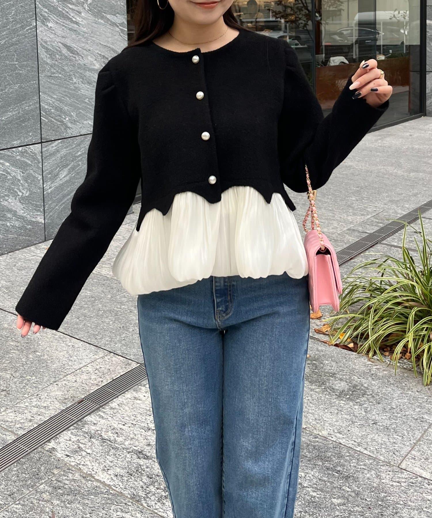 下襬氣球珍珠紐扣拼接荷葉邊針織衫