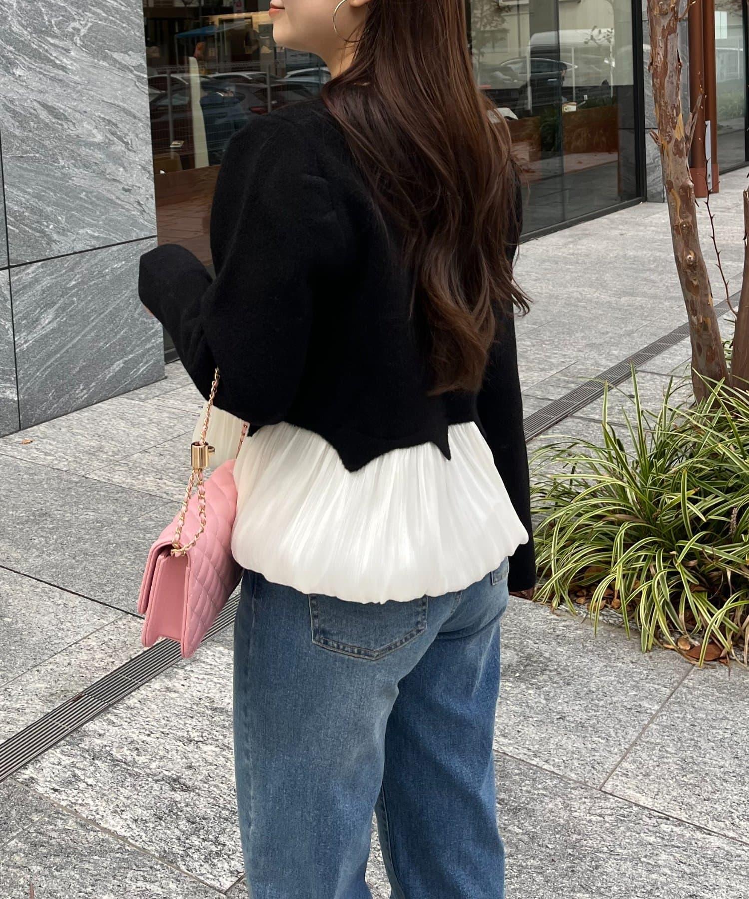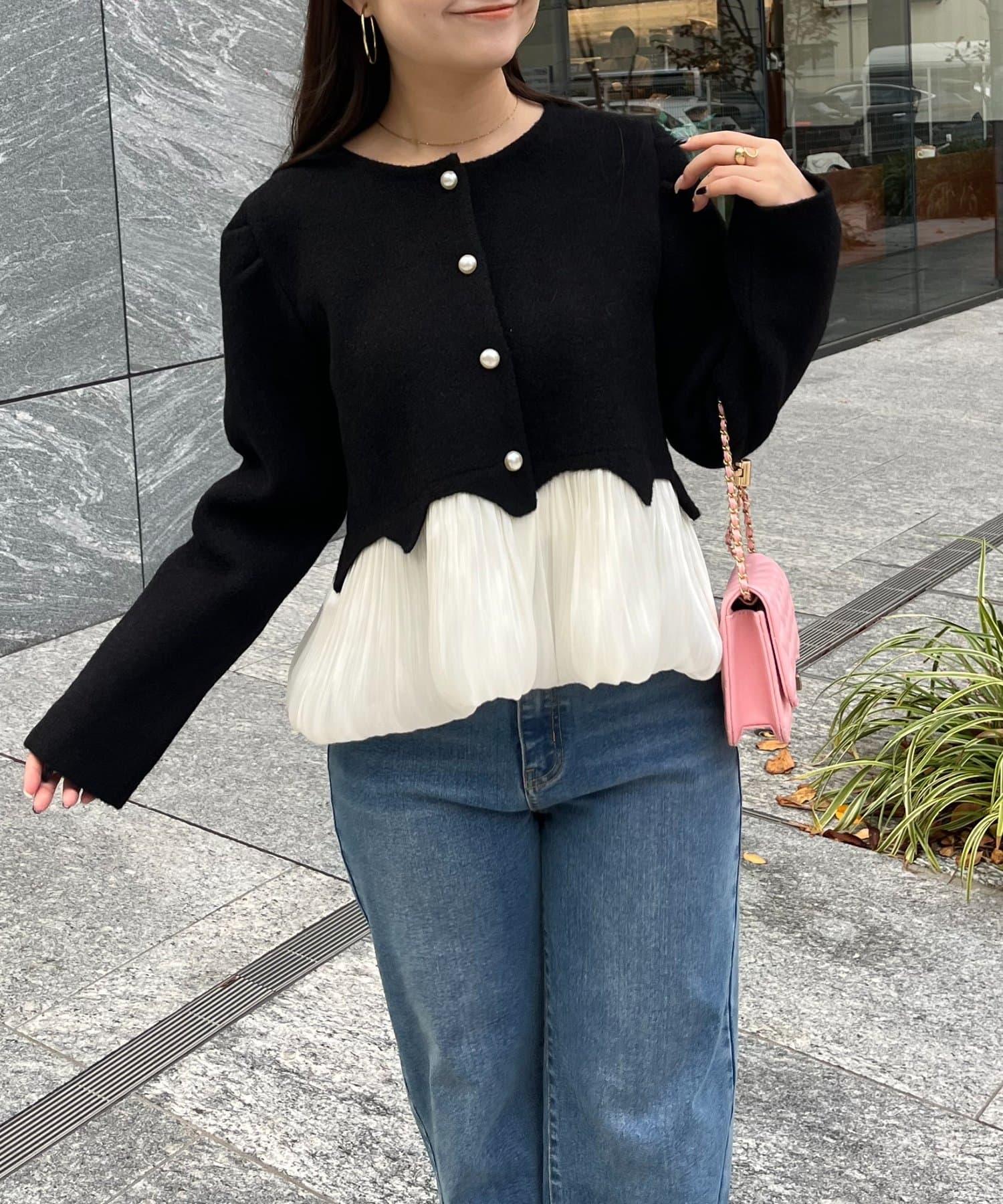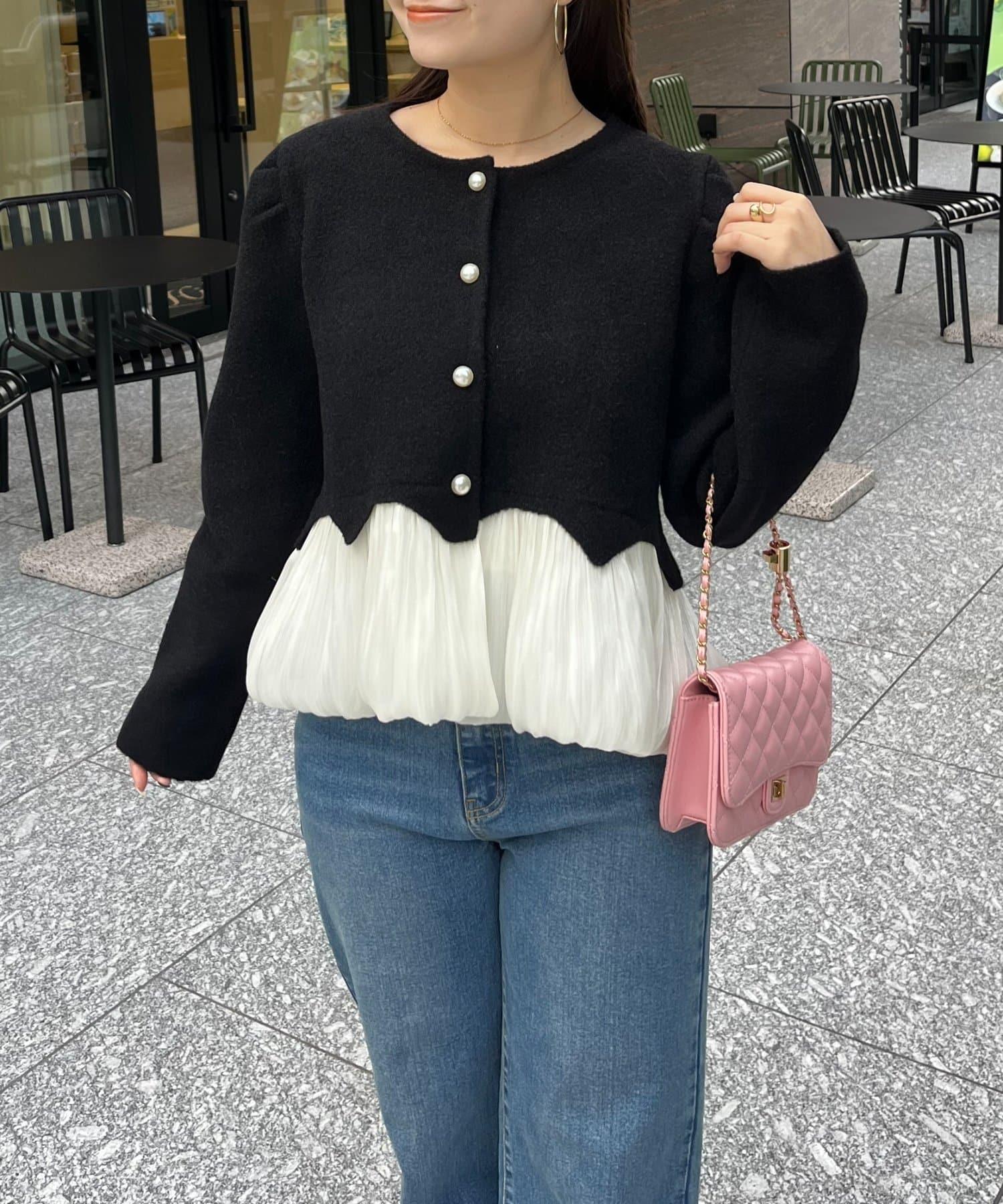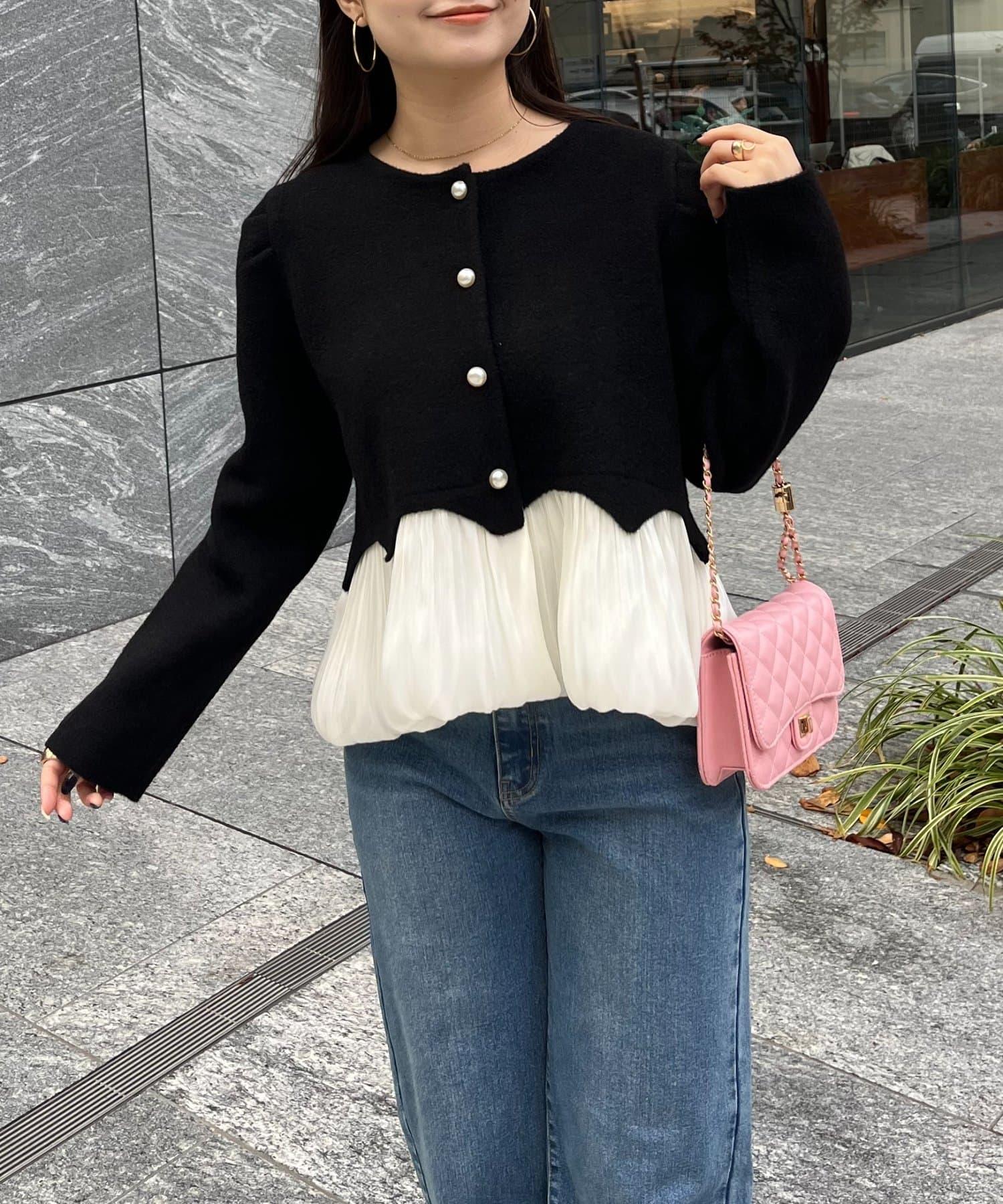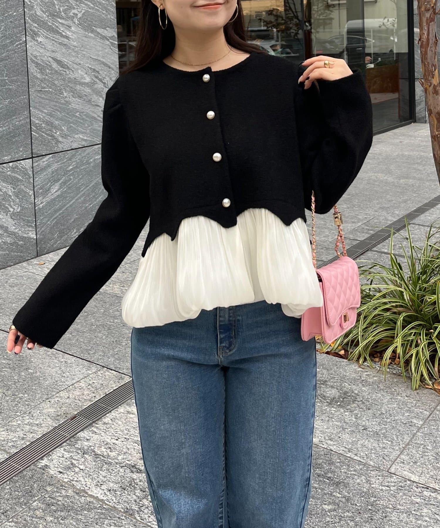 下襬氣球珍珠紐扣拼接荷葉邊針織衫