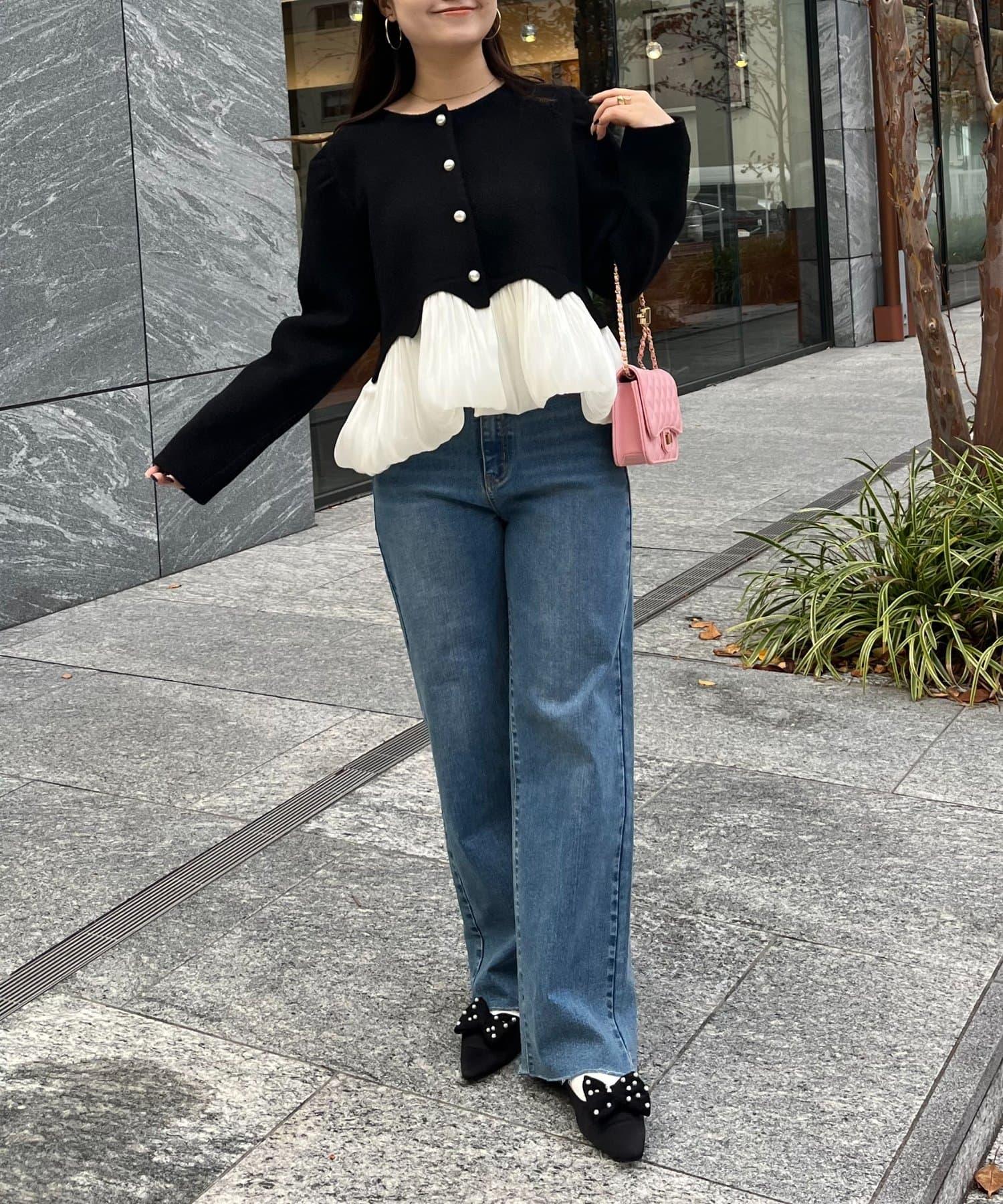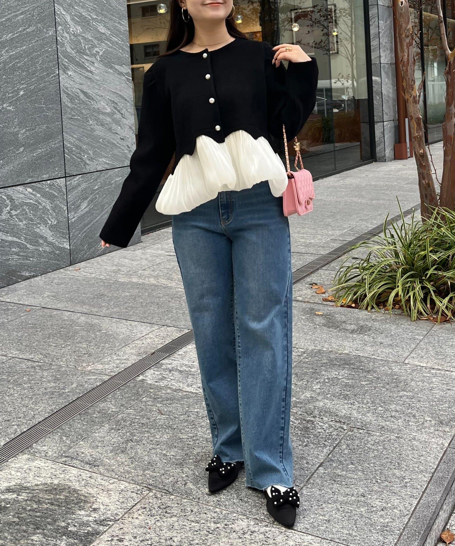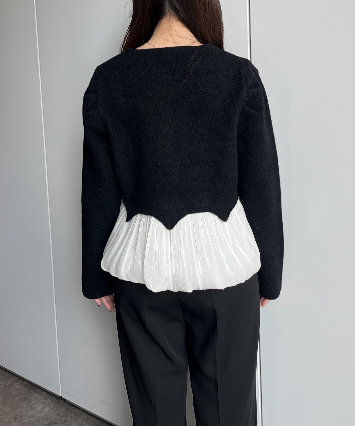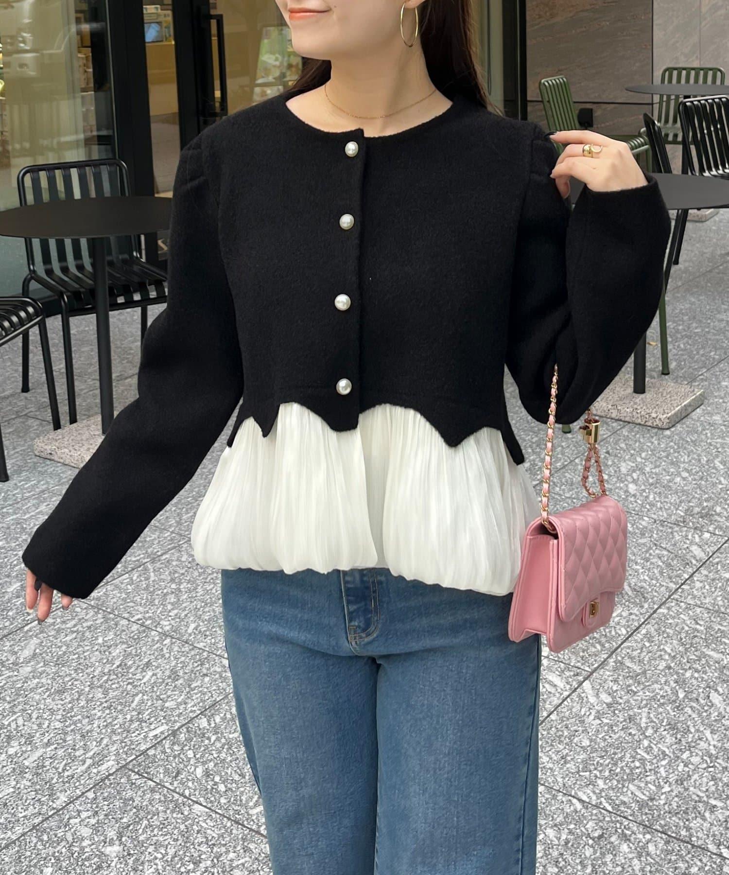 下襬氣球珍珠紐扣拼接荷葉邊針織衫