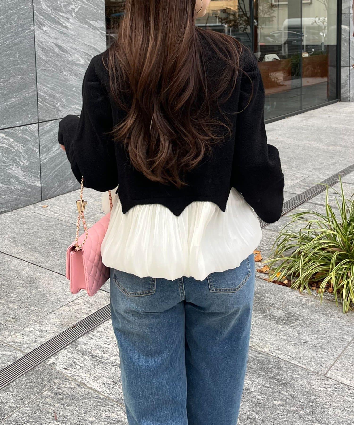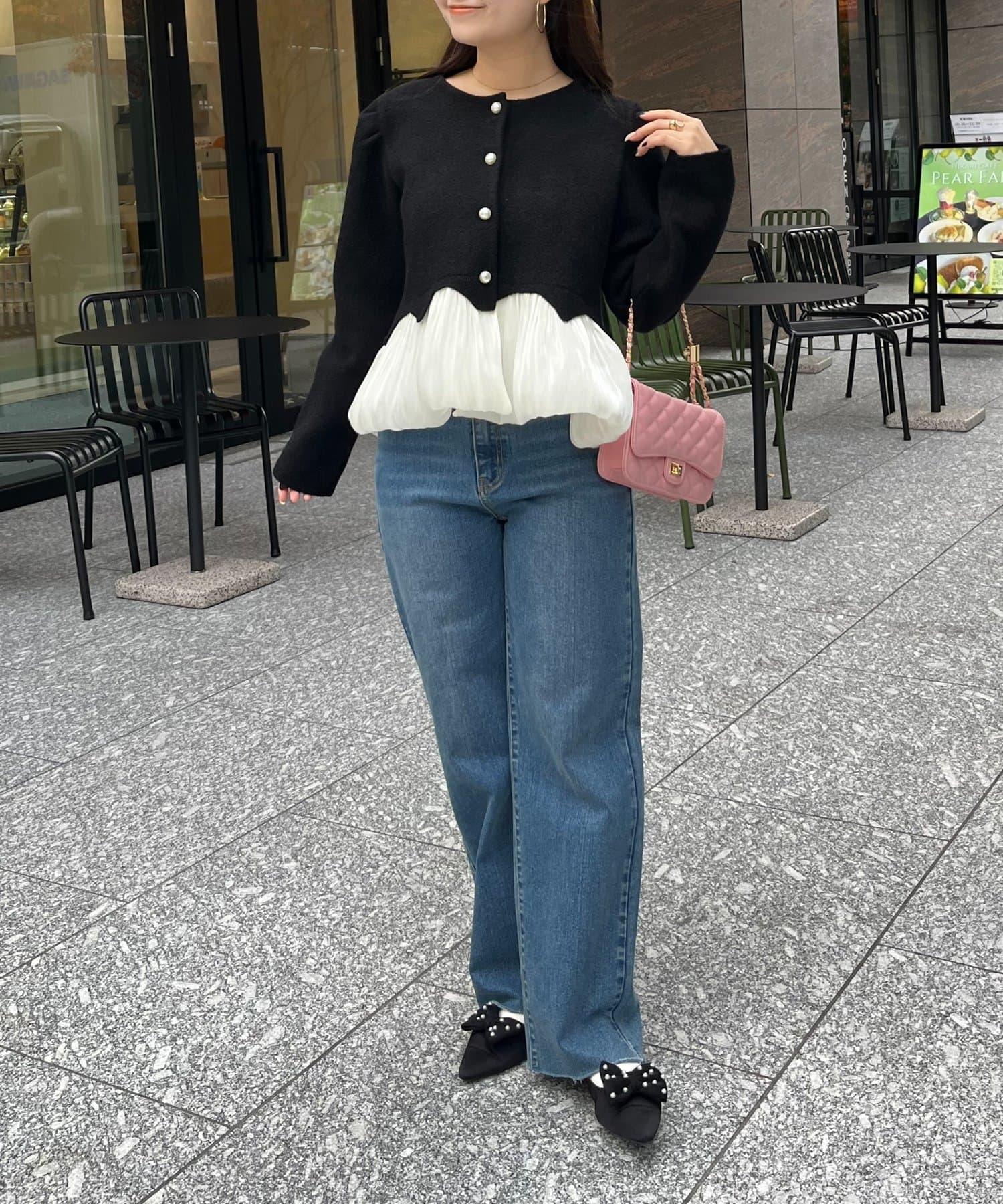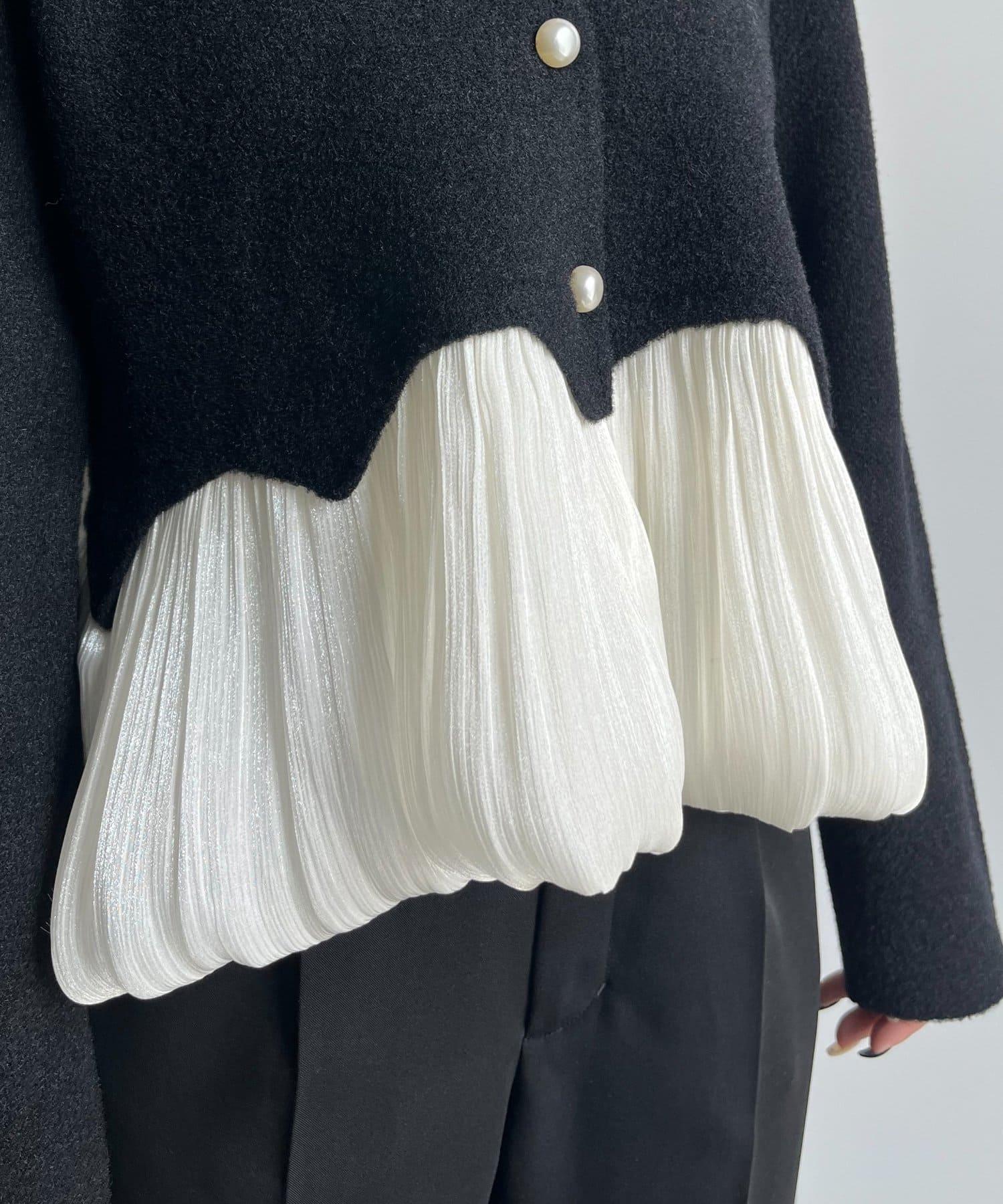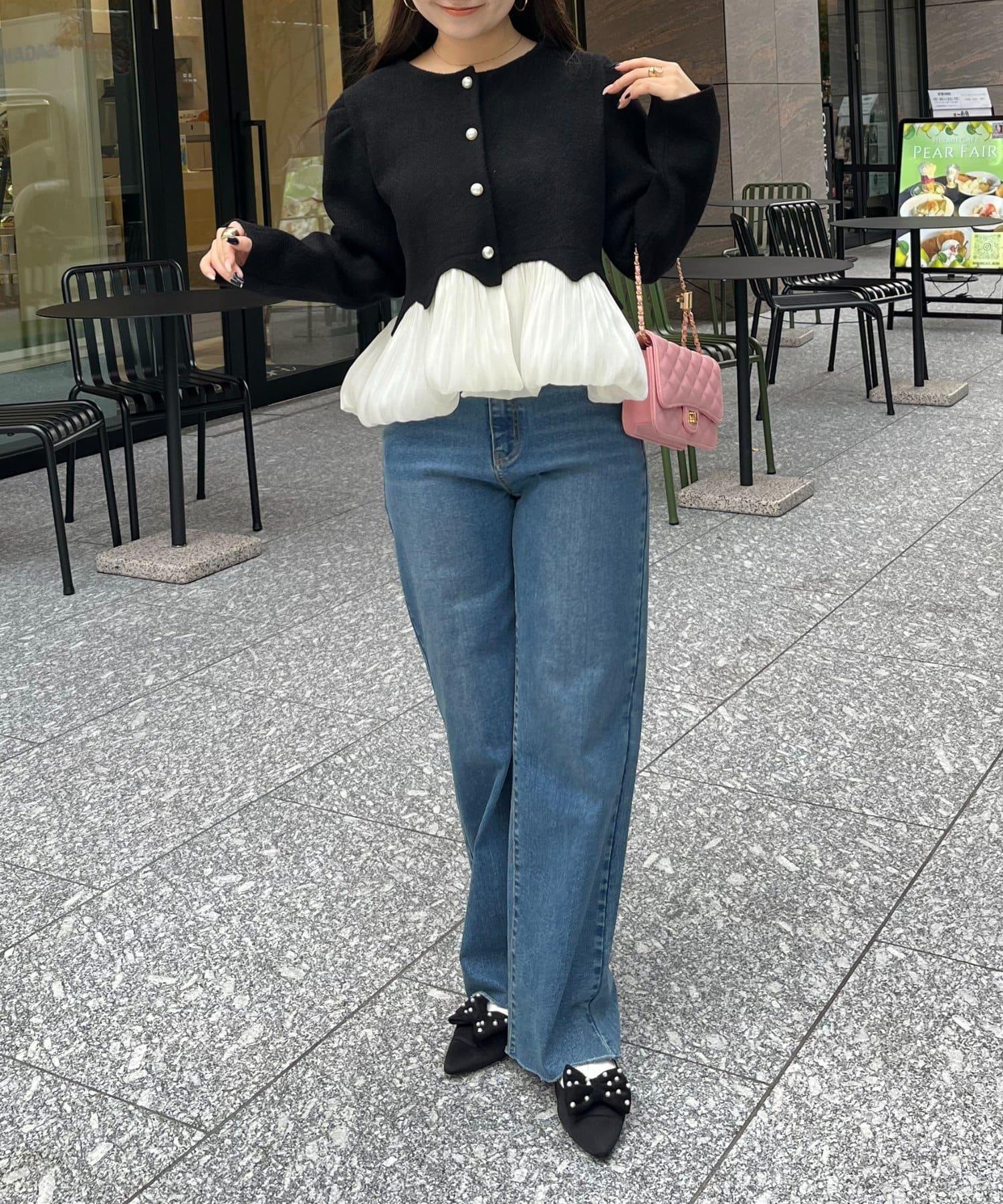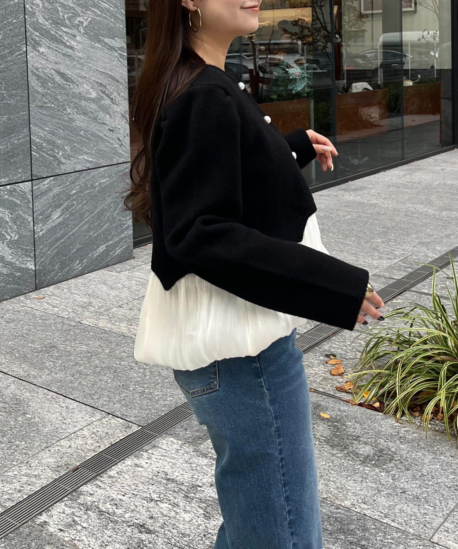 下襬氣球珍珠紐扣拼接荷葉邊針織衫