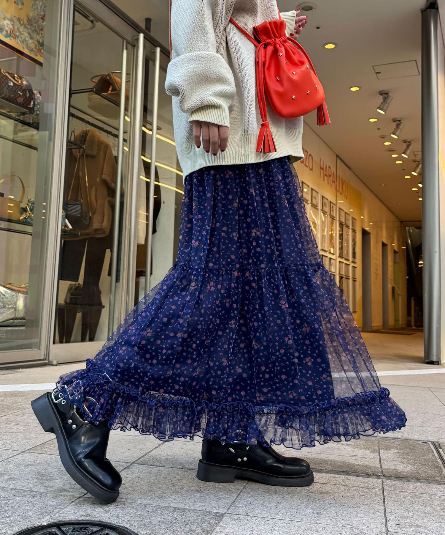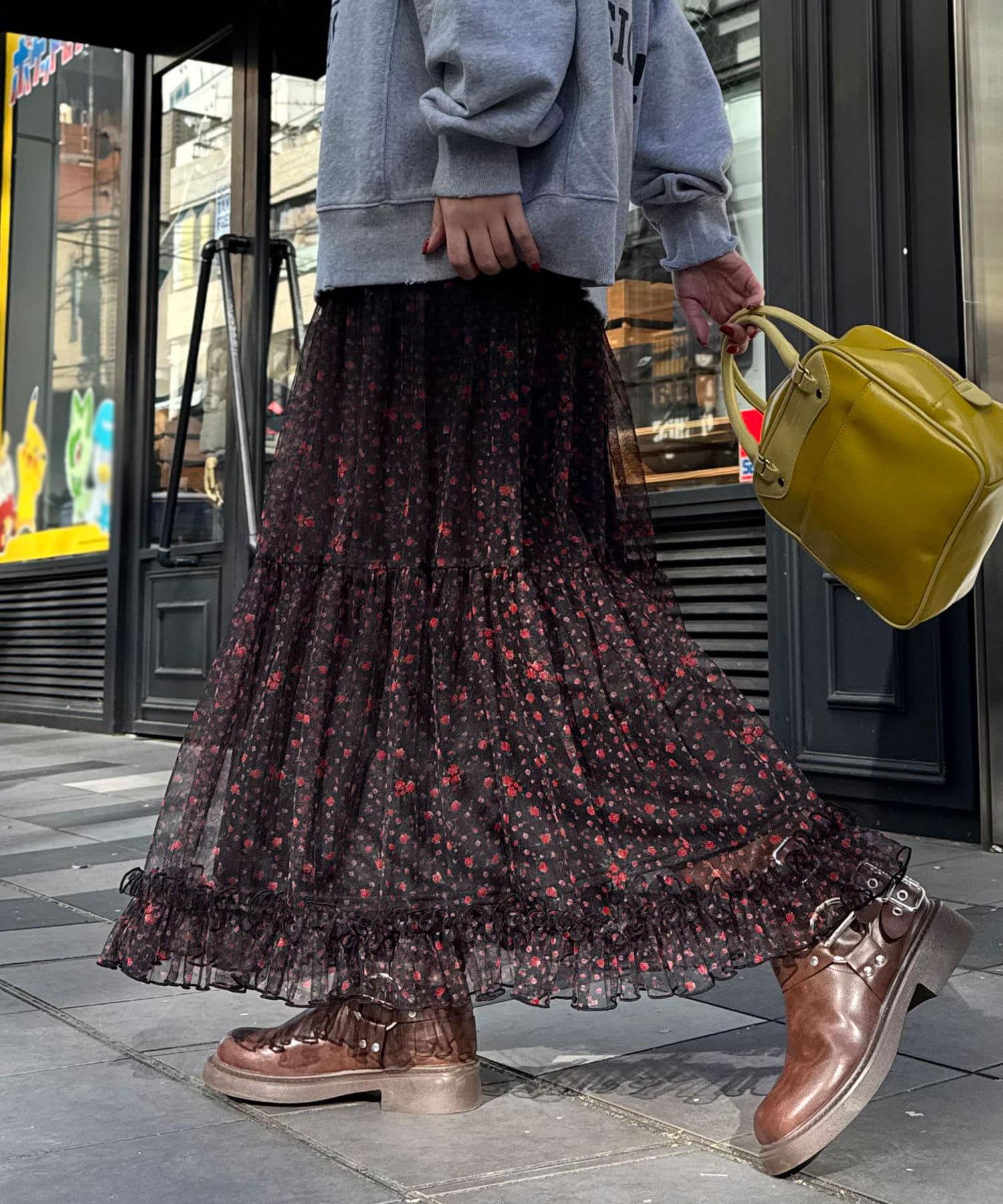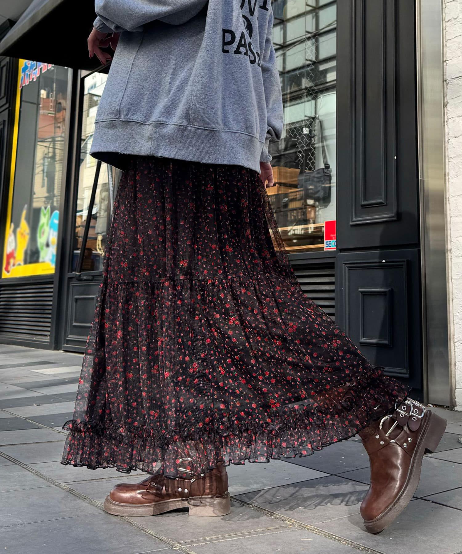 花朵層疊裙襬,帶有女性化的花朵圖案和薄紗