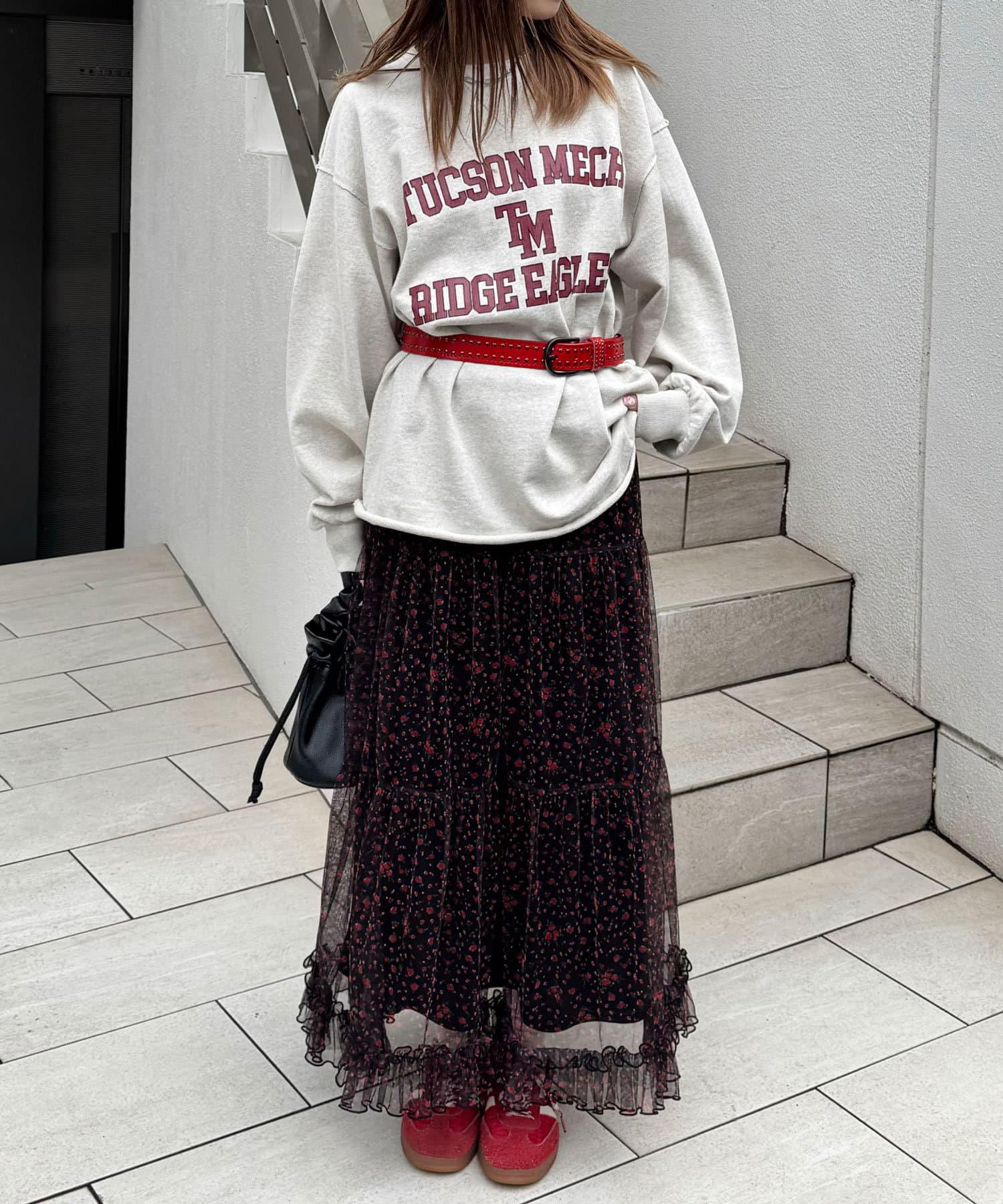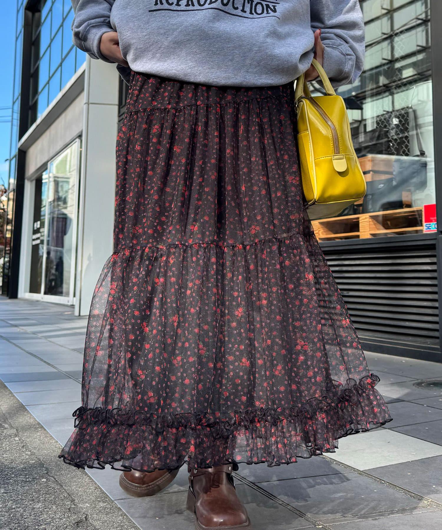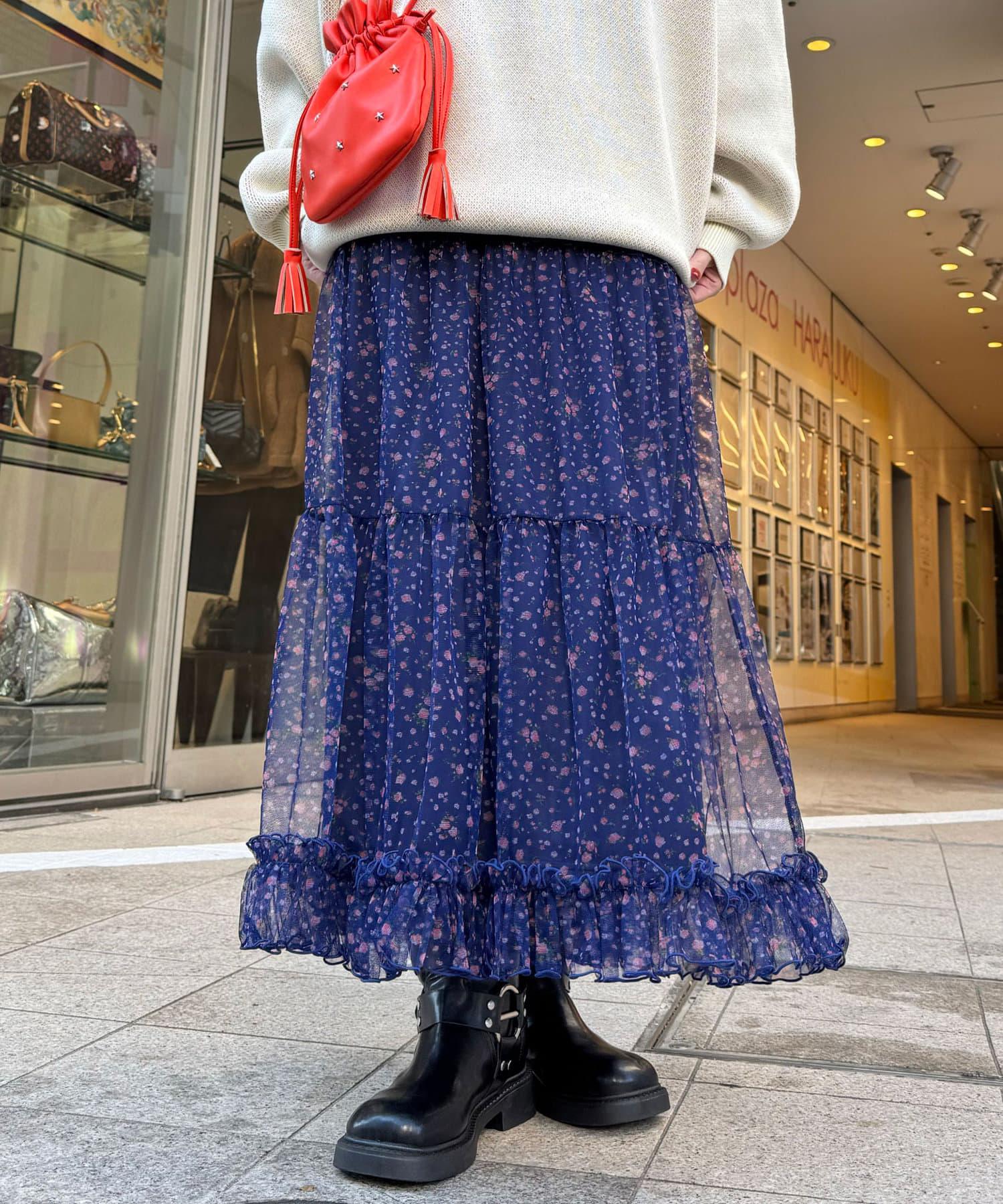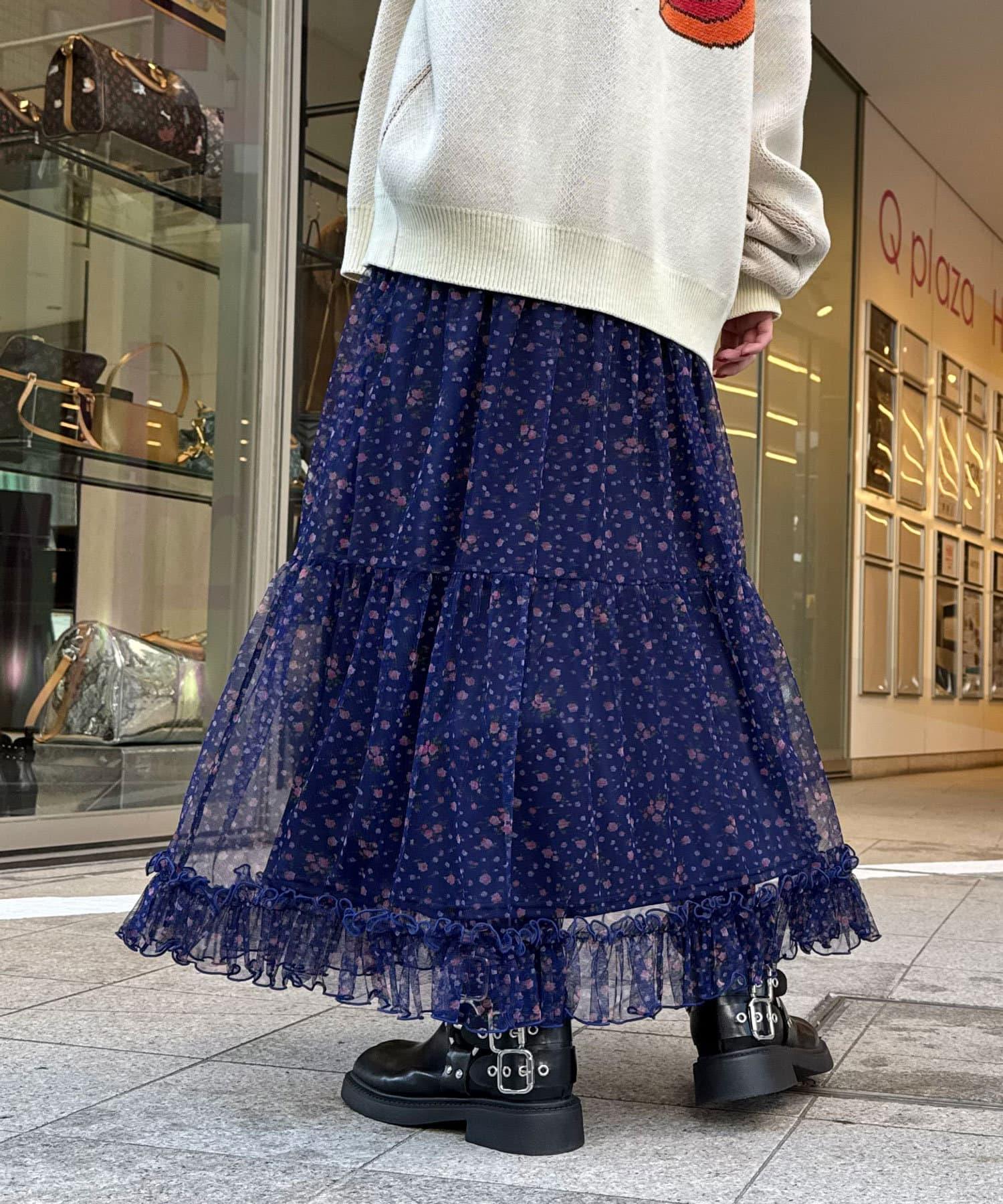 花朵層疊裙襬,帶有女性化的花朵圖案和薄紗