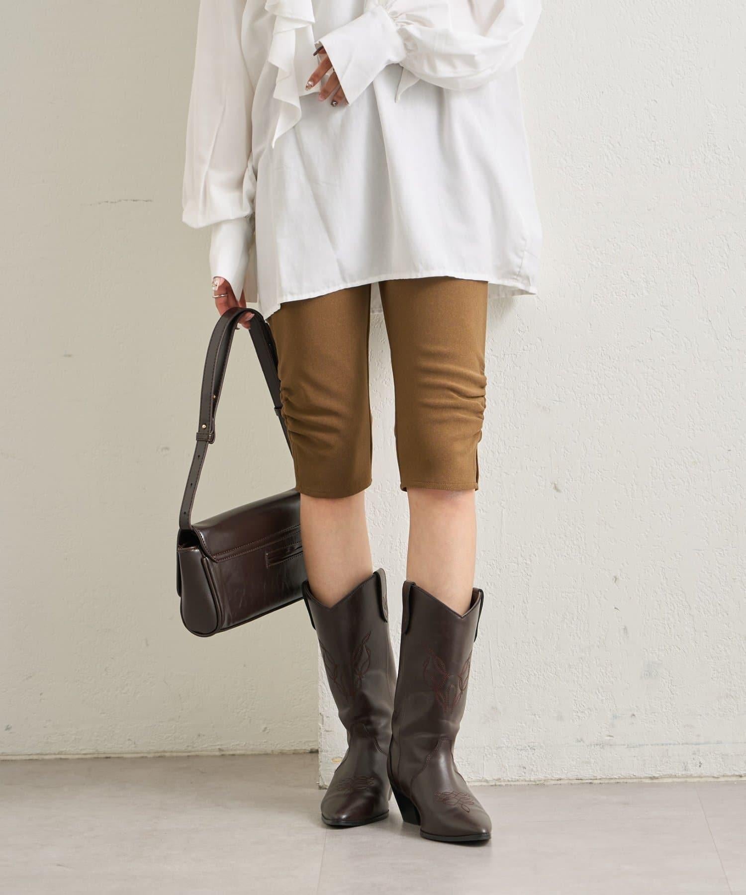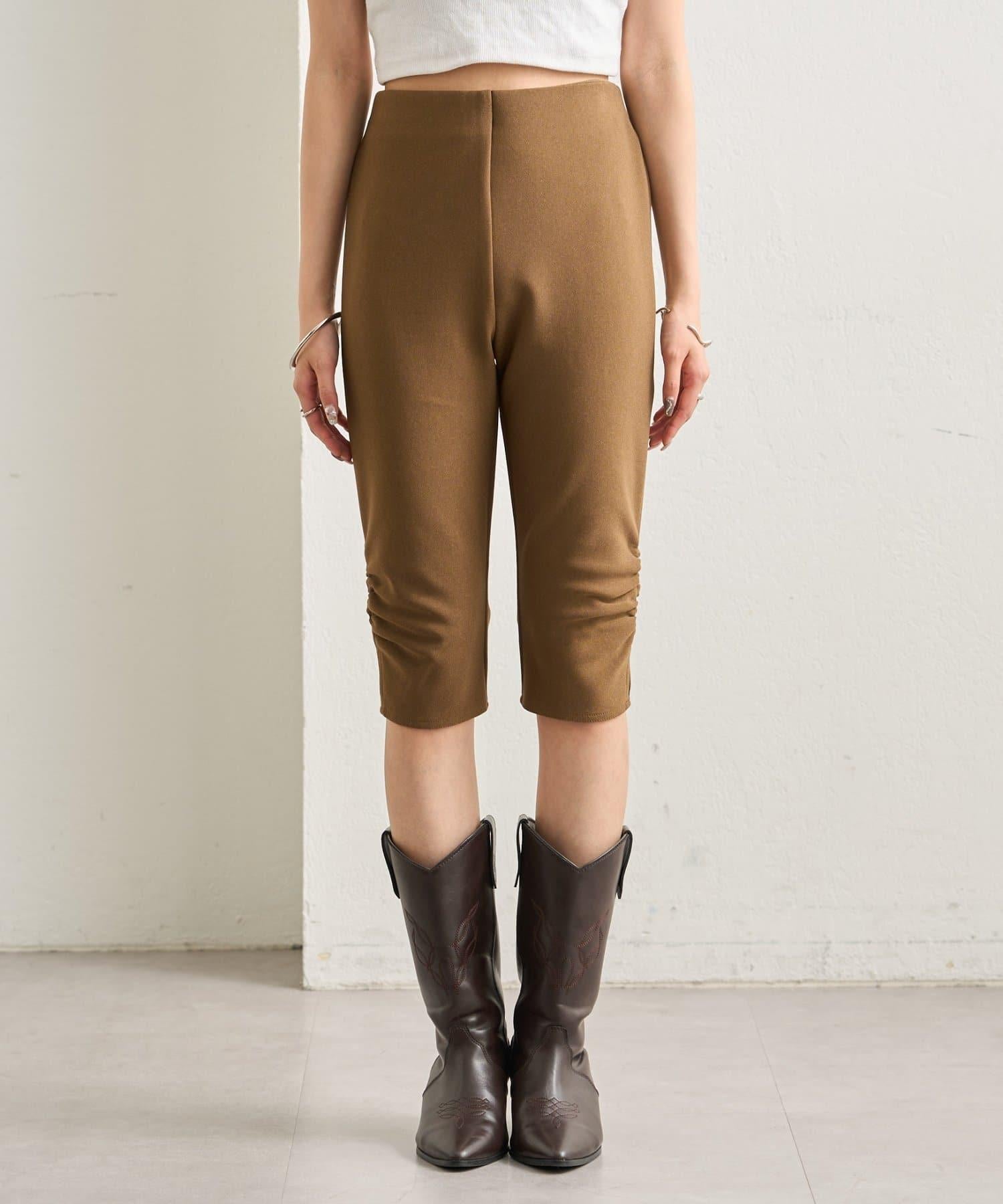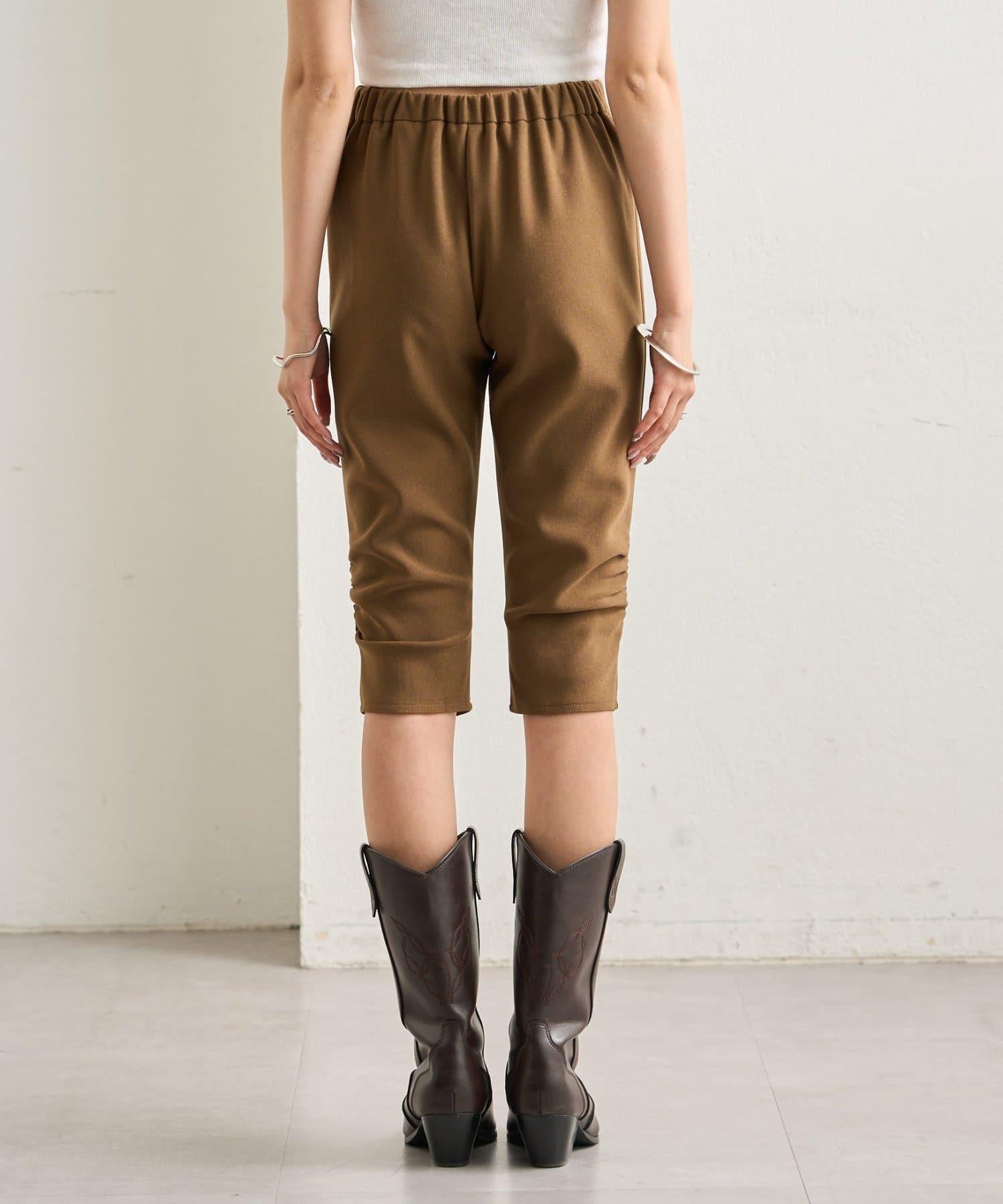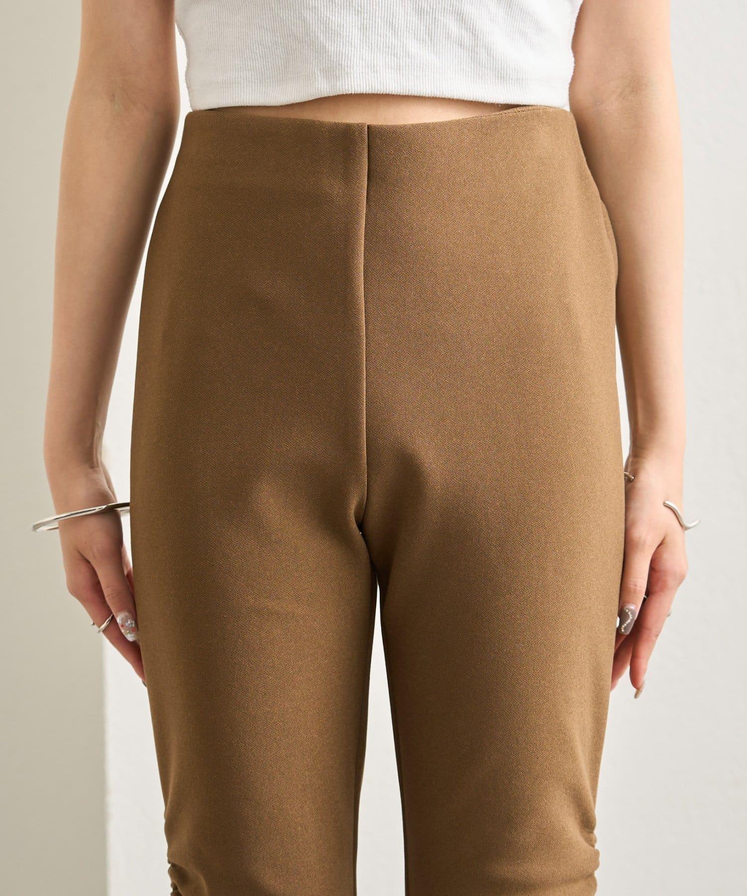 這款機車褲採用攏邊輪廓設計,下襬呈弧形,增強了服裝的時尚感。