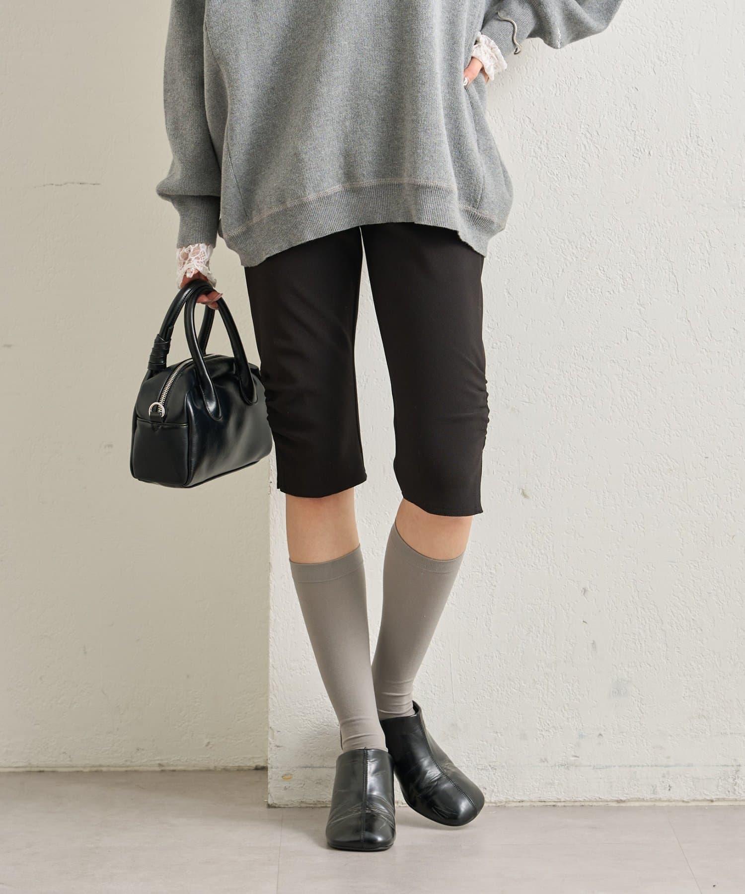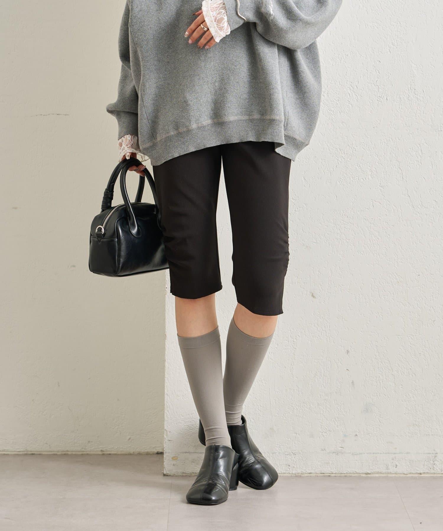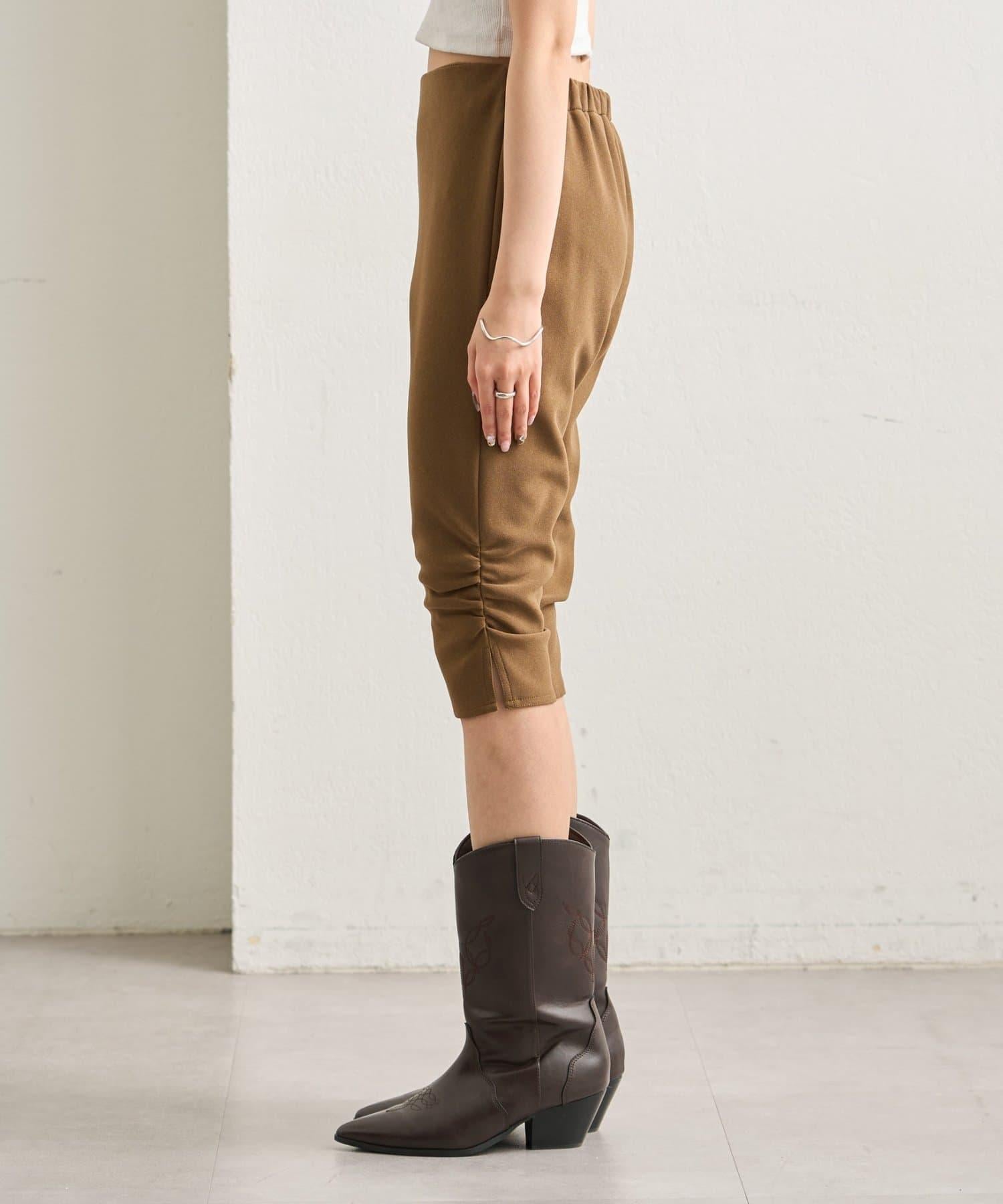 這款機車褲採用攏邊輪廓設計,下襬呈弧形,增強了服裝的時尚感。