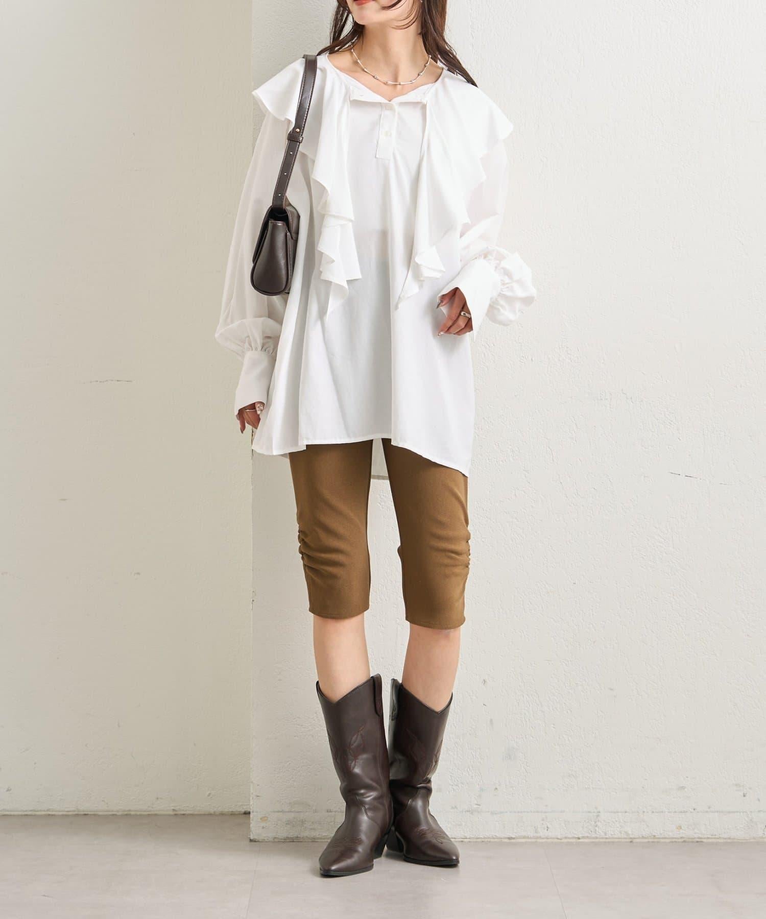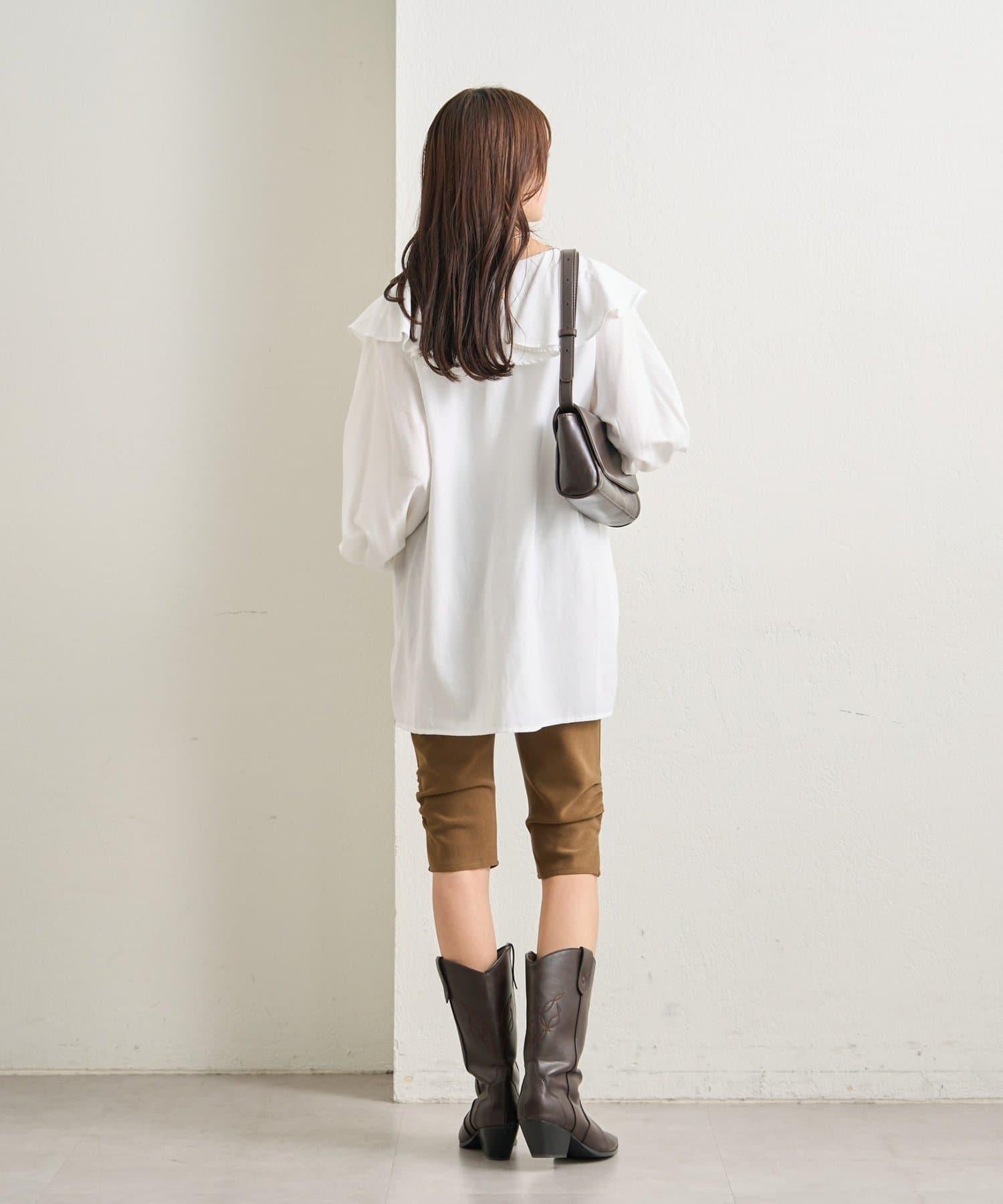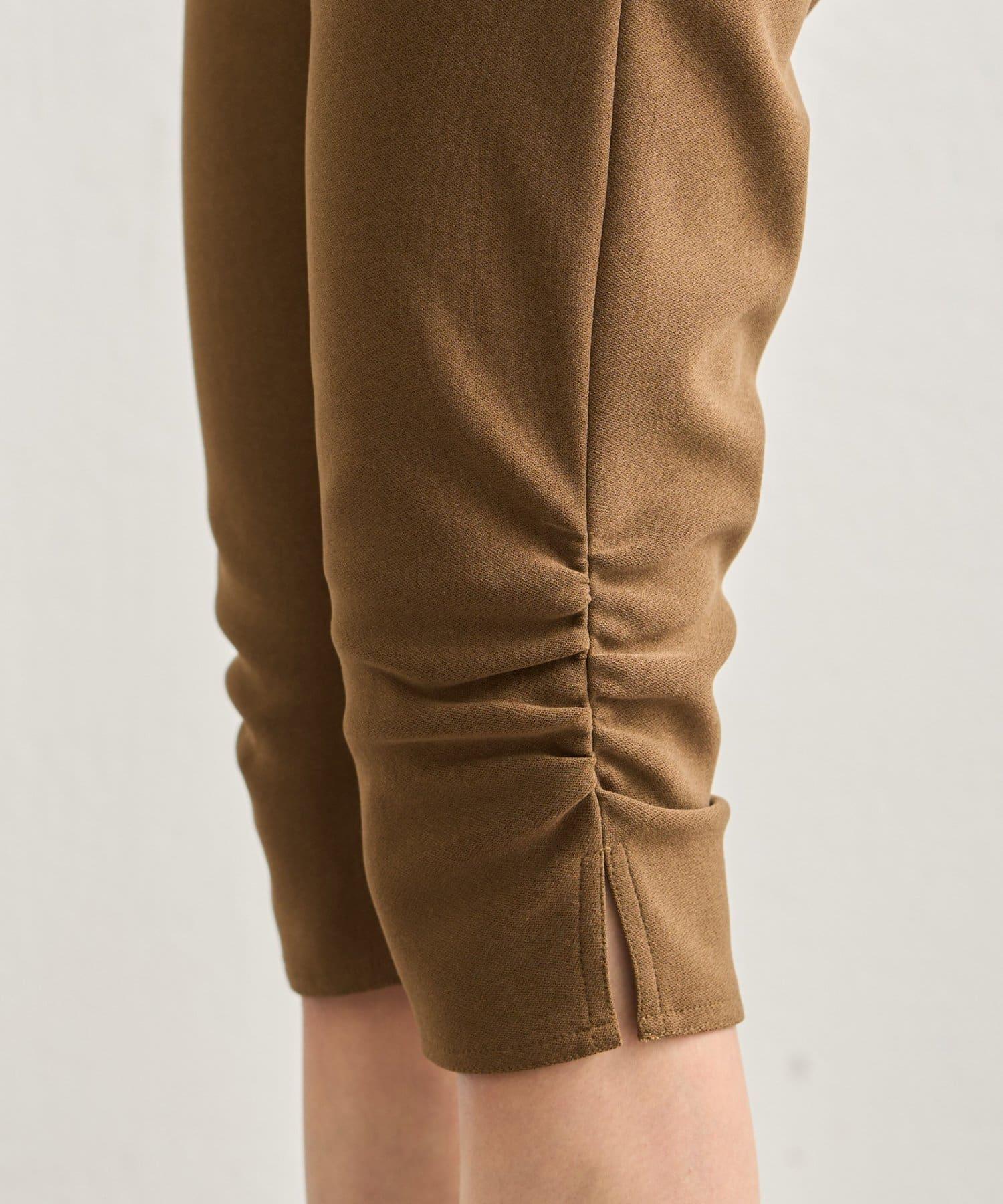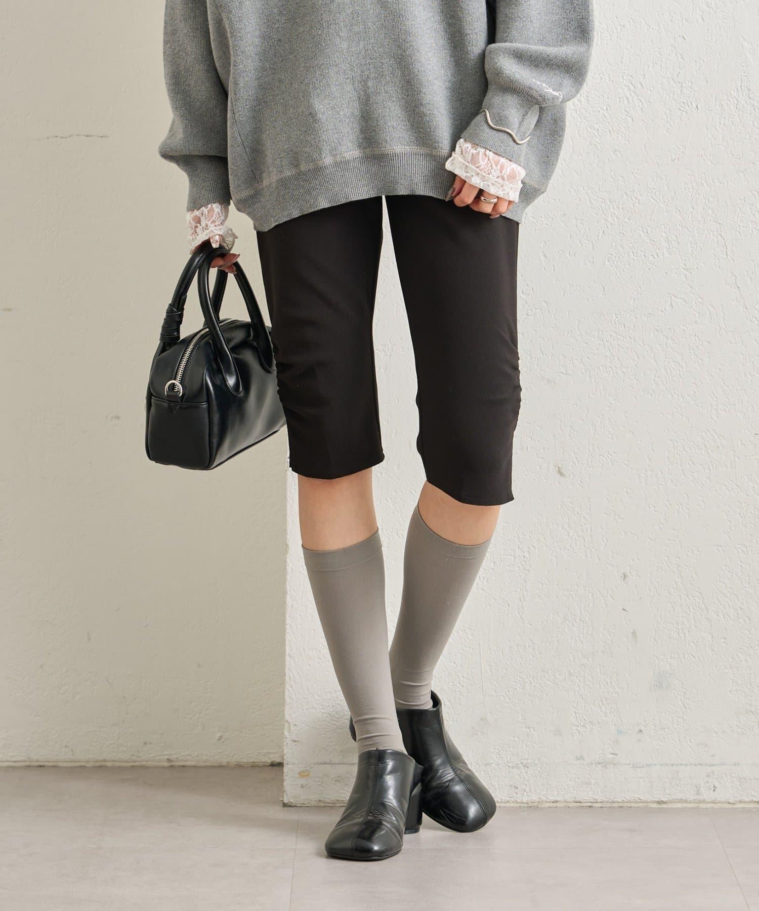 這款機車褲採用攏邊輪廓設計,下襬呈弧形,增強了服裝的時尚感。
