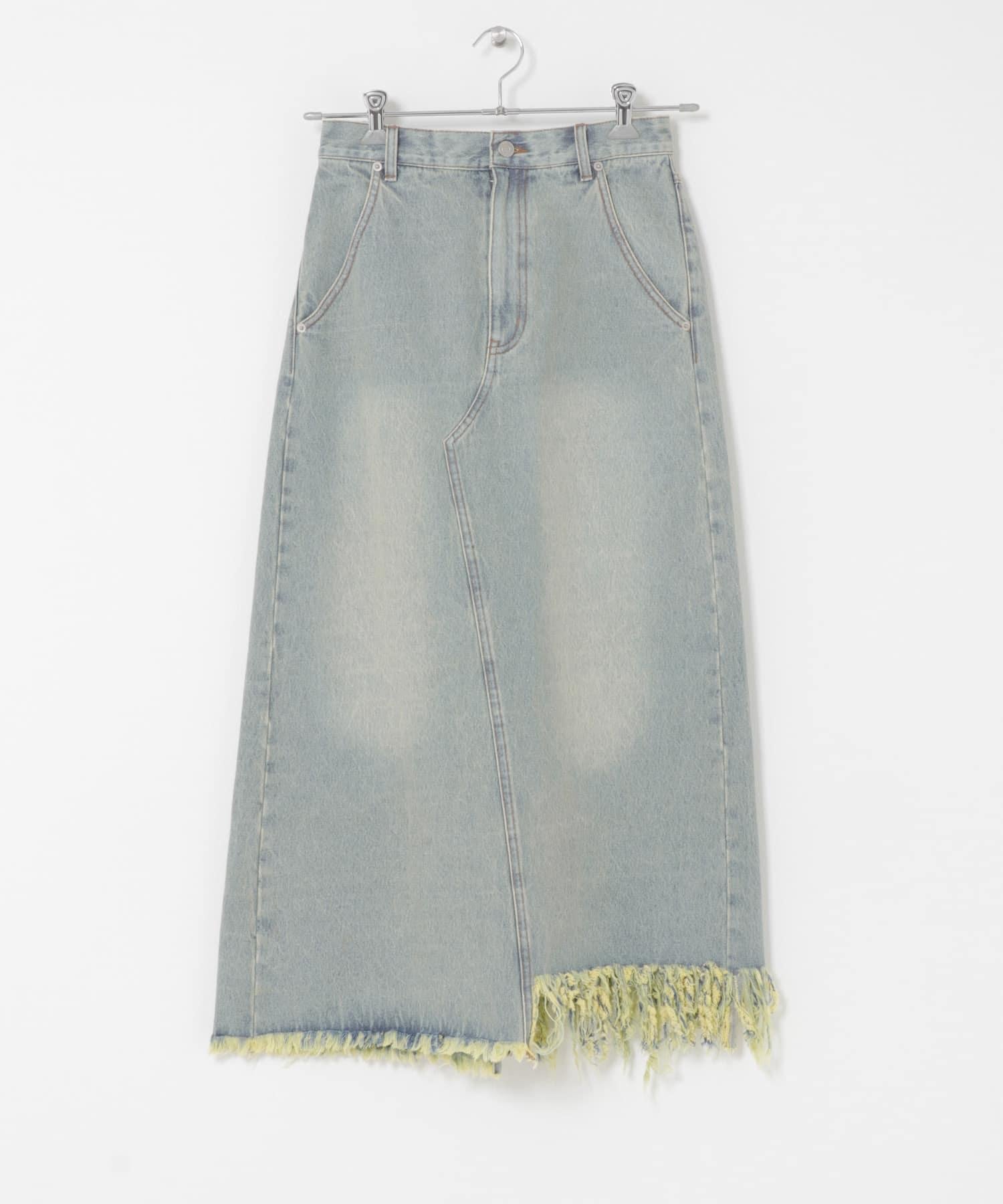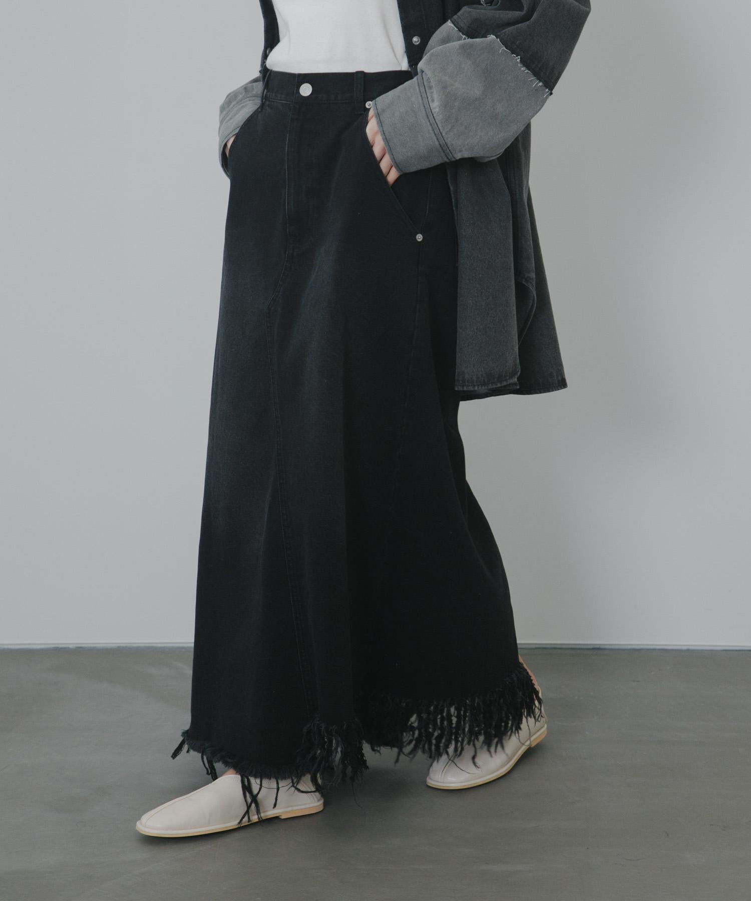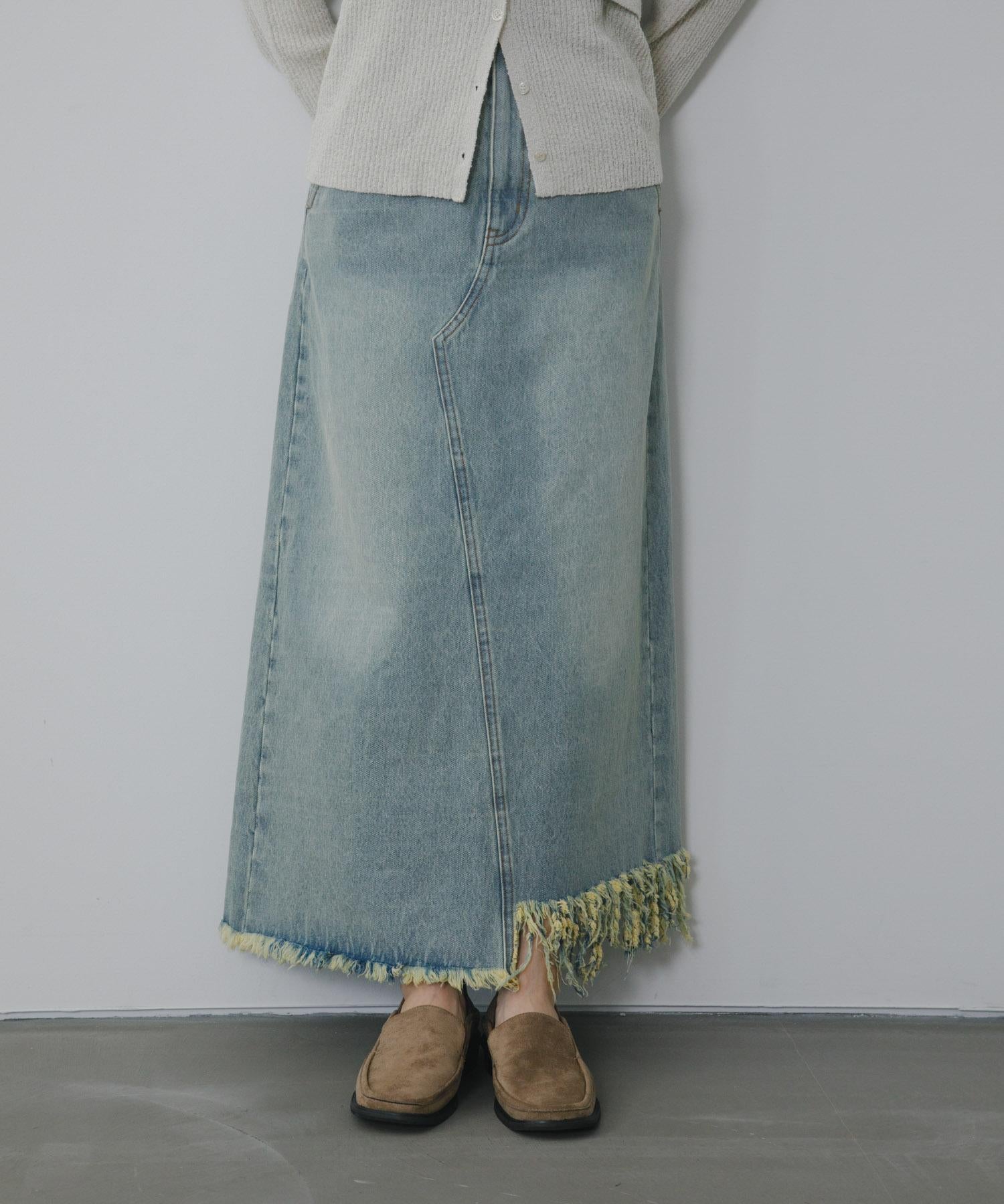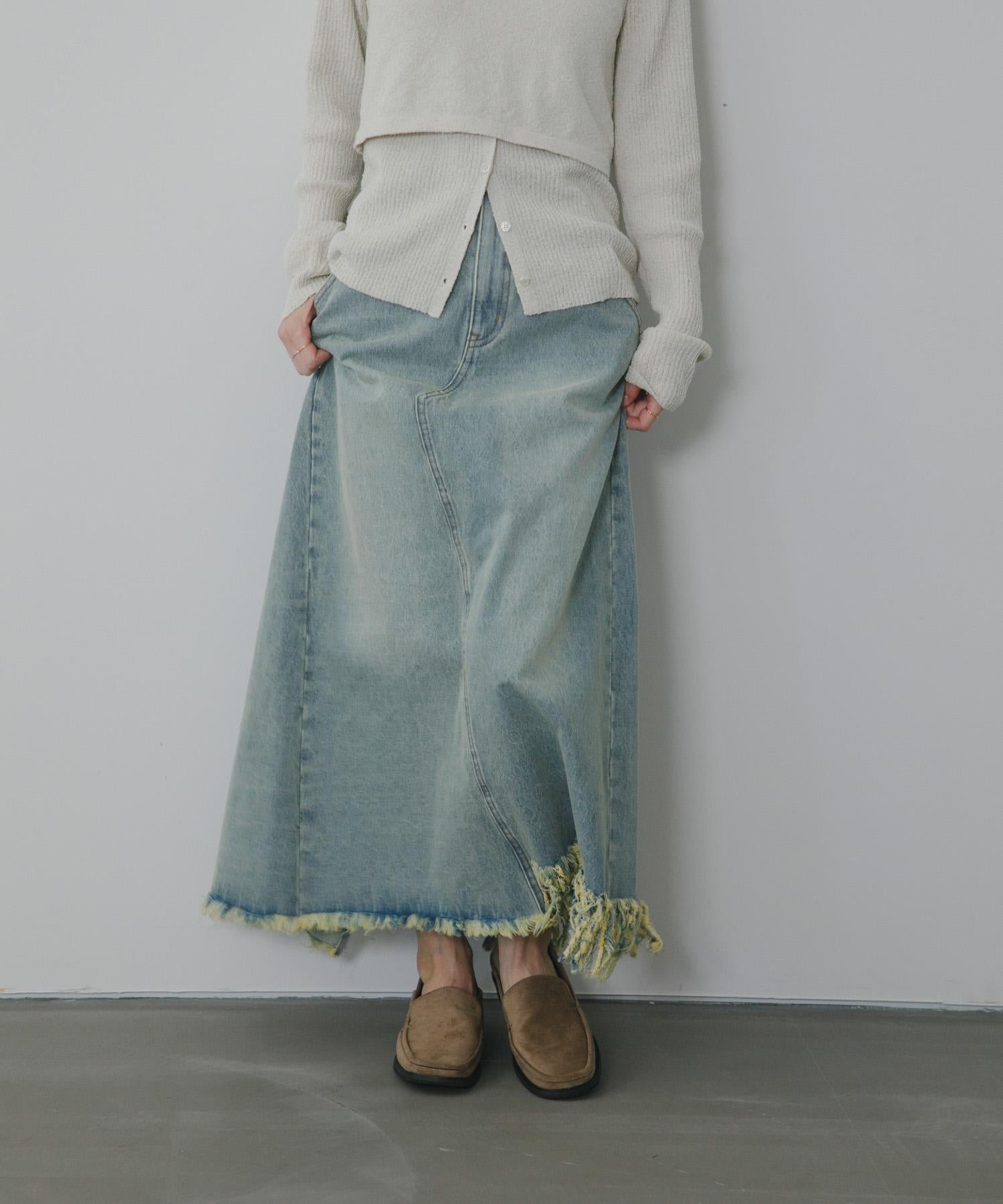 不對稱設計的牛仔裙。背部開衩設計給人一種適度寬鬆的感覺,充滿女人味。腰部設計乾淨利落,可以塞進腰間,讓造型更有型。流蘇下襬和對比強烈的色彩變化也值得一提。