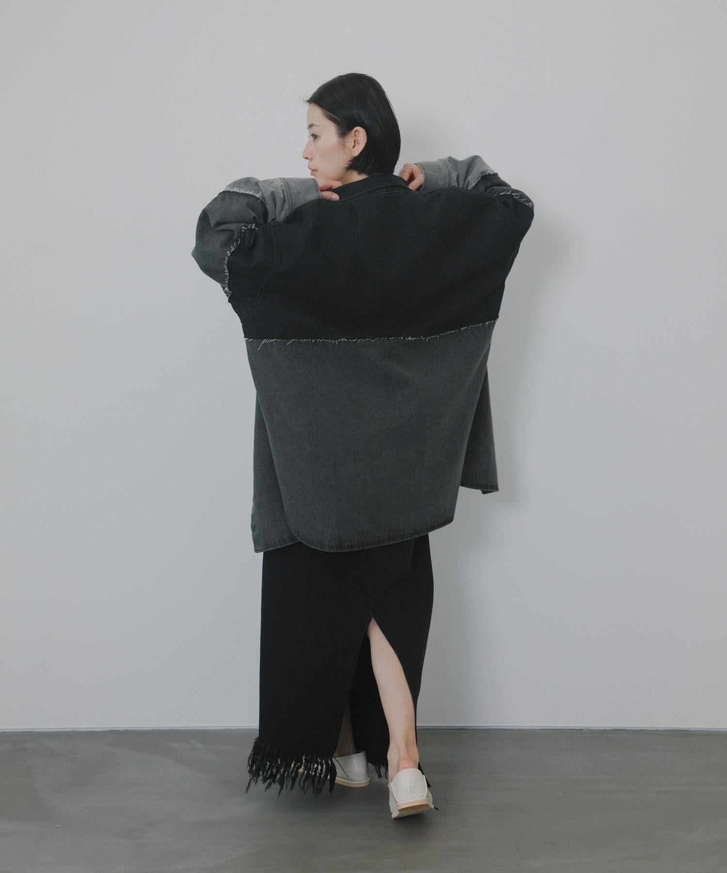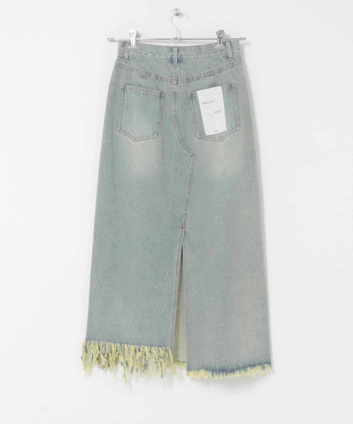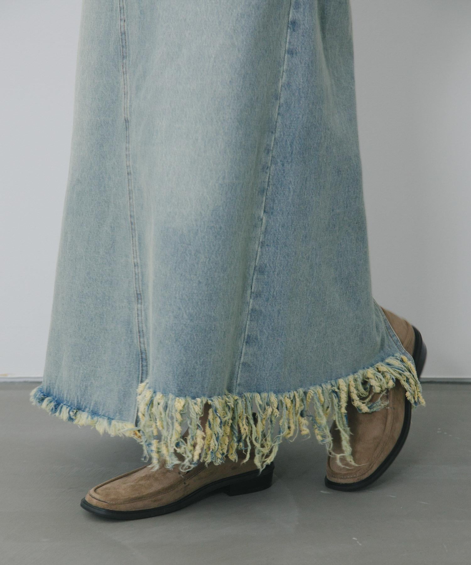 不對稱設計的牛仔裙。背部開衩設計給人一種適度寬鬆的感覺,充滿女人味。腰部設計乾淨利落,可以塞進腰間,讓造型更有型。流蘇下襬和對比強烈的色彩變化也值得一提。
