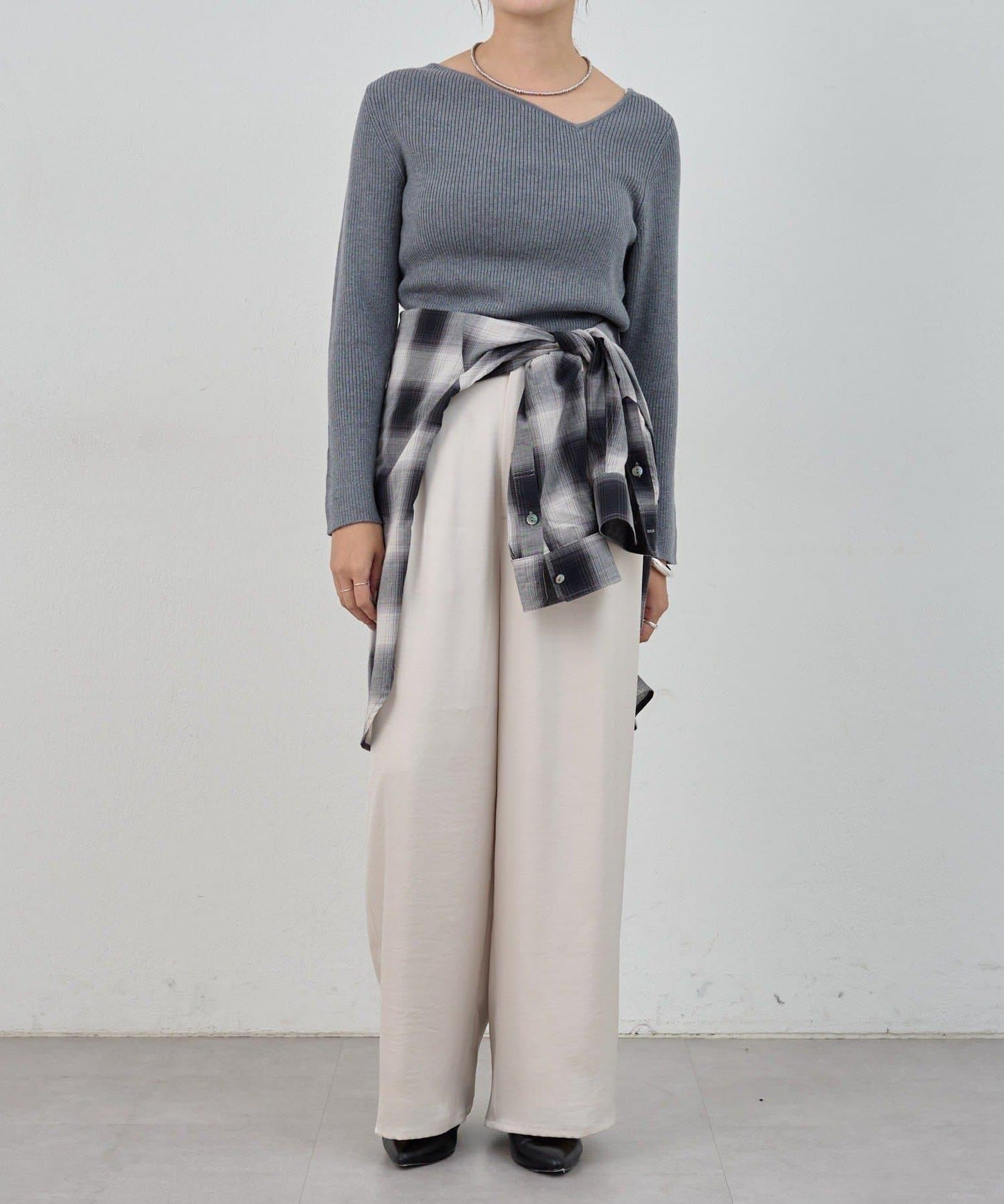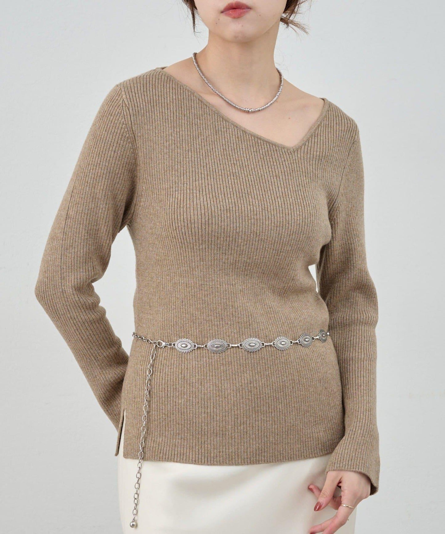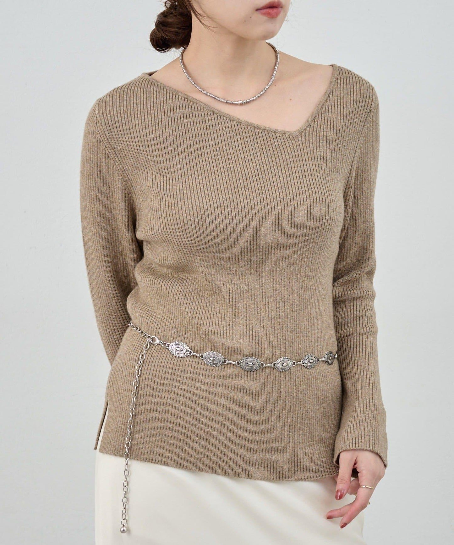 針織衫採用不對稱領口設計,優雅地展現出肩部線條。