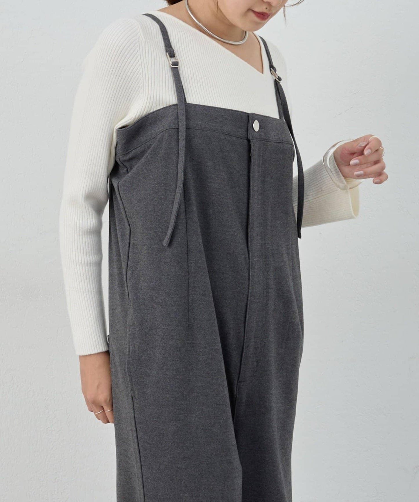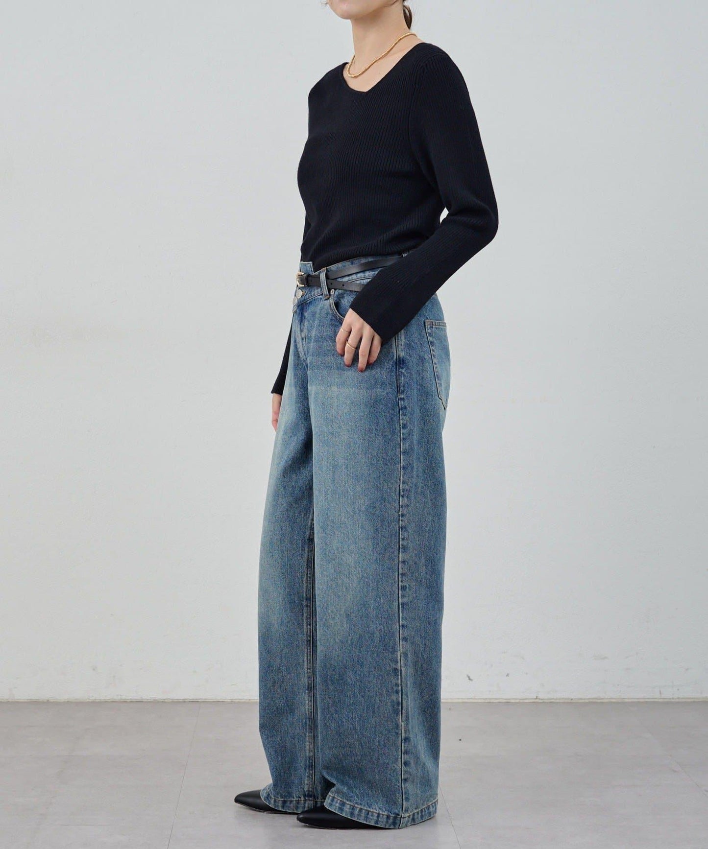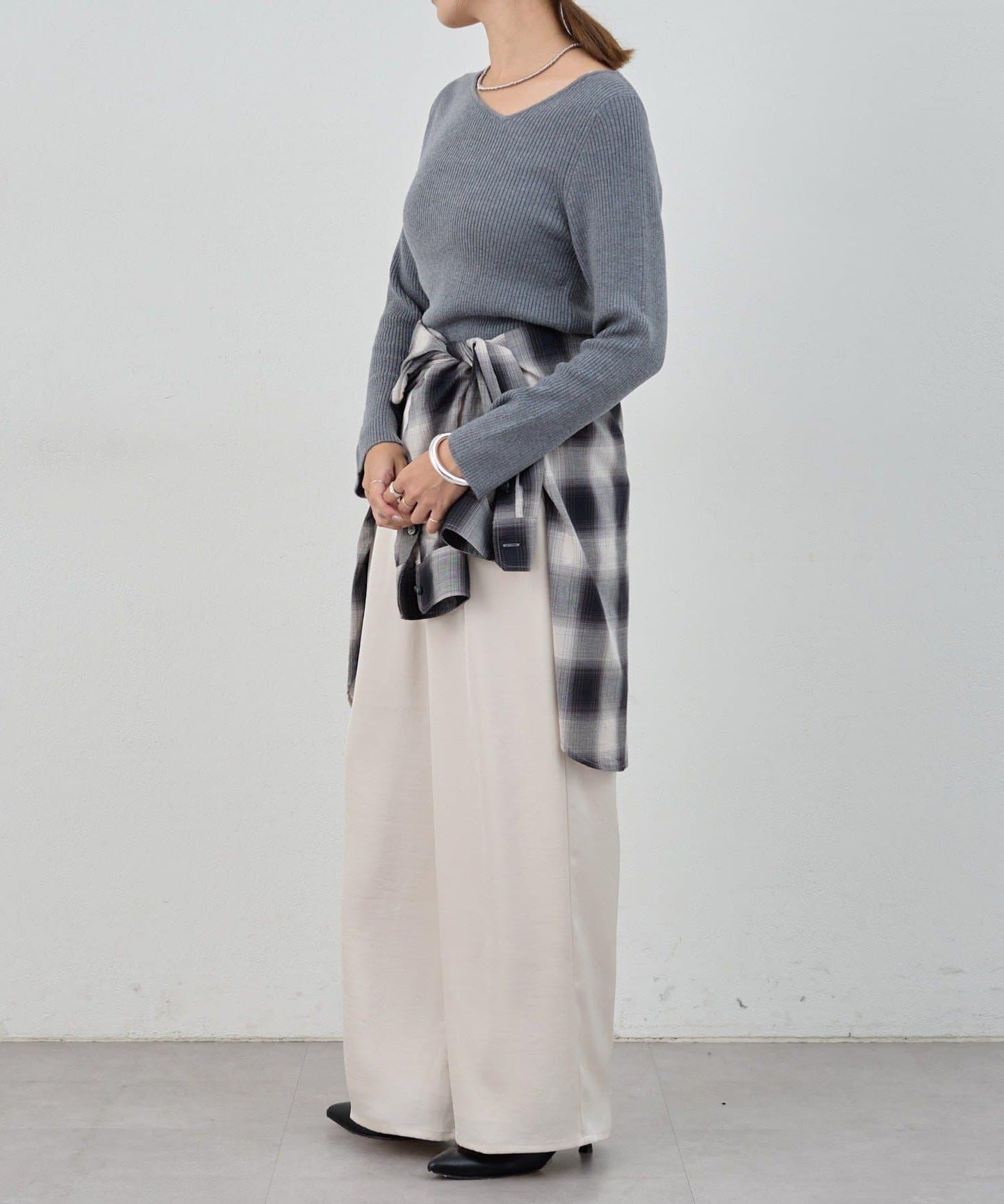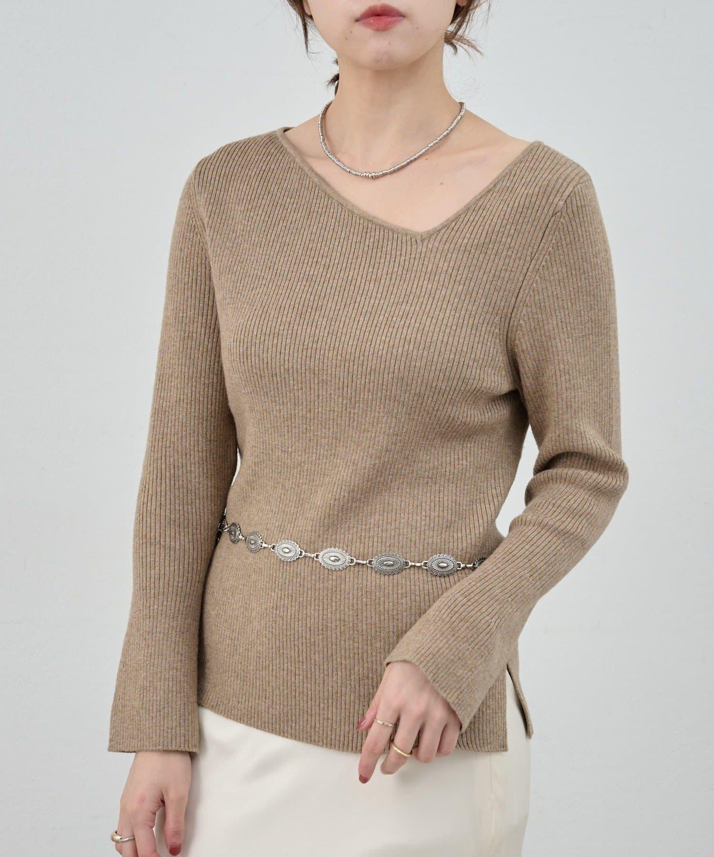 針織衫採用不對稱領口設計,優雅地展現出肩部線條。