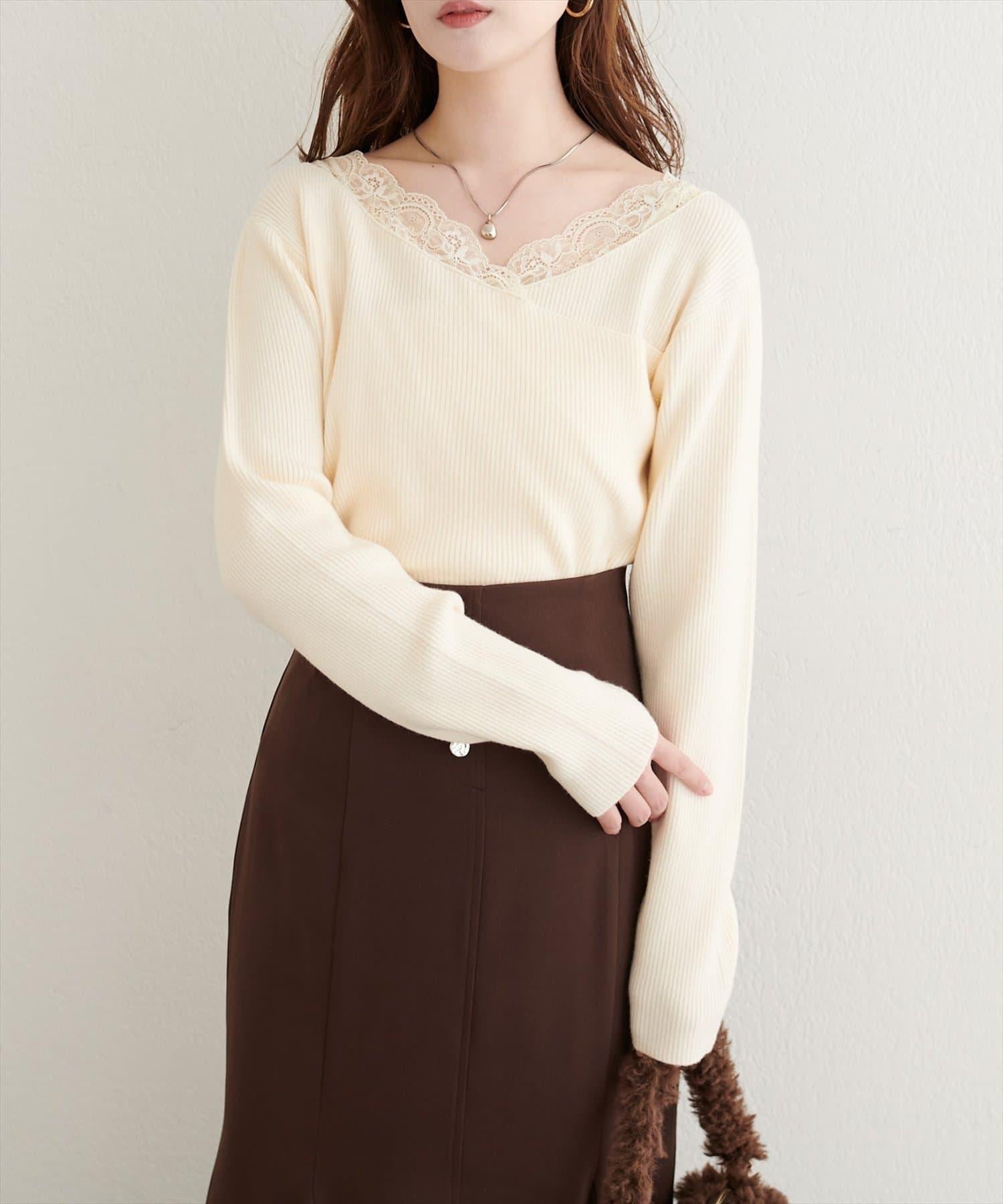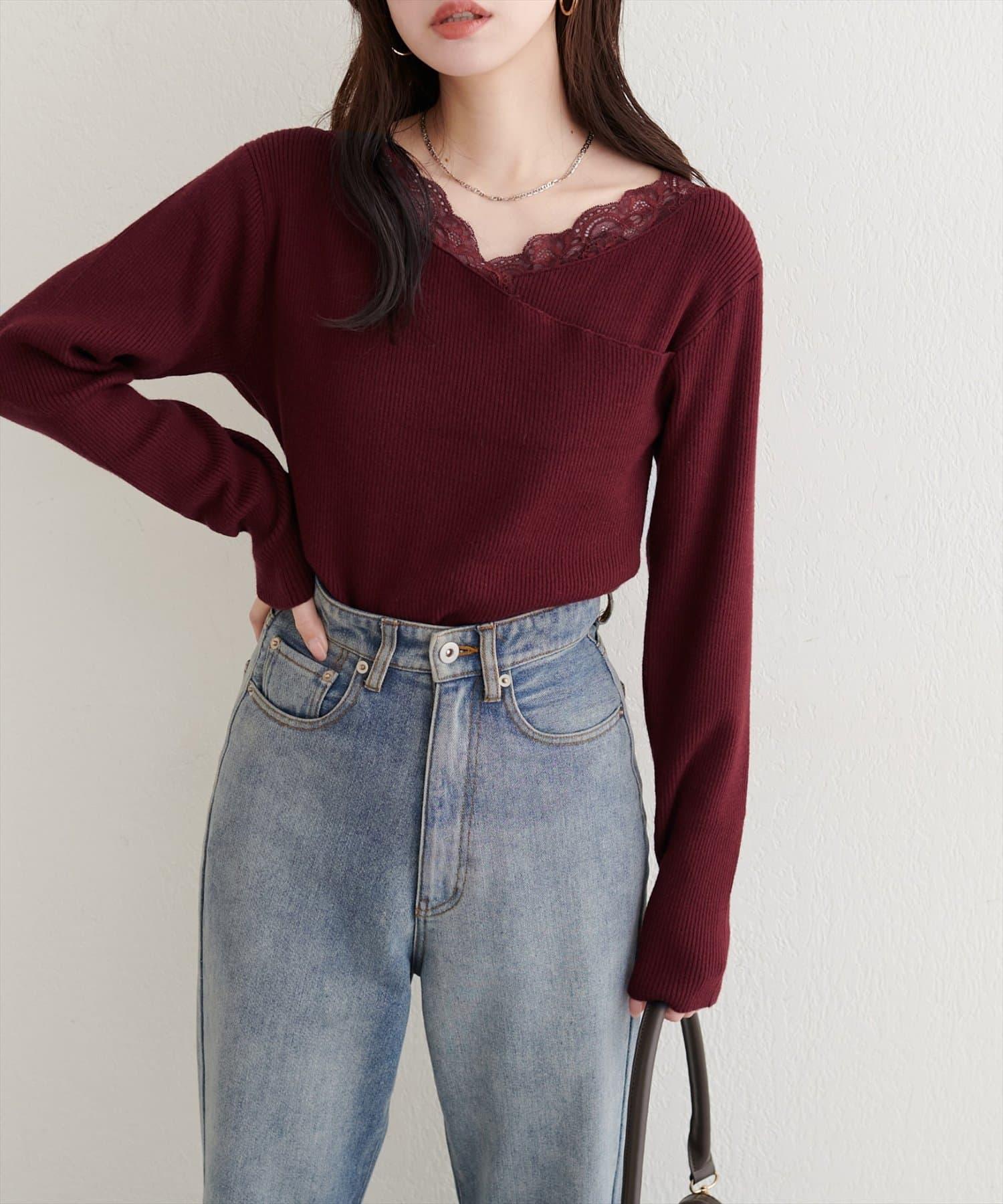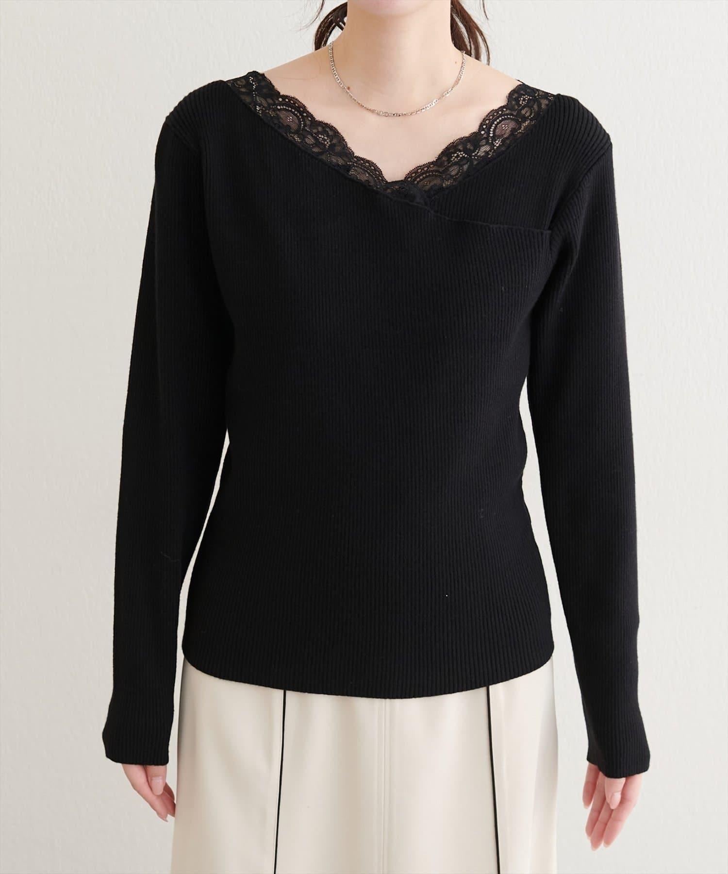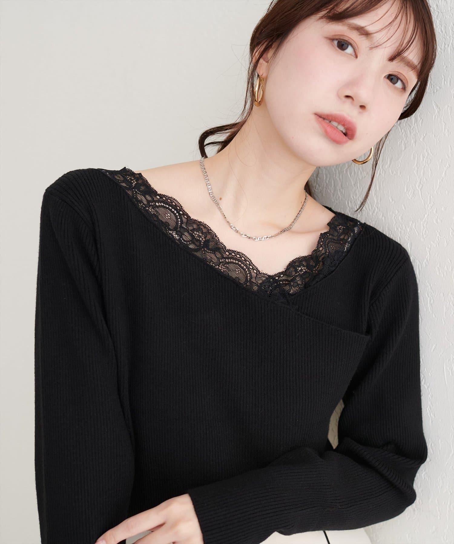 [WEB 👍] 不對稱蕾絲領羅紋針織套頭衫