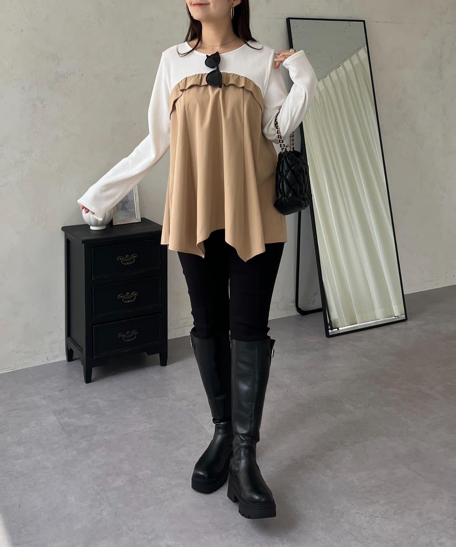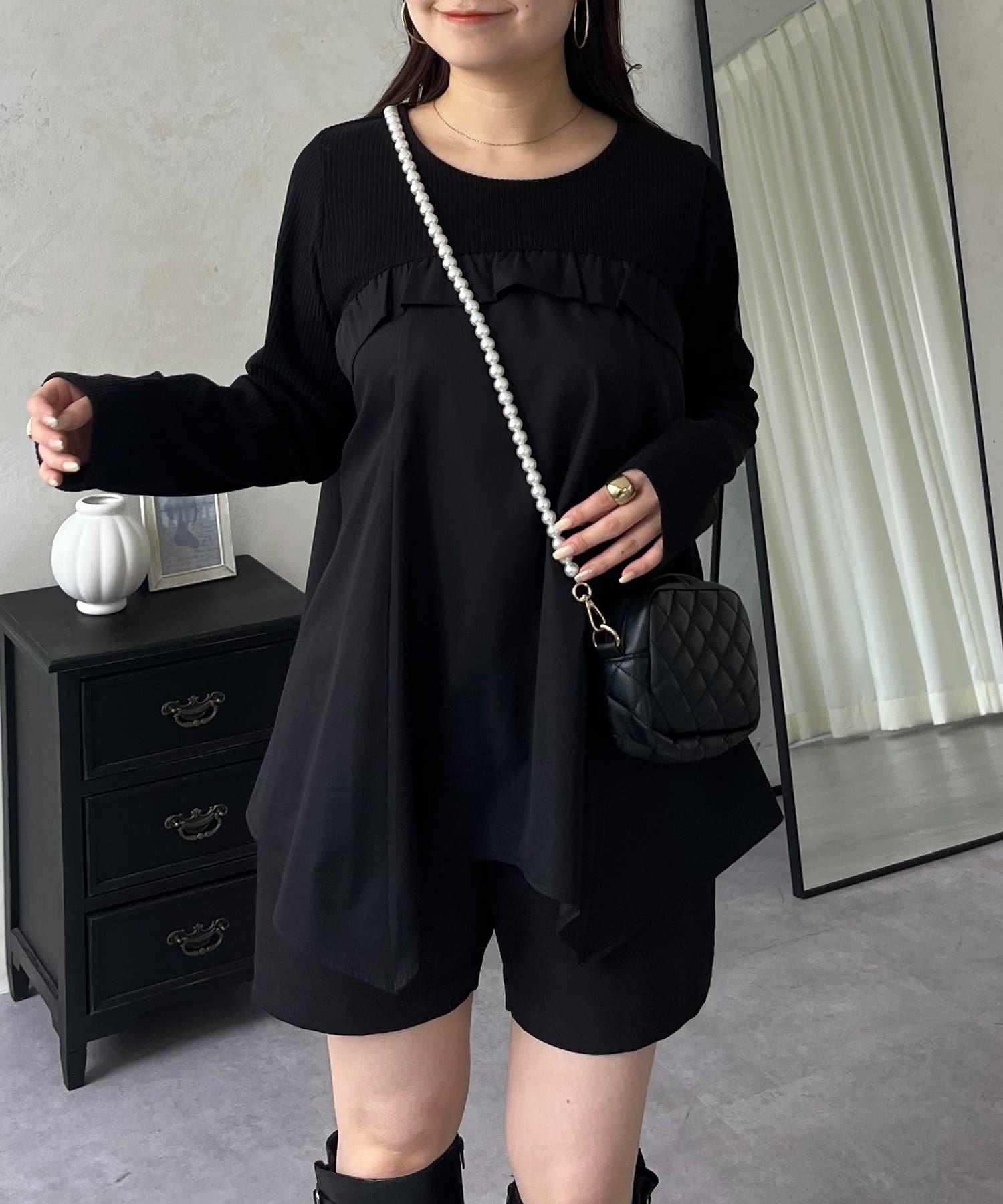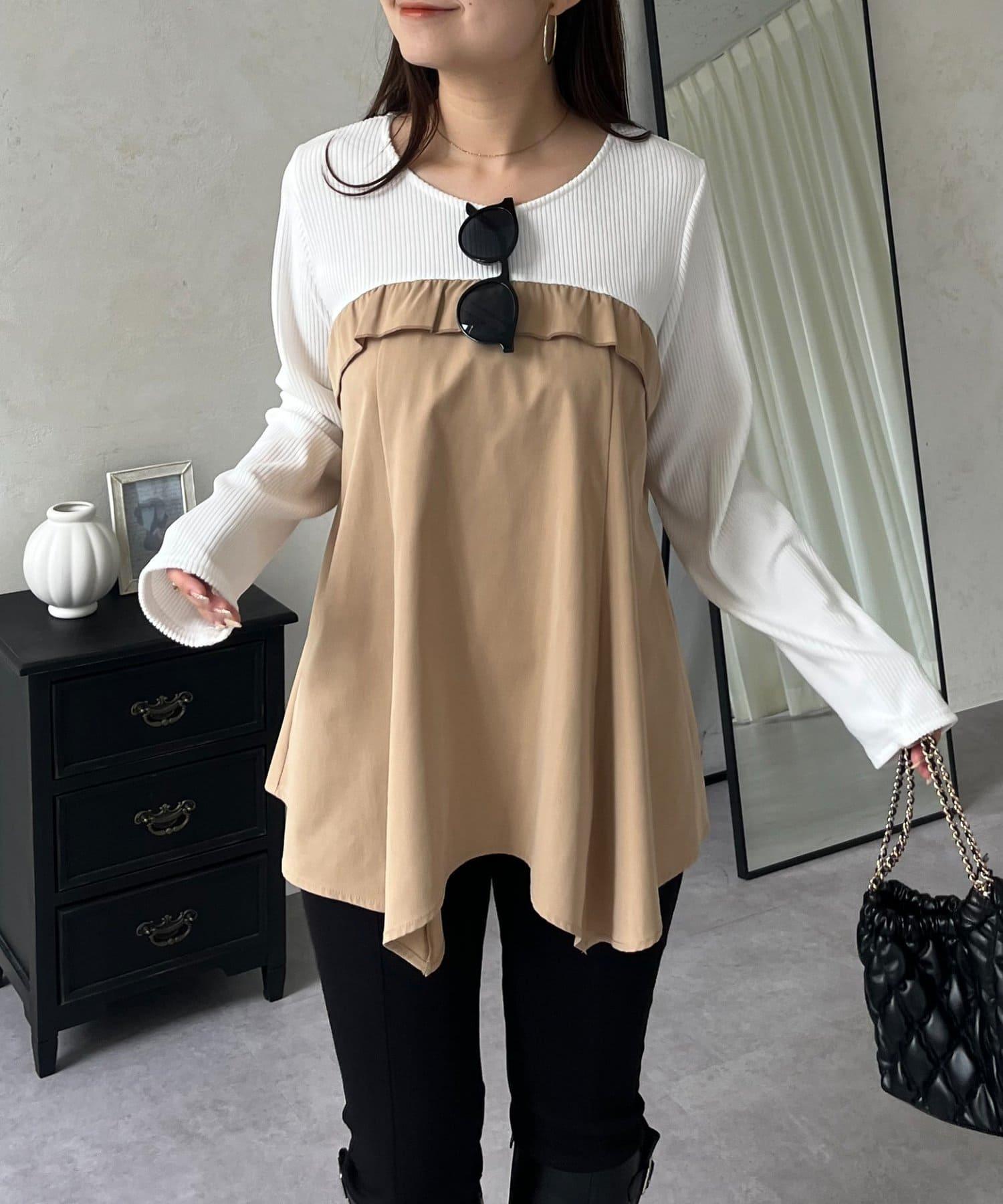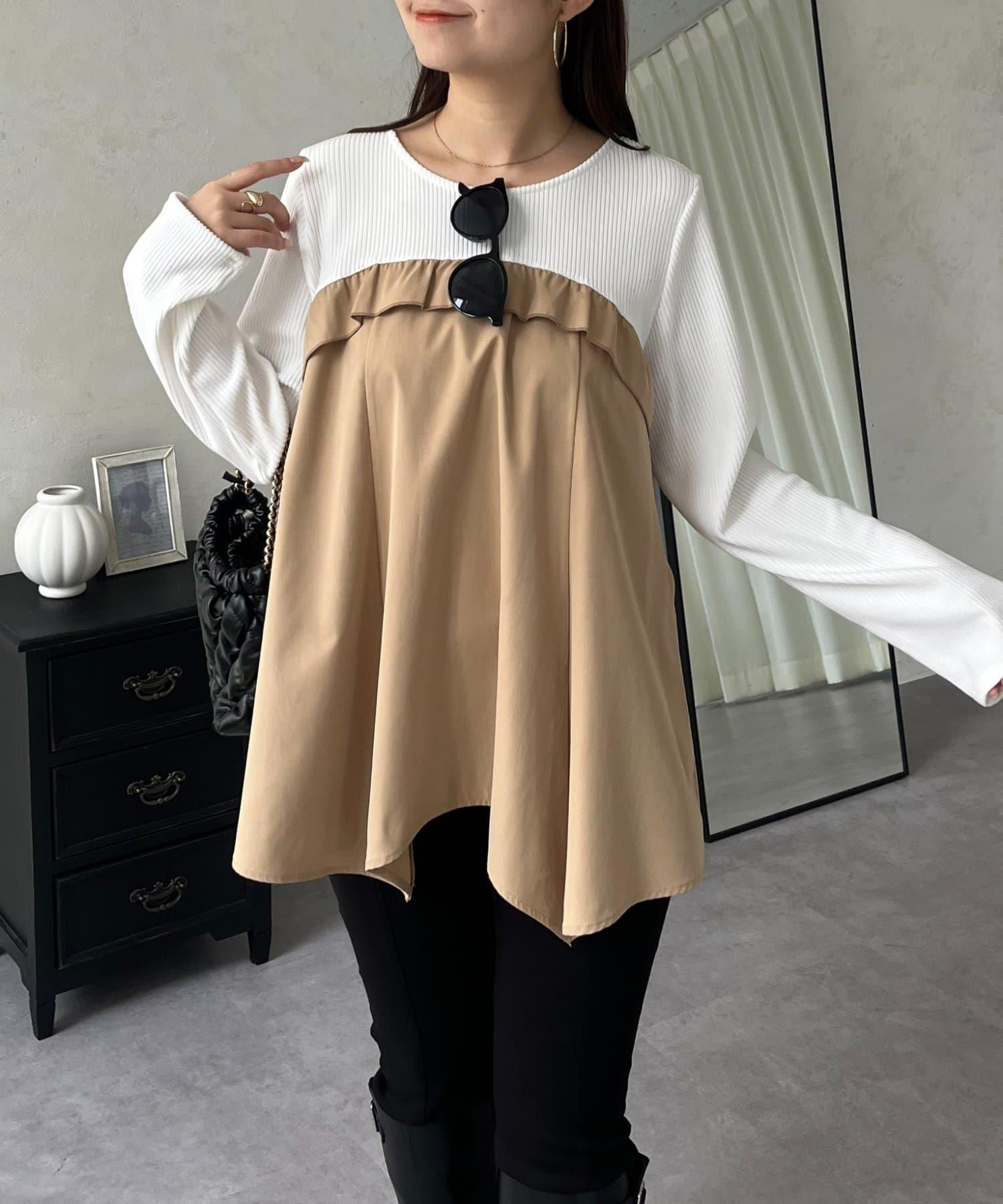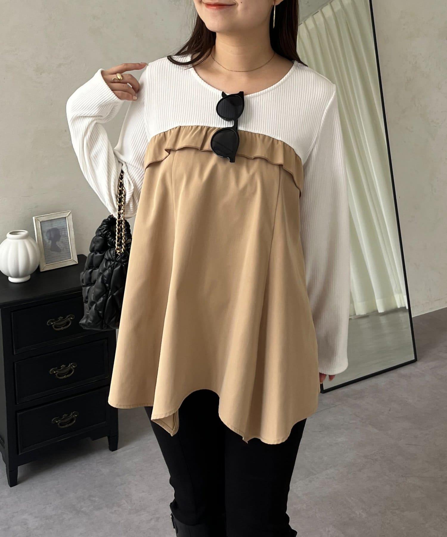 不規則下襬荷葉邊拼接A字羅紋長袖T恤