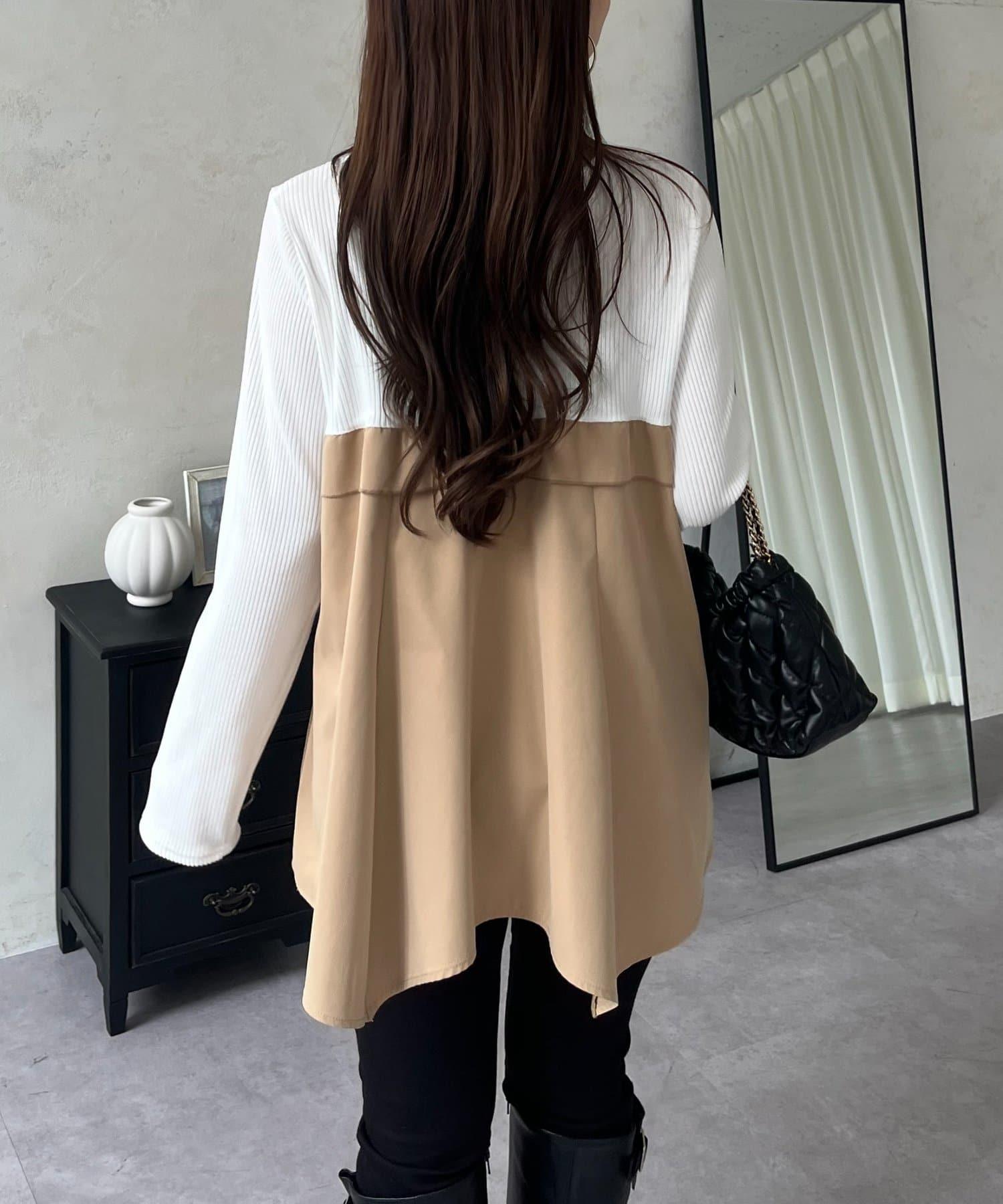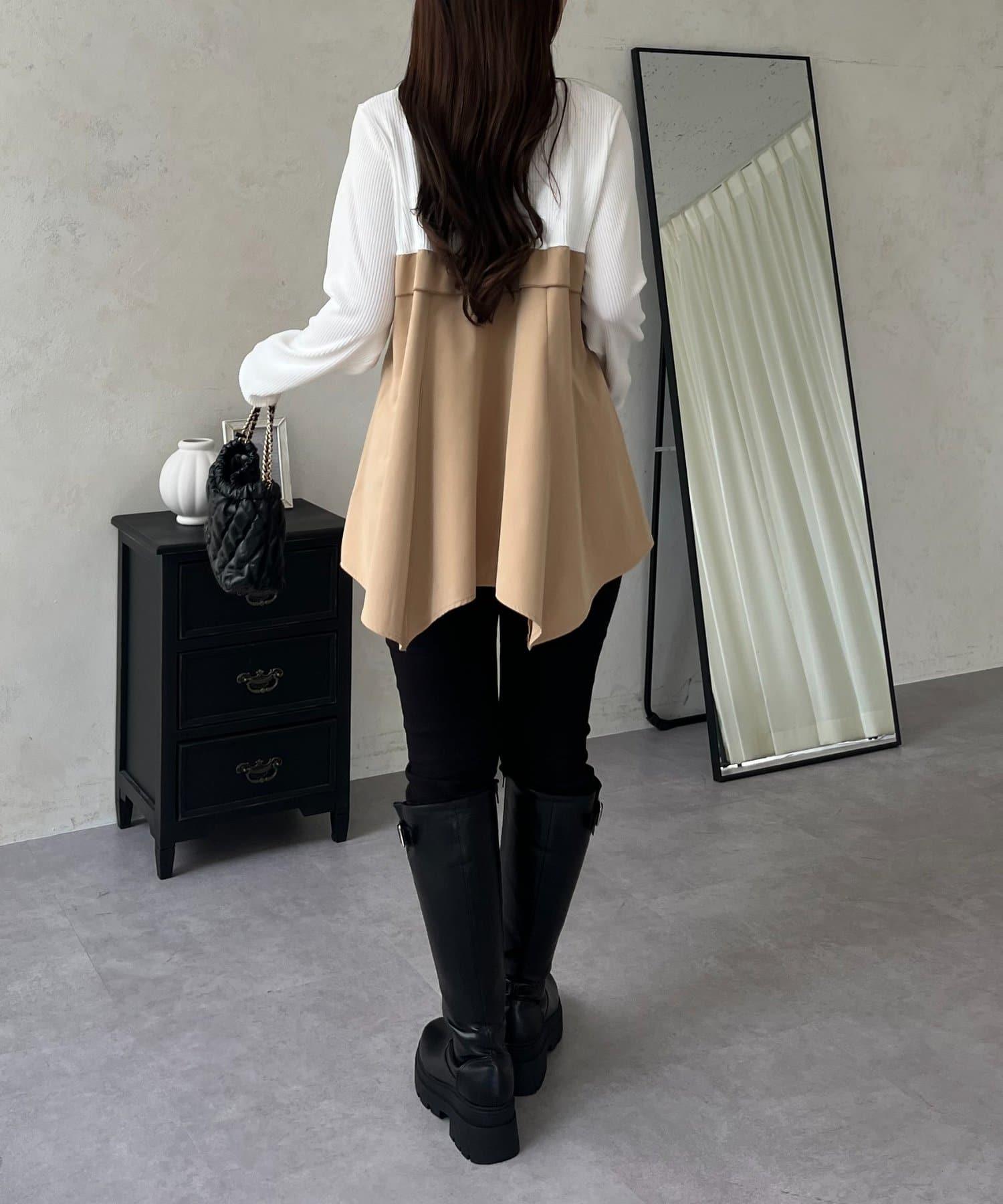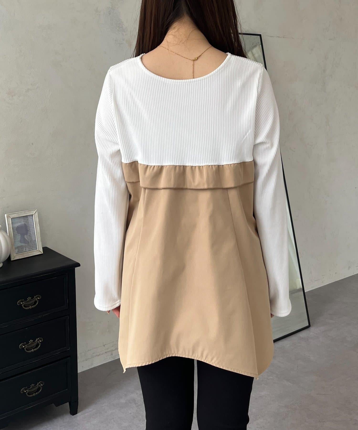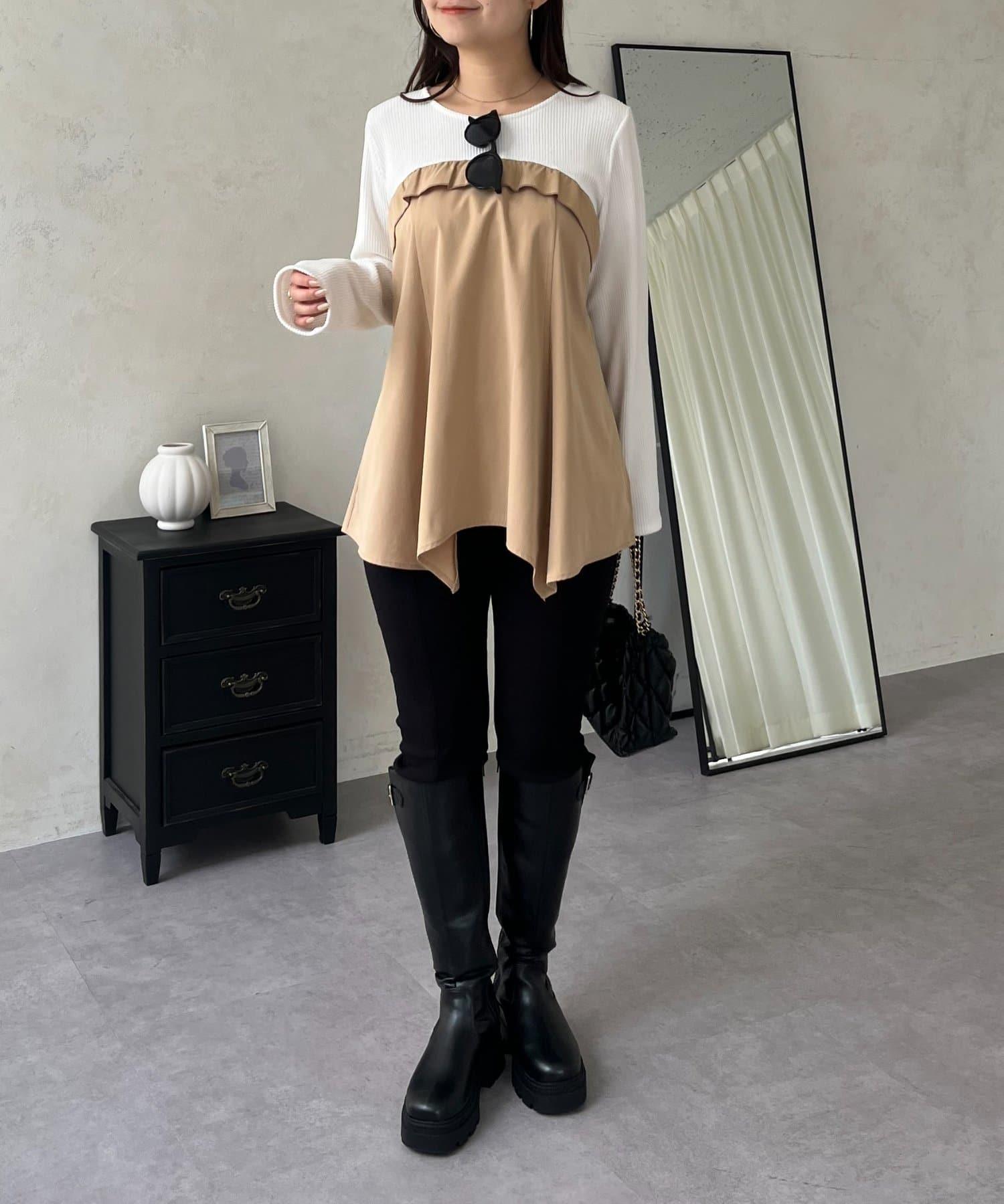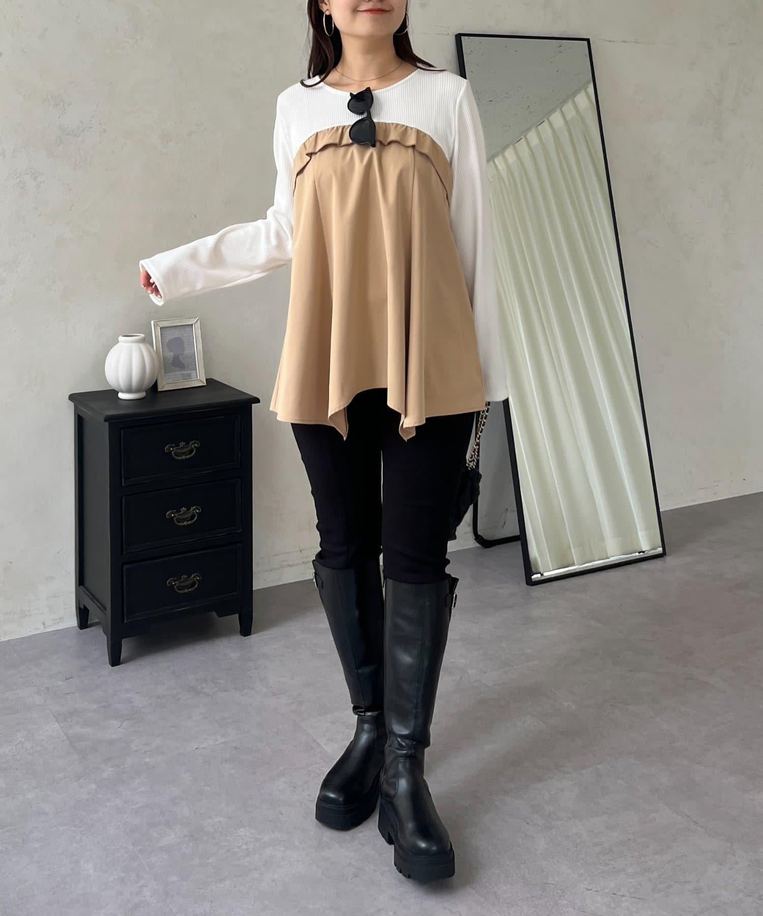 不規則下襬荷葉邊拼接A字羅紋長袖T恤