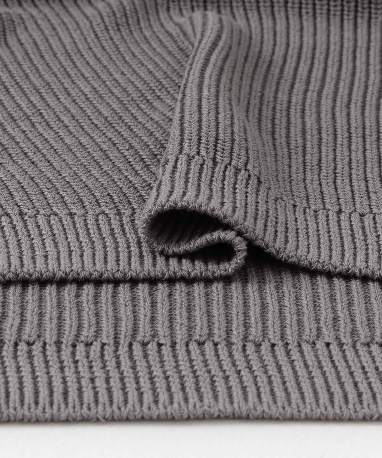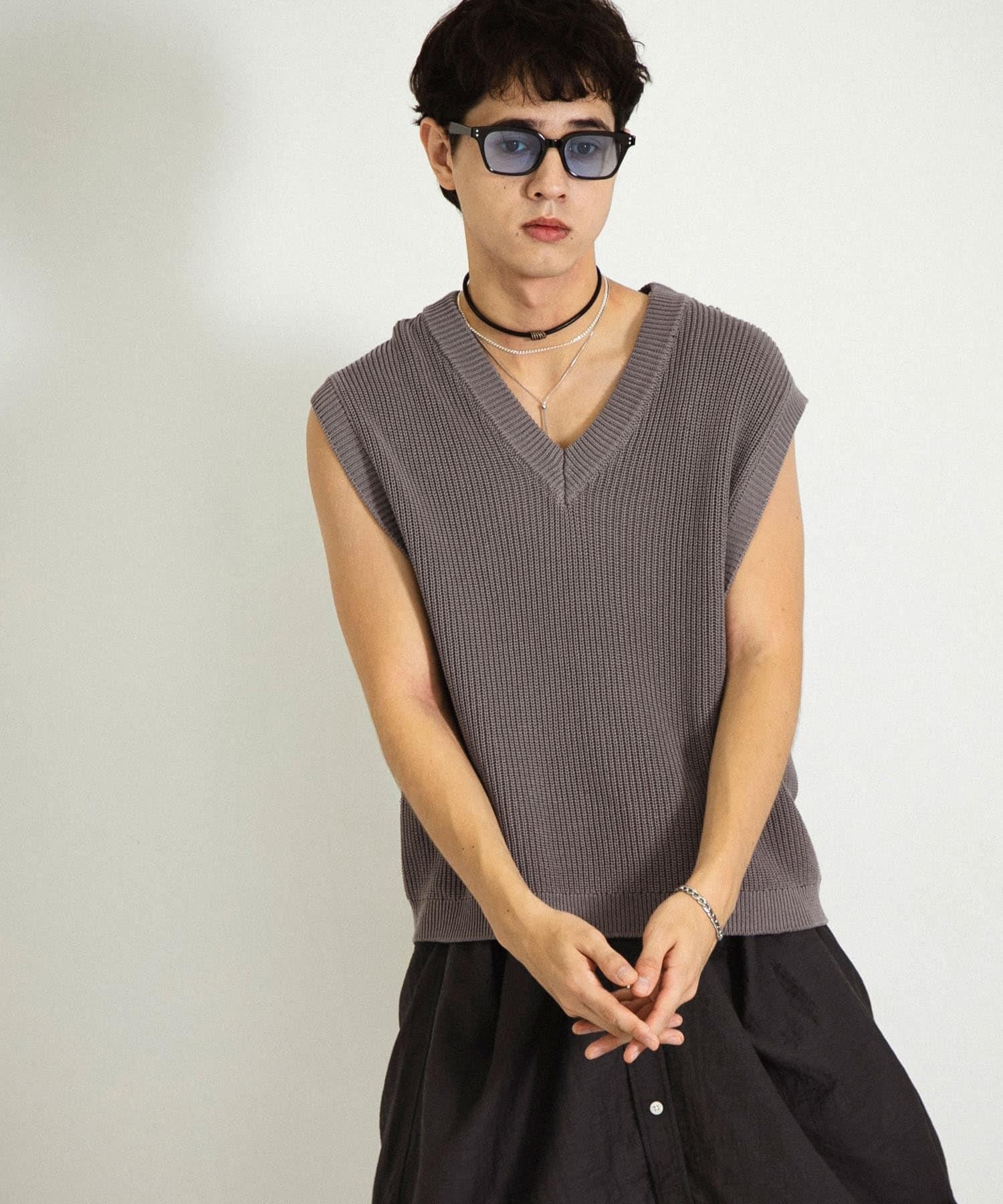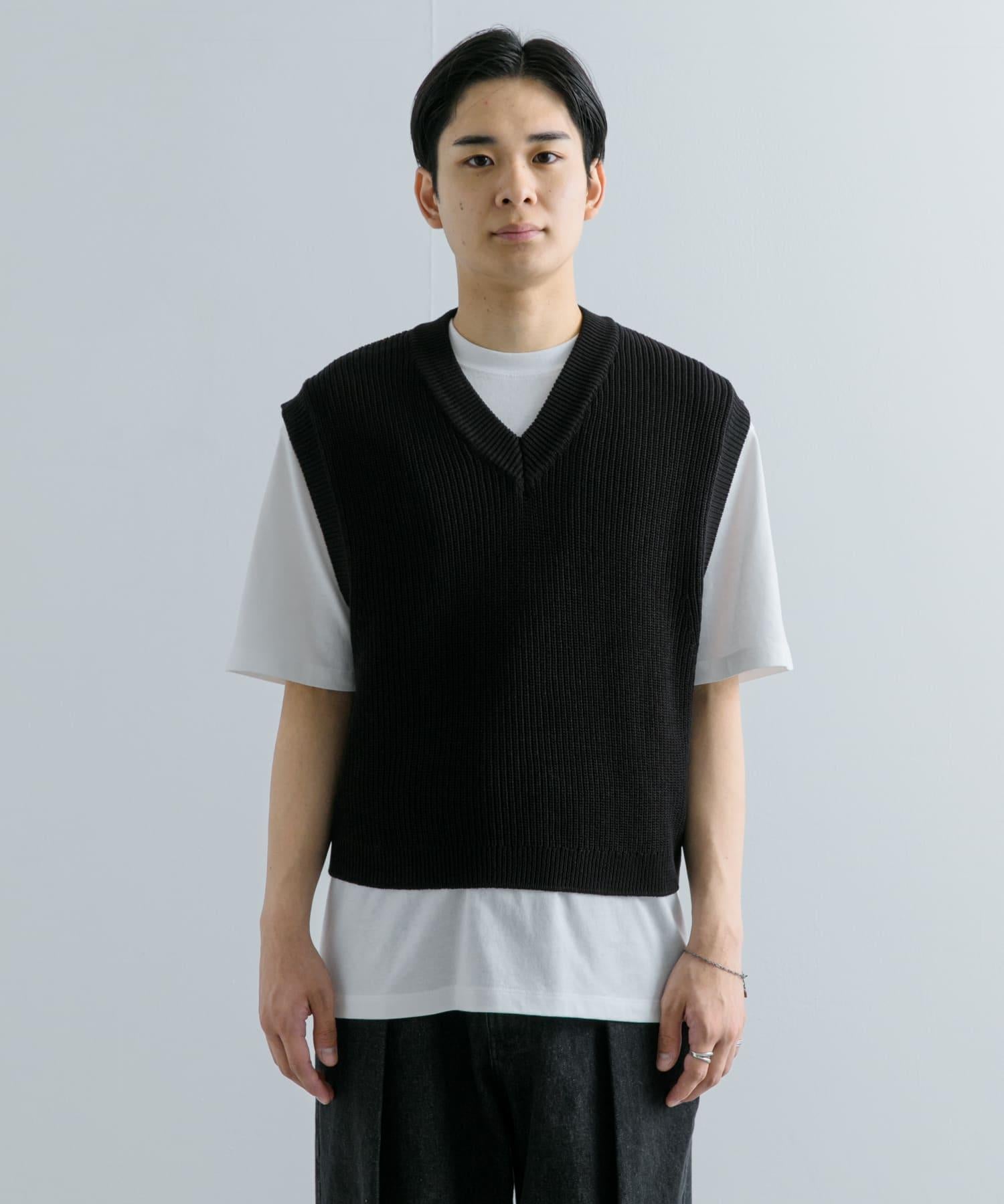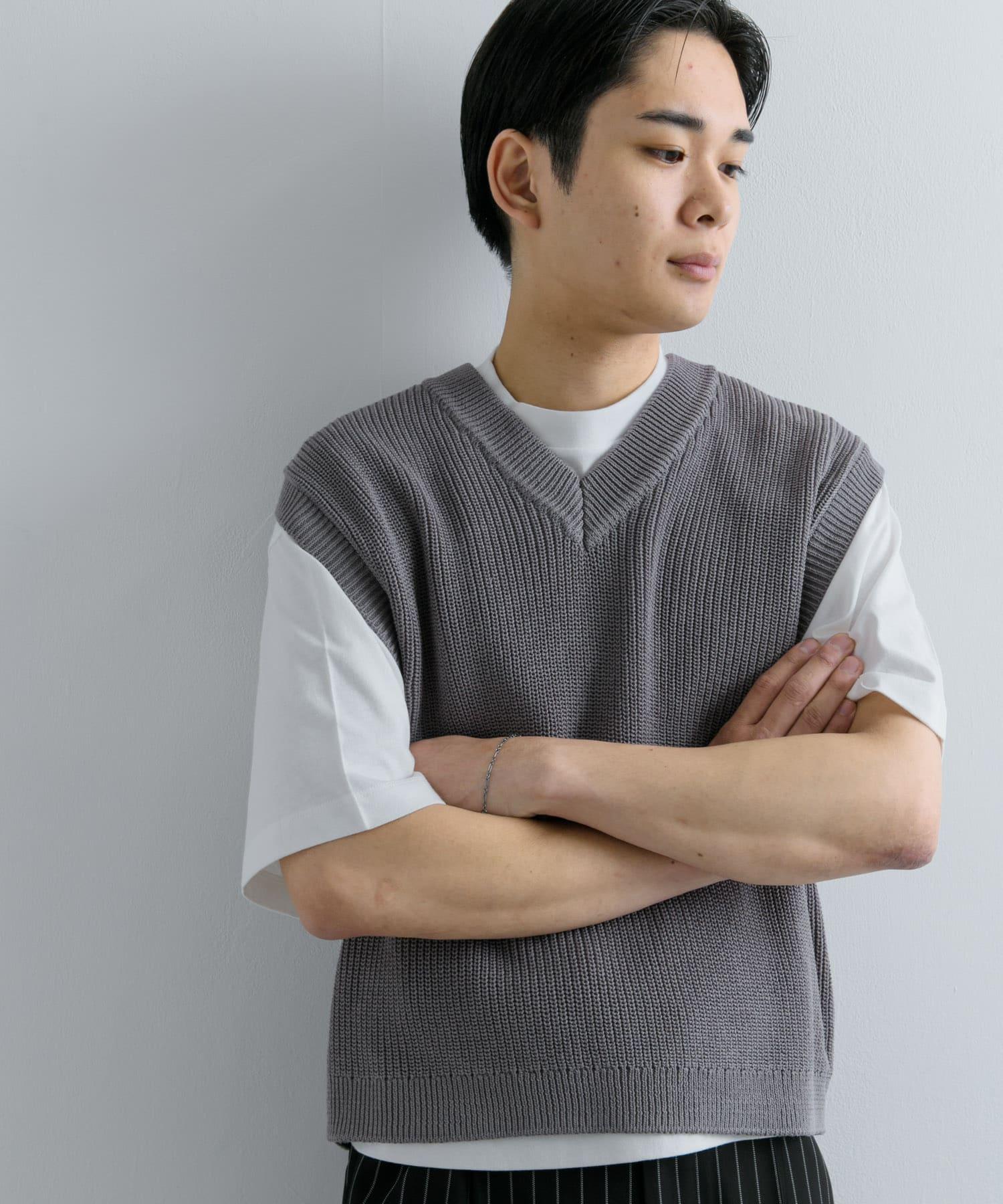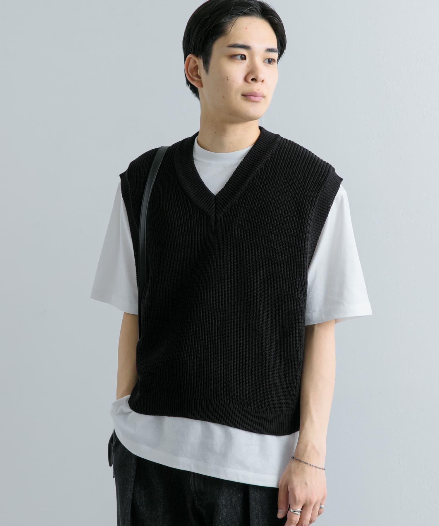 這款針織馬甲採用凹凸有致的羅紋針織和深 V 領設計。