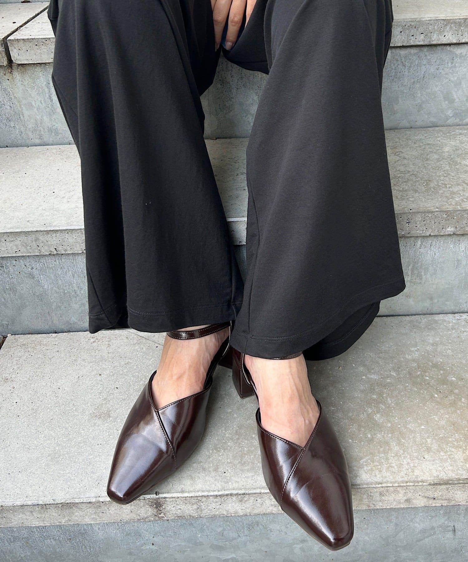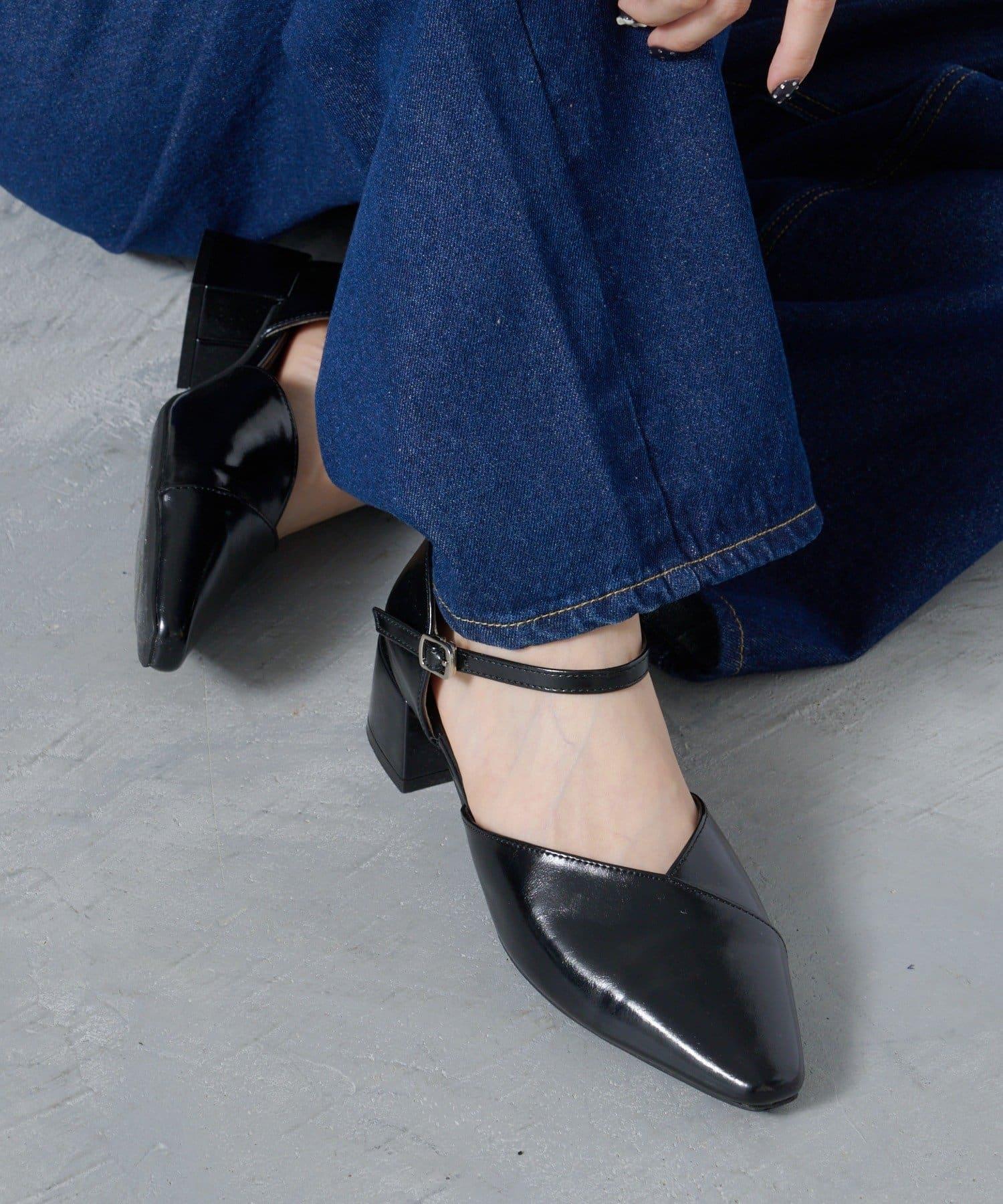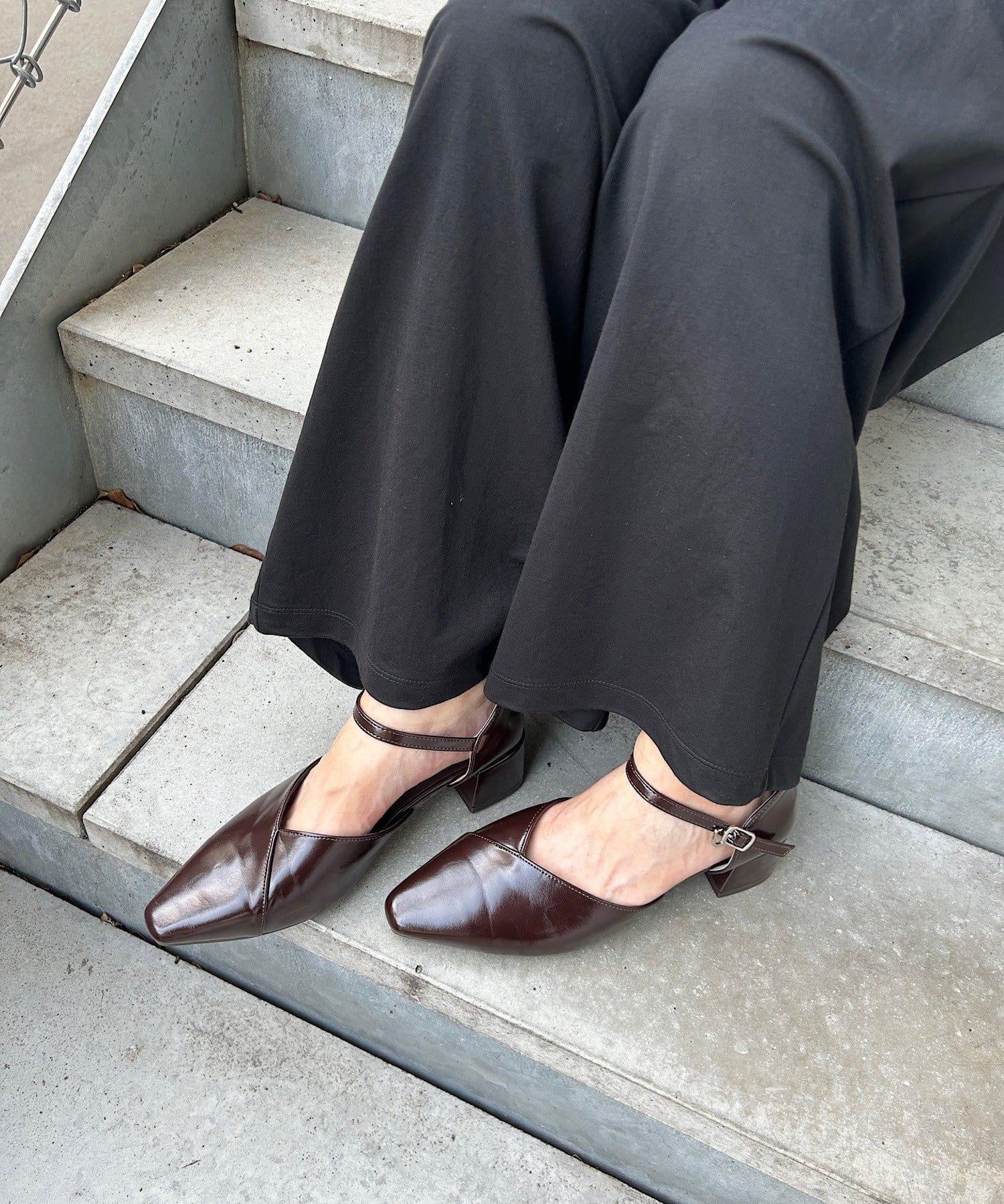 這款高跟鞋採用尖銳的方形鞋頭和交叉綁帶設計,更顯女性柔美。