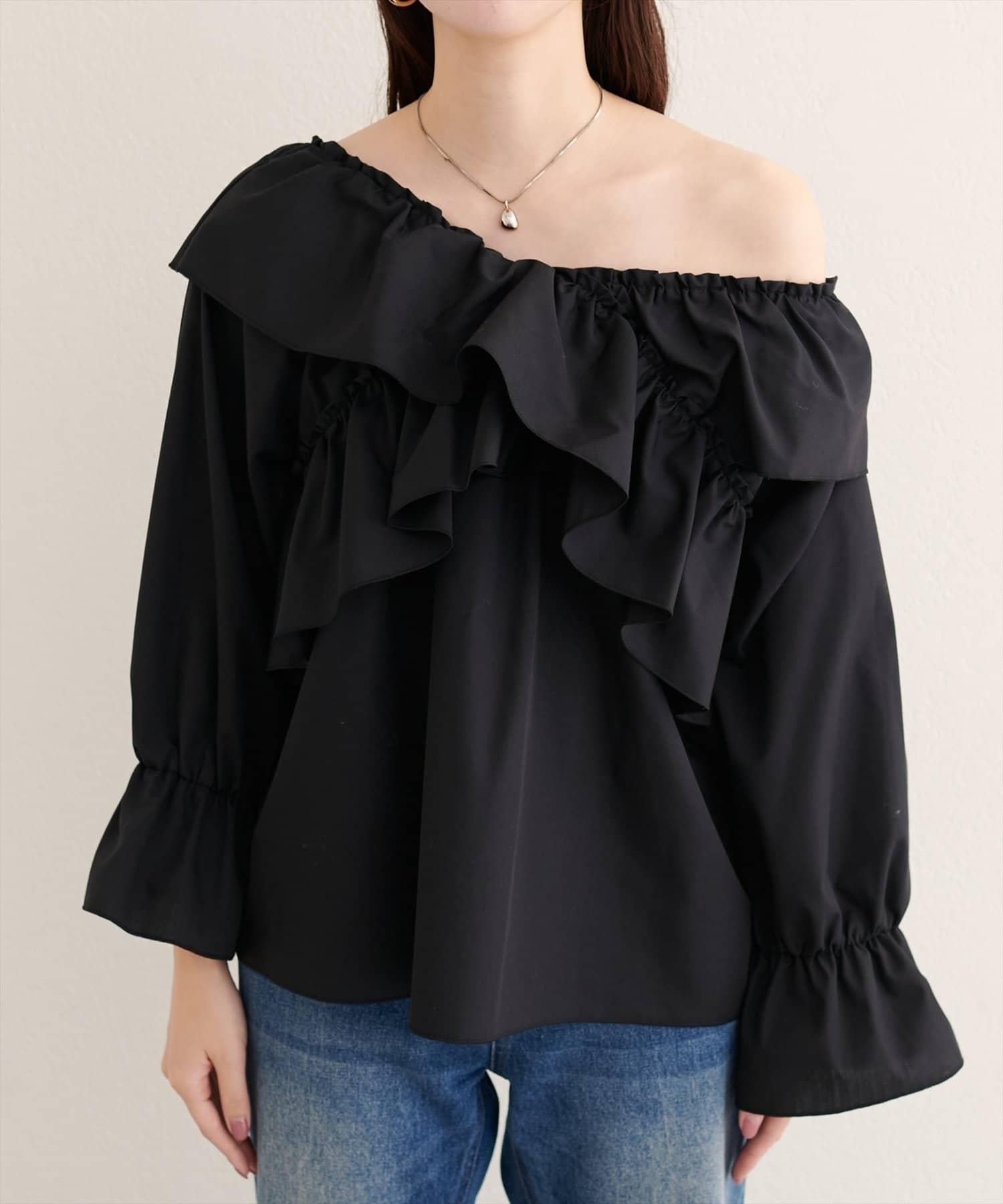 收攏的鬆緊領口使這款多款式單品既可露肩穿著,也可作為單肩上衣穿著。