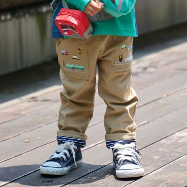 後口袋上繡有美國平交道標誌的 RR 圖案。