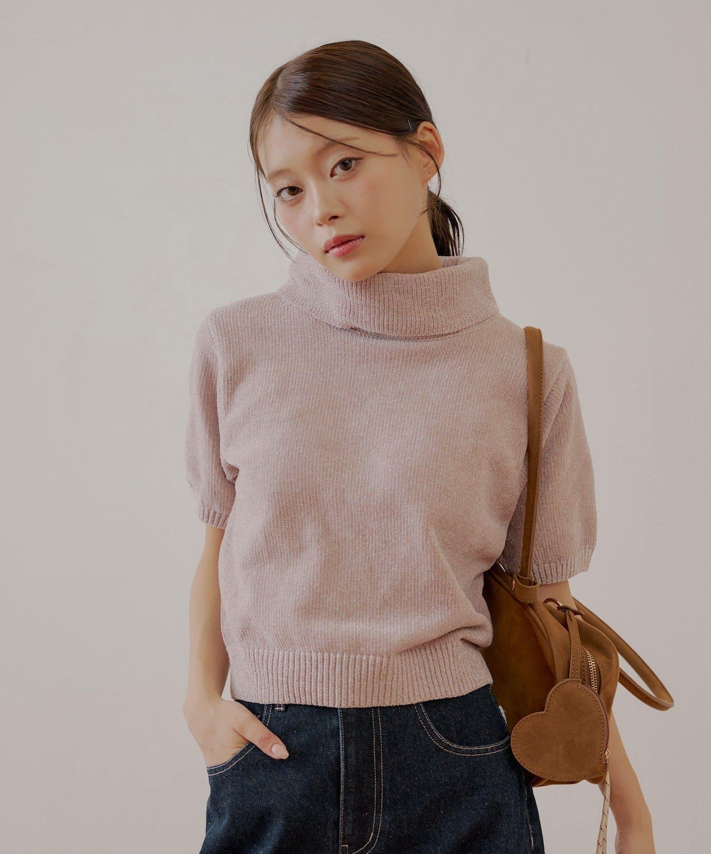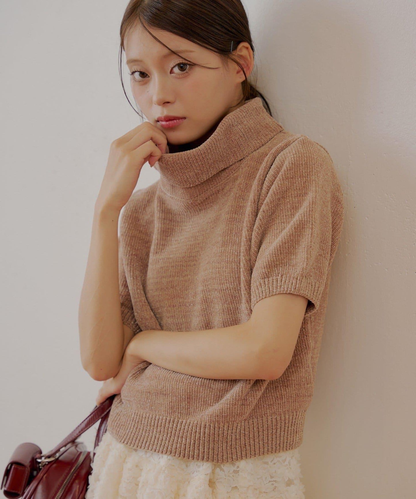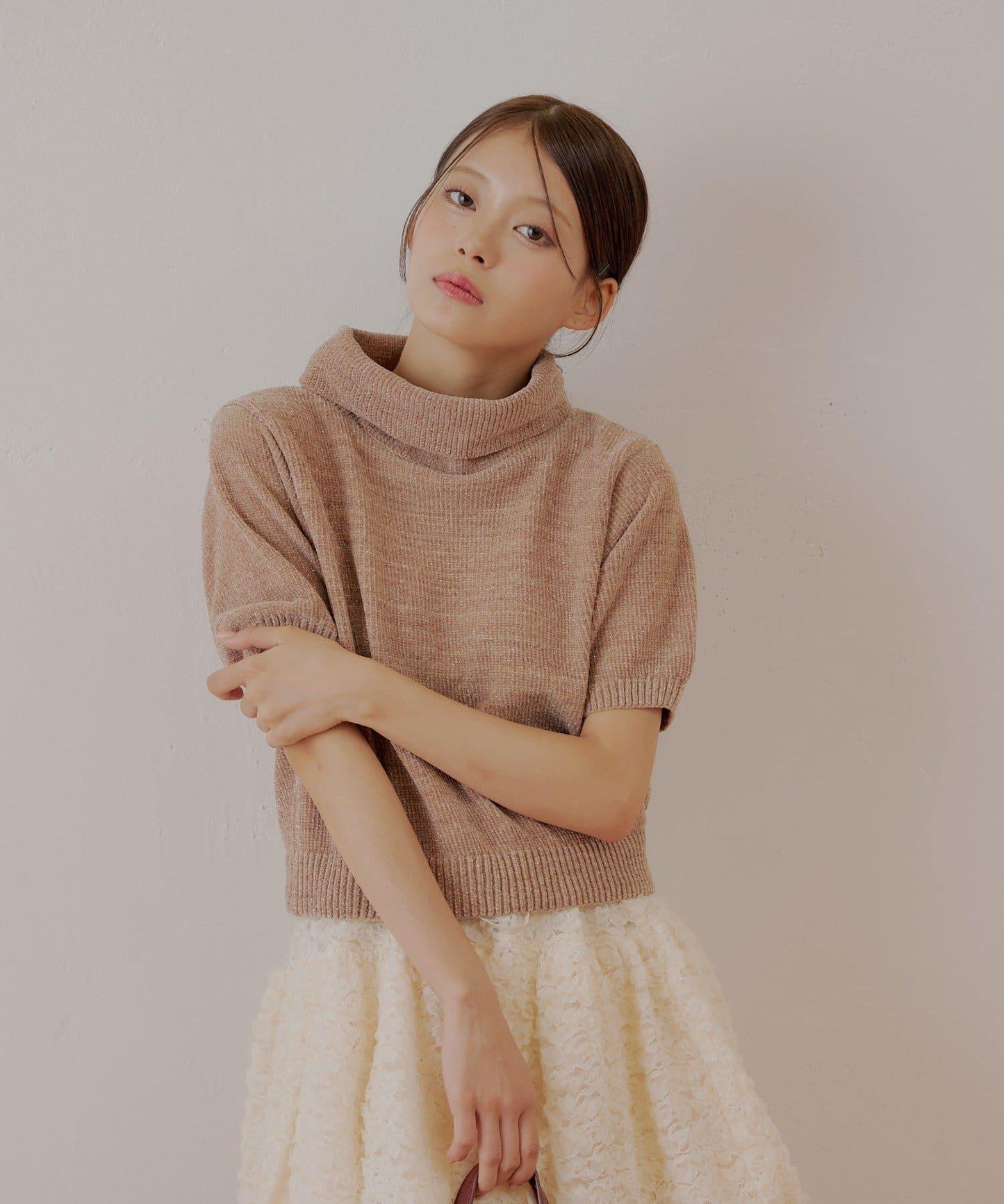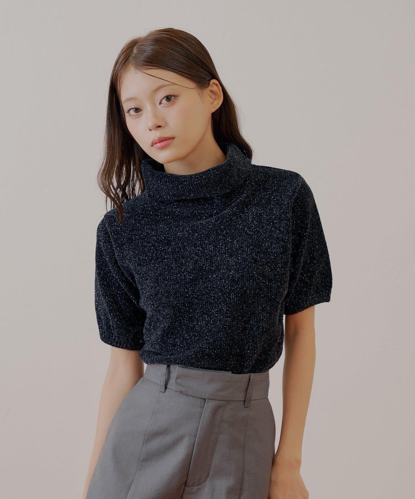 帶有優雅光澤的高領短袖針織衫,採用薄片絨面料!