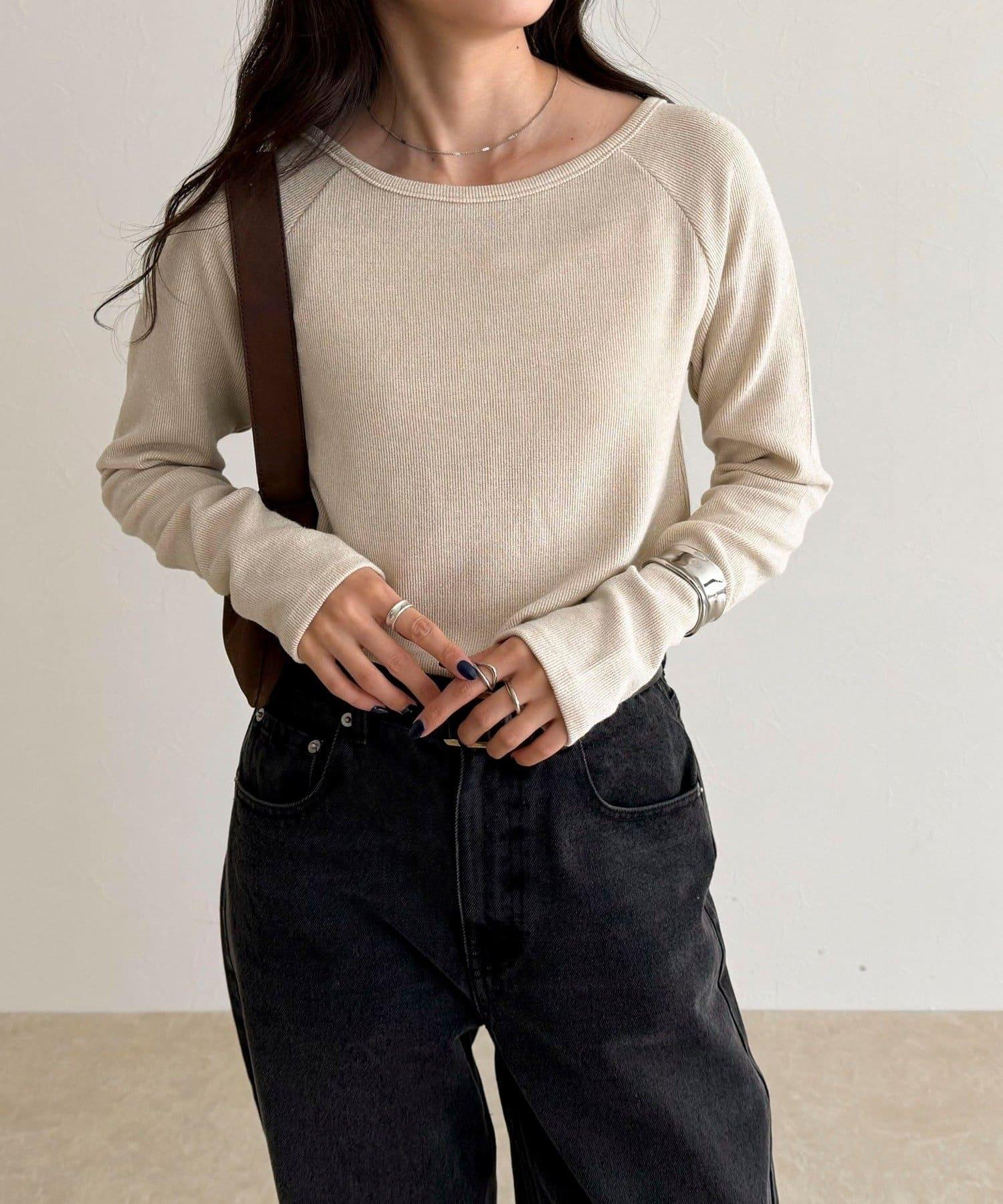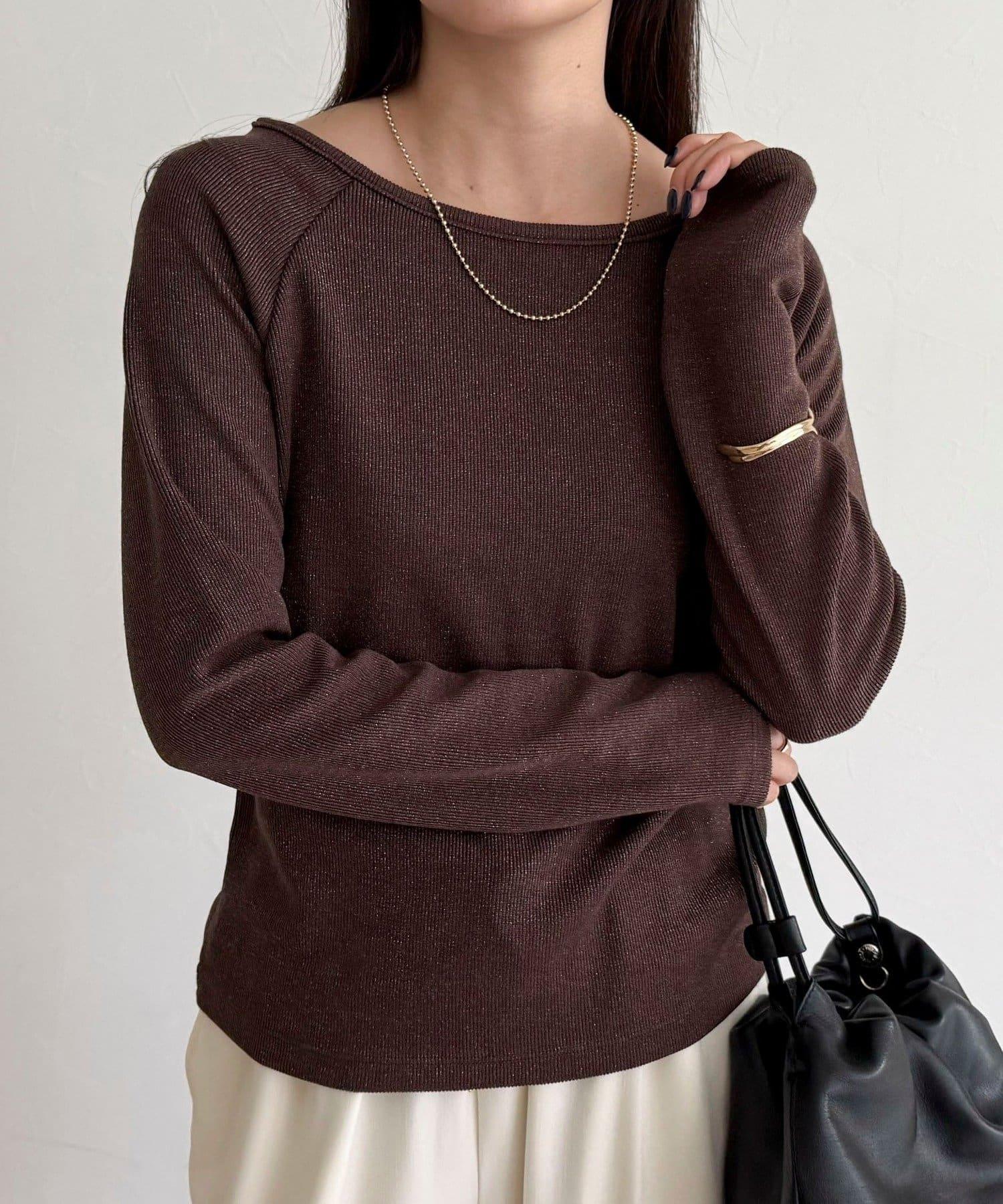 身高 156 厘米的工作人員(穿 38 號):恰到好處地貼合身體,肩部和腰部線條優美。彈性好,穿起來活動自如,很舒服。柔軟的面料貼膚感很好,薄片巧妙地閃耀著光澤,是提亮臉龐的好點子。領口處的船形領口設計,將骨架筆直的鎖骨線條展現得淋漓盡致,女人味十足。