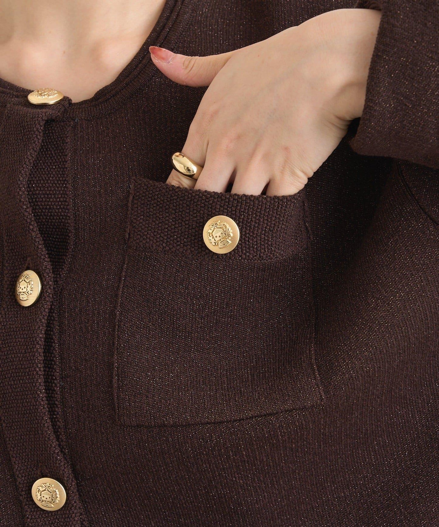 金色紐扣的組合優雅地提升了經典格調。