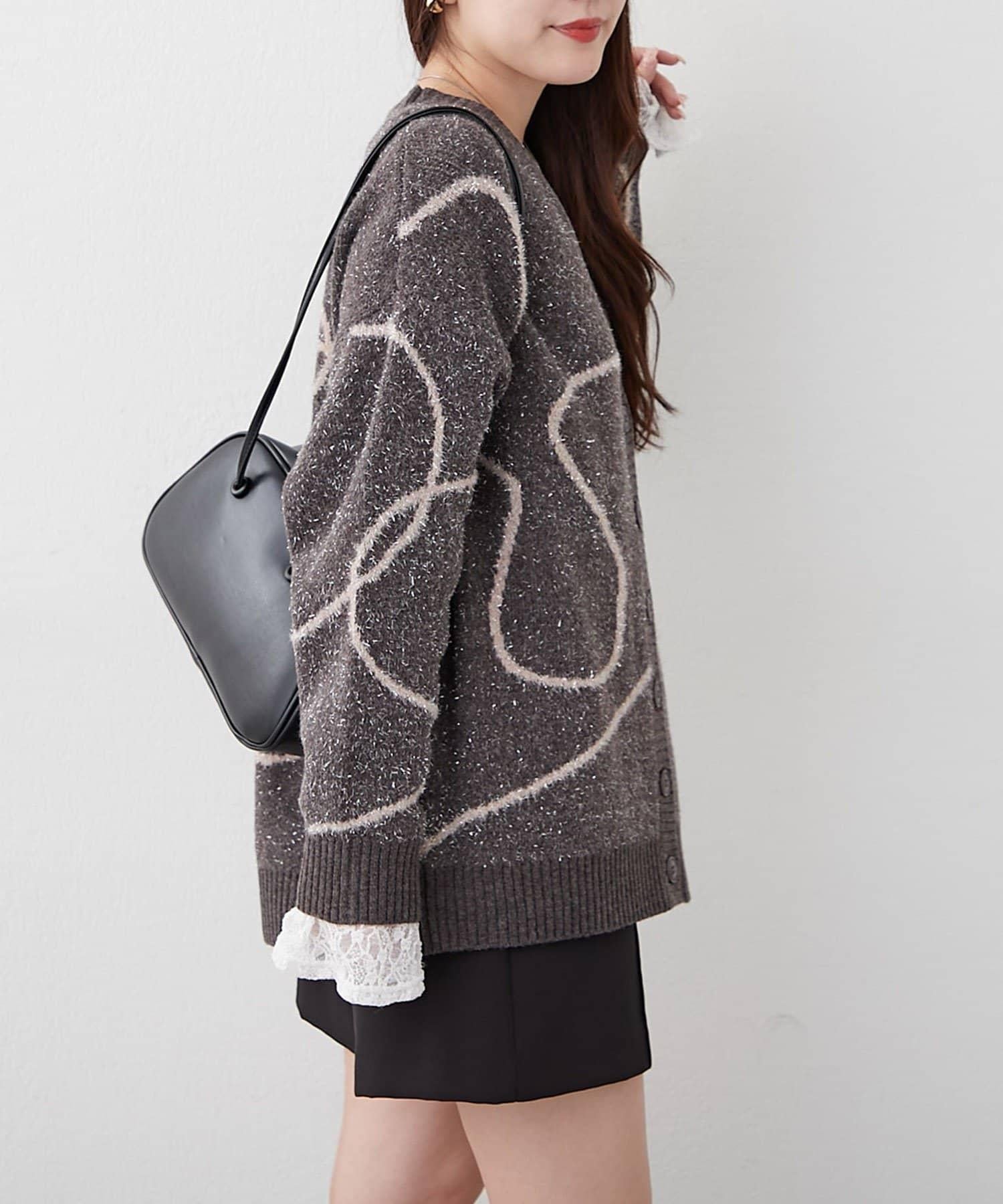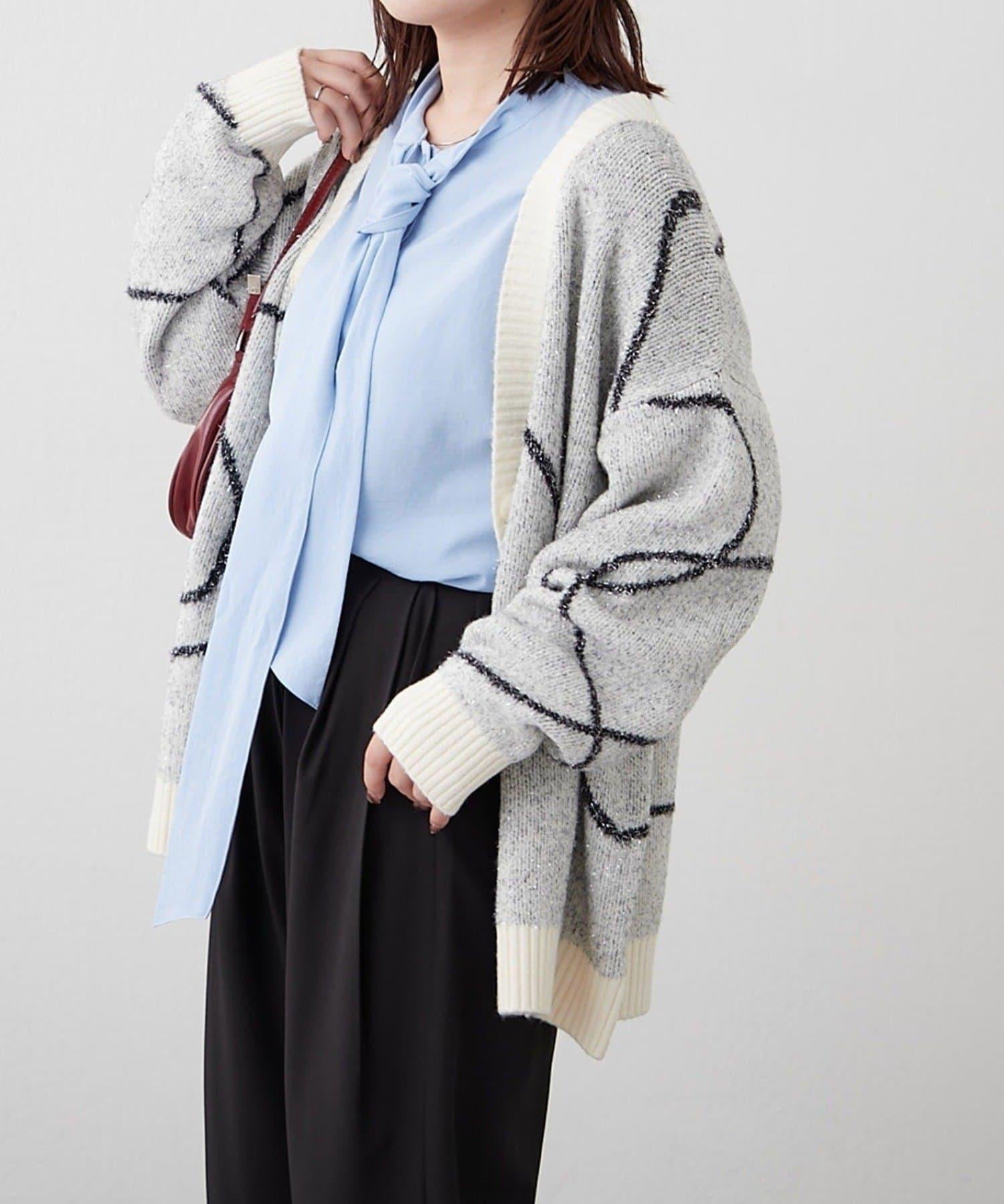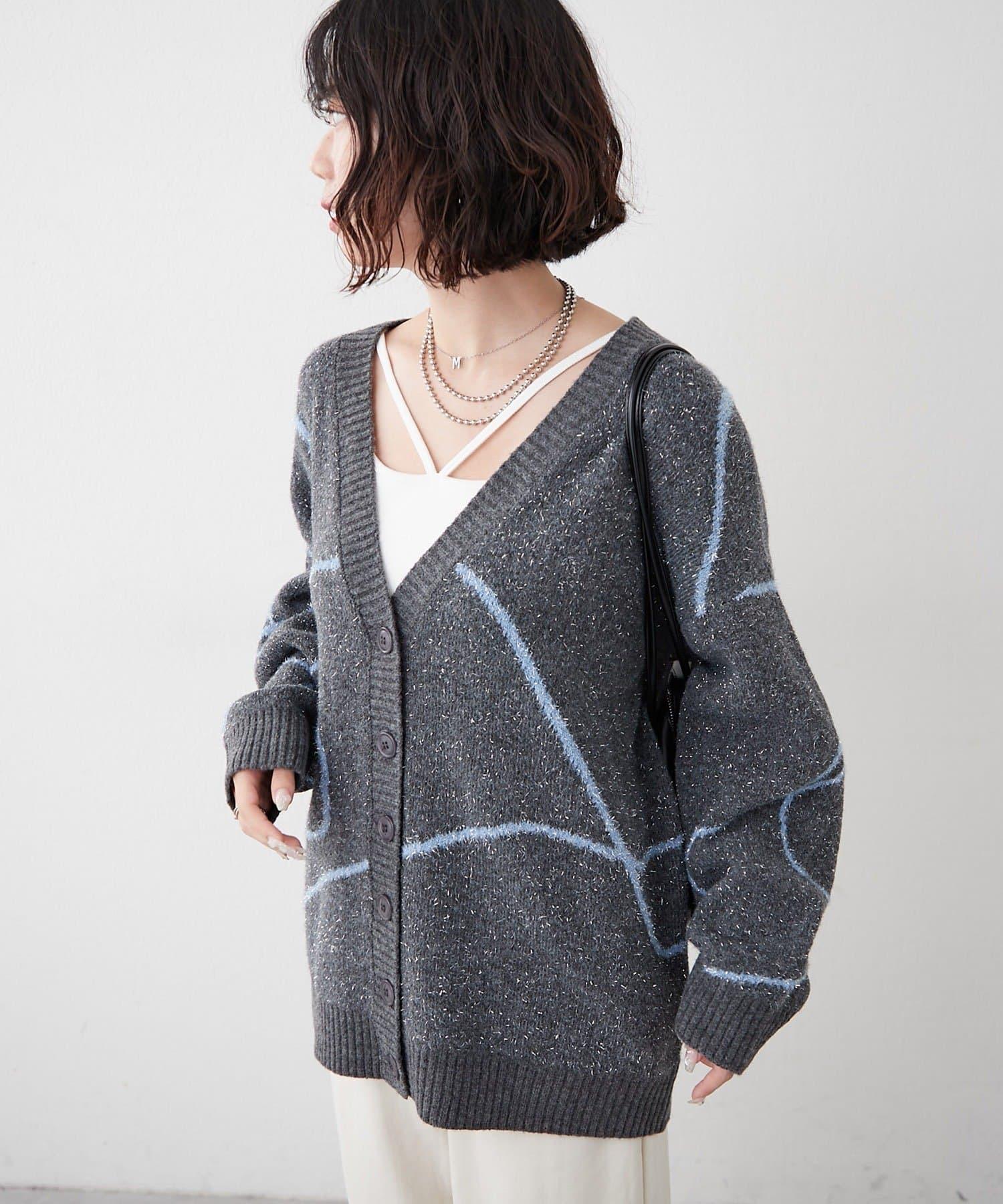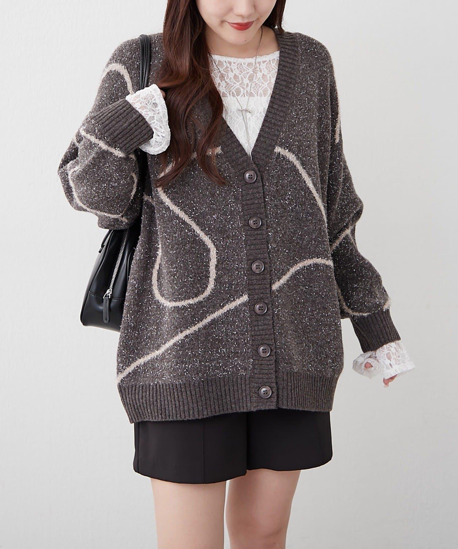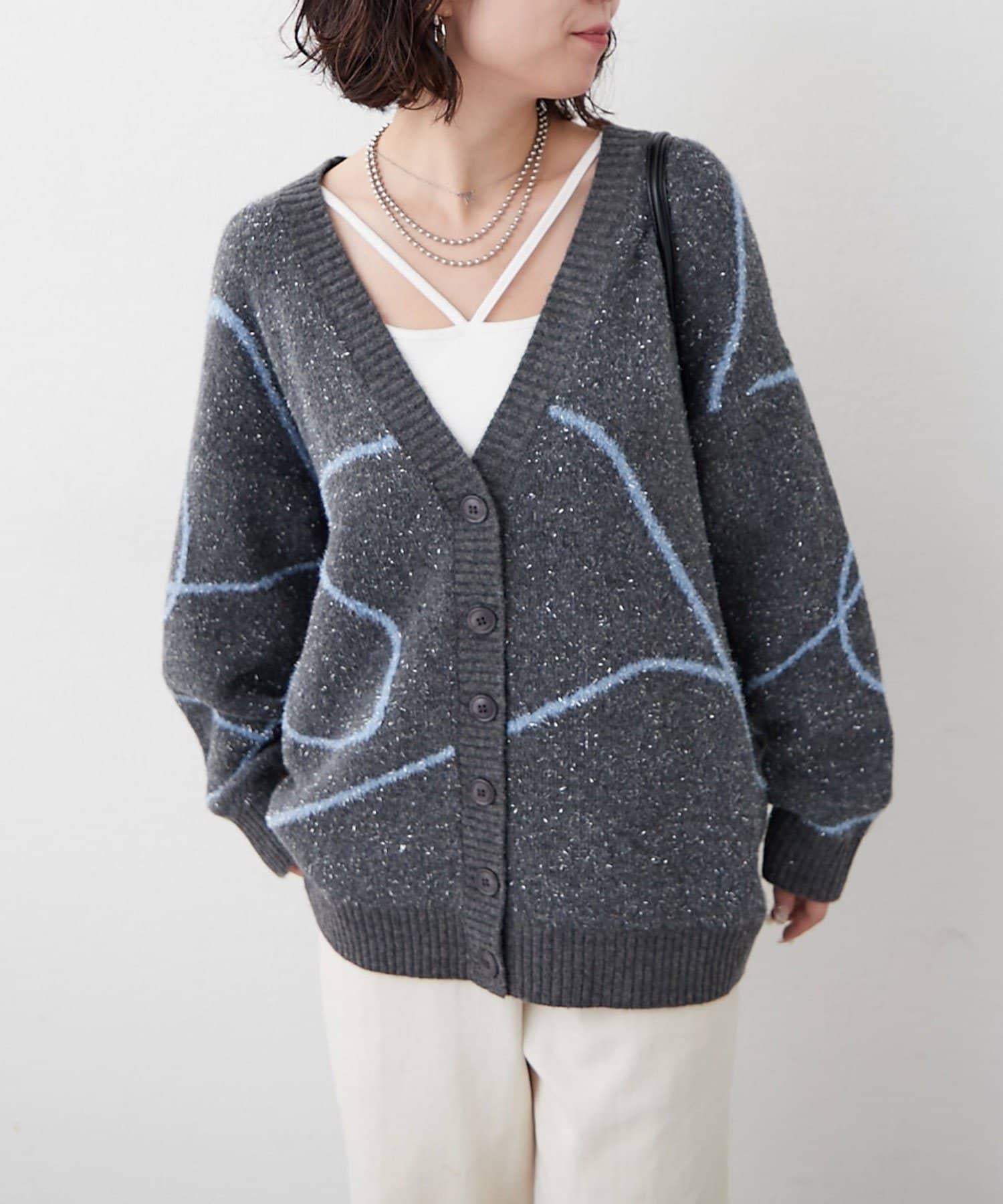 薄紗材質隨意閃耀♪線條圖案的時尚 V 領開衫。