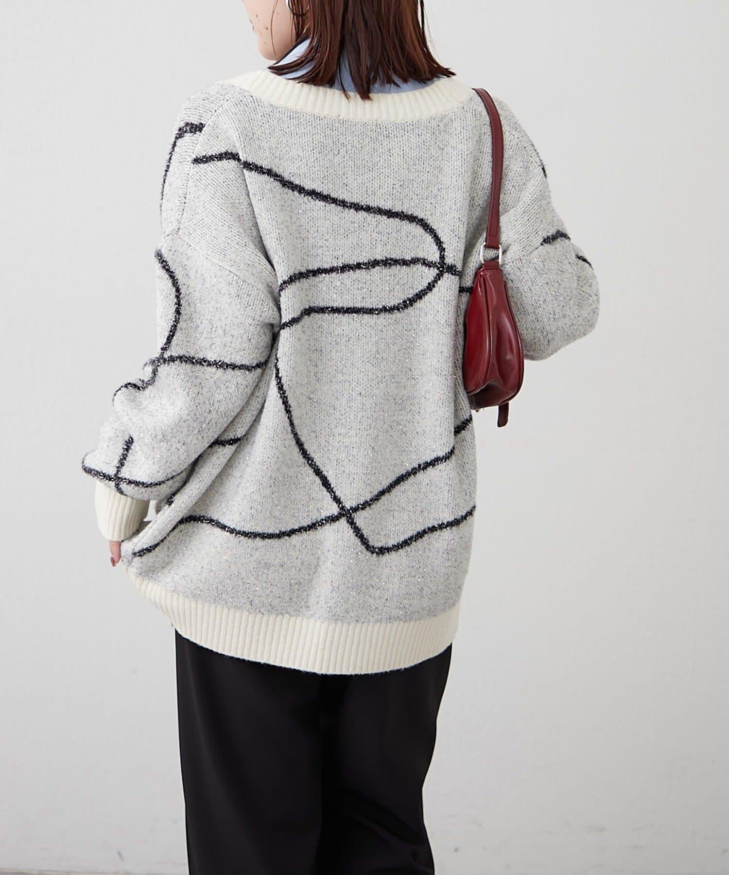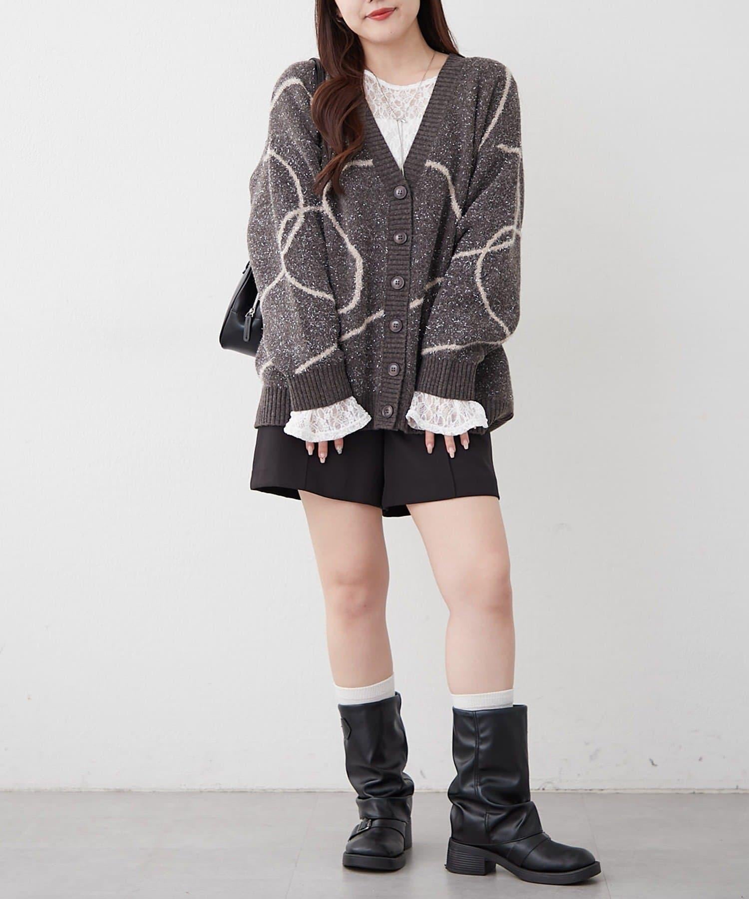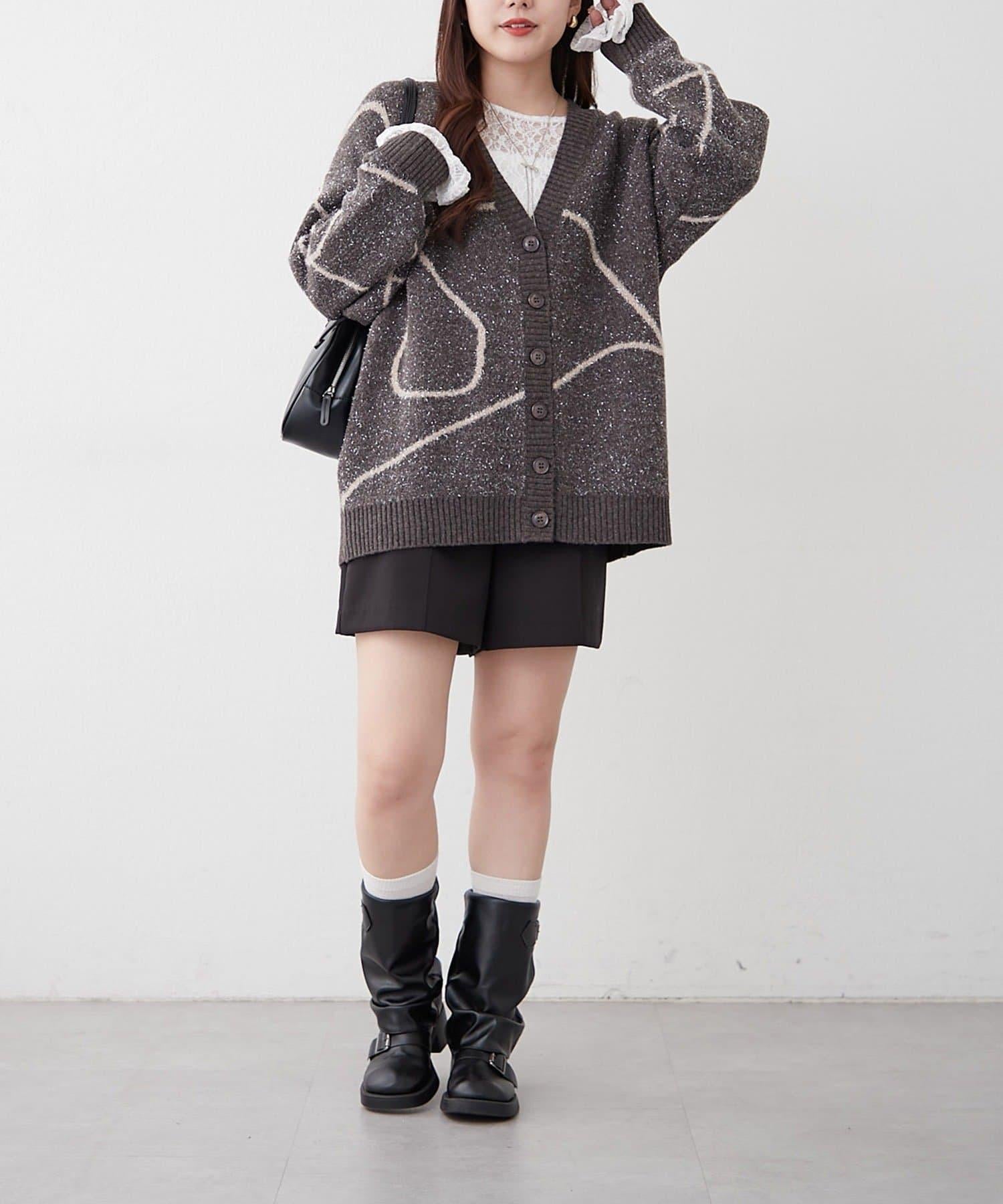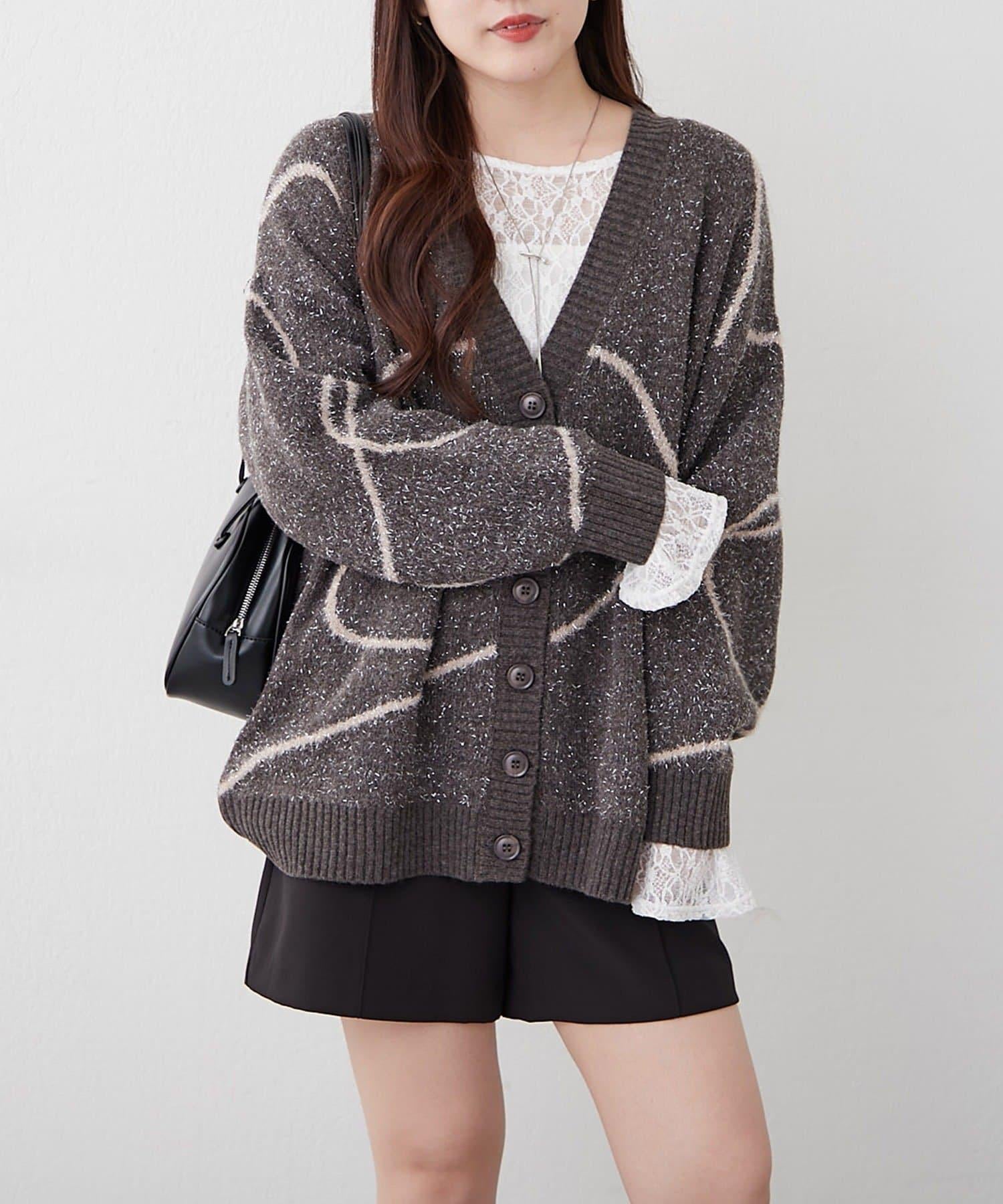 薄紗材質隨意閃耀♪線條圖案的時尚 V 領開衫。