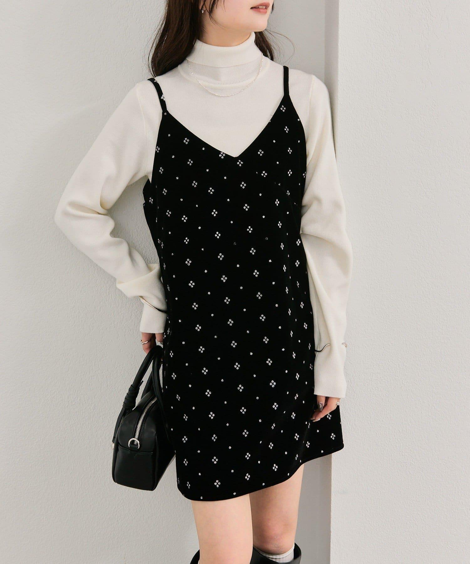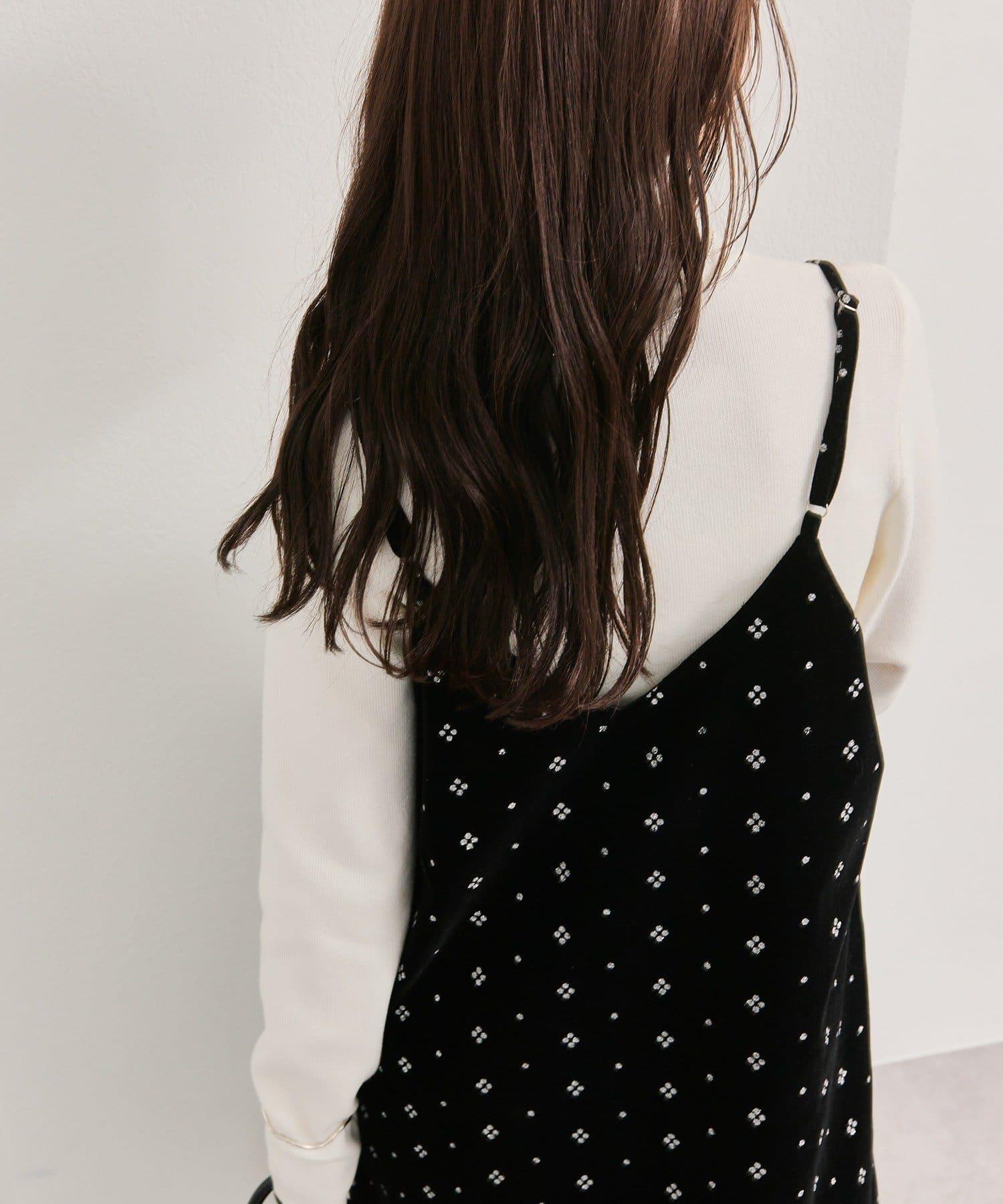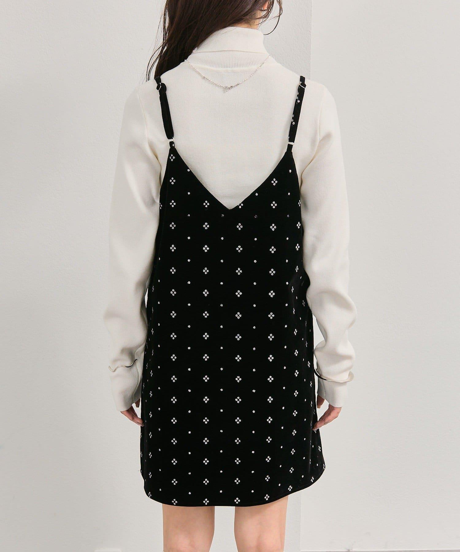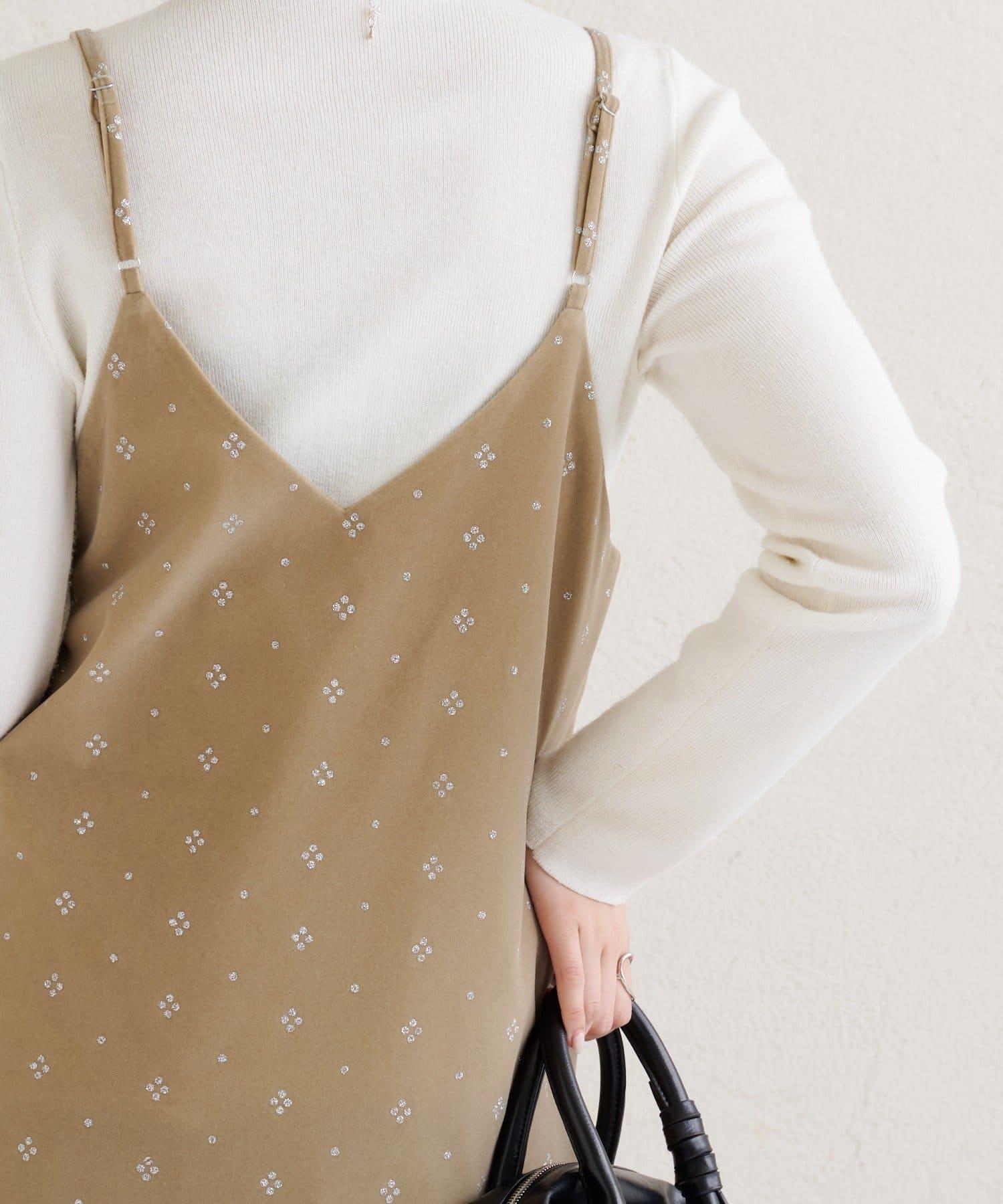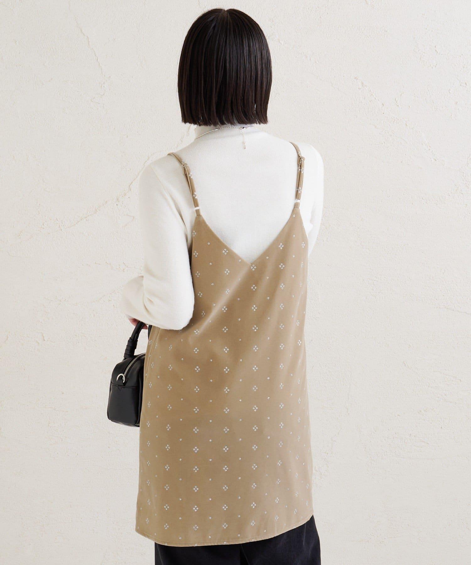 這款迷你吊帶連衣裙由天鵝絨製成,上面散佈著細小的薄片,在光線下反射出微妙的光芒。