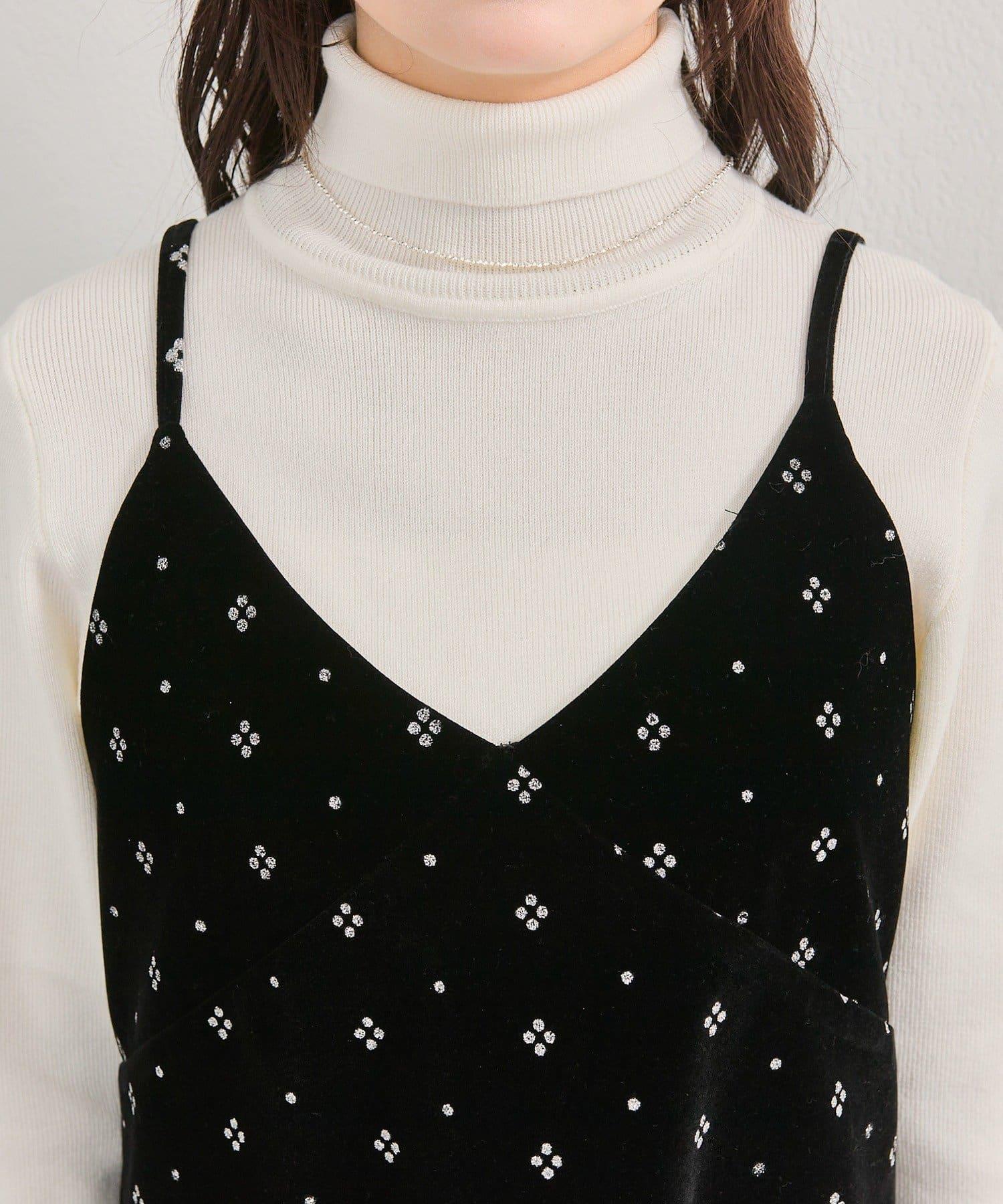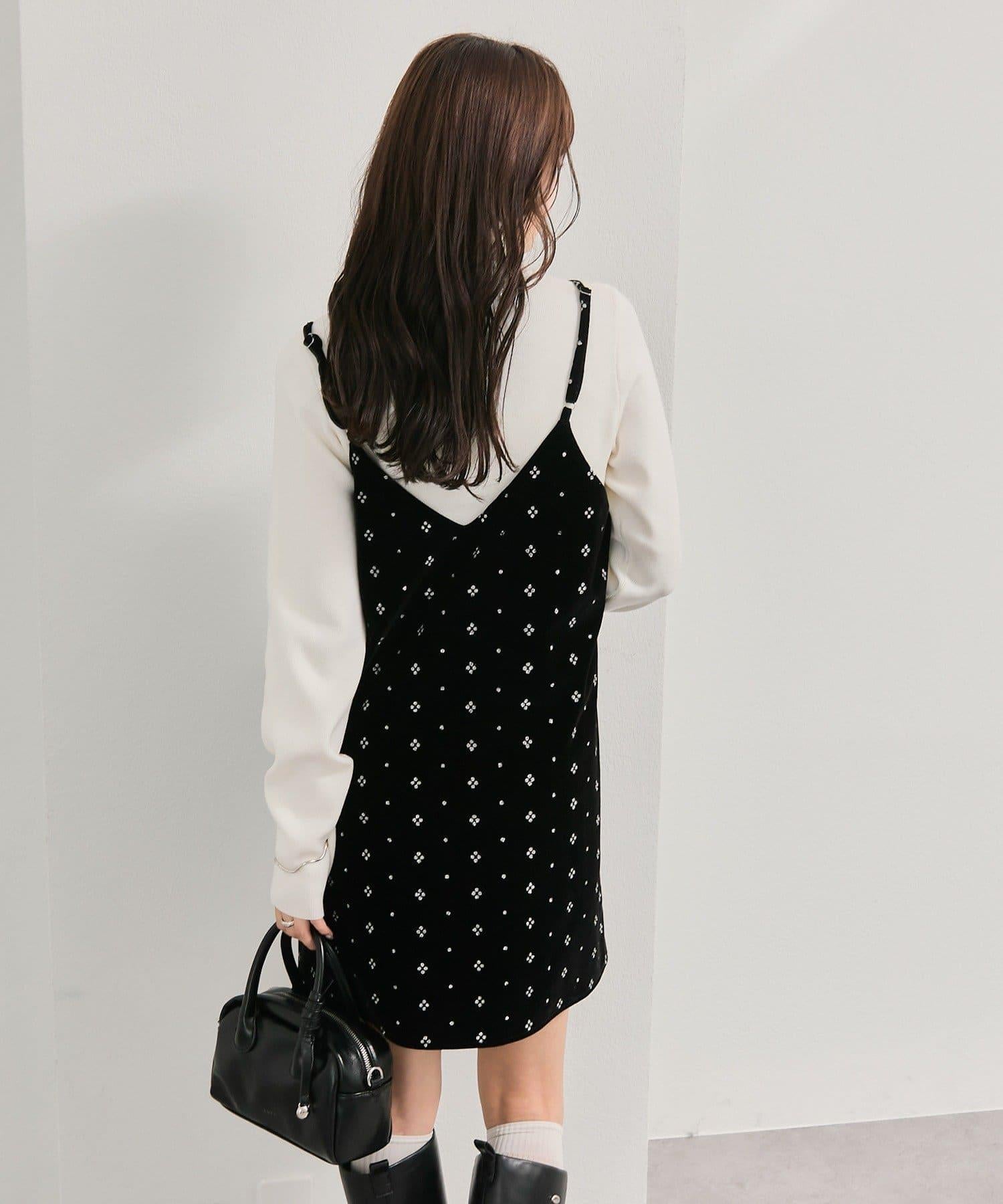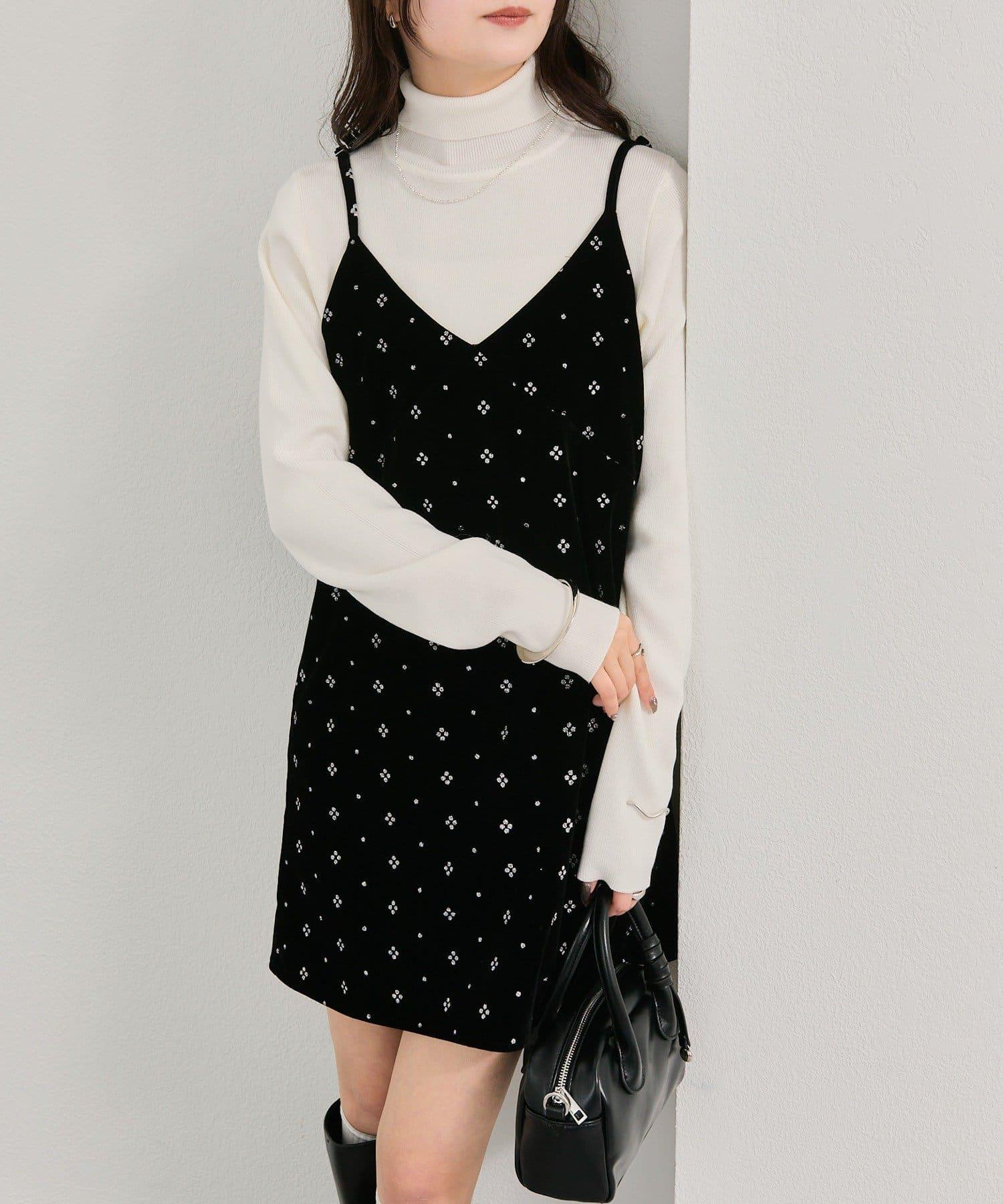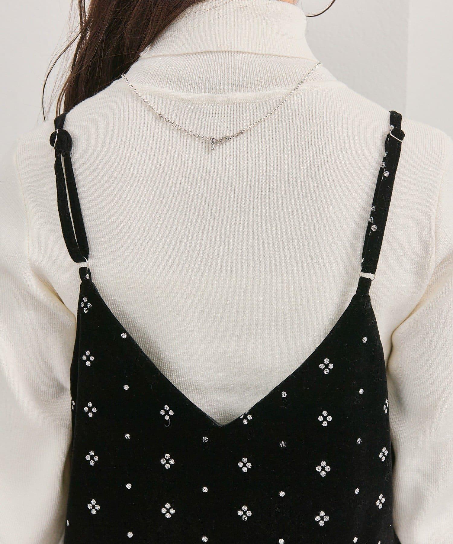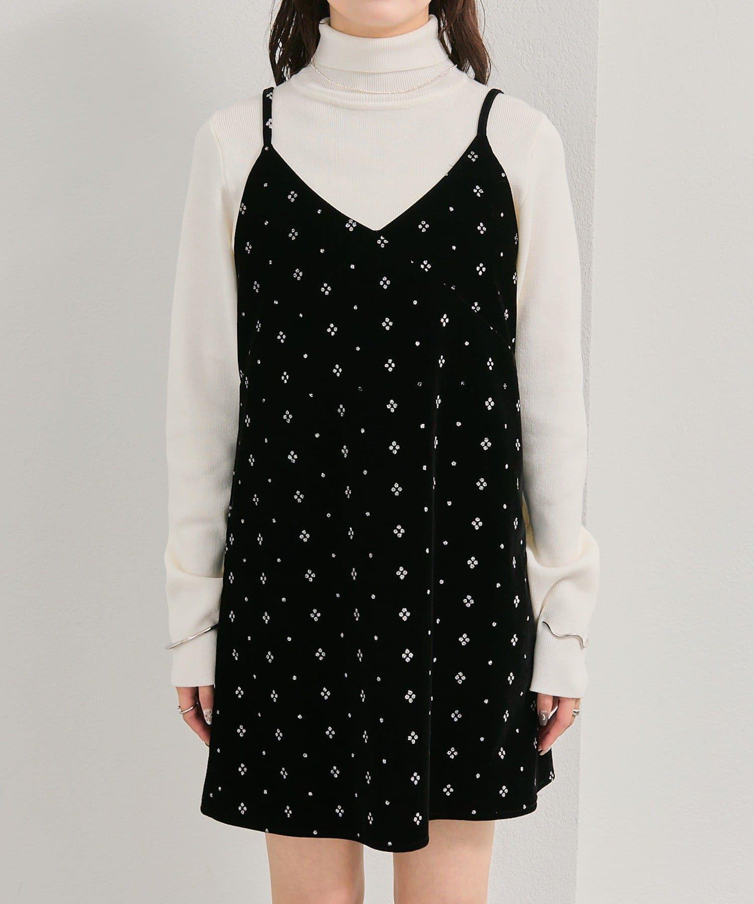 這款迷你吊帶連衣裙由天鵝絨製成,上面散佈著細小的薄片,在光線下反射出微妙的光芒。