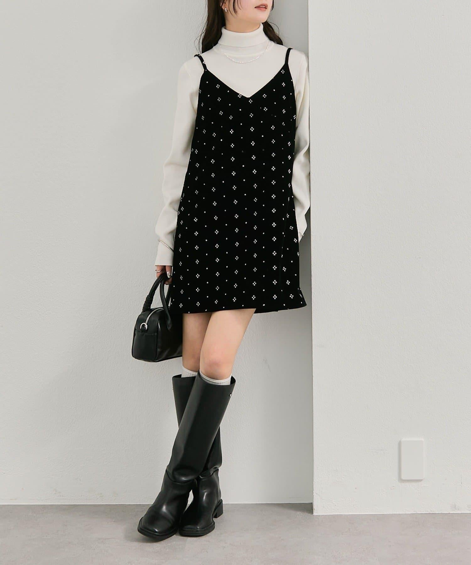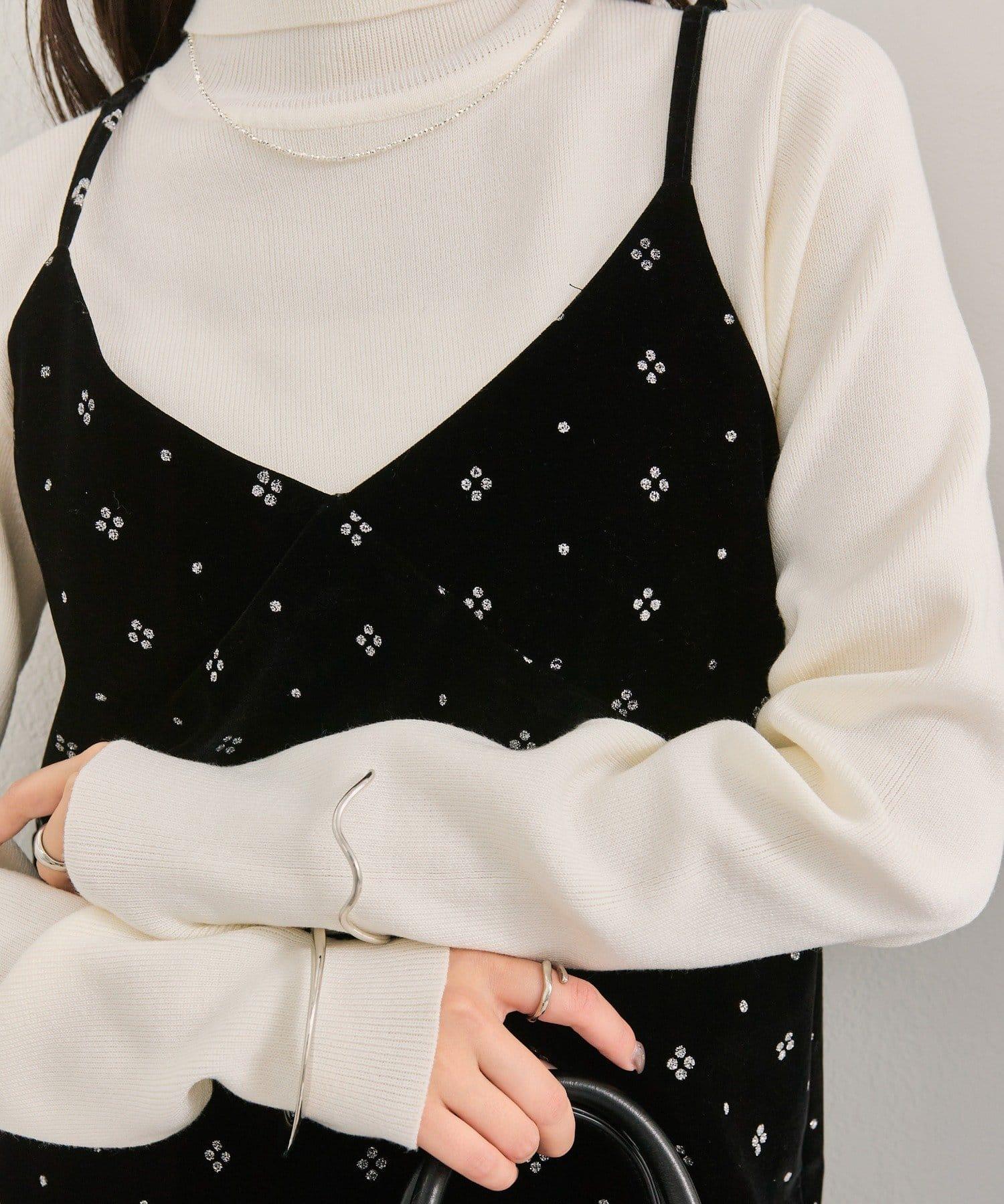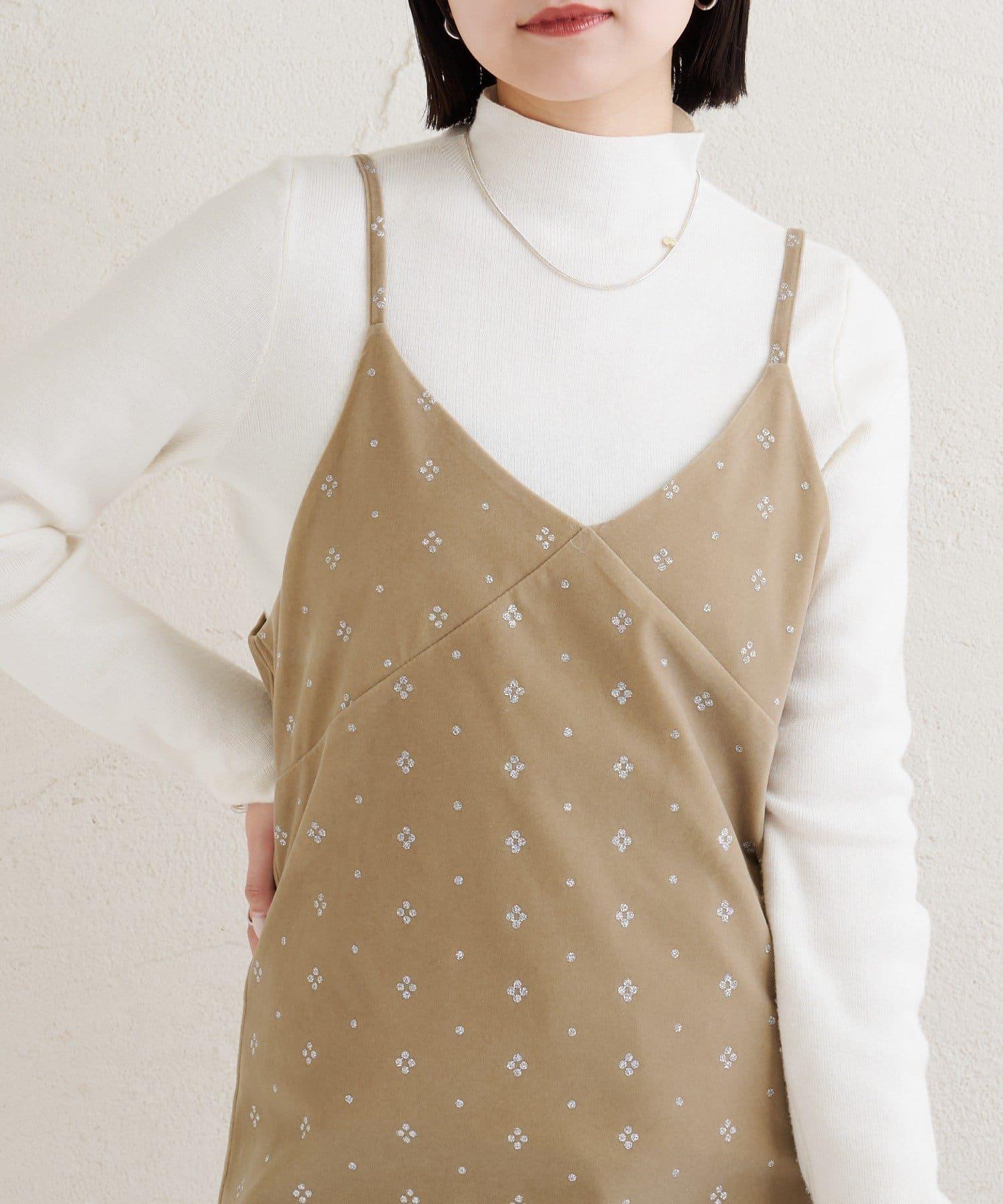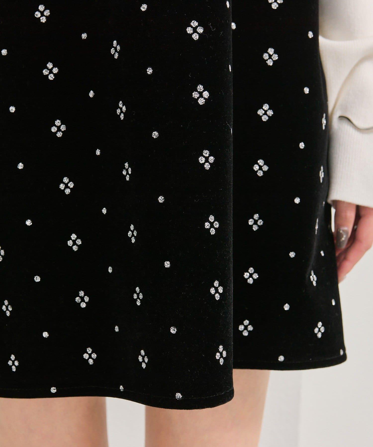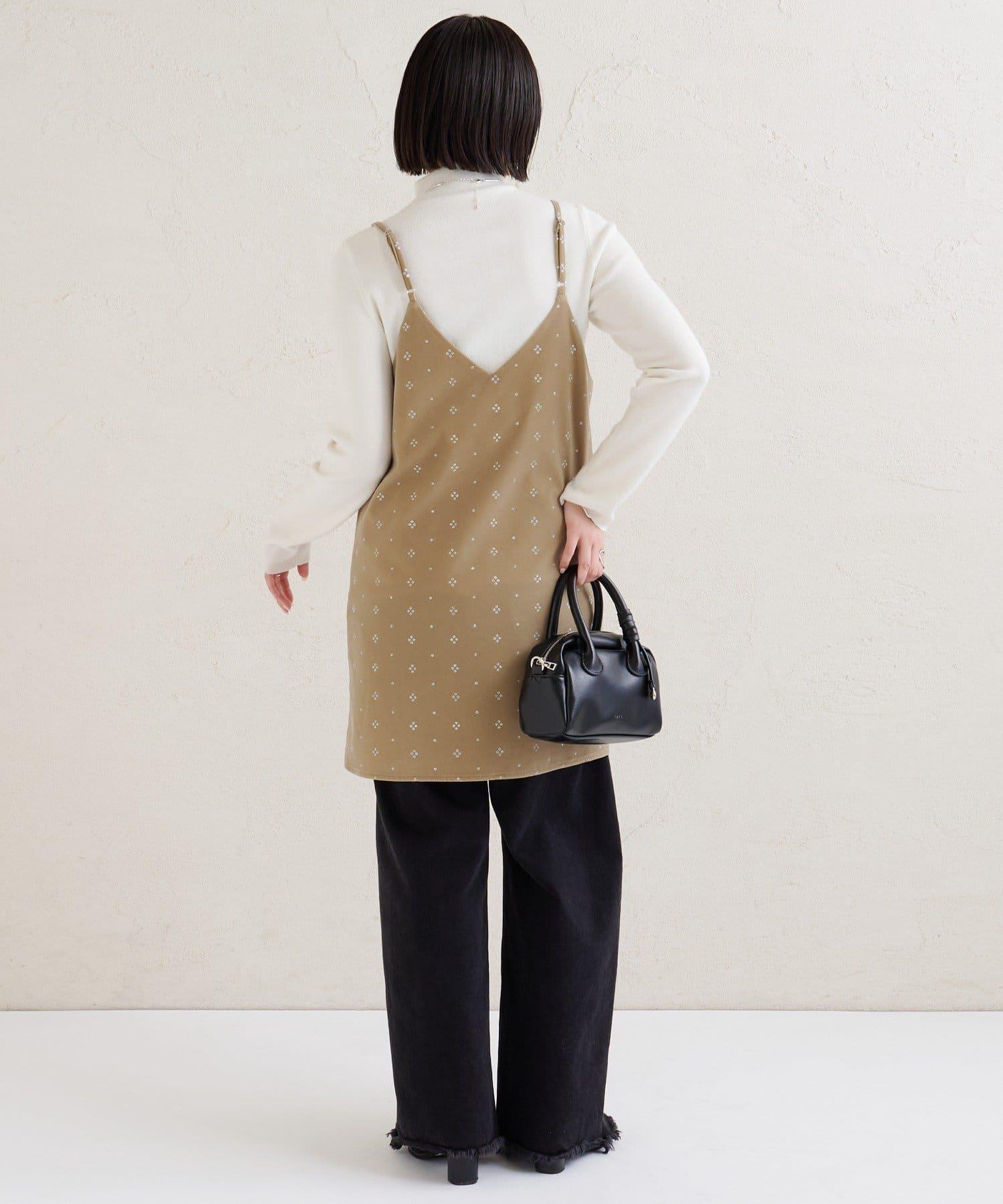 這款迷你吊帶連衣裙由天鵝絨製成,上面散佈著細小的薄片,在光線下反射出微妙的光芒。